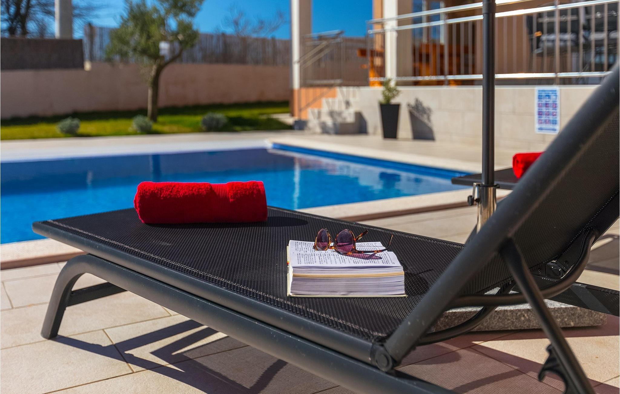 Utenfor har du et flott svømmebasseng med massasjedyser - en kjærkommen forfriskning på varme sommerdager - og 8 solsenger til soling og avslapning. I den store hagen med huske kan barna leke og ha det gøy.