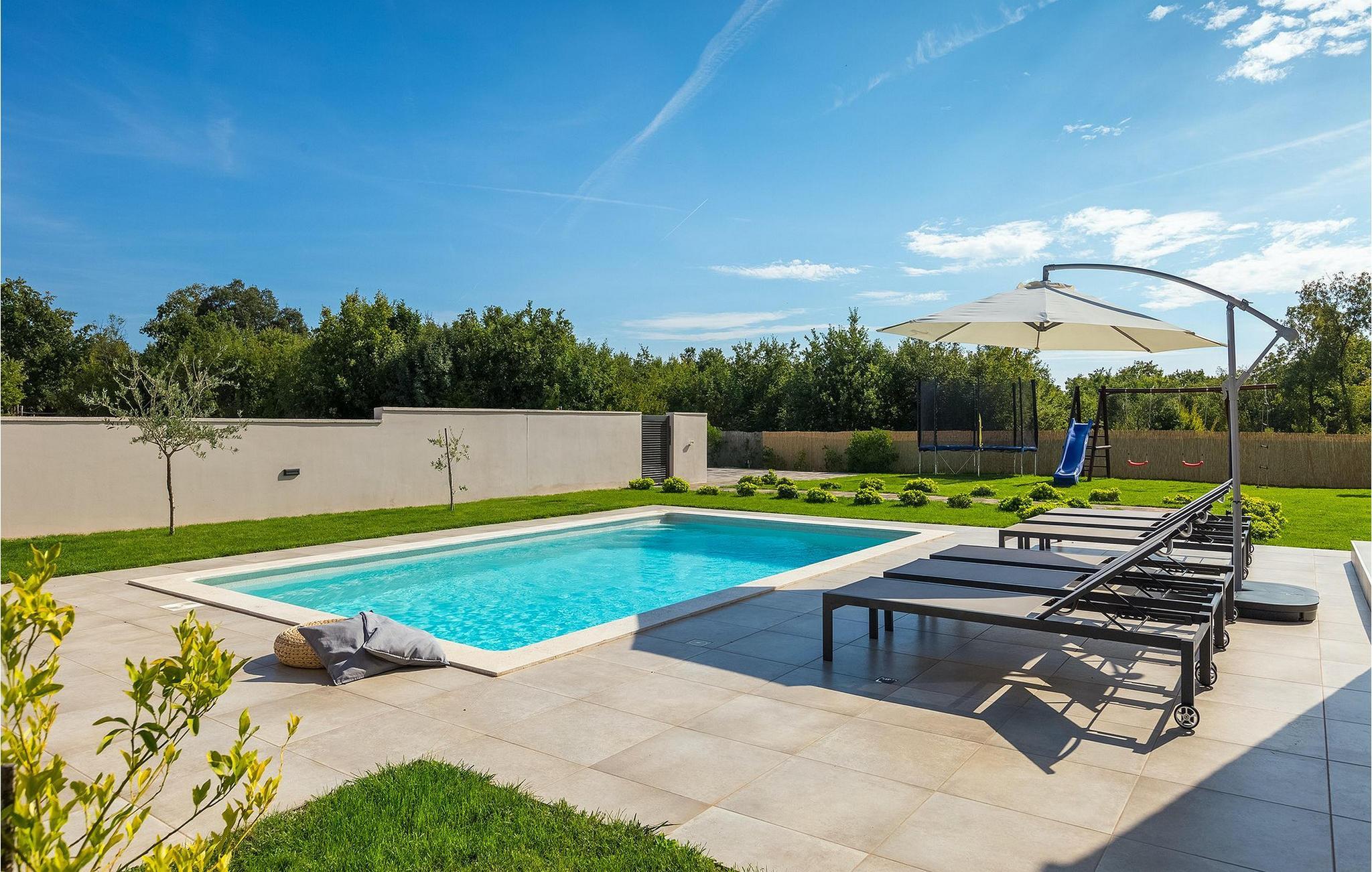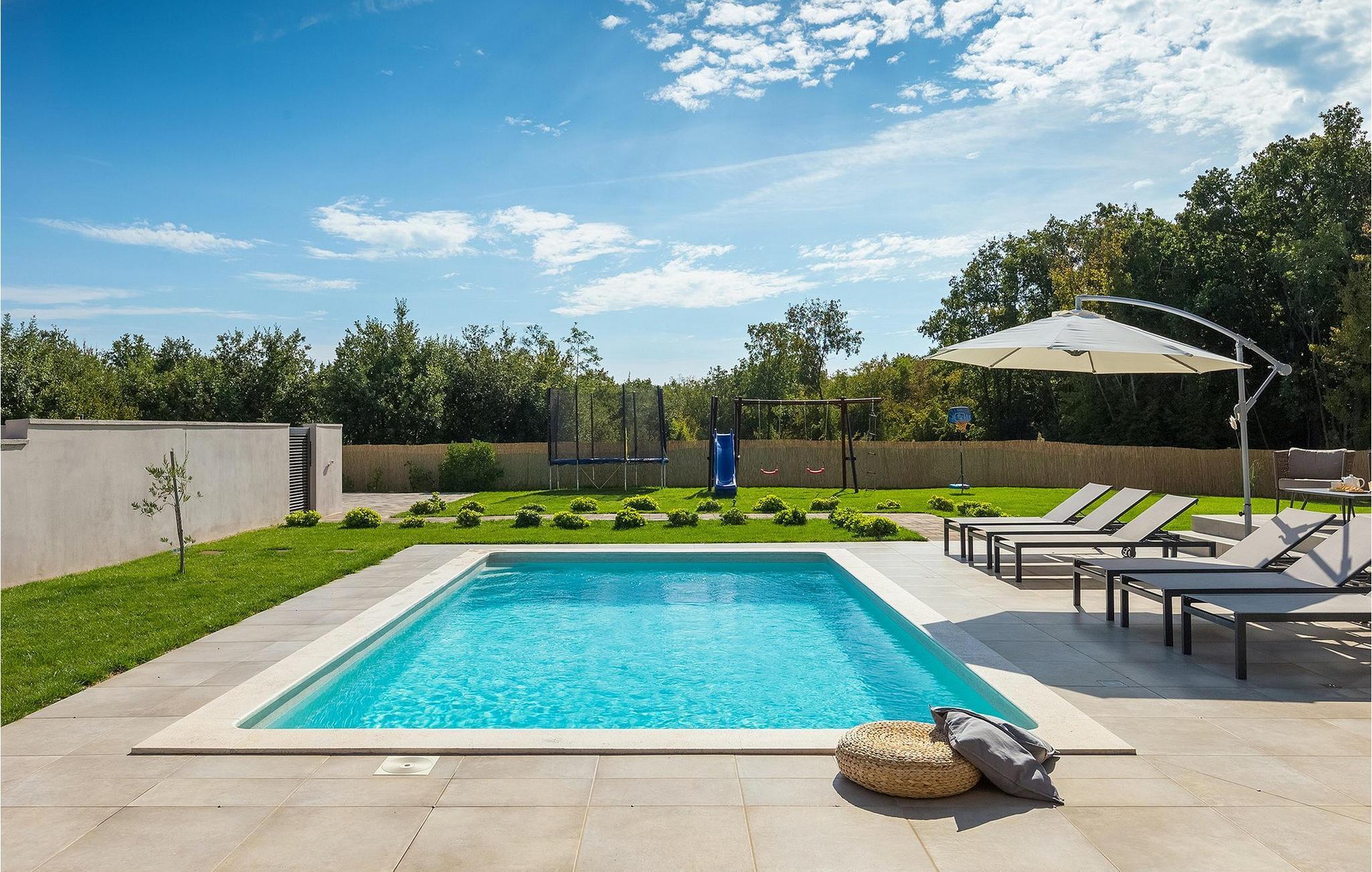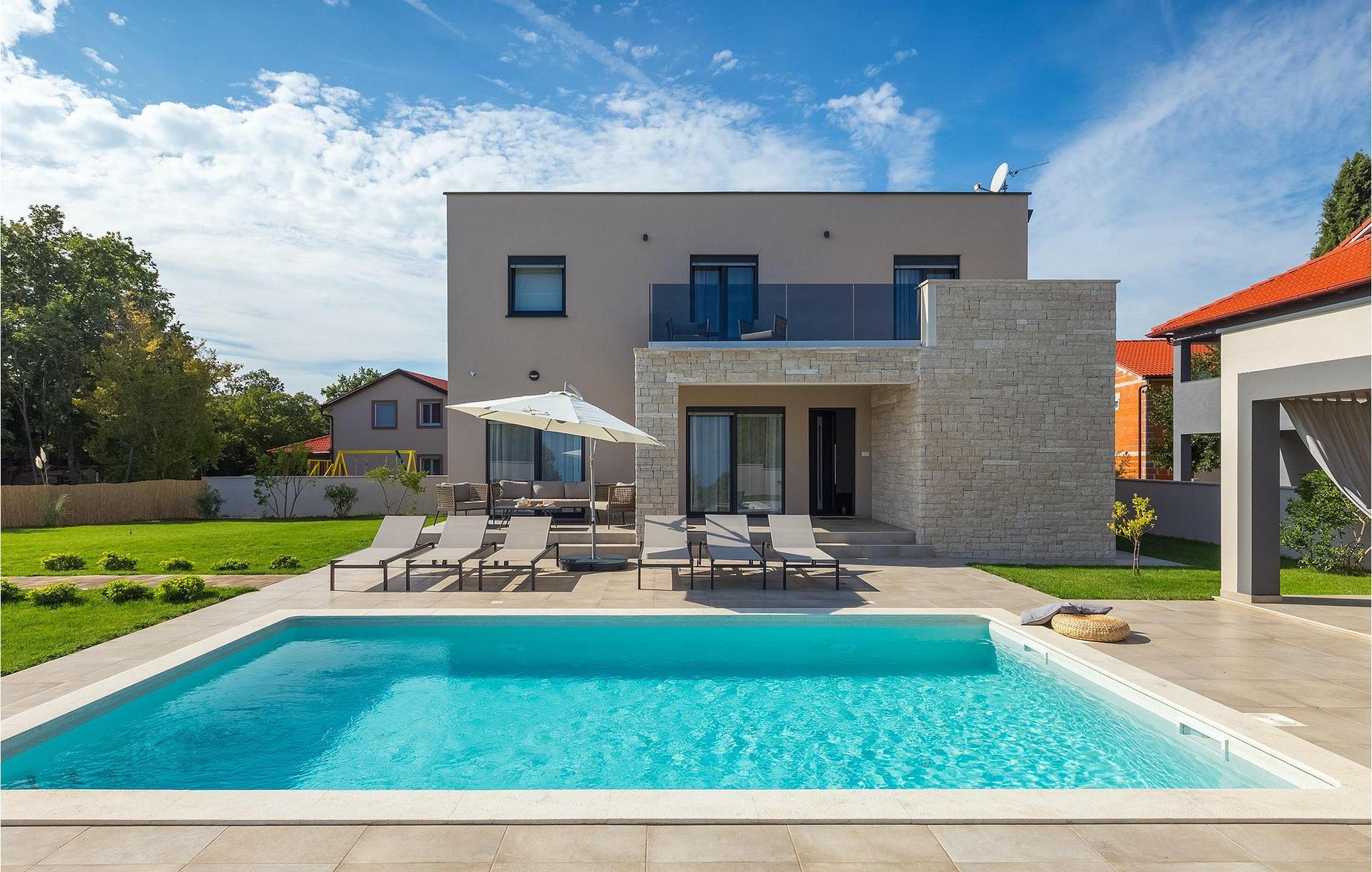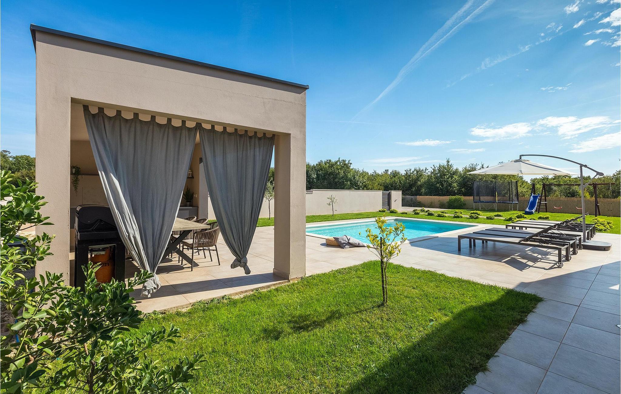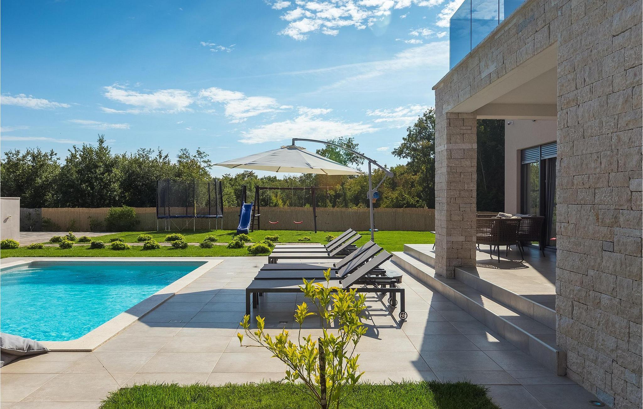 Den fantastiske Villa Omnia ligger i den lille landsbyen Loborika i nærheten av Pula. Villaen er en arkitektonisk perle i åpent landskap og er en flott base for en uforglemmelig sommerferie. Villaen har plass til opptil 6 personer i 3 komfortable soverom. Ett av soverommene har 2 enkeltsenger som kan settes sammen, mens de to andre soverommene har en dobbeltseng hver. Alle soverommene ligger i første etasje, mens første etasje er reservert for oppholdsrommet. Der finner du et lyst, moderne kjøkken, hvorfra du har tilgang til spisestuen og til slutt stuen, hvor du kan slappe av. Uteområdet er utsmykket med det vakre bassenget, som bare innbyr til å hoppe uti og forfriske seg på varme sommerdager. Salongområdet og utekjøkkenet tilbyr ekstra skygge og er det perfekte stedet å gjemme seg for solen. Villaen har også to husker, en sklie og en trampoline, slik at de minste også kan nyte oppholdet i Villa Omnia. Villaen har privat parkering for opptil 3 biler, gratis Wi-Fi og klimaanlegg. Villa Omnia ligger en kort kjøretur fra Pula. Pula er Istrias turistsentrum, både kulturelt og tradisjonelt, men også på grunn av det vakre naturlandskapet. Byen Pula opplevde sin storhetstid i romertiden. Romerne satte sitt preg på byen, spesielt det vakre amfiteateret. I venetiansk tid utviklet Pula seg til å bli Adriaterhavets kontrollsenter