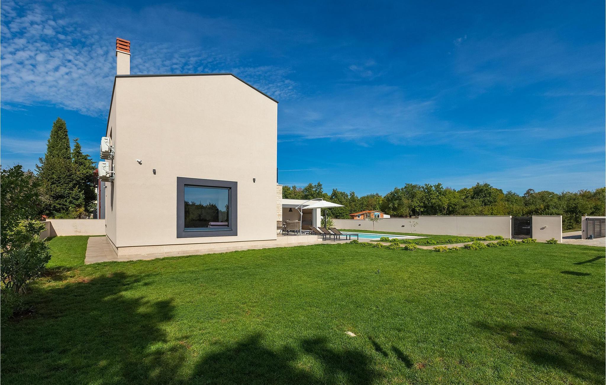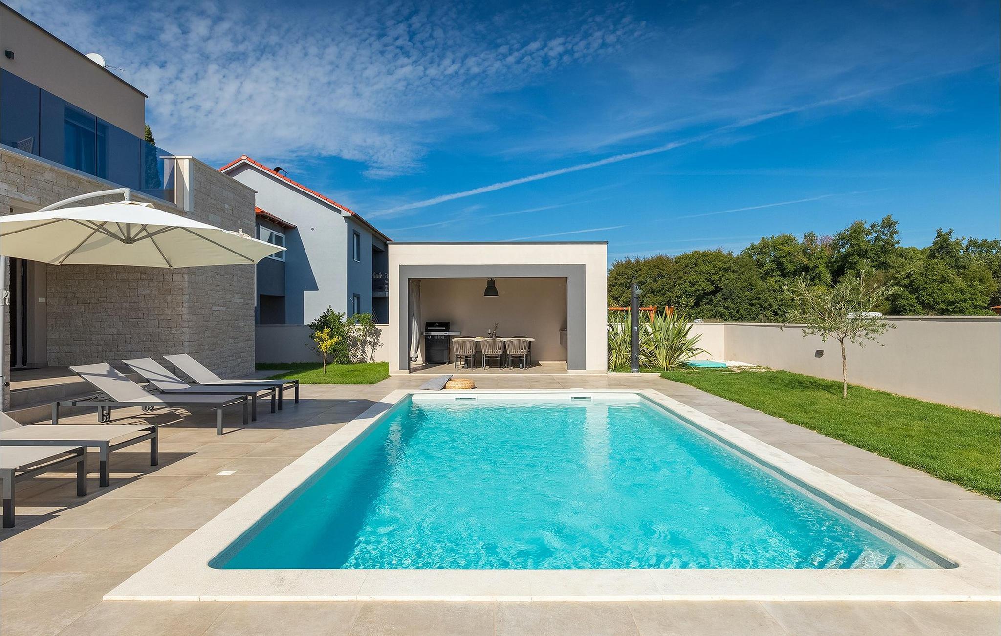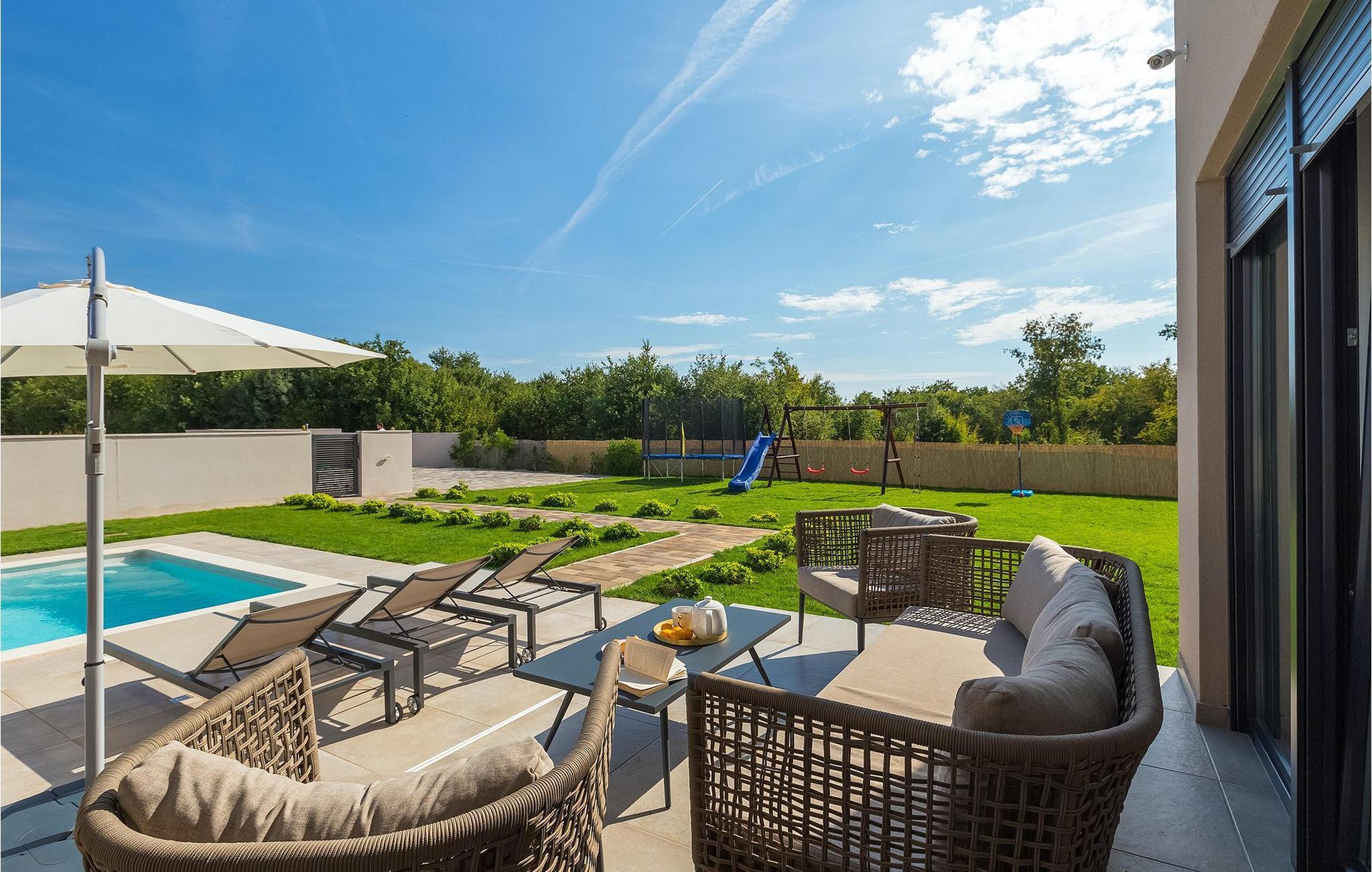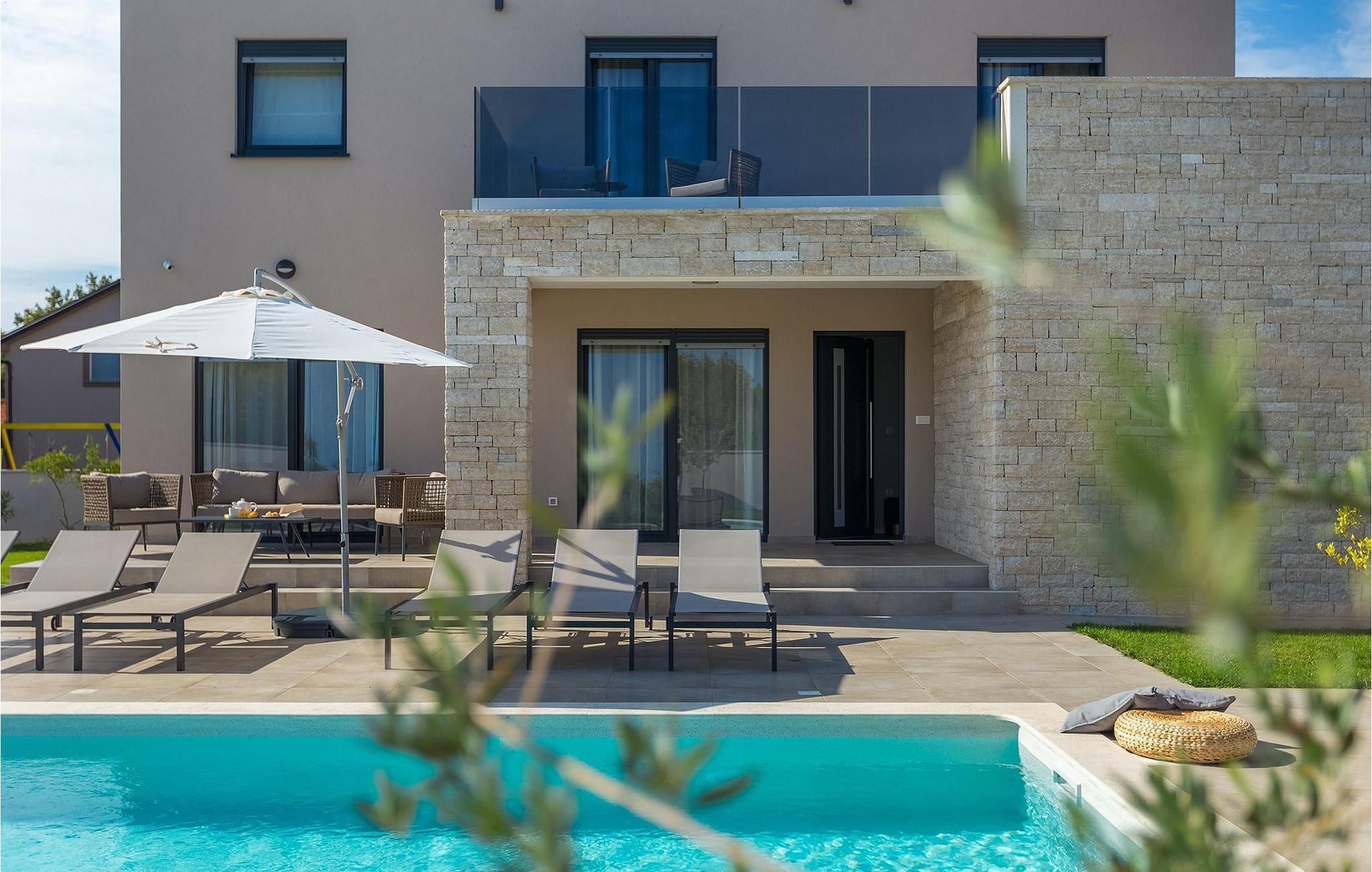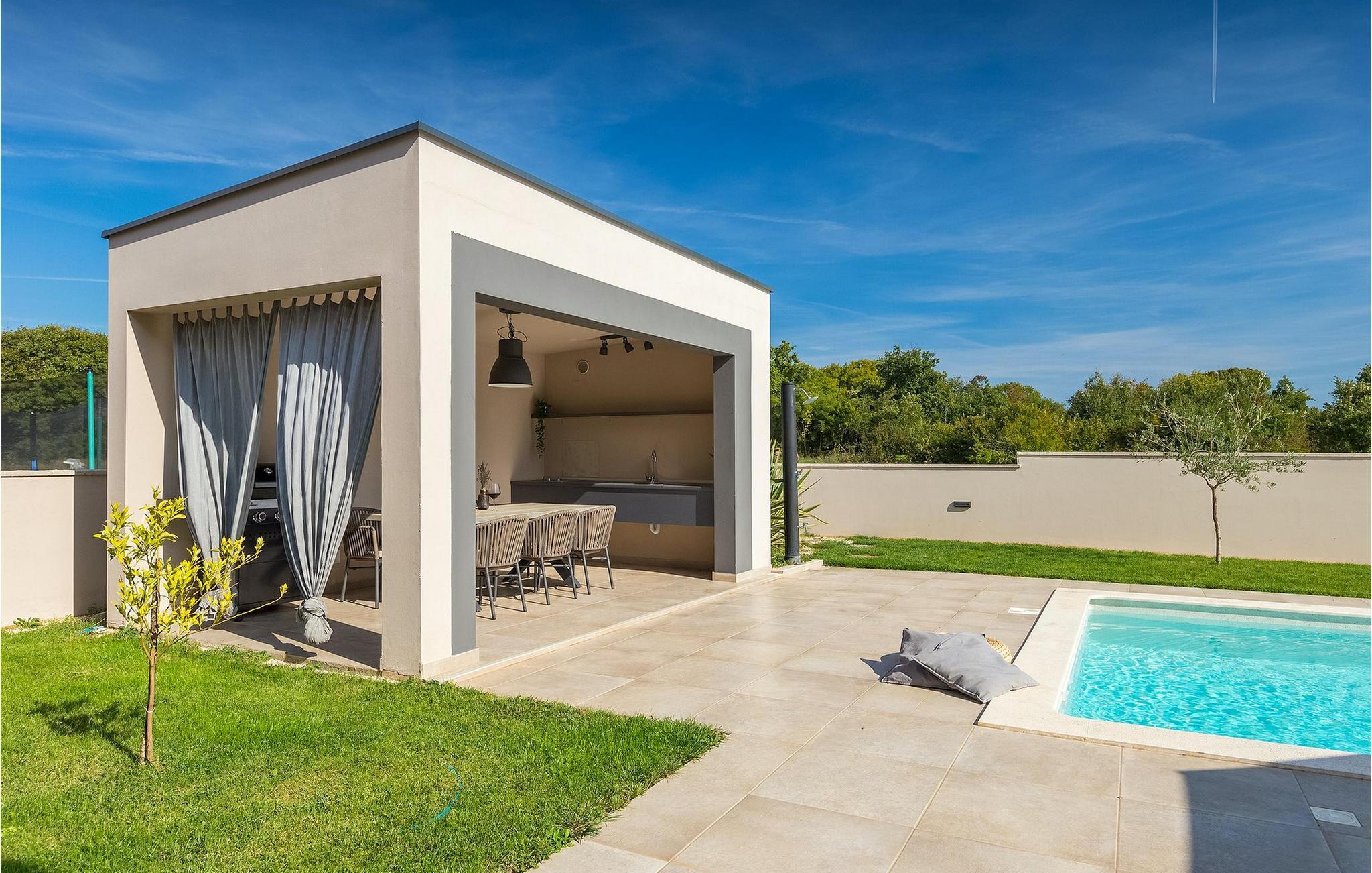 Den fantastiske Villa Omnia ligger i den lille landsbyen Loborika i nærheten av Pula. Villaen er en arkitektonisk perle i åpent landskap og er en flott base for en uforglemmelig sommerferie. Villaen har plass til opptil 6 personer i 3 komfortable soverom. Ett av soverommene har 2 enkeltsenger som kan settes sammen, mens de to andre soverommene har en dobbeltseng hver. Alle soverommene ligger i første etasje, mens første etasje er reservert for oppholdsrommet. Der finner du et lyst, moderne kjøkken, hvorfra du har tilgang til spisestuen og til slutt stuen, hvor du kan slappe av. Uteområdet er utsmykket med det vakre bassenget, som bare innbyr til å hoppe uti og forfriske seg på varme sommerdager. Salongområdet og utekjøkkenet tilbyr ekstra skygge og er det perfekte stedet å gjemme seg for solen. Villaen har også to husker, en sklie og en trampoline, slik at de minste også kan nyte oppholdet i Villa Omnia. Villaen har privat parkering for opptil 3 biler, gratis Wi-Fi og klimaanlegg. Villa Omnia ligger en kort kjøretur fra Pula. Pula er Istrias turistsentrum, både kulturelt og tradisjonelt, men også på grunn av det vakre naturlandskapet. Byen Pula opplevde sin storhetstid i romertiden. Romerne satte sitt preg på byen, spesielt det vakre amfiteateret. I venetiansk tid utviklet Pula seg til å bli Adriaterhavets kontrollsenter