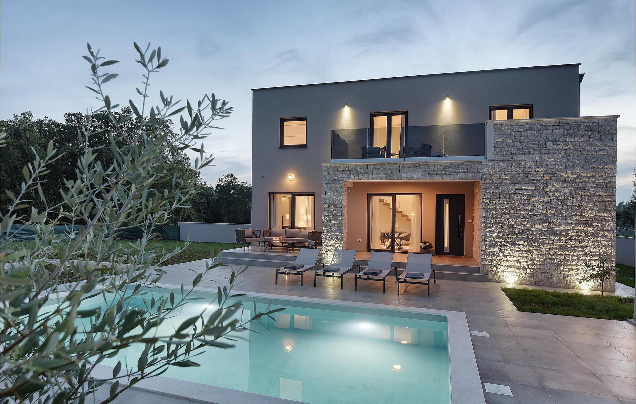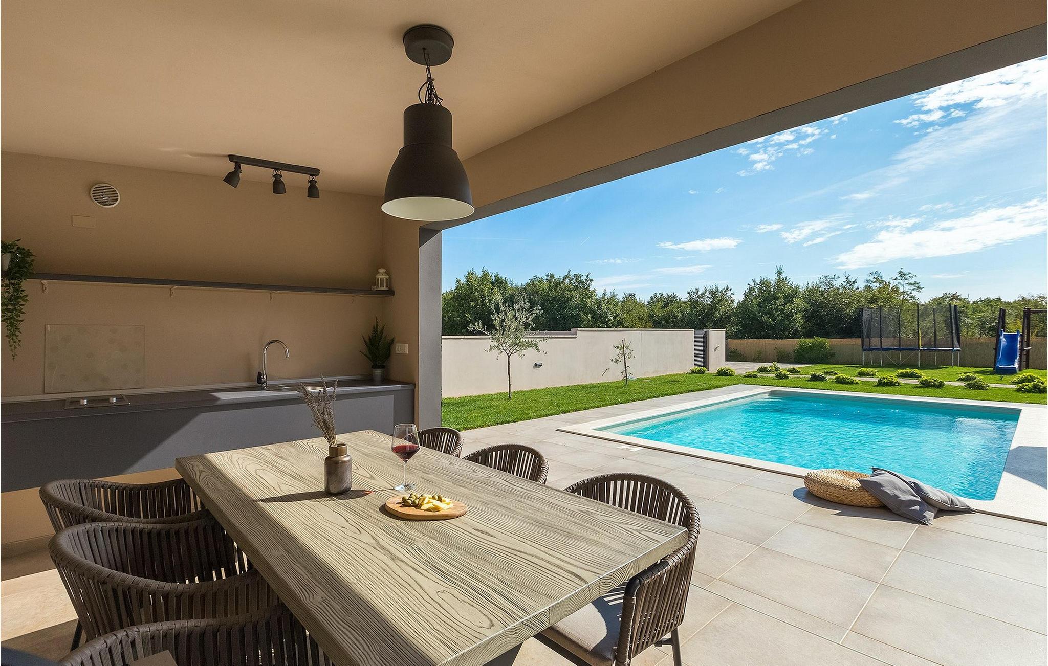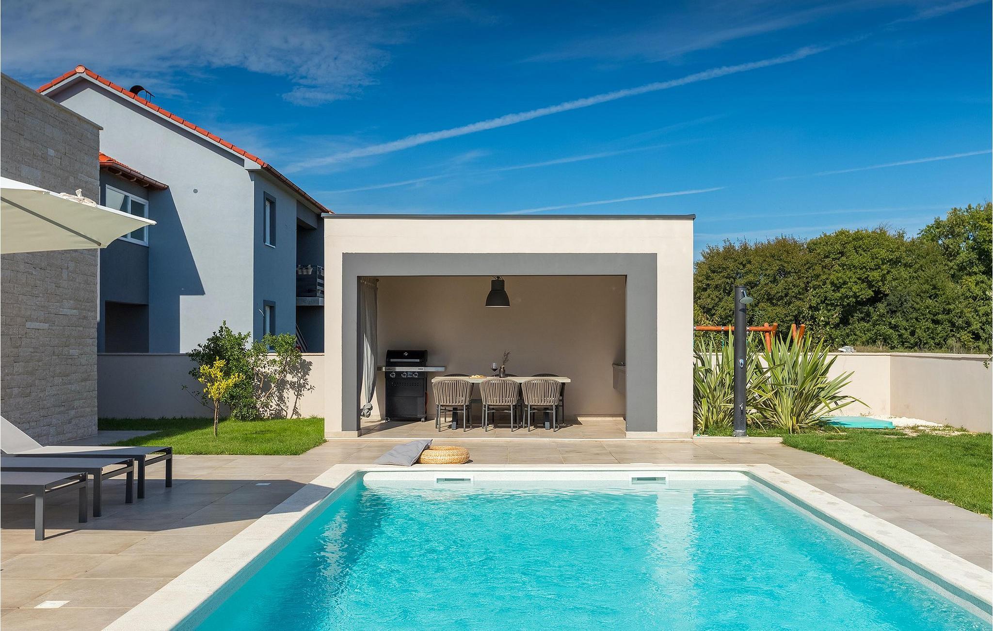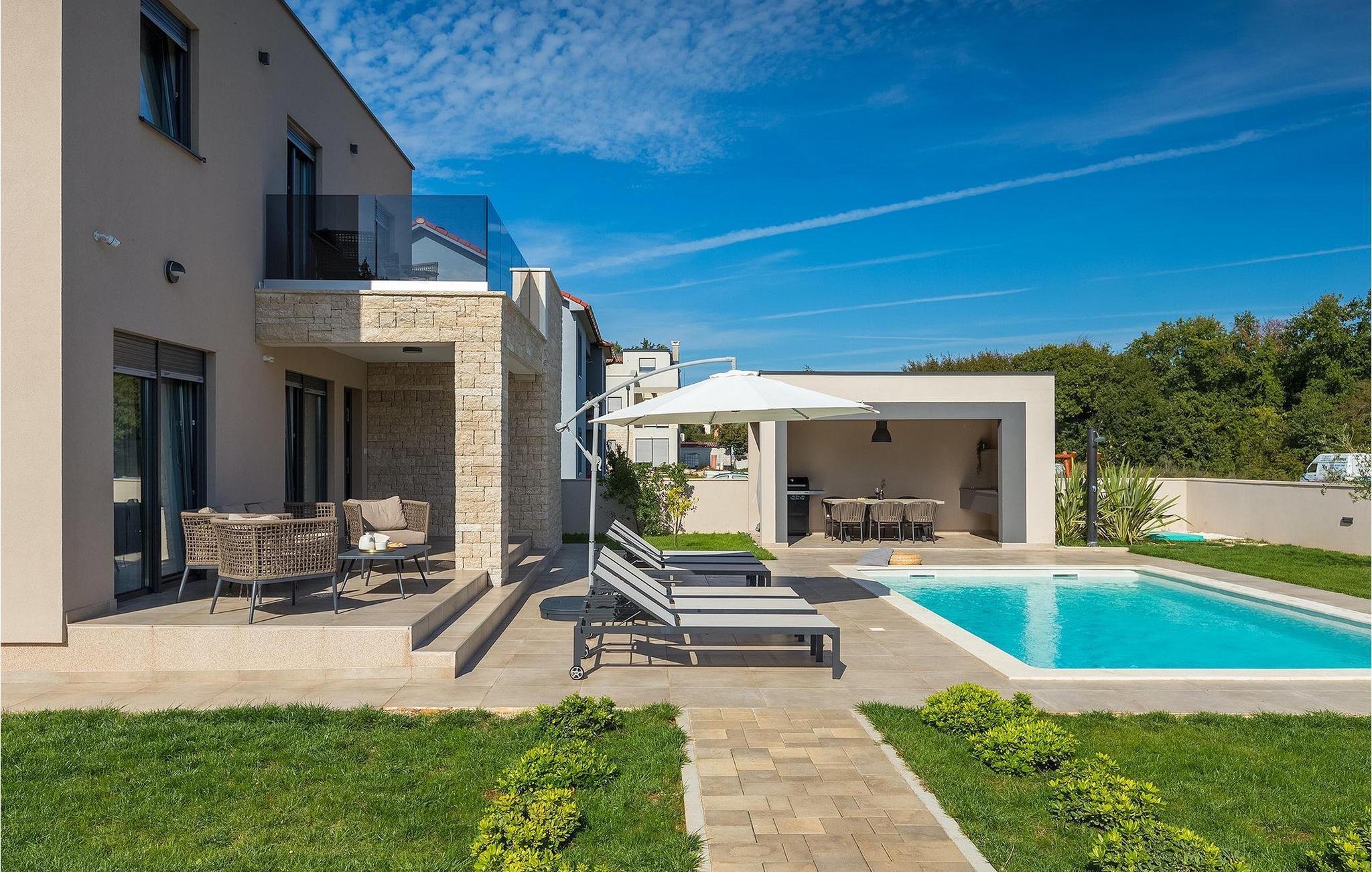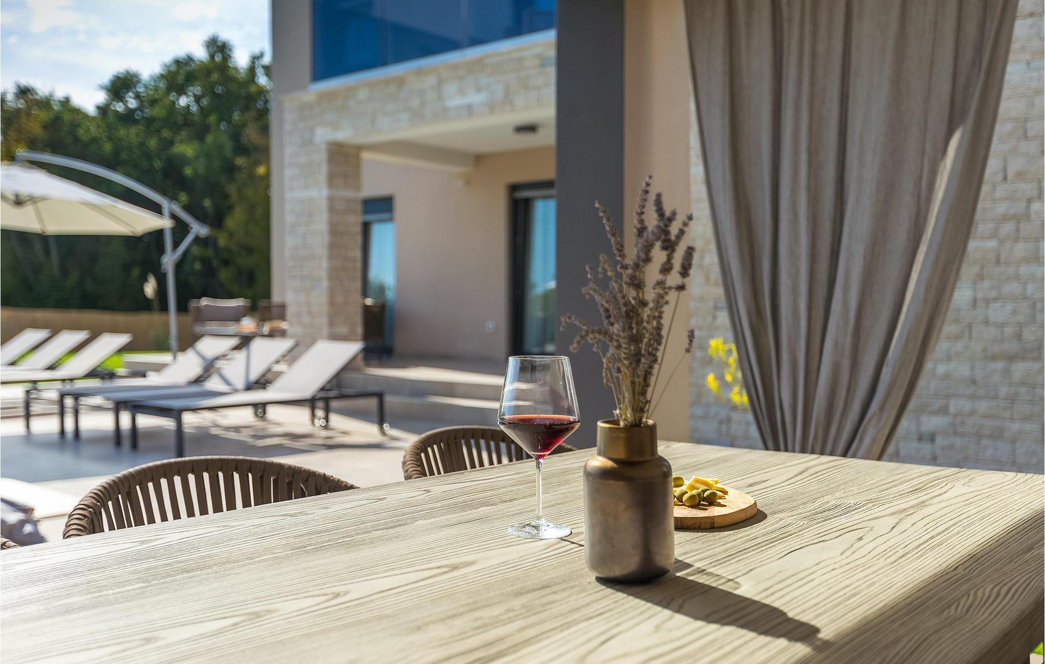 Den fantastiske Villa Omnia ligger i den lille landsbyen Loborika i nærheten av Pula. Villaen er en arkitektonisk perle i åpent landskap og er en flott base for en uforglemmelig sommerferie. Villaen har plass til opptil 6 personer i 3 komfortable soverom. Ett av soverommene har 2 enkeltsenger som kan settes sammen, mens de to andre soverommene har en dobbeltseng hver. Alle soverommene ligger i første etasje, mens første etasje er reservert for oppholdsrommet. Der finner du et lyst, moderne kjøkken, hvorfra du har tilgang til spisestuen og til slutt stuen, hvor du kan slappe av. Uteområdet er utsmykket med det vakre bassenget, som bare innbyr til å hoppe uti og forfriske seg på varme sommerdager. Salongområdet og utekjøkkenet tilbyr ekstra skygge og er det perfekte stedet å gjemme seg for solen. Villaen har også to husker, en sklie og en trampoline, slik at de minste også kan nyte oppholdet i Villa Omnia. Villaen har privat parkering for opptil 3 biler, gratis Wi-Fi og klimaanlegg. Villa Omnia ligger en kort kjøretur fra Pula. Pula er Istrias turistsentrum, både kulturelt og tradisjonelt, men også på grunn av det vakre naturlandskapet. Byen Pula opplevde sin storhetstid i romertiden. Romerne satte sitt preg på byen, spesielt det vakre amfiteateret. I venetiansk tid utviklet Pula seg til å bli Adriaterhavets kontrollsenter