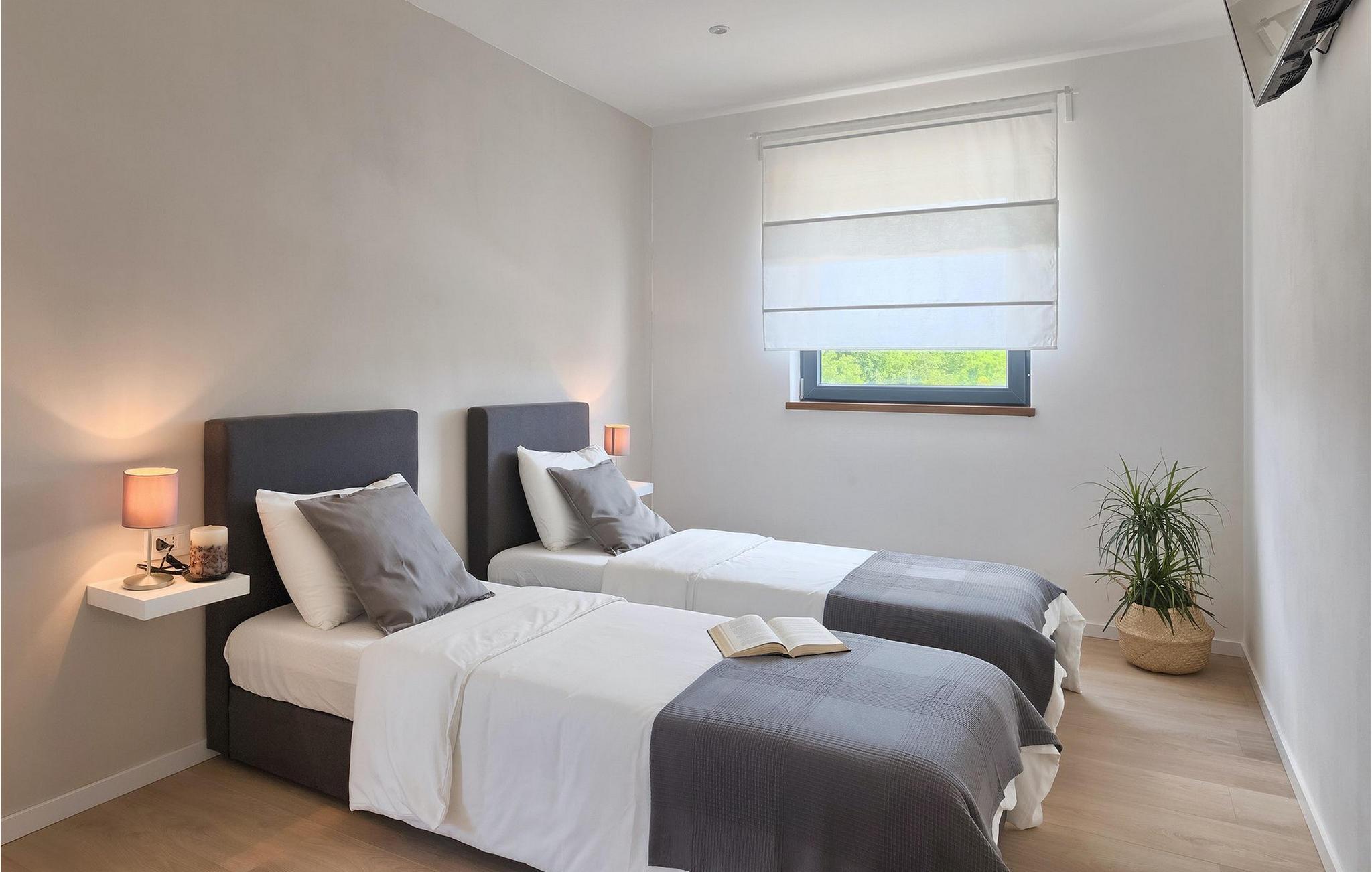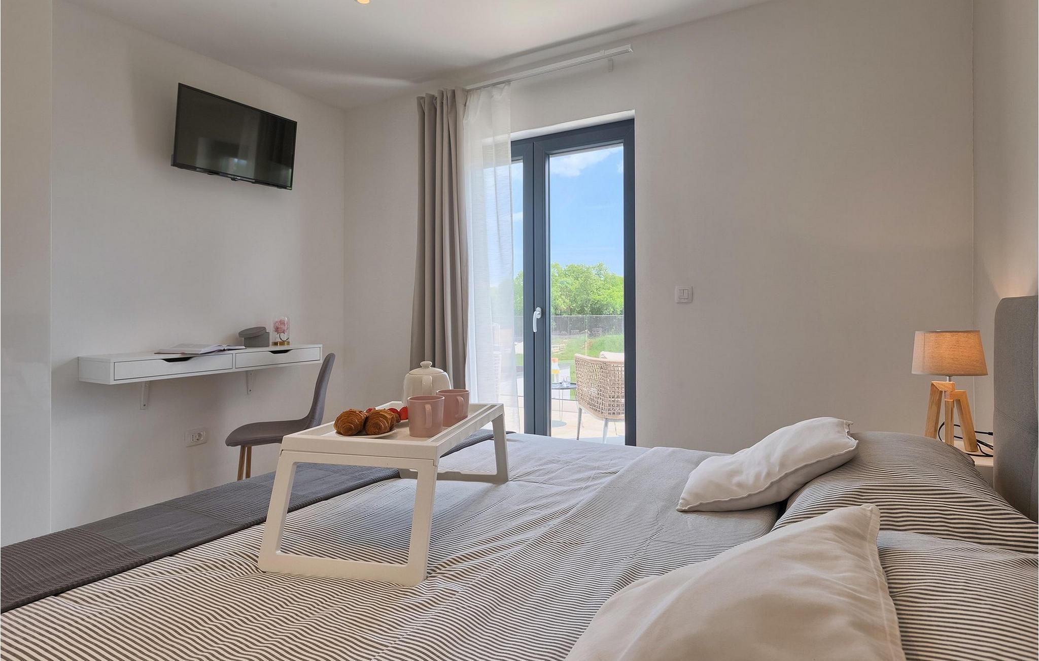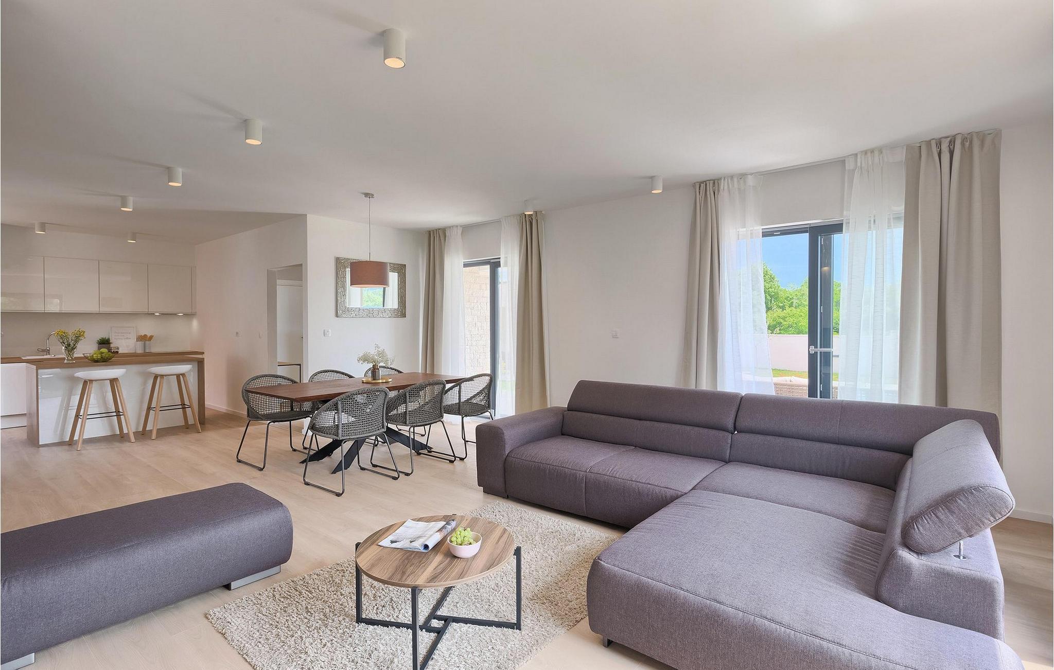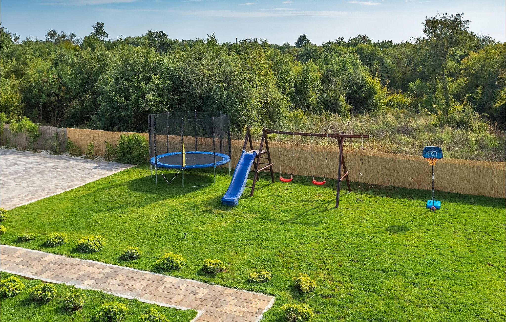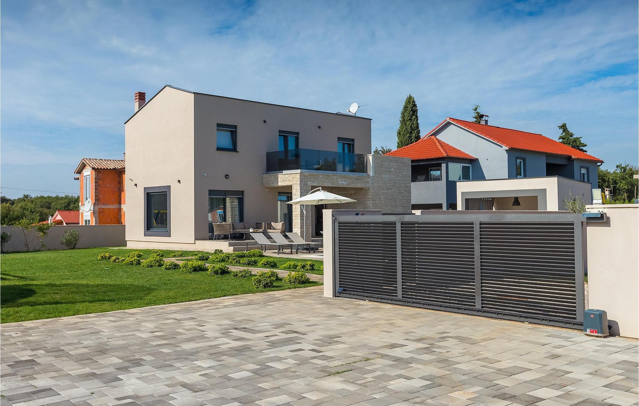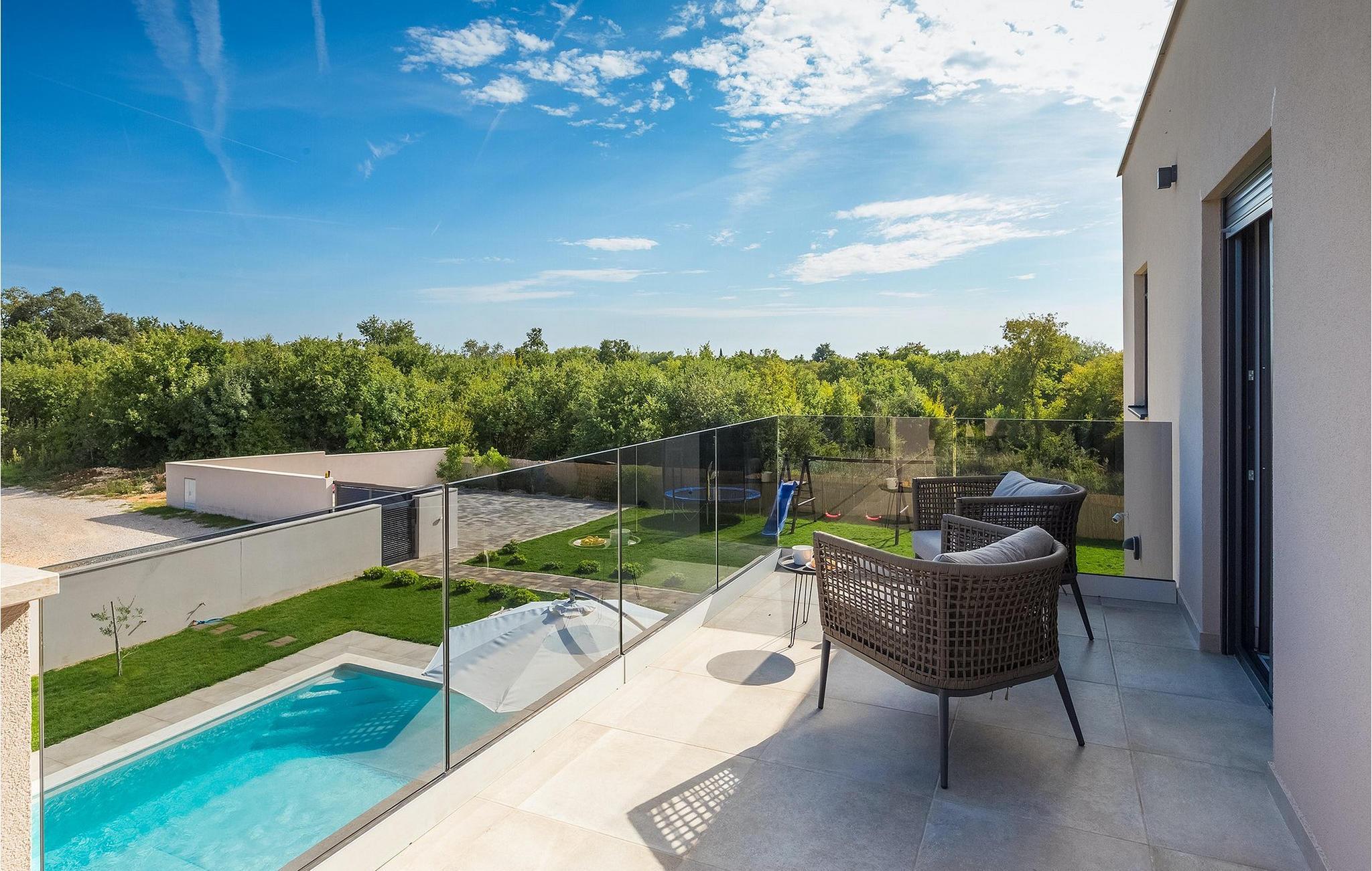 Den fantastiske Villa Omnia ligger i den lille landsbyen Loborika i nærheten av Pula. Villaen er en arkitektonisk perle i åpent landskap og er en flott base for en uforglemmelig sommerferie. Villaen har plass til opptil 6 personer i 3 komfortable soverom. Ett av soverommene har 2 enkeltsenger som kan settes sammen, mens de to andre soverommene har en dobbeltseng hver. Alle soverommene ligger i første etasje, mens første etasje er reservert for oppholdsrommet. Der finner du et lyst, moderne kjøkken, hvorfra du har tilgang til spisestuen og til slutt stuen, hvor du kan slappe av. Uteområdet er utsmykket med det vakre bassenget, som bare innbyr til å hoppe uti og forfriske seg på varme sommerdager. Salongområdet og utekjøkkenet tilbyr ekstra skygge og er det perfekte stedet å gjemme seg for solen. Villaen har også to husker, en sklie og en trampoline, slik at de minste også kan nyte oppholdet i Villa Omnia. Villaen har privat parkering for opptil 3 biler, gratis Wi-Fi og klimaanlegg. Villa Omnia ligger en kort kjøretur fra Pula. Pula er Istrias turistsentrum, både kulturelt og tradisjonelt, men også på grunn av det vakre naturlandskapet. Byen Pula opplevde sin storhetstid i romertiden. Romerne satte sitt preg på byen, spesielt det vakre amfiteateret. I venetiansk tid utviklet Pula seg til å bli Adriaterhavets kontrollsenter
