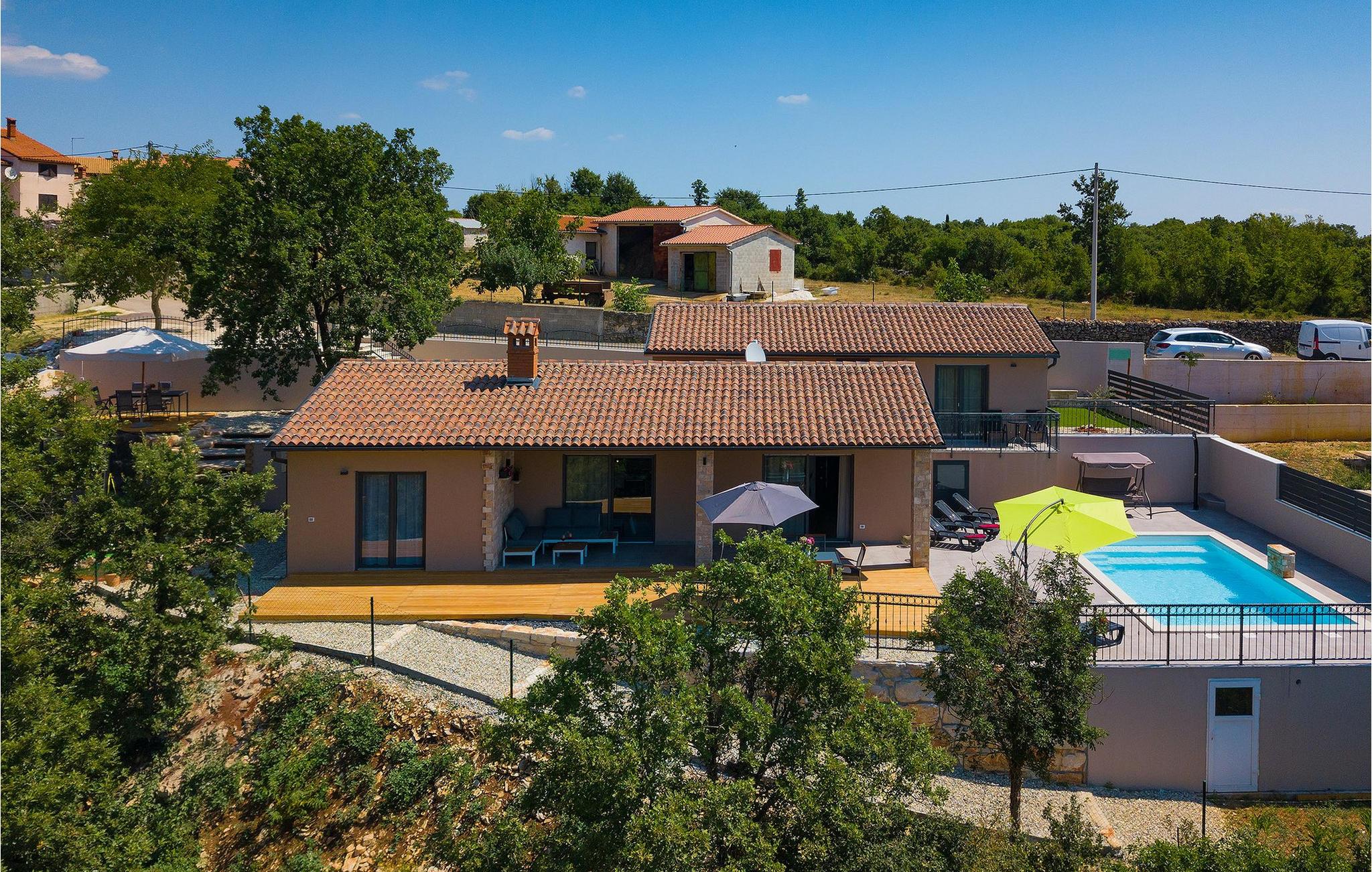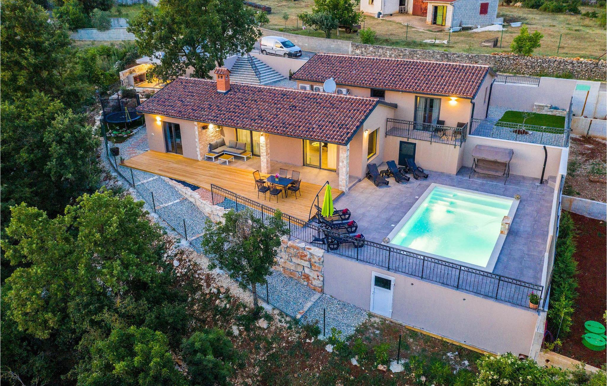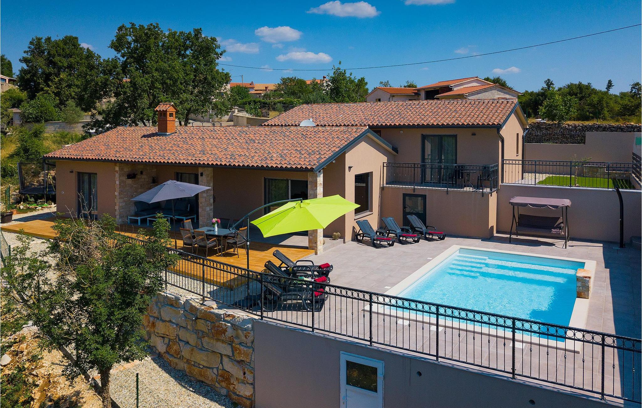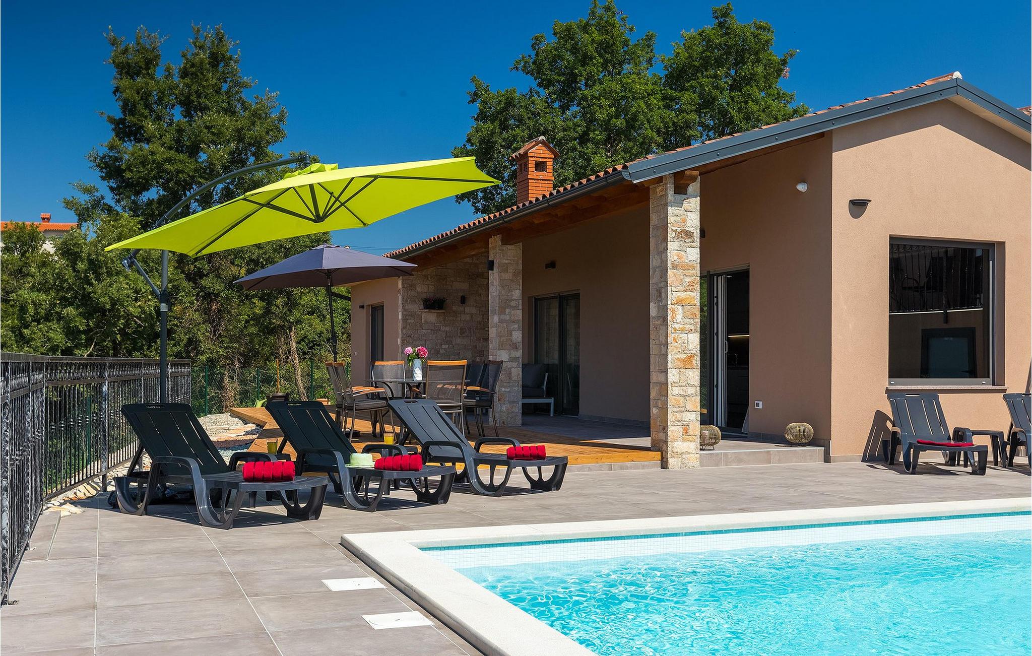 Navnet sier alt: Villa Gloria er virkelig fantastisk! Villaen ligger i en liten landsby i Istria, ikke langt fra Pula, og er ideell for alle som ønsker å tilbringe en rolig ferie i Kroatia. Villa Gloria er beregnet for maksimalt 6 personer, noe som gjør den ideell for en familieferie. Villaen har 2 etasjer. I underetasjen, som har direkte utgang til bassenget, finner du den koselige stuen, det fullt utstyrte kjøkkenet med spiseplass, samt et bad og hovedsoverommet, som er innredet med en komfortabel dobbeltseng. Går du opp trappen, finner du i første etasje et soverom til og ytterligere to soverom, hvorav det ene har to enkeltsenger. Det andre soverommet er innredet med en dobbeltseng og har en privat terrasse med utsikt over bassenget - ideelt for den første koppen kaffe om morgenen. Villa Gloria har også en uteservering og en kullgrill hvor du kan tilberede deilige spesialiteter. Det finnes flere sittegrupper ute - det er bare å velge en. Det innbydende bassenget står også til din disposisjon - den perfekte løsningen på varme sommerdager! Villaen har også en trampoline, som umiddelbart vil falle i smak hos de yngste gjestene.