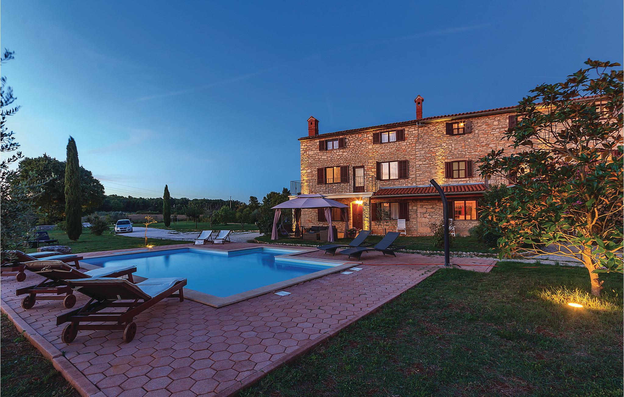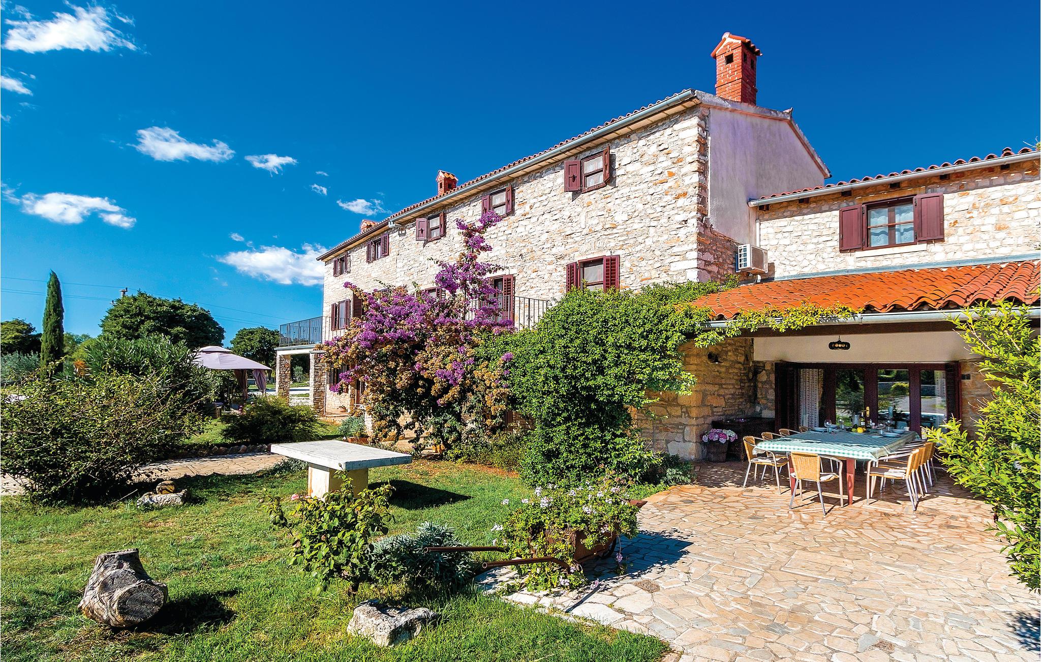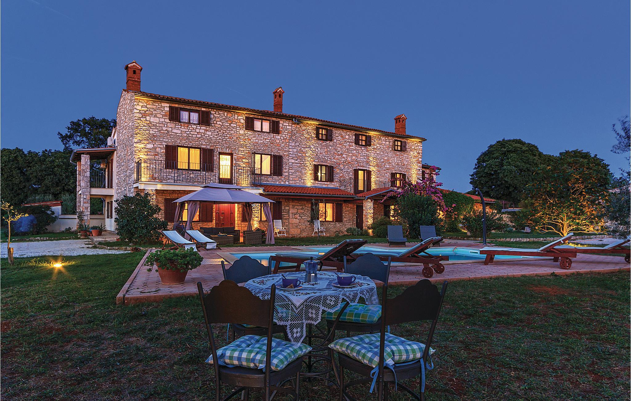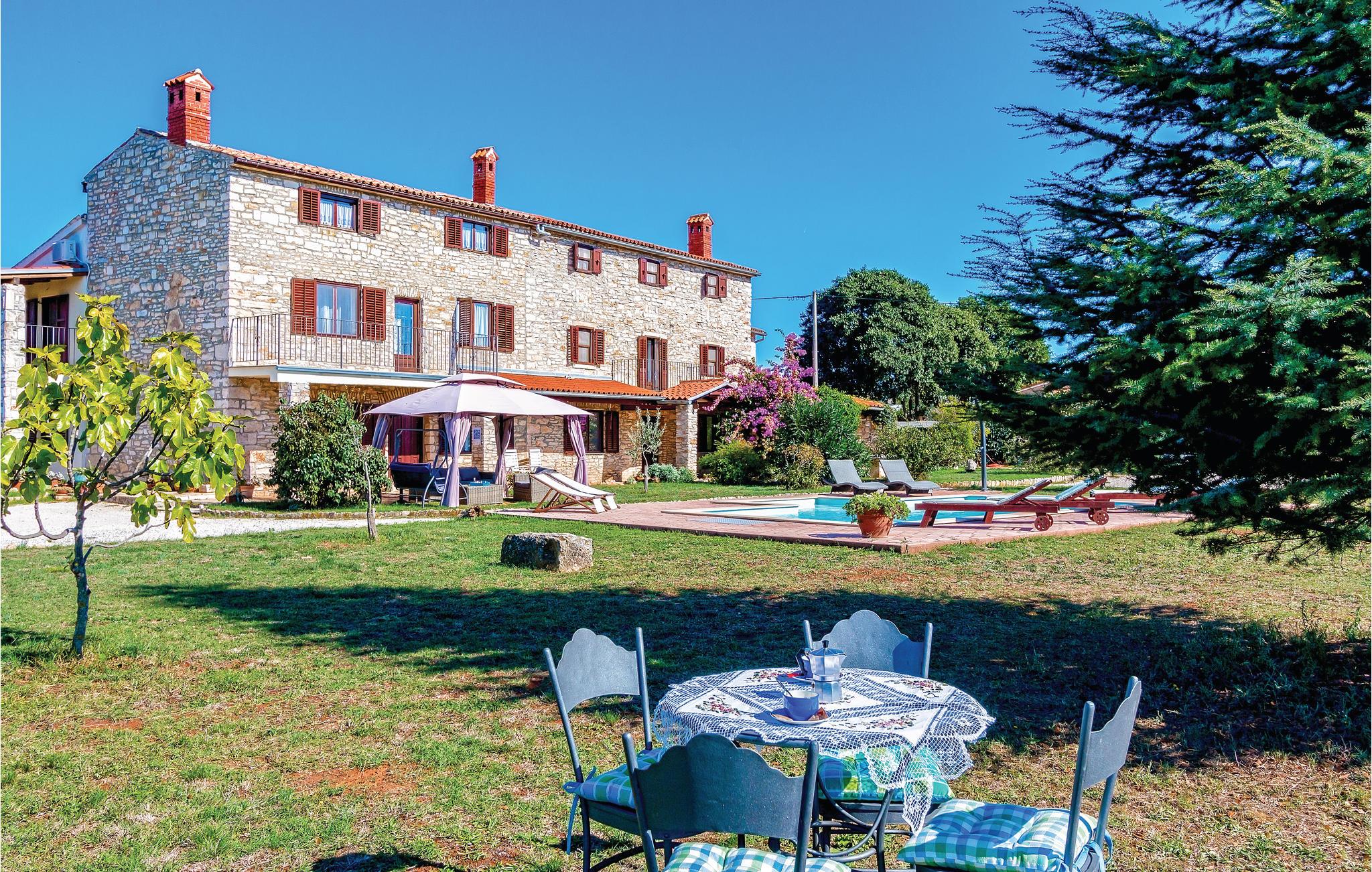 Disse to halvdelene av en tomannsbolig ligger i en idyllisk landsby. De er modernisert, romslige og innredet i typisk istrisk stil og med mye kjærlighet. Her kan du nyte livet på landet til det fulle. Den klare luften, den vakre naturen og den absolutte roen, som bare blir avbrutt av fuglesang om morgenen, vil glede deg. Barna dine har en fotballbane på den store inngjerdede tomten og kan boltre seg godt her. Den store terrassen blir din andre stue, hvor du kan nyte solen og se barna leke. I regnvær blir den overbygde terrassen en oase og inviterer deg til koselige runder. Et fantastisk svømmebasseng kan gi en forfriskende avkjøling fra sommervarmen. Der kan du også nyte en deilig cocktail i solsengen eller bare fordype deg i lett sommerlesning. Det er også 2 pianoer. Utforsk omgivelsene og oppdag mange bortgjemte bukter og strender. Soverom 3 og 4 er uten dører.