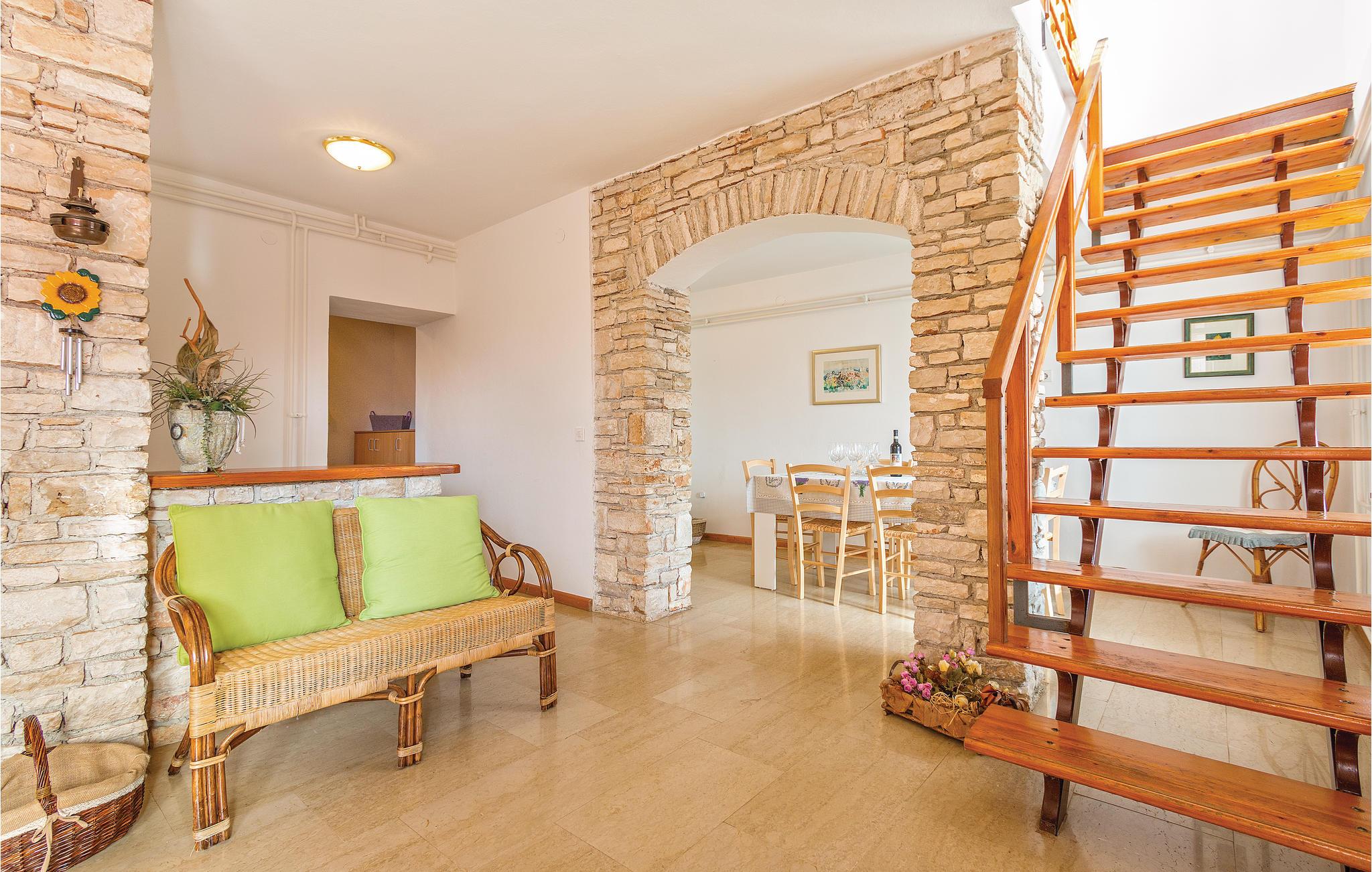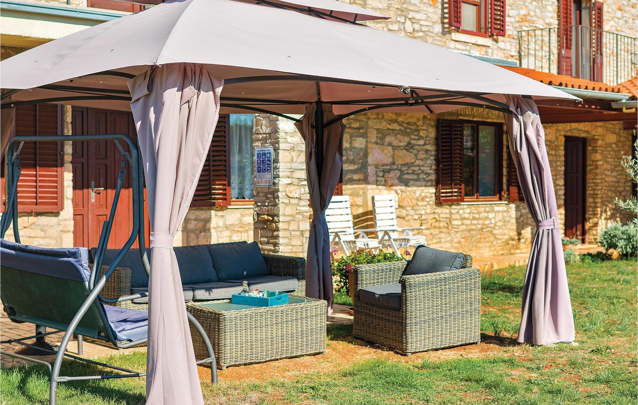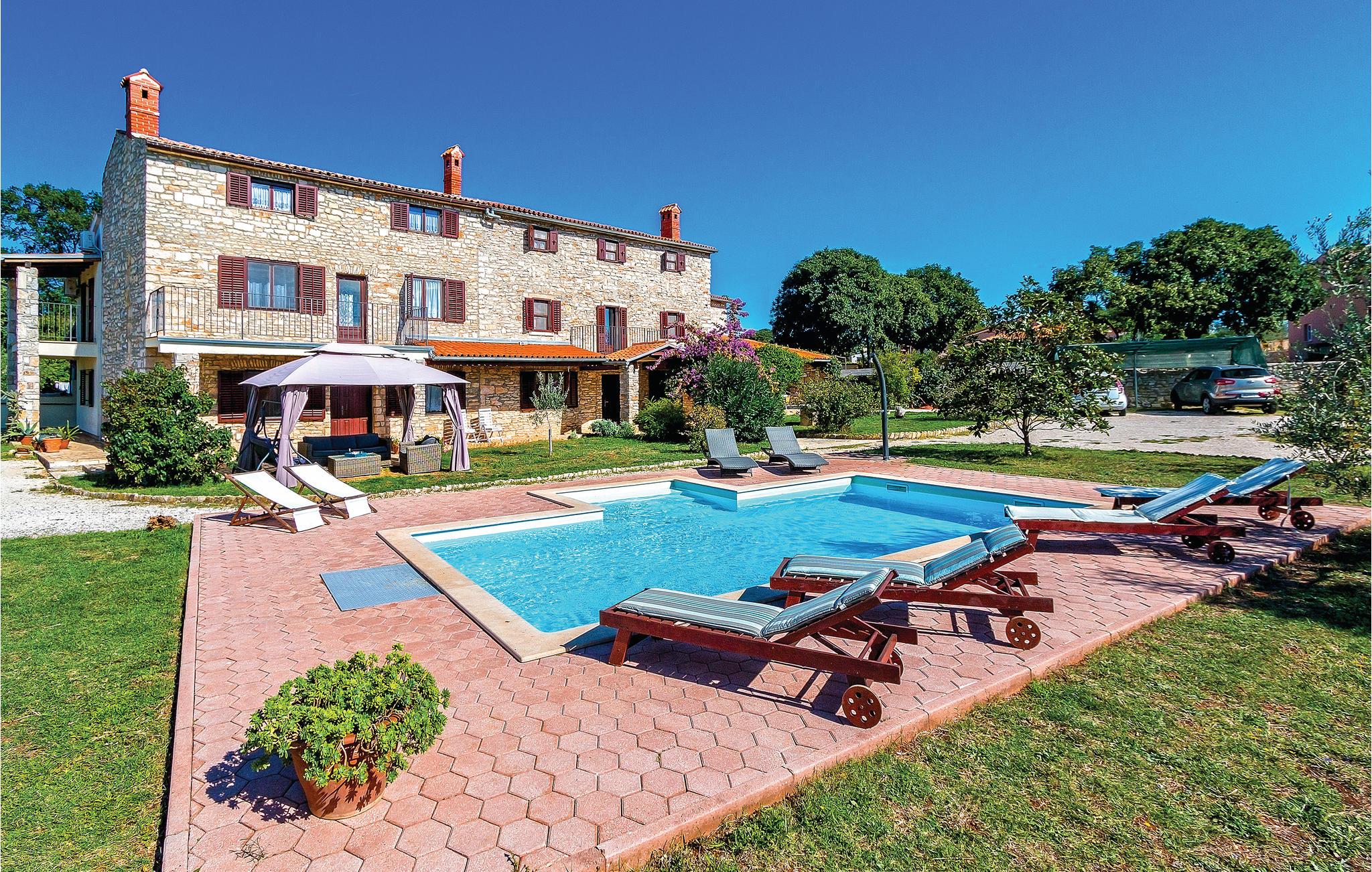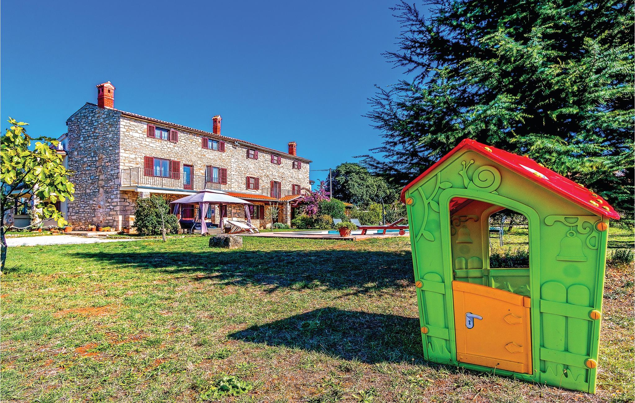 Disse to halvdelene av en tomannsbolig ligger i en idyllisk landsby. De er modernisert, romslige og innredet i typisk istrisk stil og med mye kjærlighet. Her kan du nyte livet på landet til det fulle. Den klare luften, den vakre naturen og den absolutte roen, som bare blir avbrutt av fuglesang om morgenen, vil glede deg. Barna dine har en fotballbane på den store inngjerdede tomten og kan boltre seg godt her. Den store terrassen blir din andre stue, hvor du kan nyte solen og se barna leke. I regnvær blir den overbygde terrassen en oase og inviterer deg til koselige runder. Et fantastisk svømmebasseng kan gi en forfriskende avkjøling fra sommervarmen. Der kan du også nyte en deilig cocktail i solsengen eller bare fordype deg i lett sommerlesning. Det er også 2 pianoer. Utforsk omgivelsene og oppdag mange bortgjemte bukter og strender. Soverom 3 og 4 er uten dører.