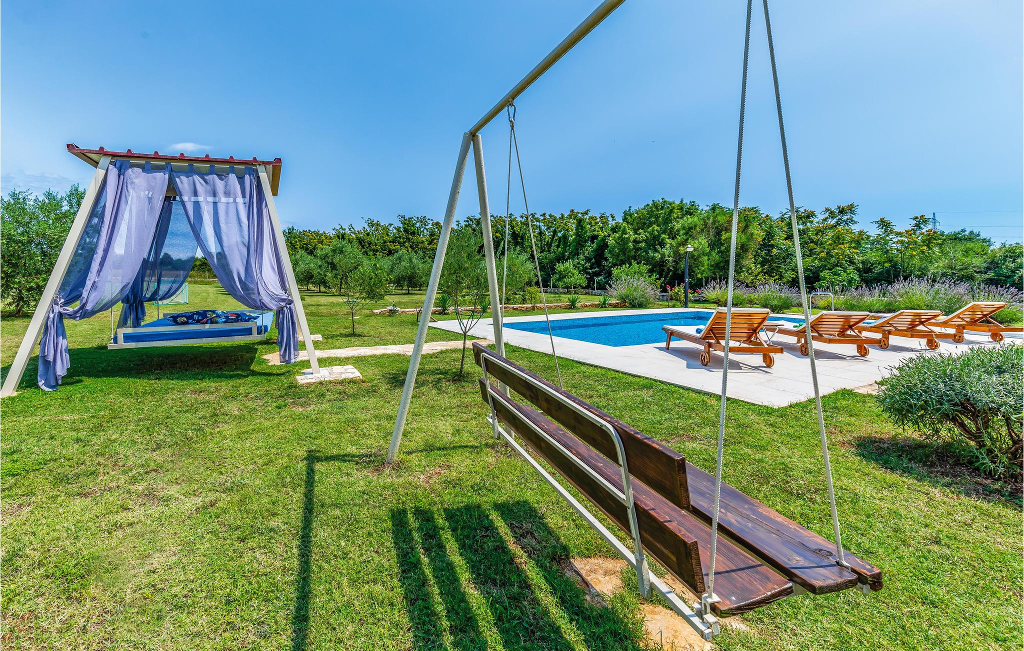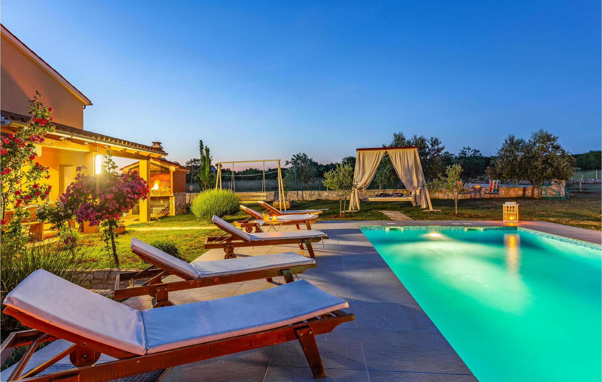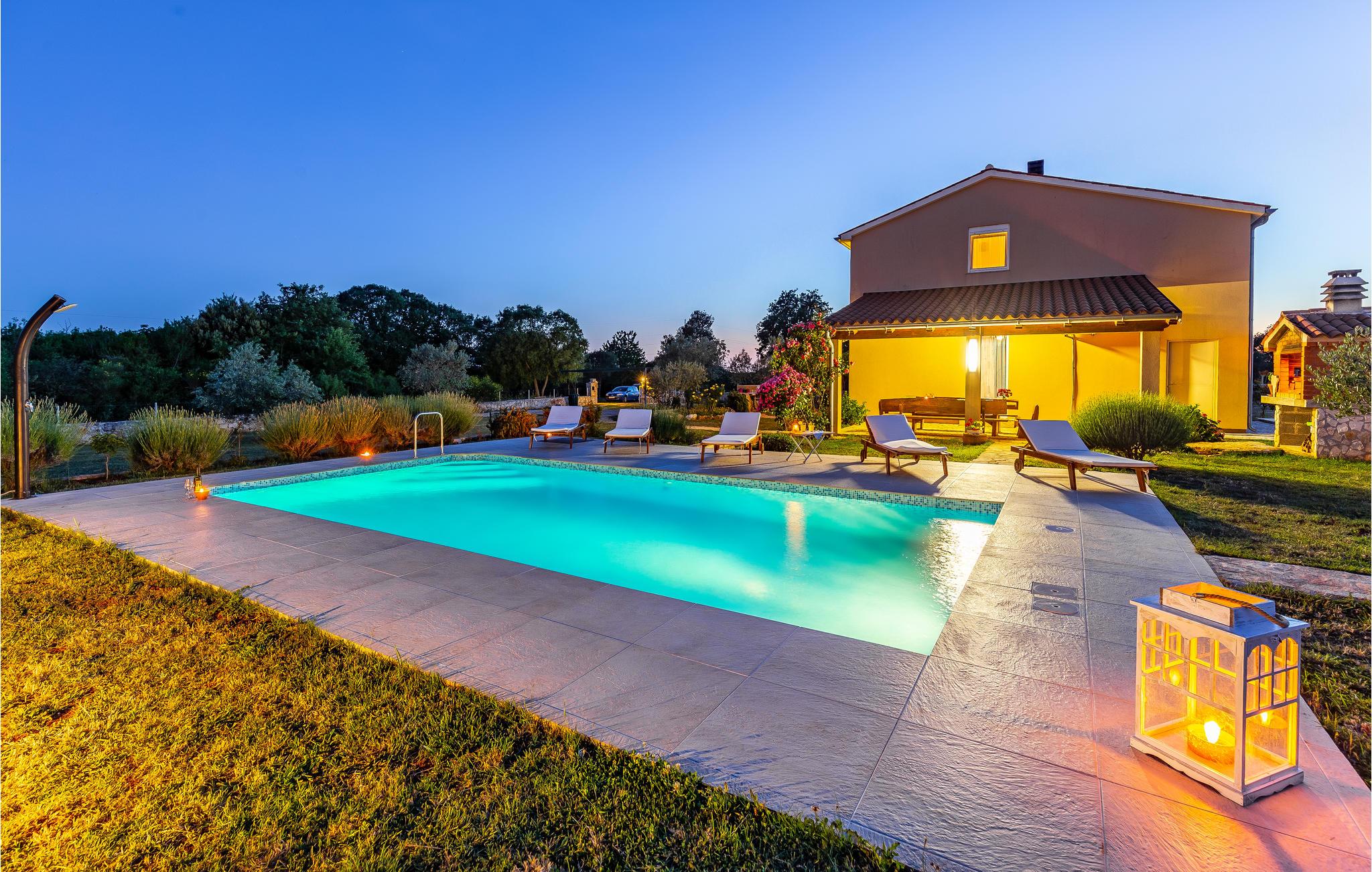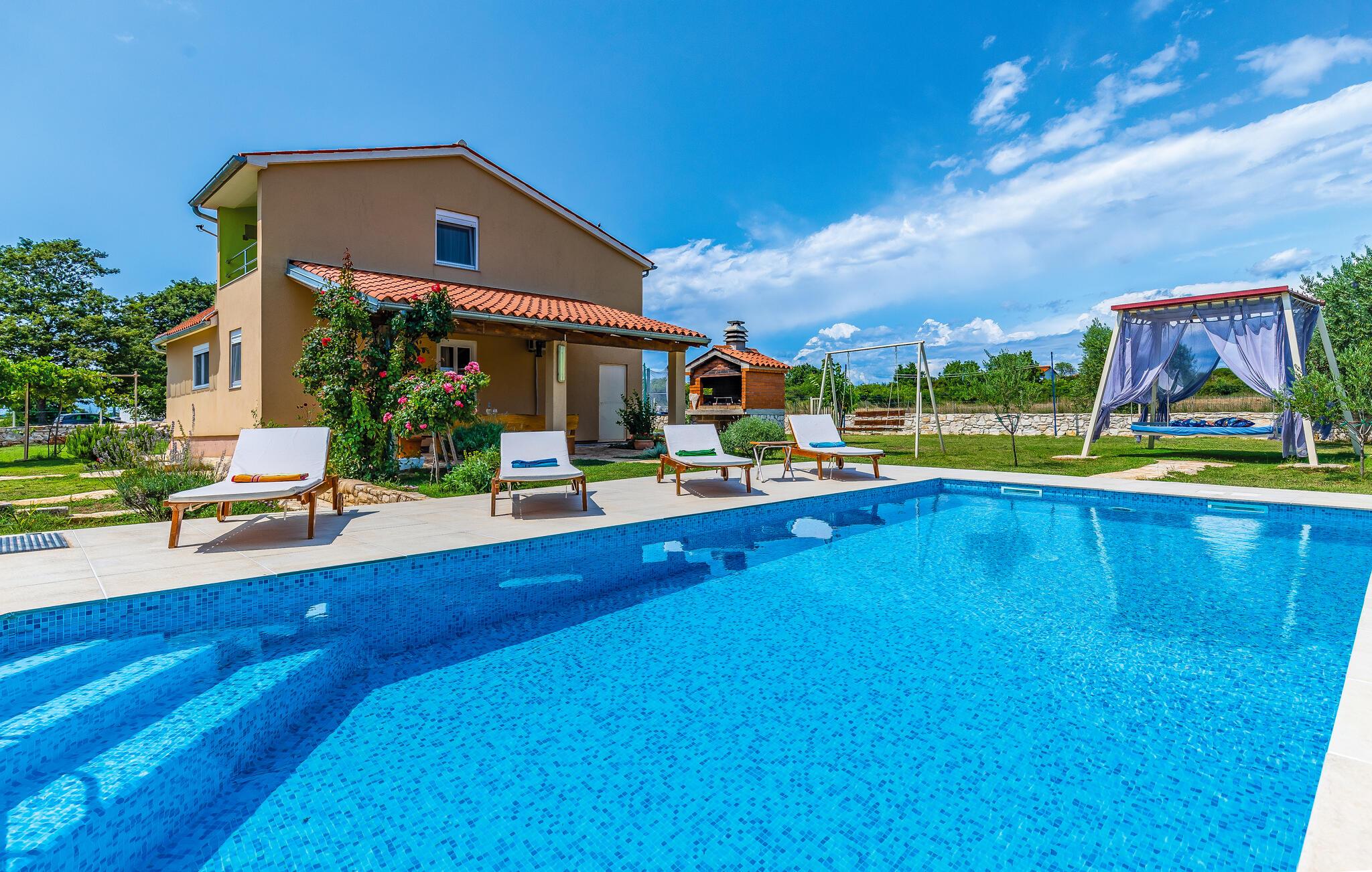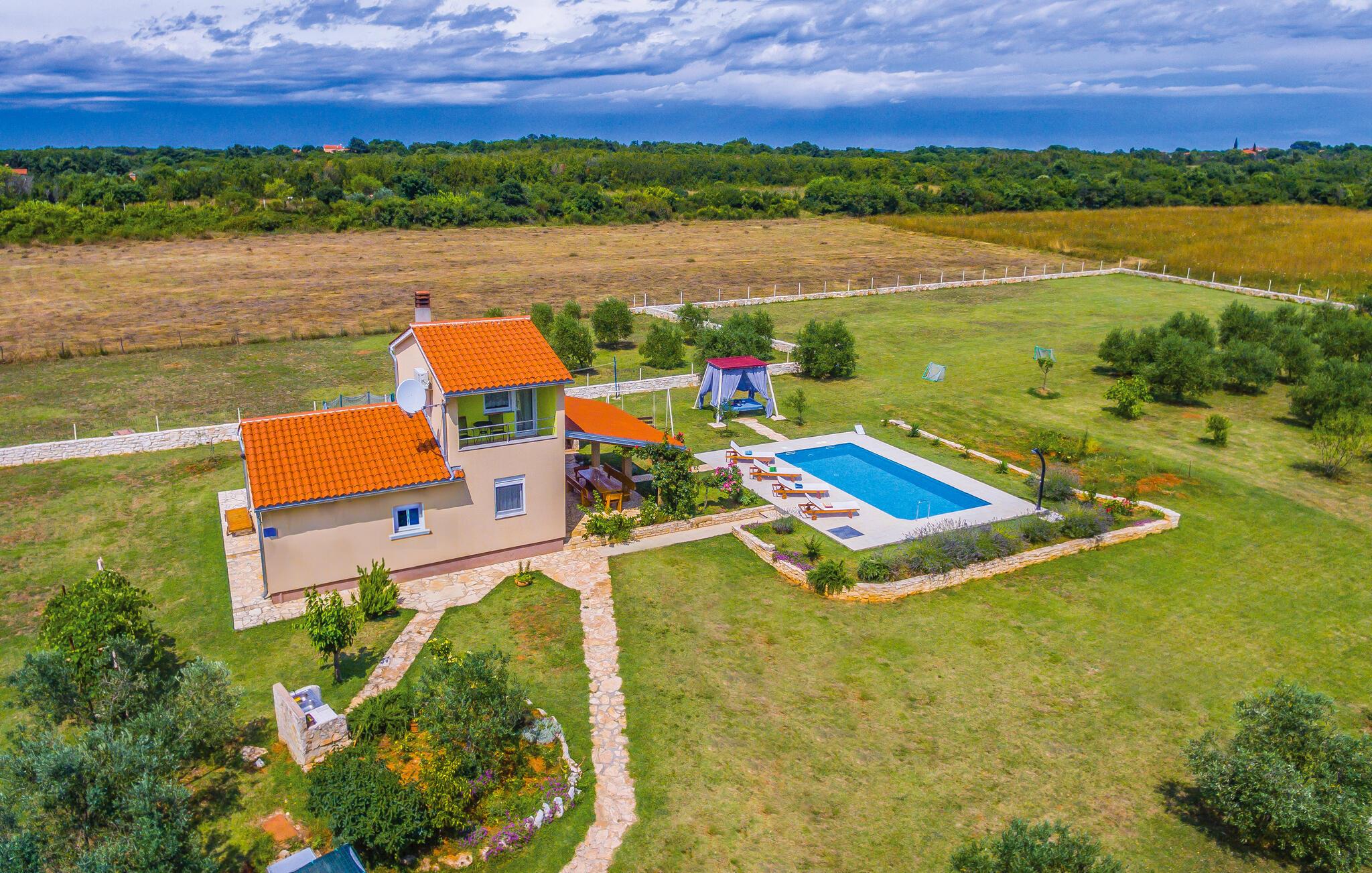Gjør din velfortjente ferie til virkelighet i dette vakre feriehuset med basseng, som ligger på en tomt på ca. 5500 m². Eiendommen ligger litt tilbaketrukket, i nærheten av landsbyen Ian. Interiøret er fordelt over to etasjer, som er forbundet med utvendige trapper. I første etasje er det kjøkken/stue, to soverom, bad og en overbygd terrasse. I andre etasje er det et soverom, et bad og en balkong. Ved siden av den store overbygde terrassen er det en grill hvor du kan tilberede deilige måltider og plukke smakfulle grønnsaker fra den lille grønnsakshagen. Mens du slikker sol på de komfortable solsengene ved bassengområdet, har barna god plass til å leke ubekymret.