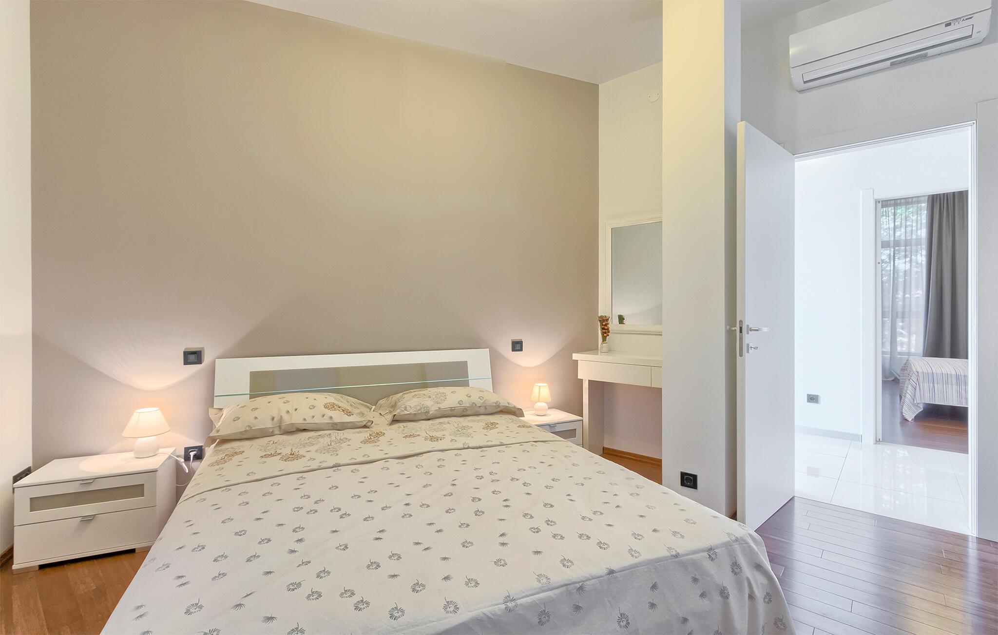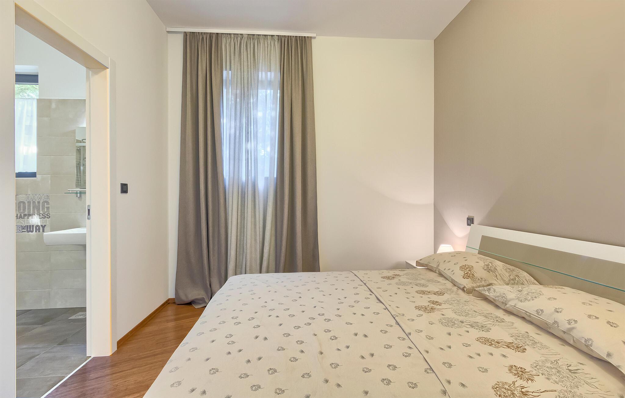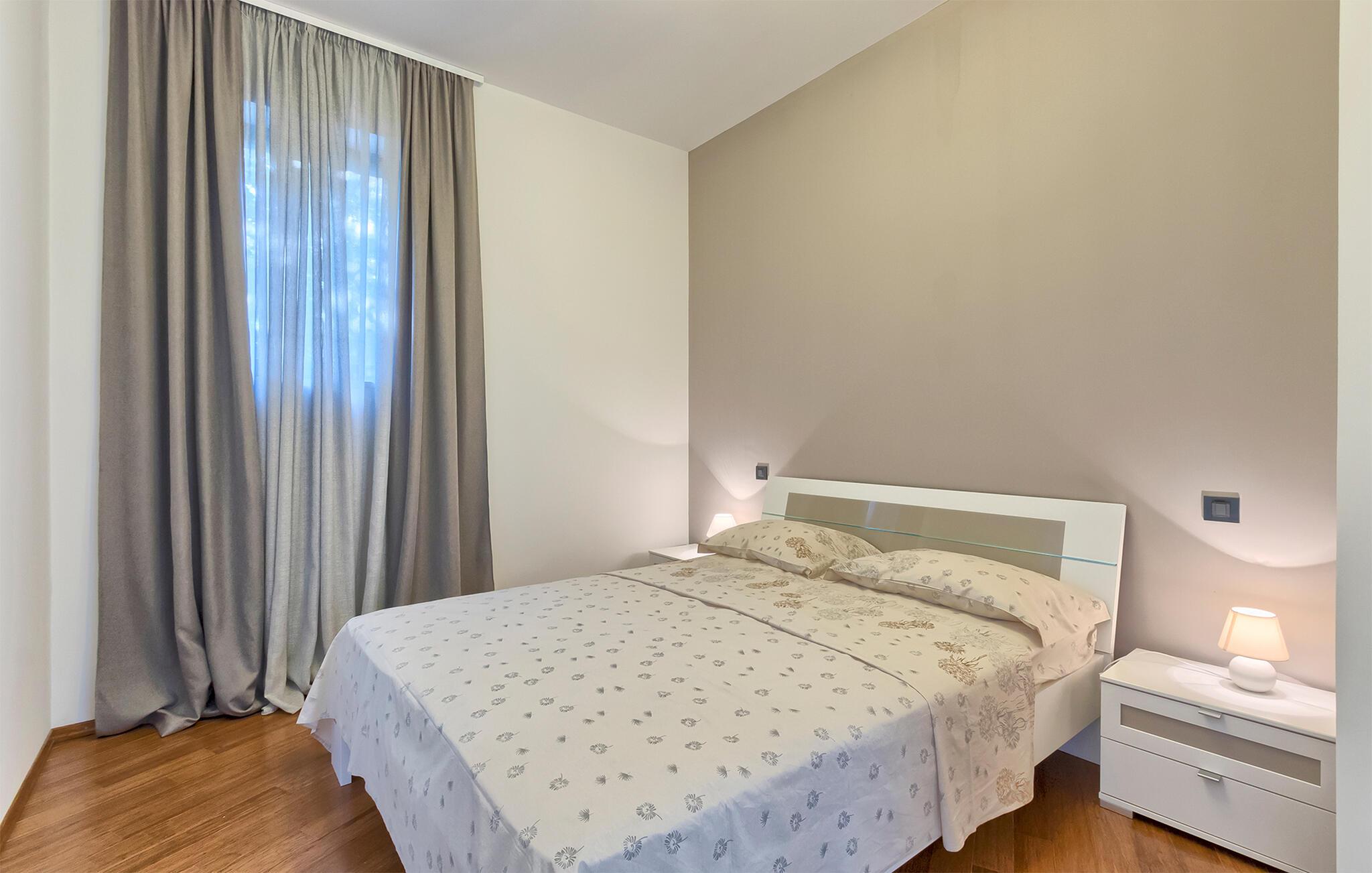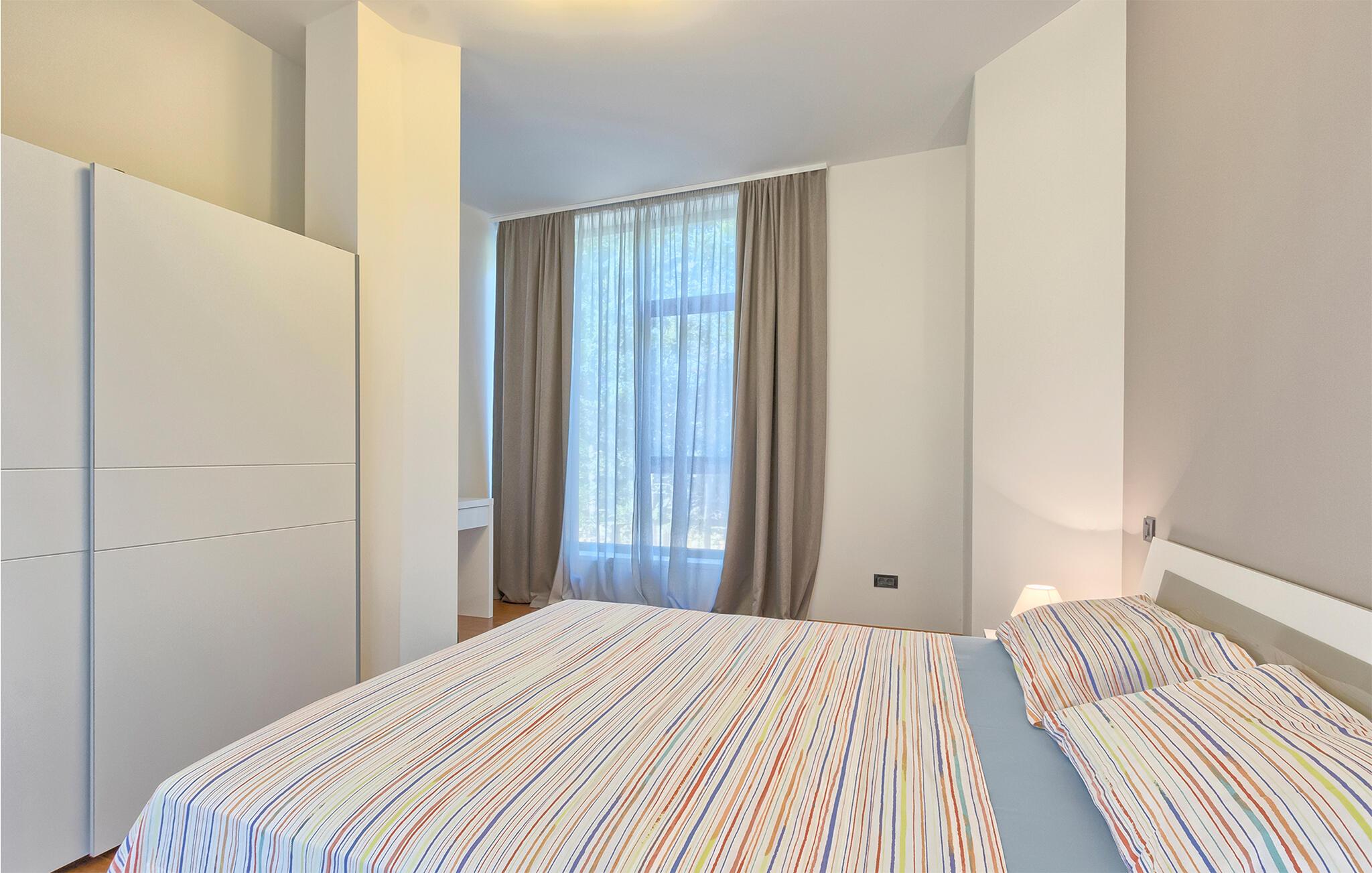 Denne stilfulle leiligheten i Stinjan i nærheten av Pula tilbyr deg og din familie eller venner elegant innkvartering med et snev av klassisk sjarm. Start dagen med frokost ved det store spisebordet som er omgitt av gulv-til-tak-vinduer. Nyt det naturlige lyset som flommer inn i rommene og utsikten over hageområdet med det vakre fellesbassenget. I stuen er det komfortable sitteplasser som innbyr til avslappende stunder. Len deg tilbake, sett deg godt til rette i den koselige sofaen og spill morsomme brettspill eller les en god bok. Det moderne kjøkkenet inspirerer til kreative matlagingskvelder. Lag dine favorittretter og nyt dem i godt selskap.