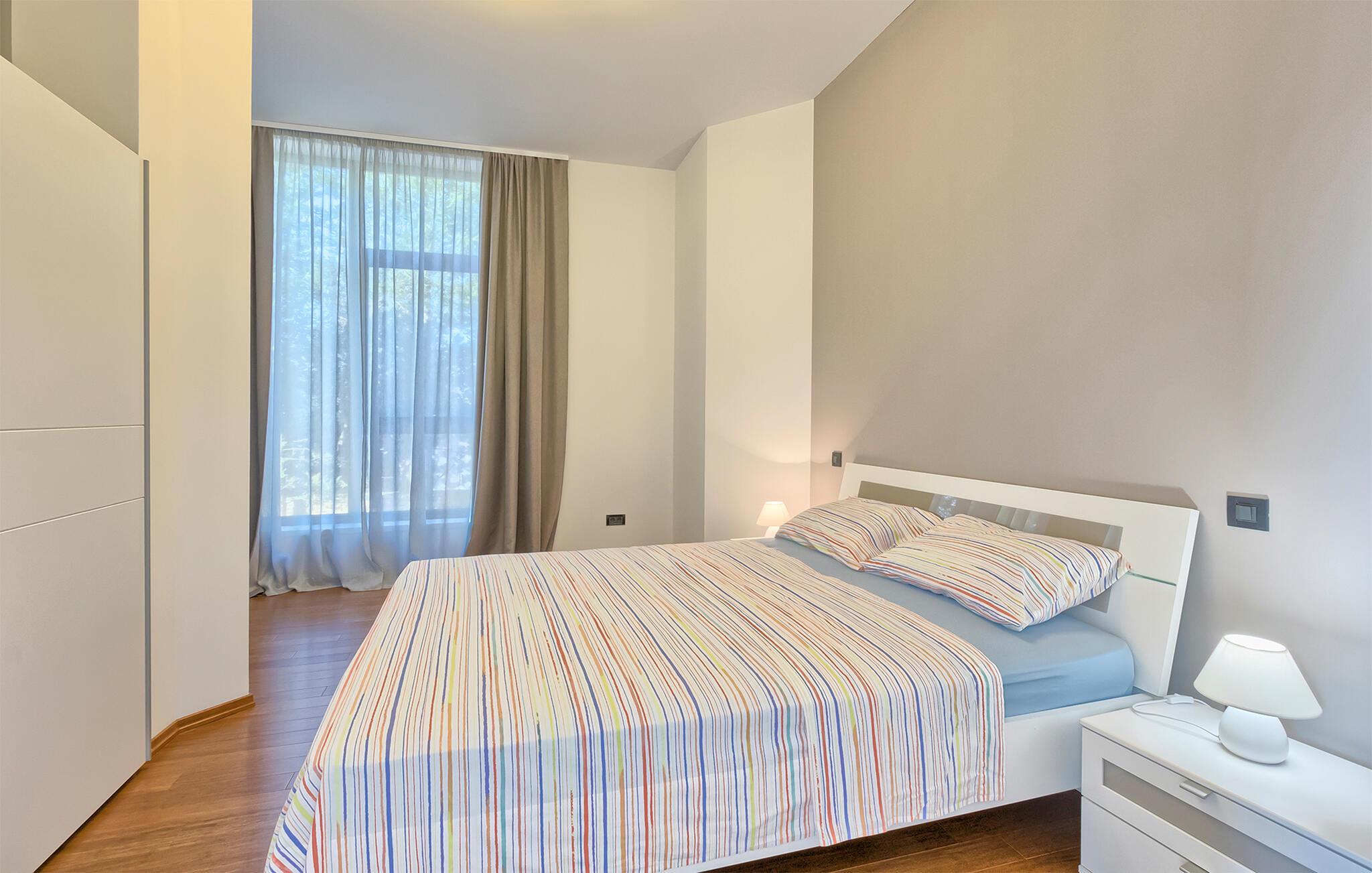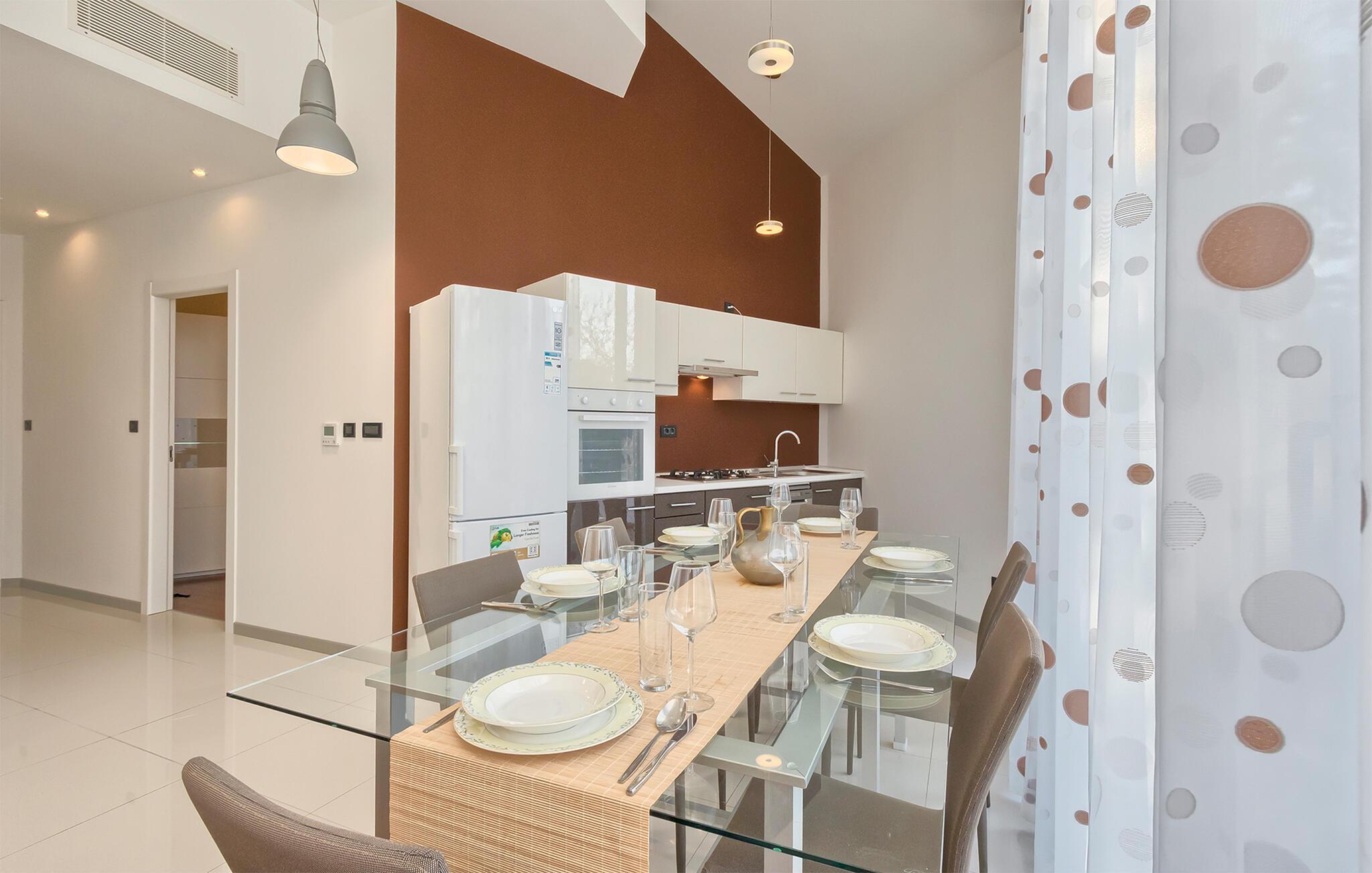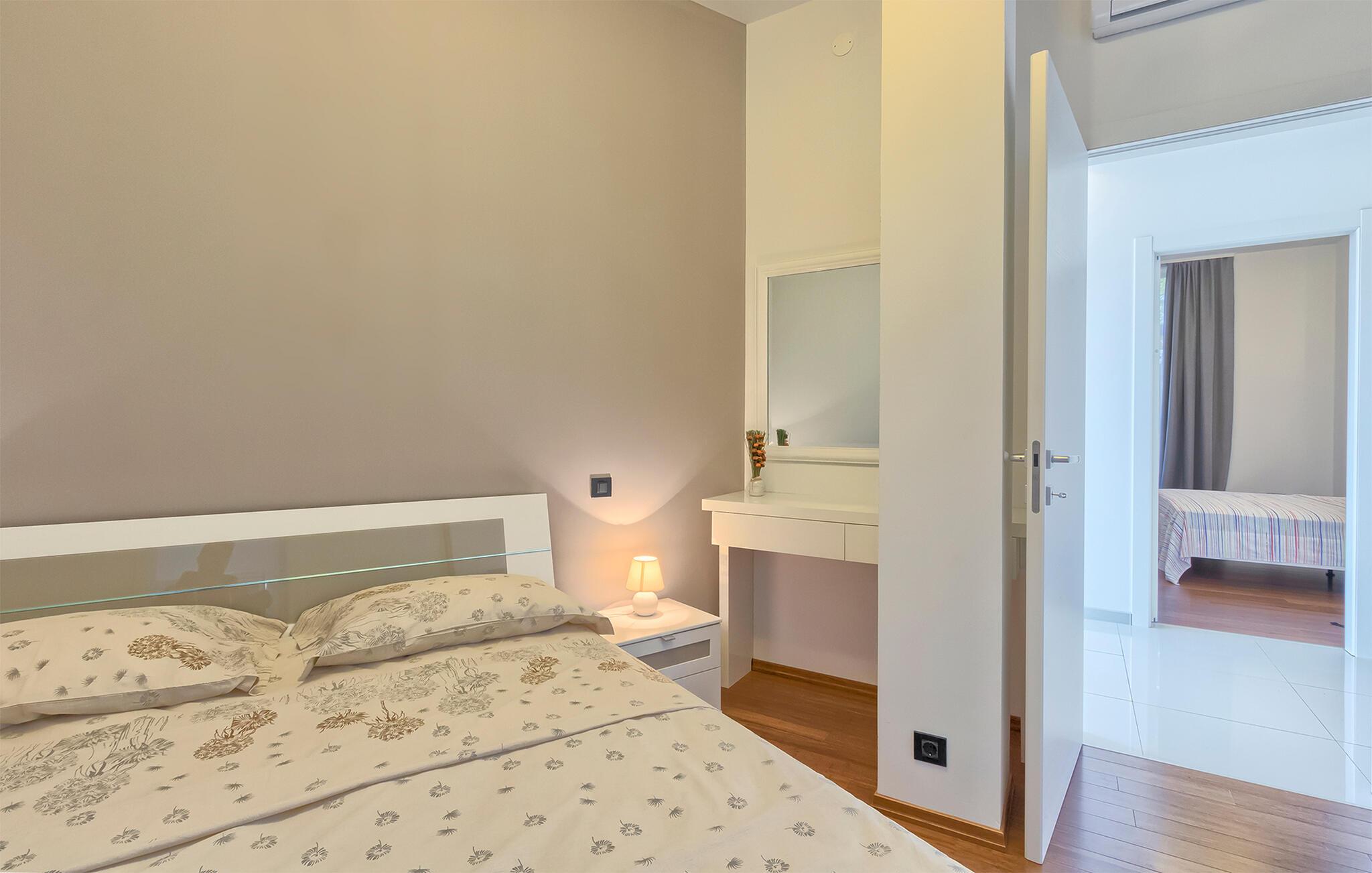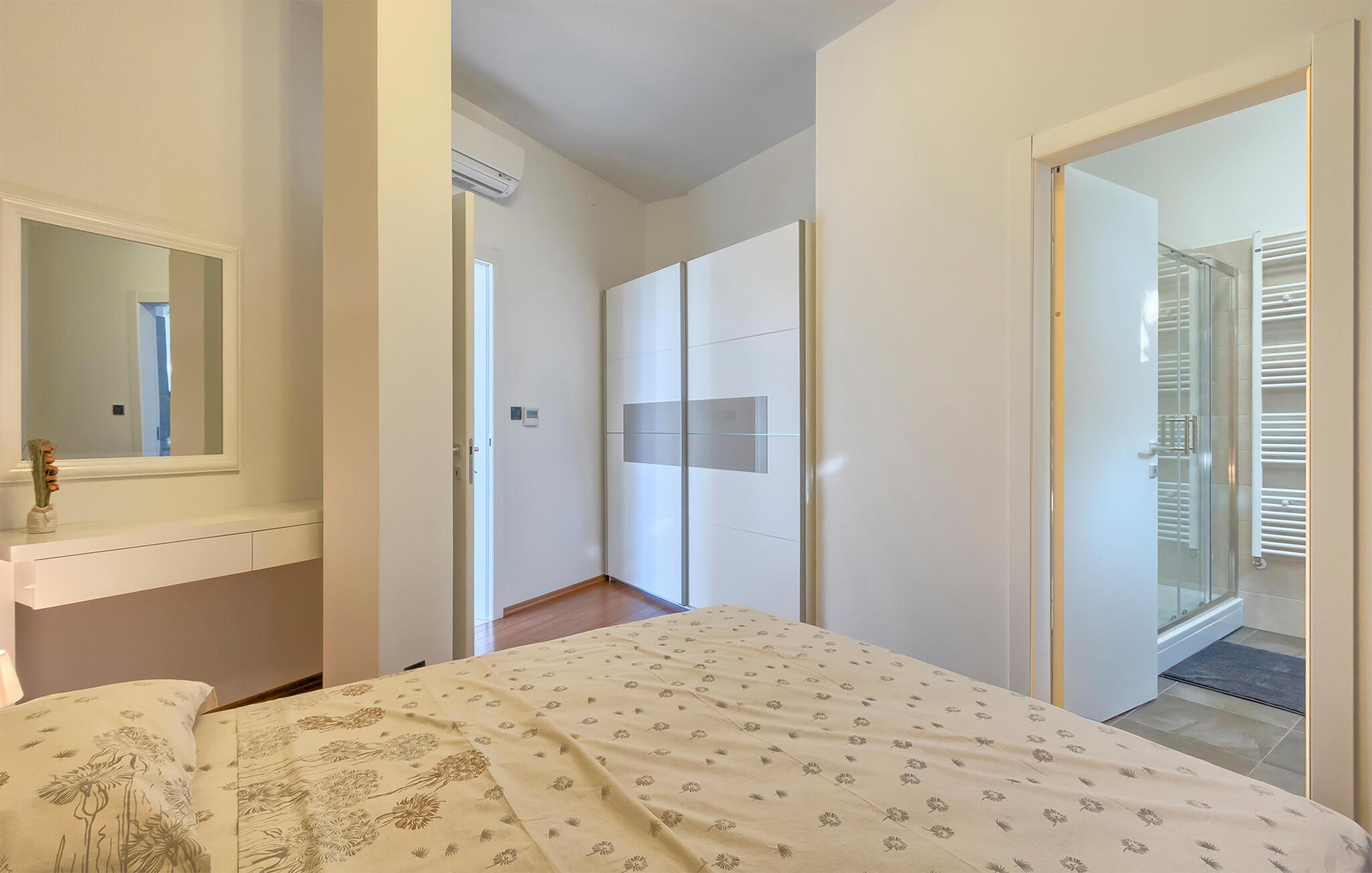 Denne stilfulle leiligheten i Stinjan i nærheten av Pula tilbyr deg og din familie eller venner elegant innkvartering med et snev av klassisk sjarm. Start dagen med frokost ved det store spisebordet som er omgitt av gulv-til-tak-vinduer. Nyt det naturlige lyset som flommer inn i rommene og utsikten over hageområdet med det vakre fellesbassenget. I stuen er det komfortable sitteplasser som innbyr til avslappende stunder. Len deg tilbake, sett deg godt til rette i den koselige sofaen og spill morsomme brettspill eller les en god bok. Det moderne kjøkkenet inspirerer til kreative matlagingskvelder. Lag dine favorittretter og nyt dem i godt selskap.