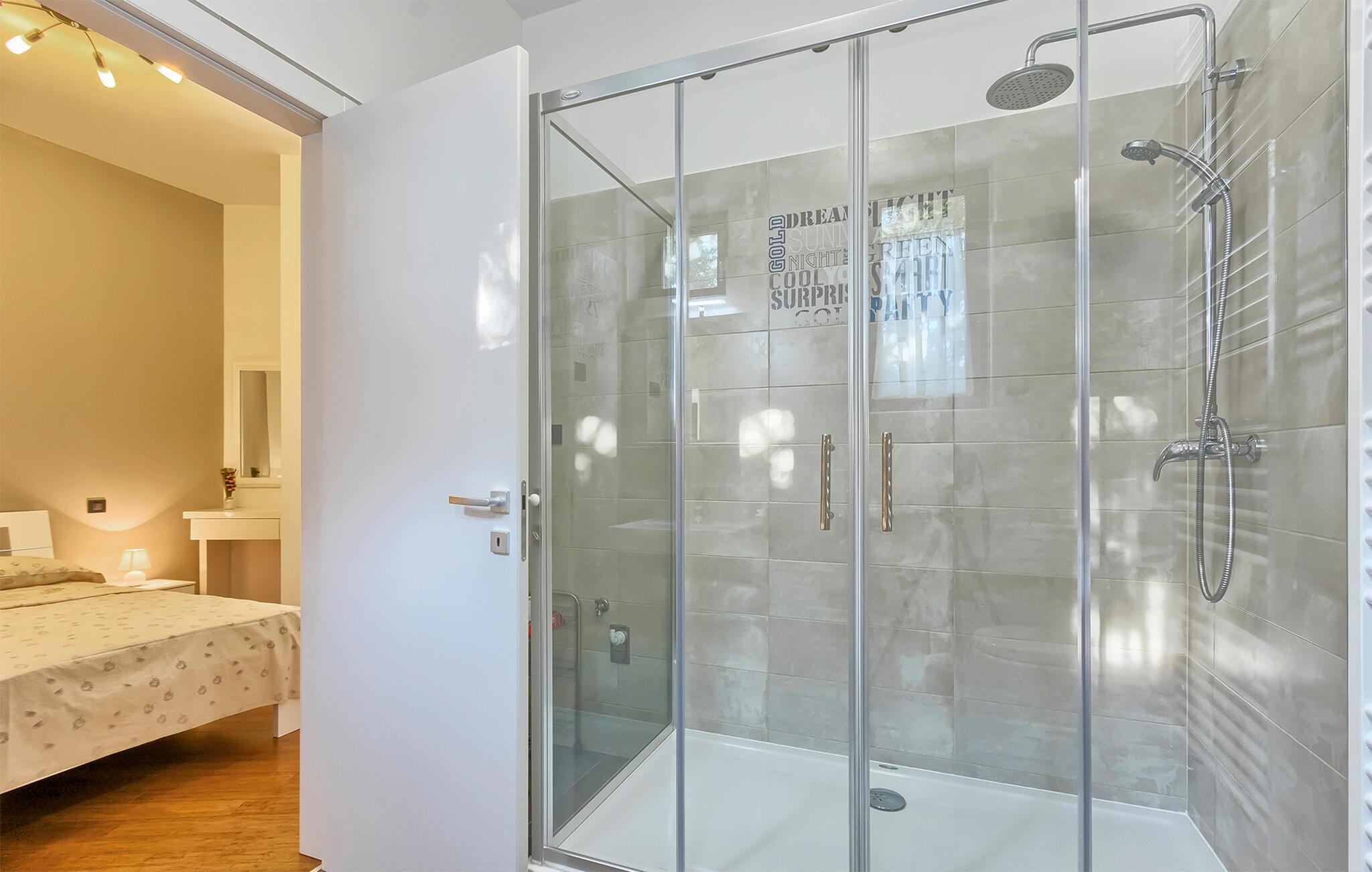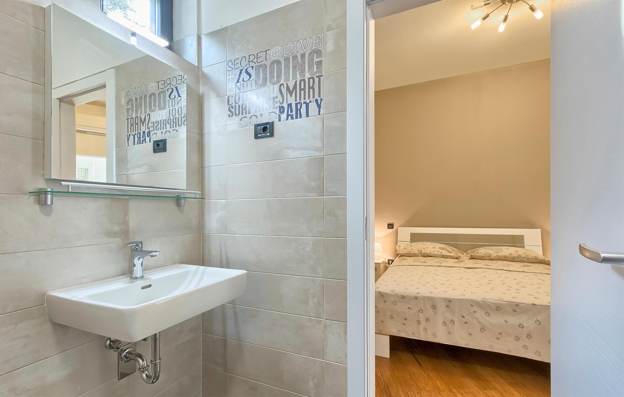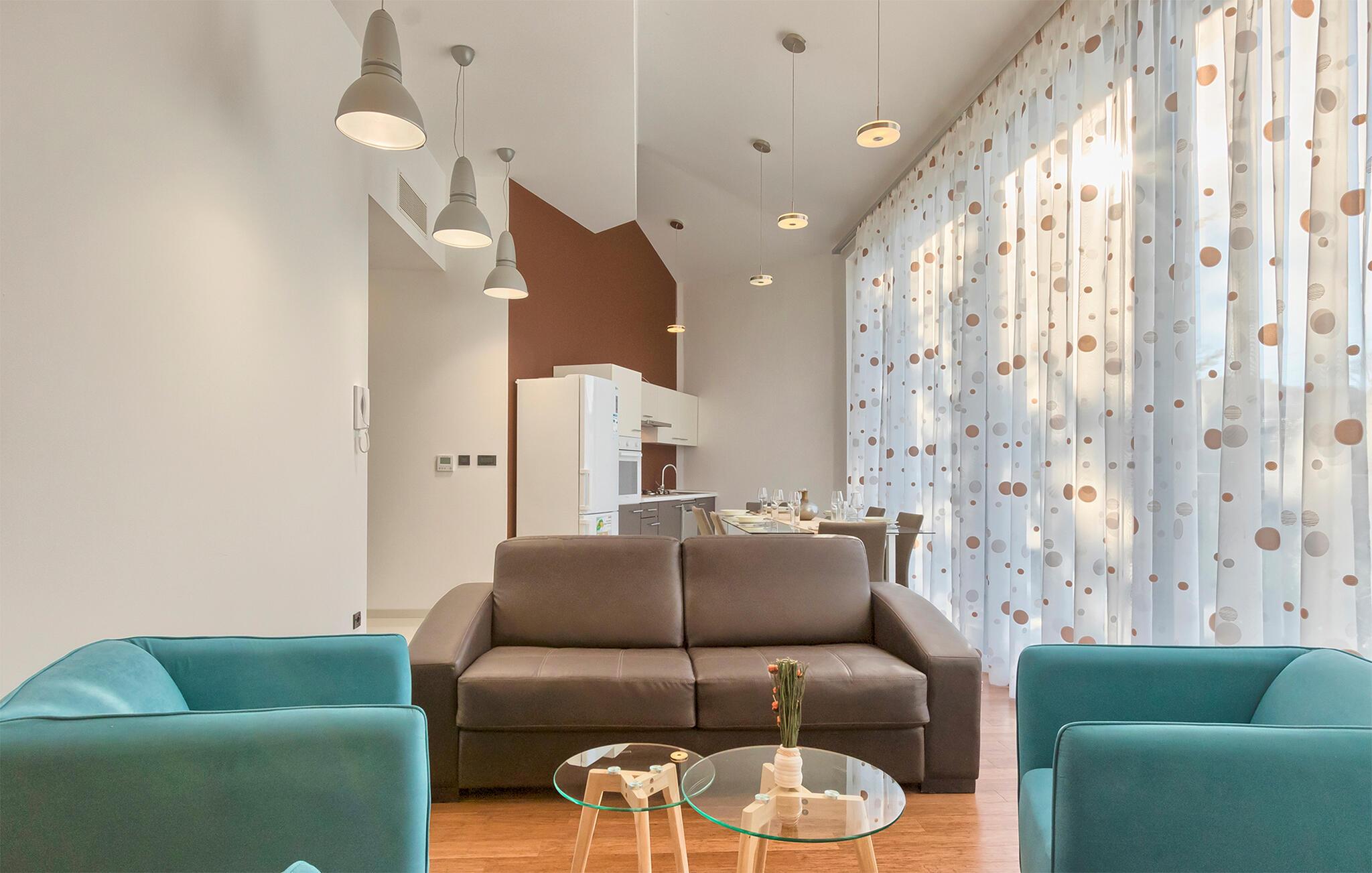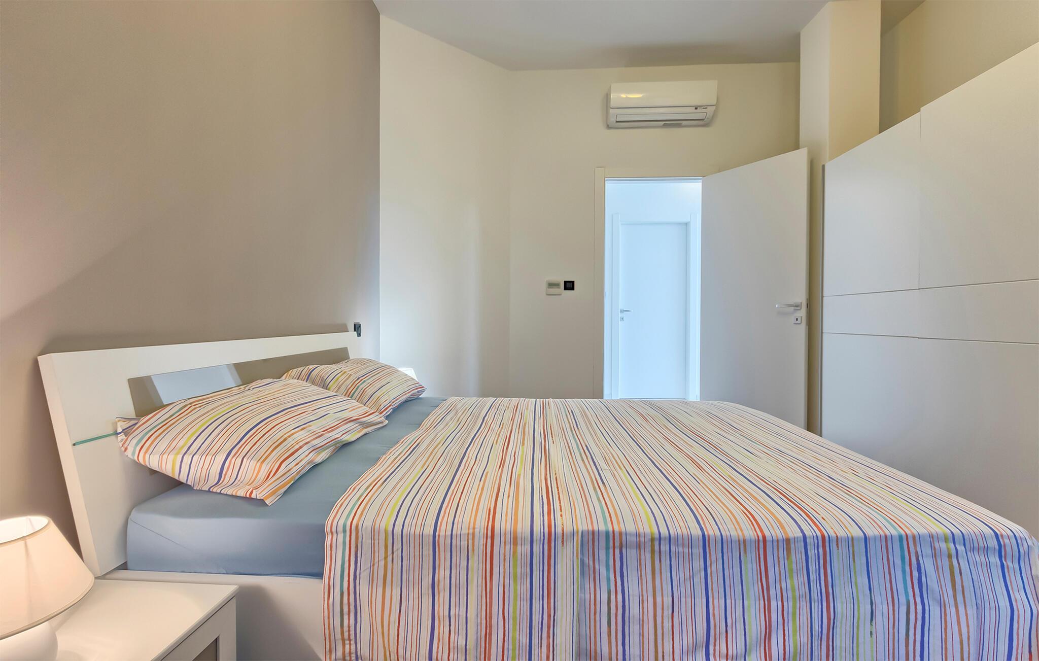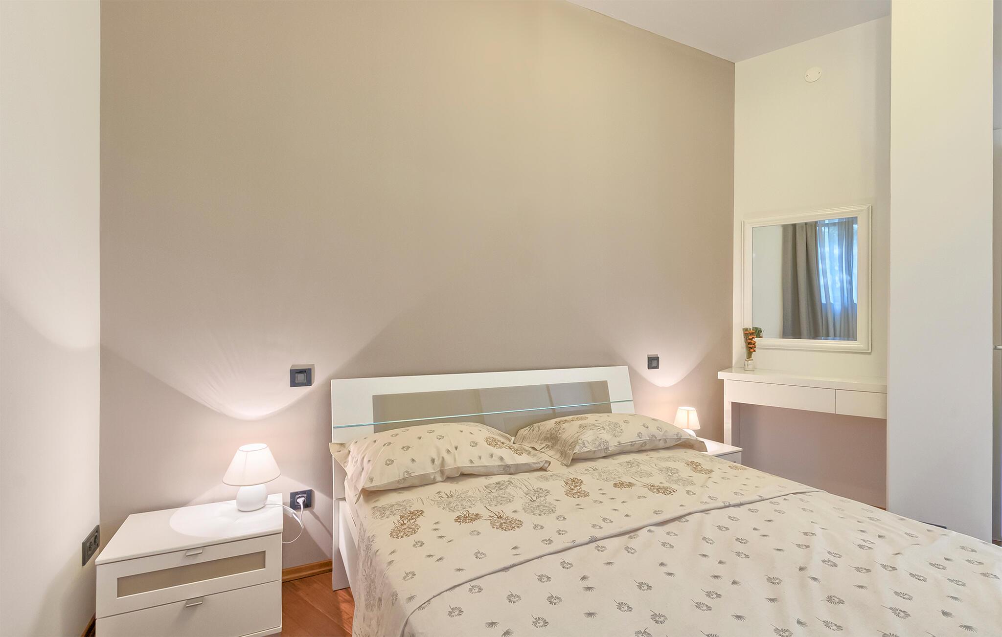 Denne stilfulle leiligheten i Stinjan i nærheten av Pula tilbyr deg og din familie eller venner elegant innkvartering med et snev av klassisk sjarm. Start dagen med frokost ved det store spisebordet som er omgitt av gulv-til-tak-vinduer. Nyt det naturlige lyset som flommer inn i rommene og utsikten over hageområdet med det vakre fellesbassenget. I stuen er det komfortable sitteplasser som innbyr til avslappende stunder. Len deg tilbake, sett deg godt til rette i den koselige sofaen og spill morsomme brettspill eller les en god bok. Det moderne kjøkkenet inspirerer til kreative matlagingskvelder. Lag dine favorittretter og nyt dem i godt selskap.