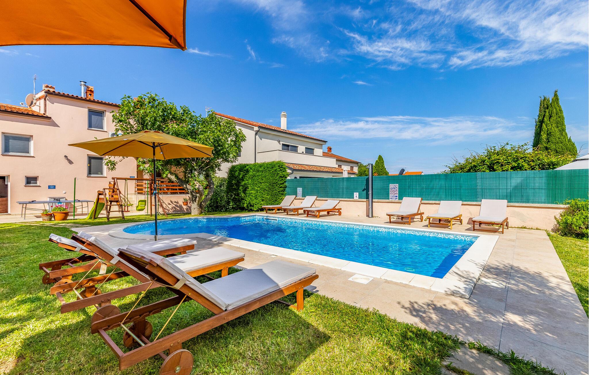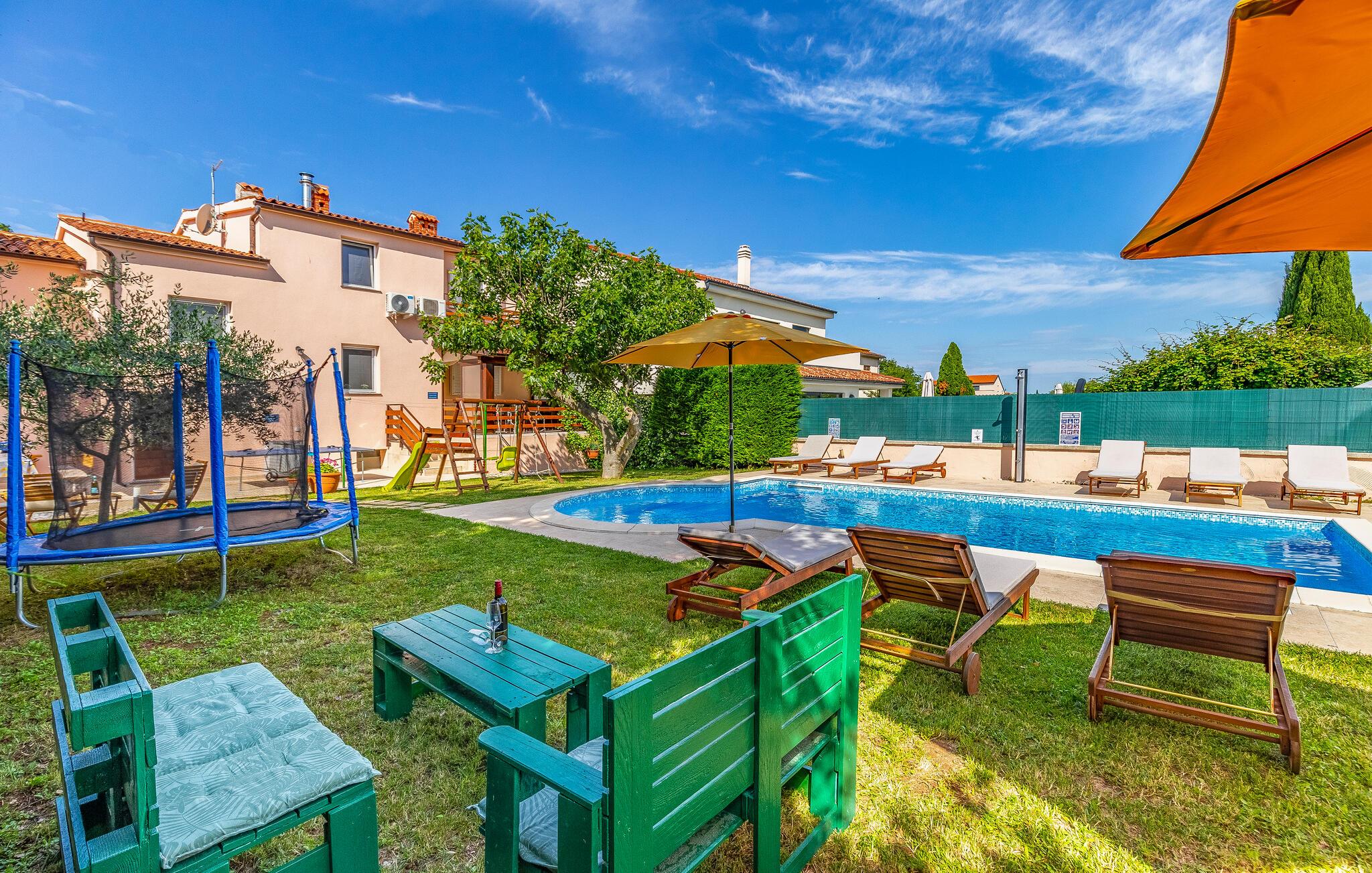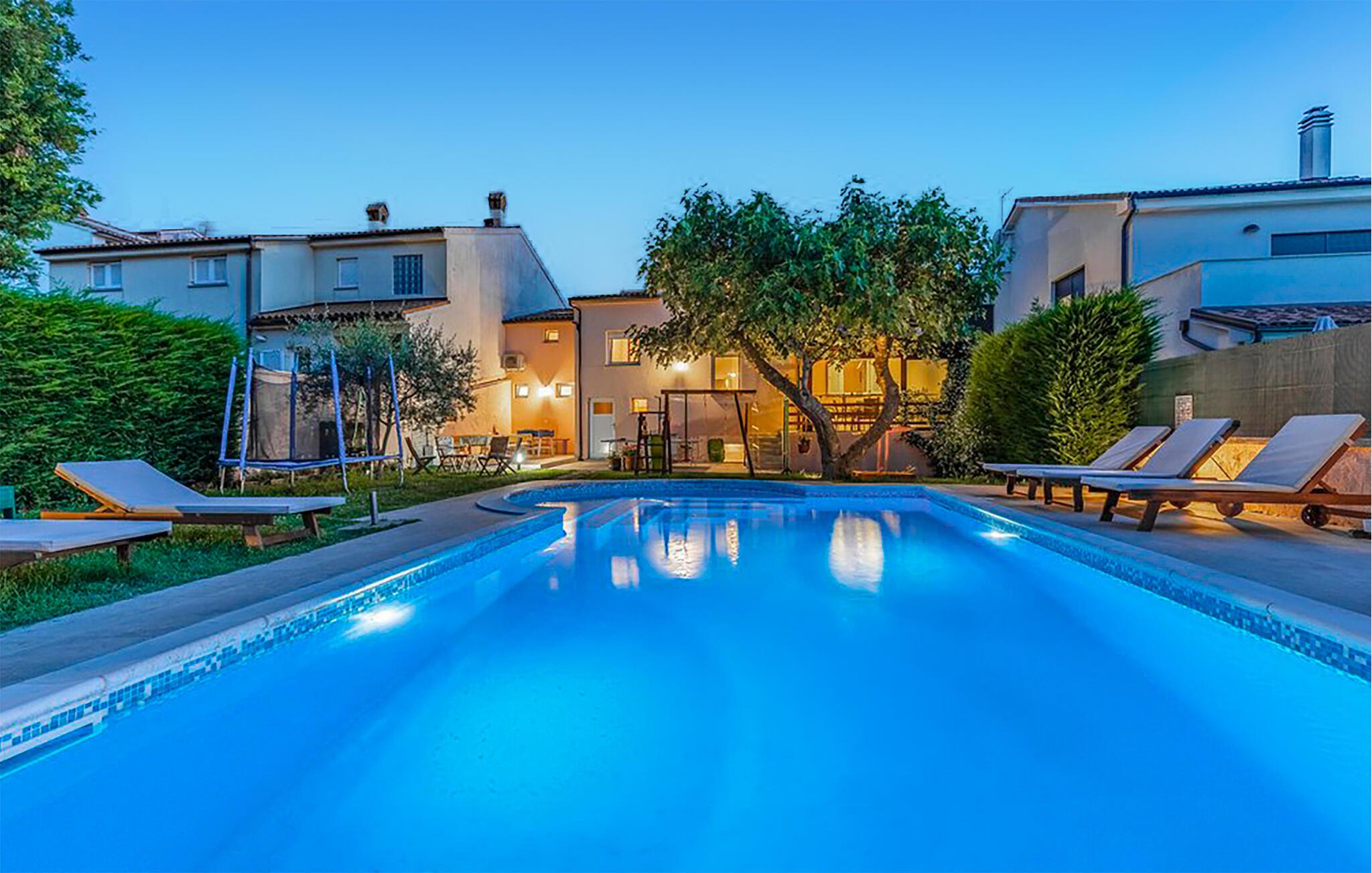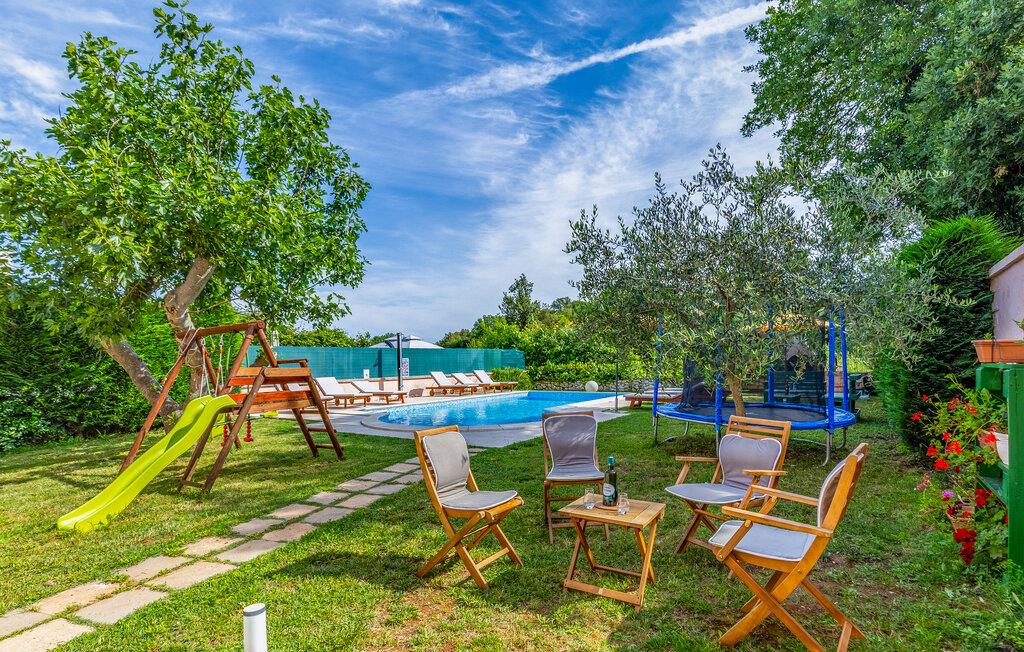 Denne vakre tomannsboligen ligger i den lille landsbyen Vinkuran, ikke langt fra den historiske byen Pula. Det består av tre fullt møblerte og utstyrte boenheter som er forbundet med innvendige trapper og et meget velutstyrt aktivitetsrom. I første etasje ligger den største leiligheten, der dere kan sove og spise sammen. Det er også utgang til den vakre terrassen med utsikt over bassenget. Her kan du tilbringe hyggelige stunder og nyte de lune sommerkveldene ved bassenget.