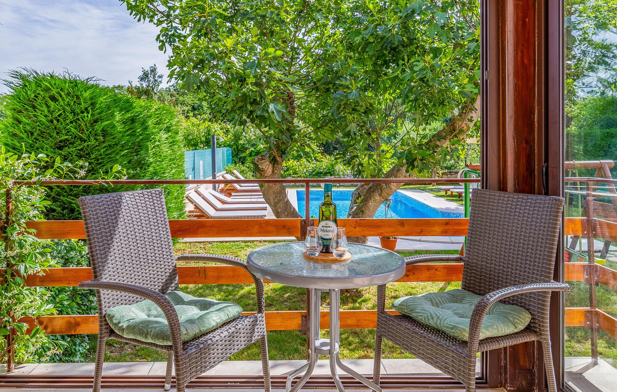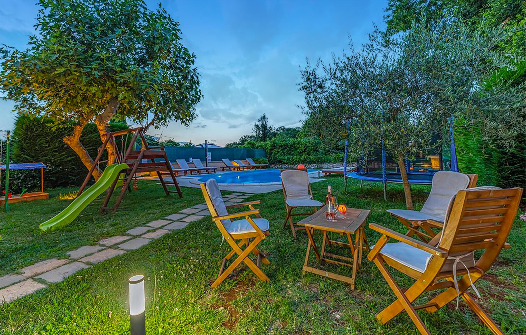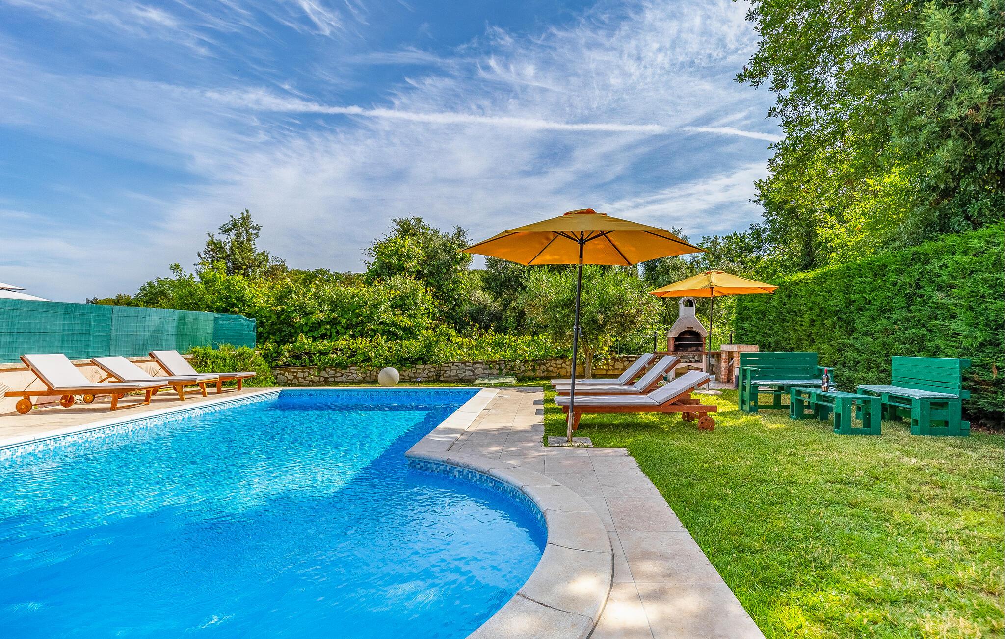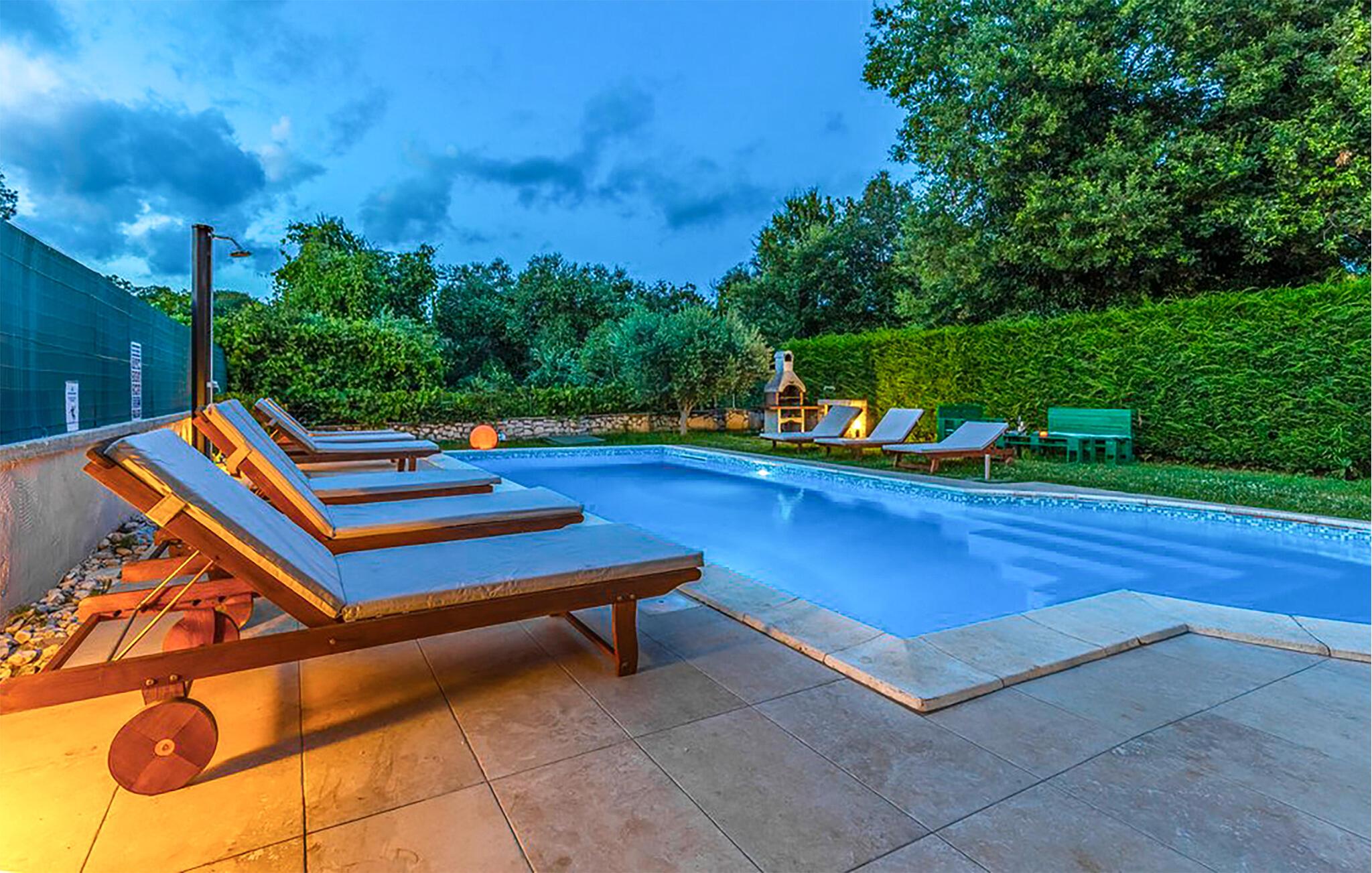 Denne vakre tomannsboligen ligger i den lille landsbyen Vinkuran, ikke langt fra den historiske byen Pula. Det består av tre fullt møblerte og utstyrte boenheter som er forbundet med innvendige trapper og et meget velutstyrt aktivitetsrom. I første etasje ligger den største leiligheten, der dere kan sove og spise sammen. Det er også utgang til den vakre terrassen med utsikt over bassenget. Her kan du tilbringe hyggelige stunder og nyte de lune sommerkveldene ved bassenget.