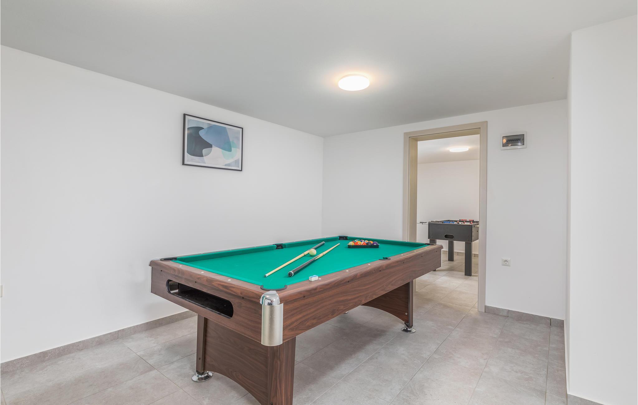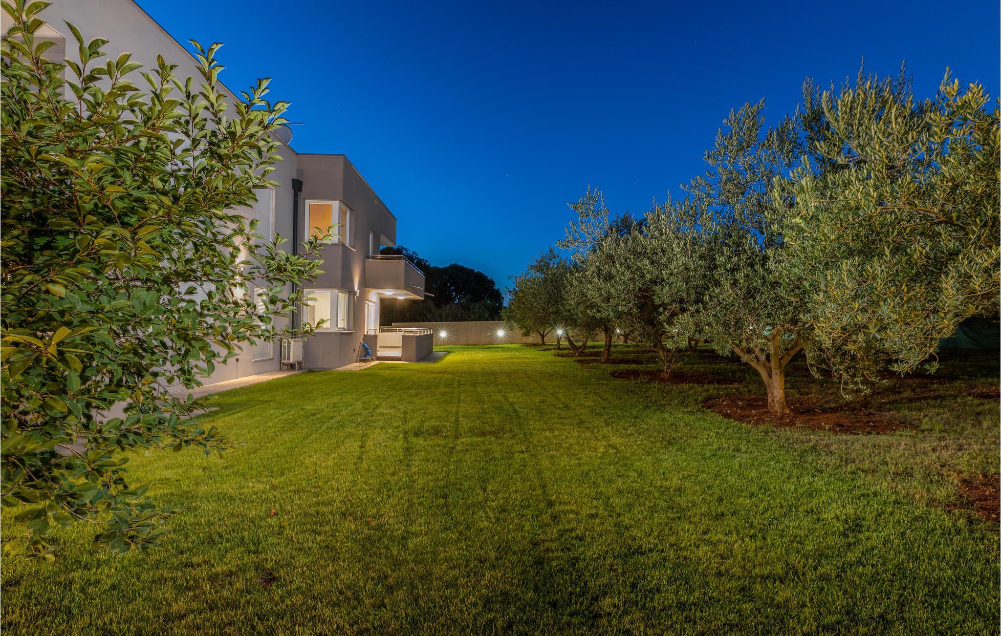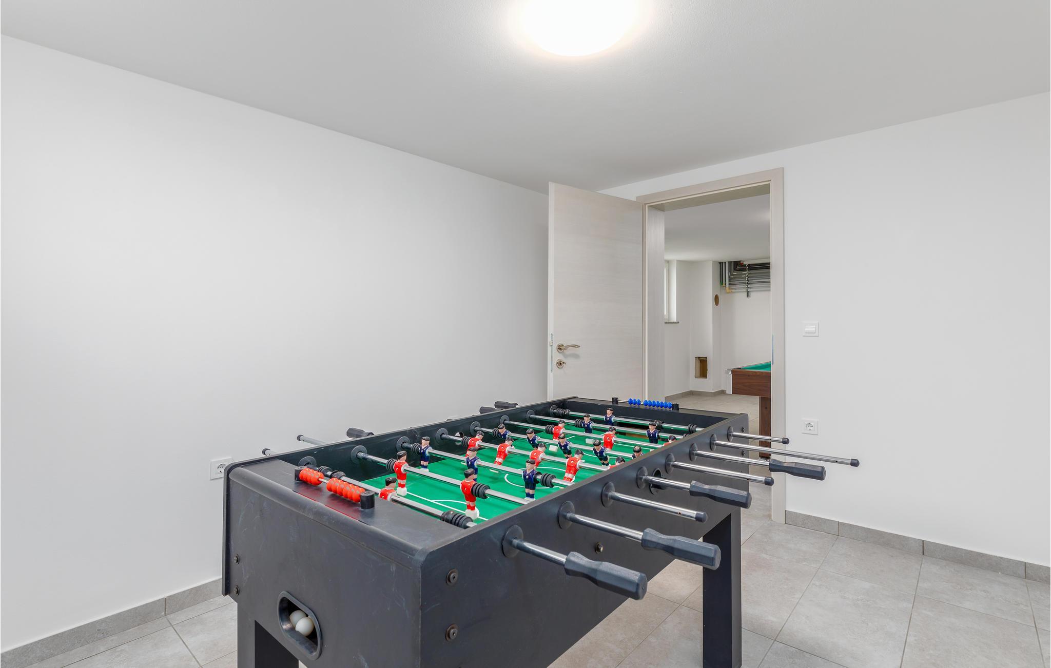 Det har en moderne design og et elegant innredet interiør. I første etasje er det en stue med utgang til terrasser, to bad, et soverom og et treningsrom, mens det i andre etasje er seks soverom, fire bad og en badstue. Fem av soverommene har terrasser, hvorav to har utsikt over bassenget og den nærliggende skogen, mens de andre terrassene har utsikt over en vakker olivenlund. Biljard, bordtennis og bordfotball er tilgjengelig. Her kan du ha det gøy, mens barna kan boltre seg på trampolinen og huskene. Under oppholdet vil du garantert ha det gøy med soling og bading i det store bassenget, og du kan nyte dine favorittretter fra grillen.