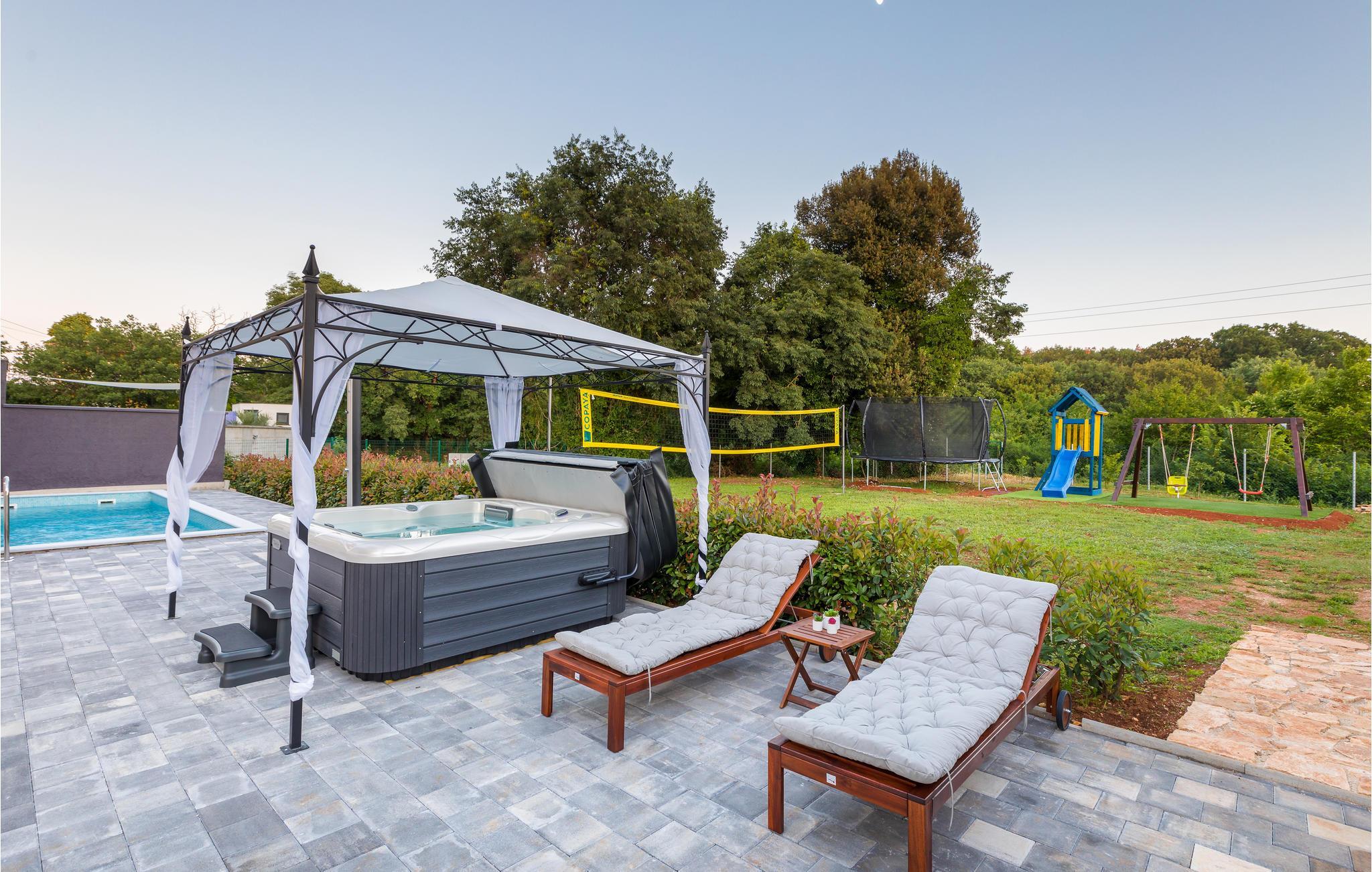 Kom med hele familien til denne vakre innkvarteringen med forskjellige oppholdsrom for å føle deg bra. Her er avslapning og letthet skrevet stort. Etter en forfriskende svømmetur i bassenget kan du slappe av på solsengene og la solen tørke huden din, mens barna dine har det gøy på lekeplassutstyret og boltre seg i hagen. Etter en begivenhetsrik dag kan du nyte de lune sommerkveldene på terrassen og la deg fortrylle av den store stjernehimmelen.