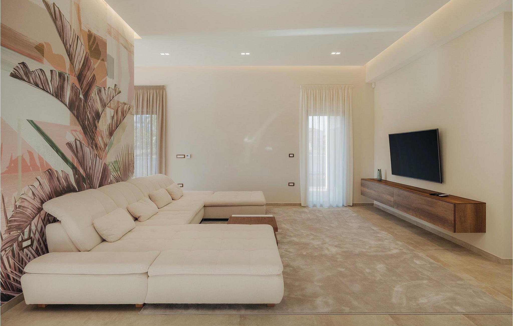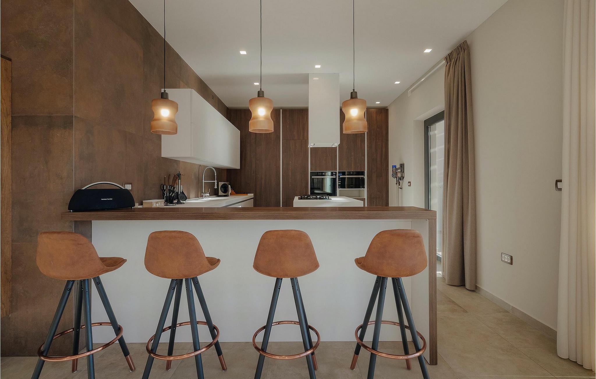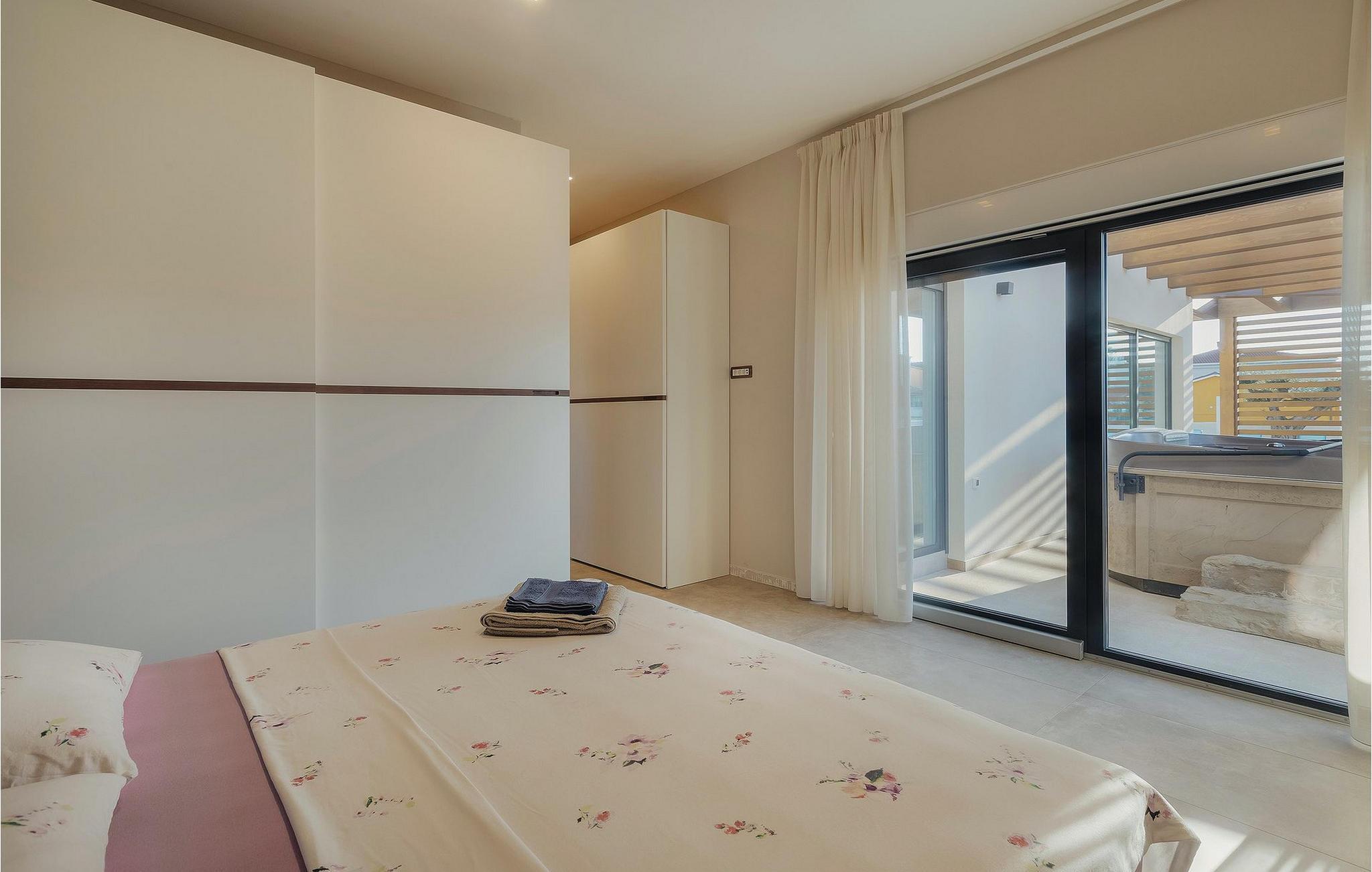 Men la oss gå videre til interiøret Stuen med spiseplass og fullt utstyrt kjøkken er stilfullt innredet til en høy standard, åpen og lys, men likevel veldig innbydende og koselig, og skaper en flytende overgang til hagen takket være de store vindusfrontene. 3 moderne soverom med dobbeltsenger og 2 elegante bad er tilgjengelig for gjestene her. Jacuzzien ligger bare noen få skritt fra ett av soverommene.
