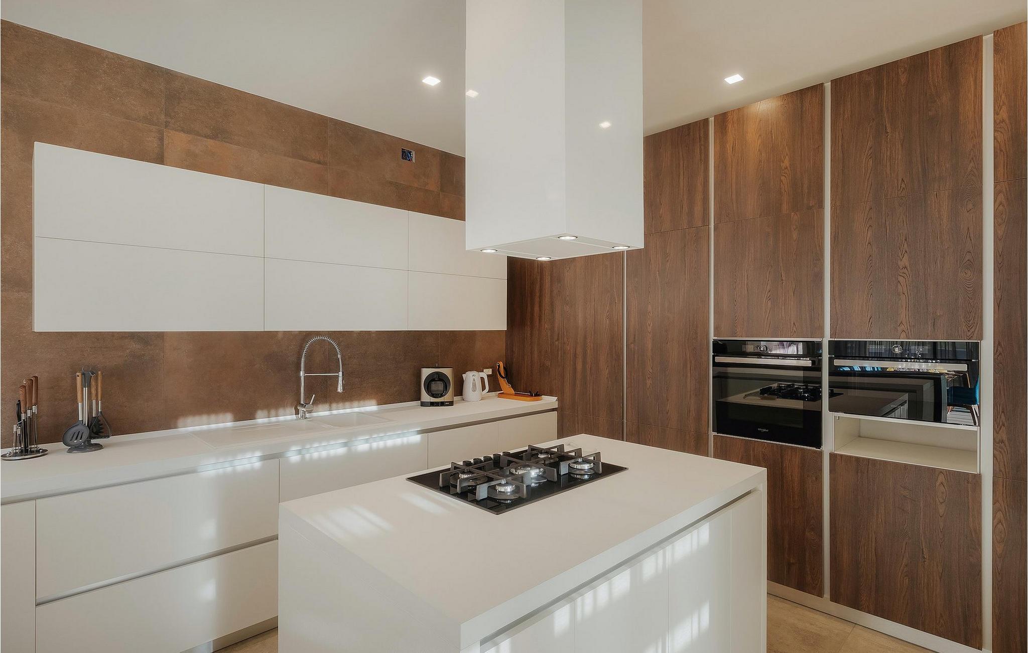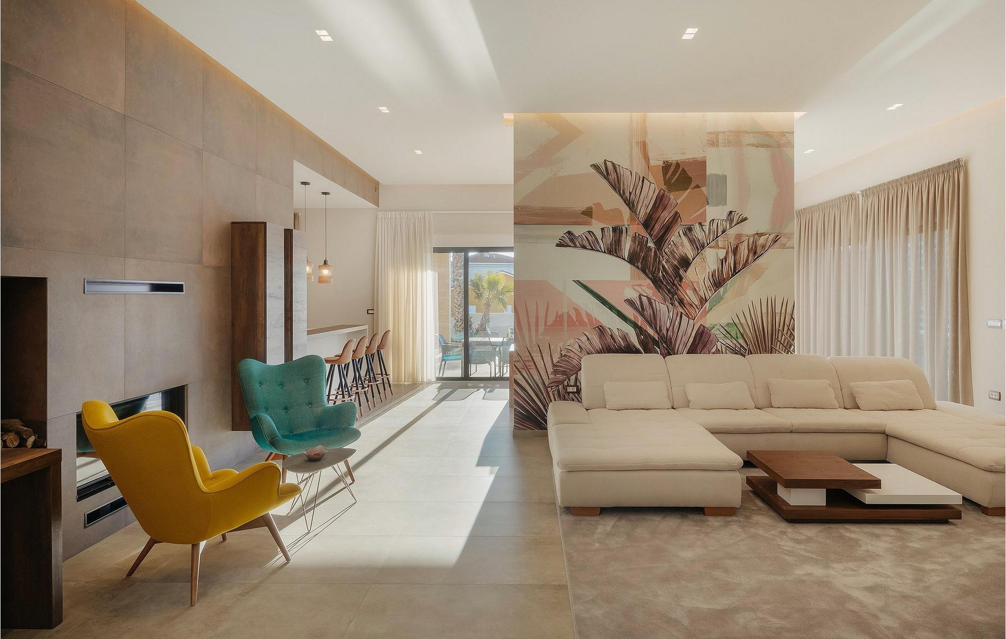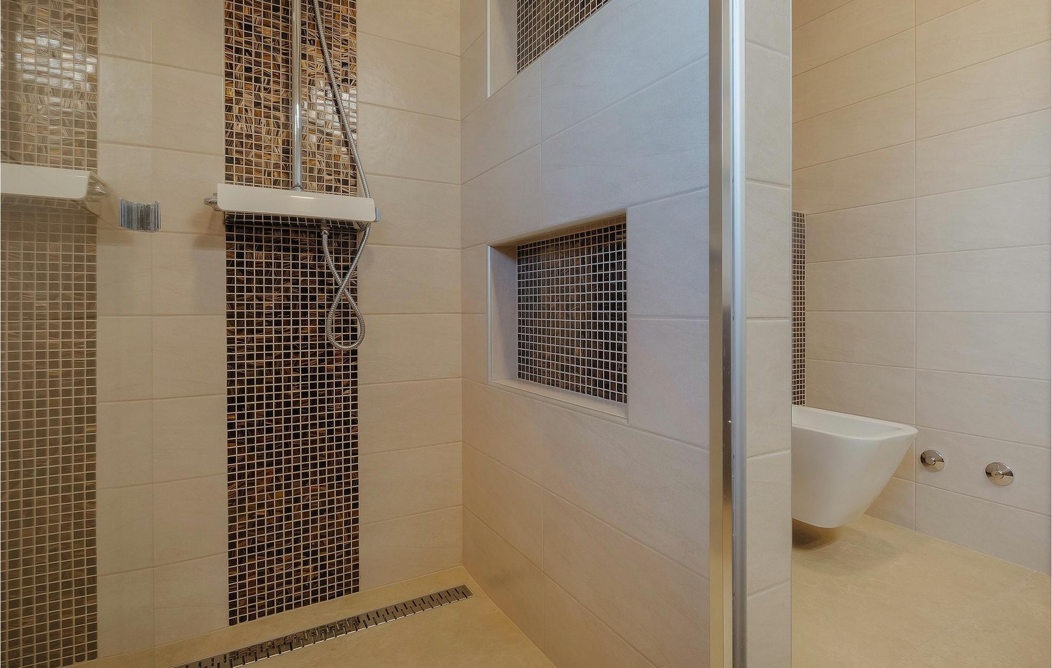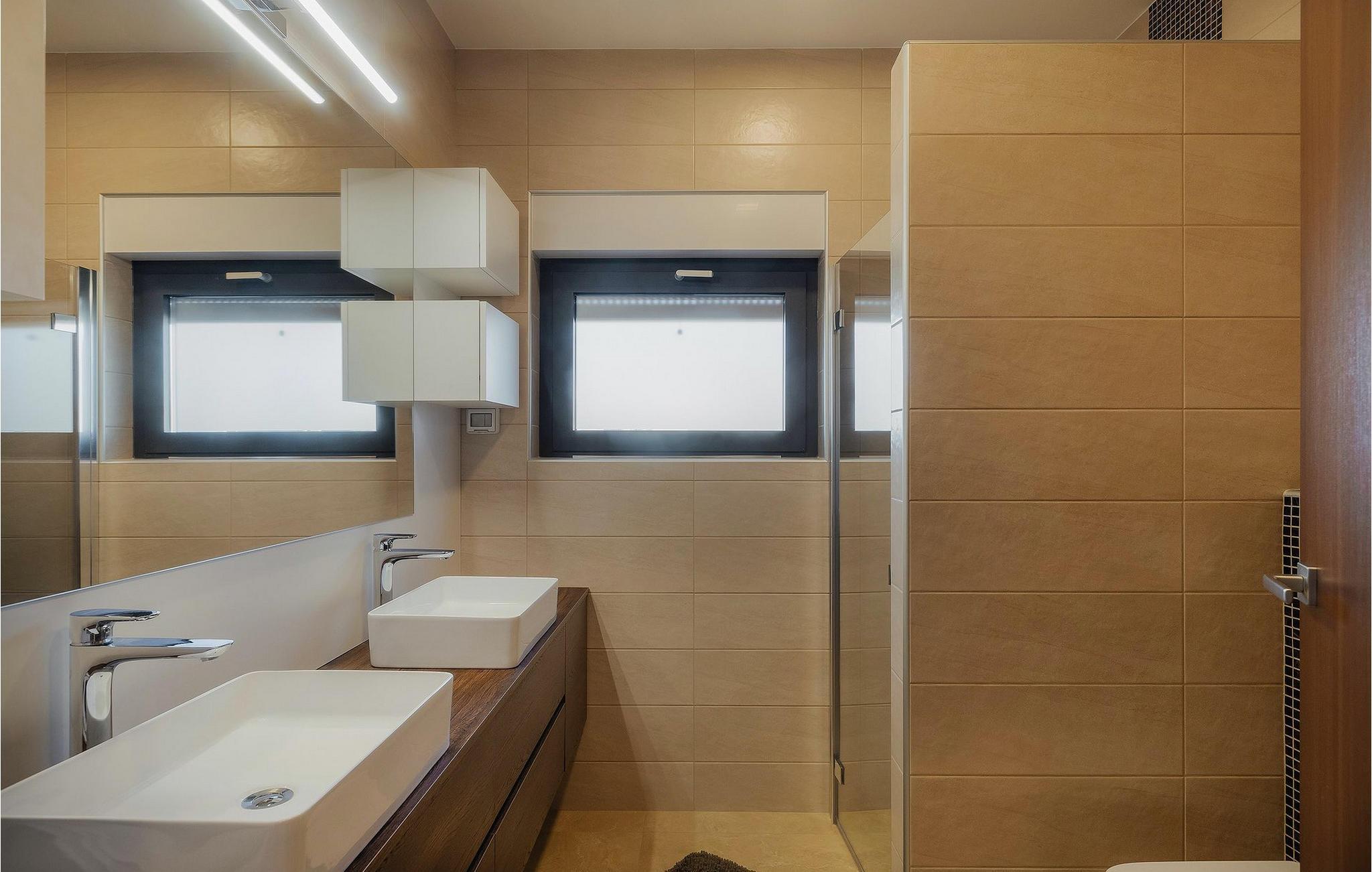 Men la oss gå videre til interiøret Stuen med spiseplass og fullt utstyrt kjøkken er stilfullt innredet til en høy standard, åpen og lys, men likevel veldig innbydende og koselig, og skaper en flytende overgang til hagen takket være de store vindusfrontene. 3 moderne soverom med dobbeltsenger og 2 elegante bad er tilgjengelig for gjestene her. Jacuzzien ligger bare noen få skritt fra ett av soverommene.