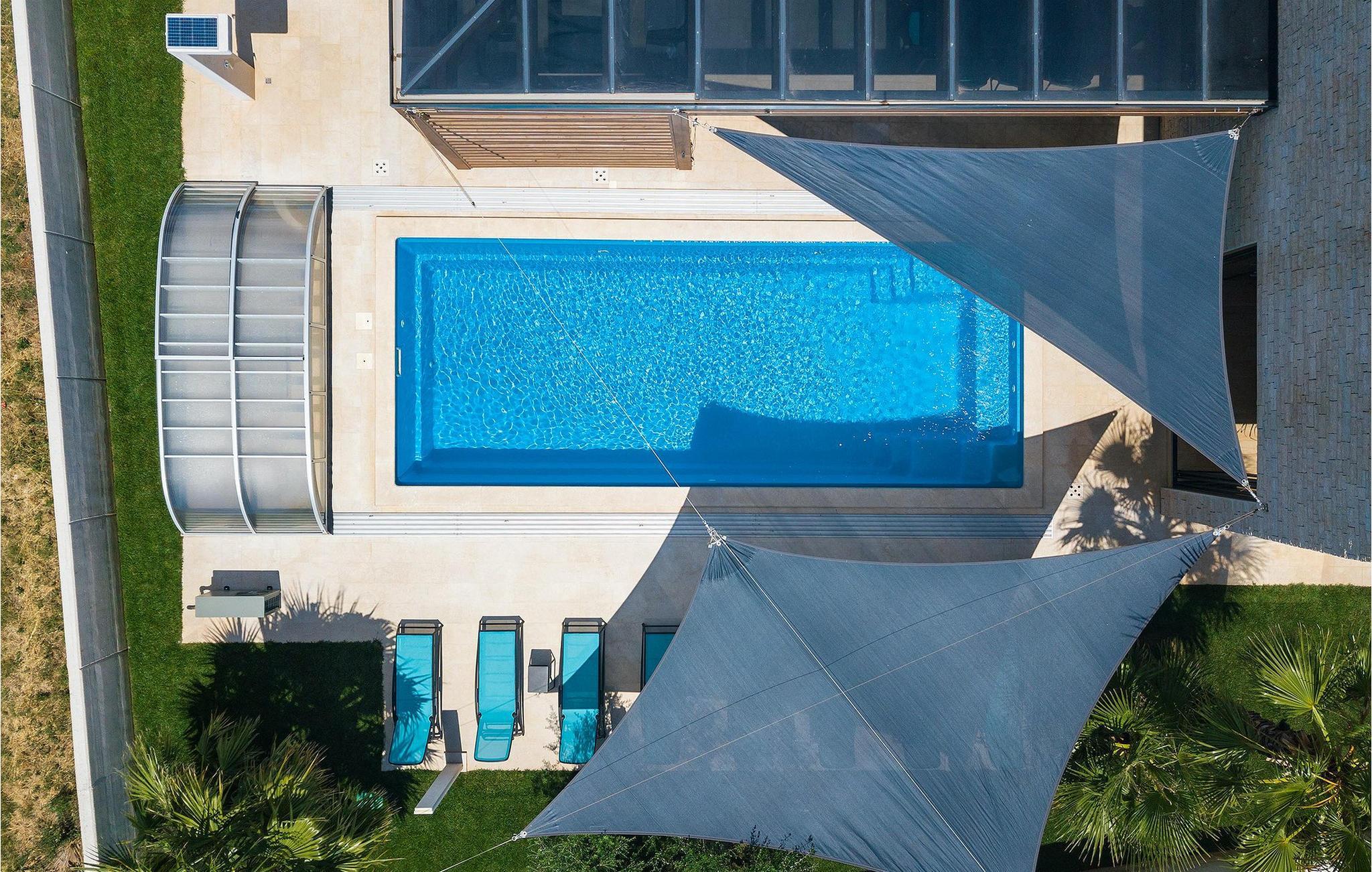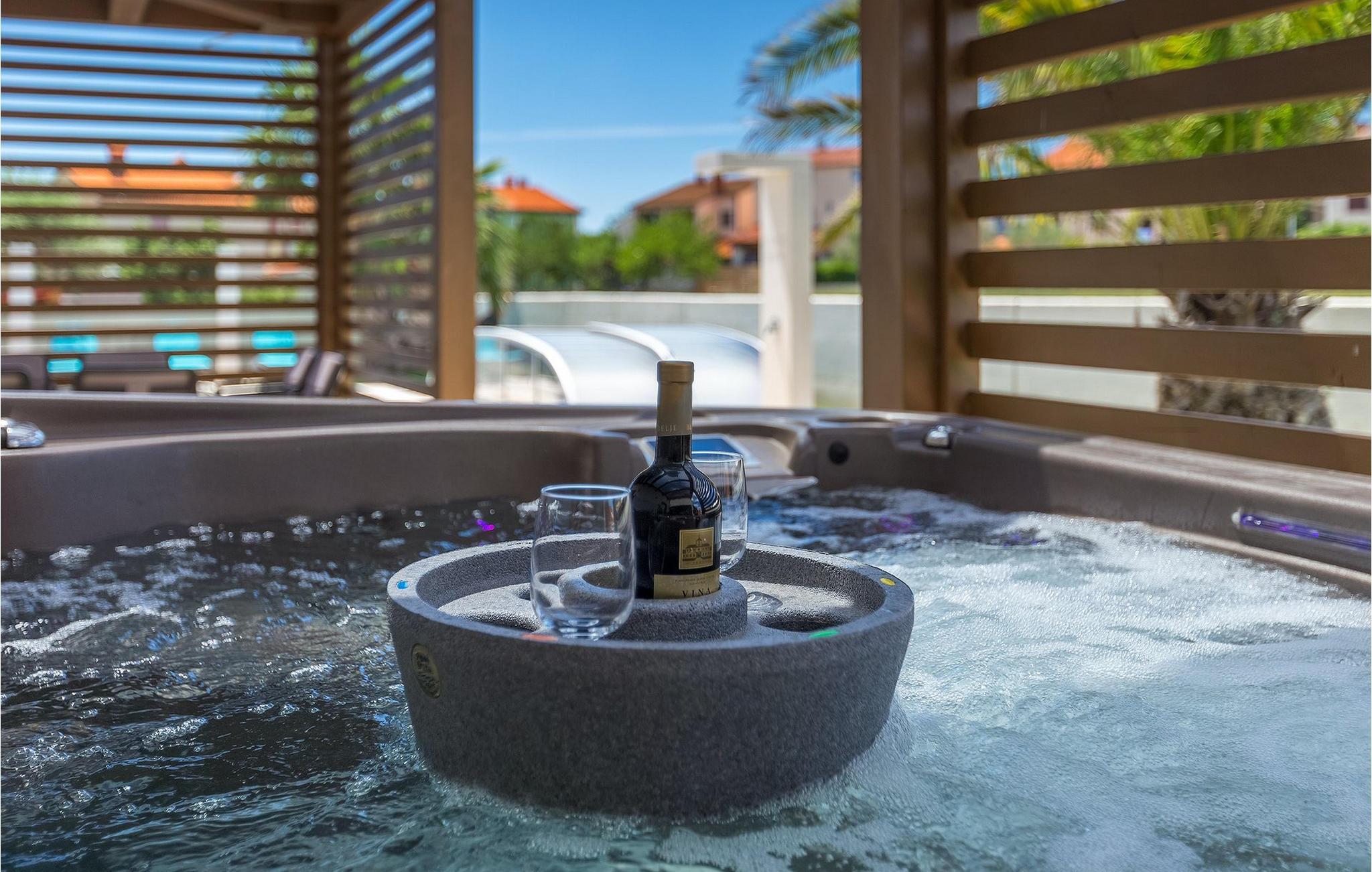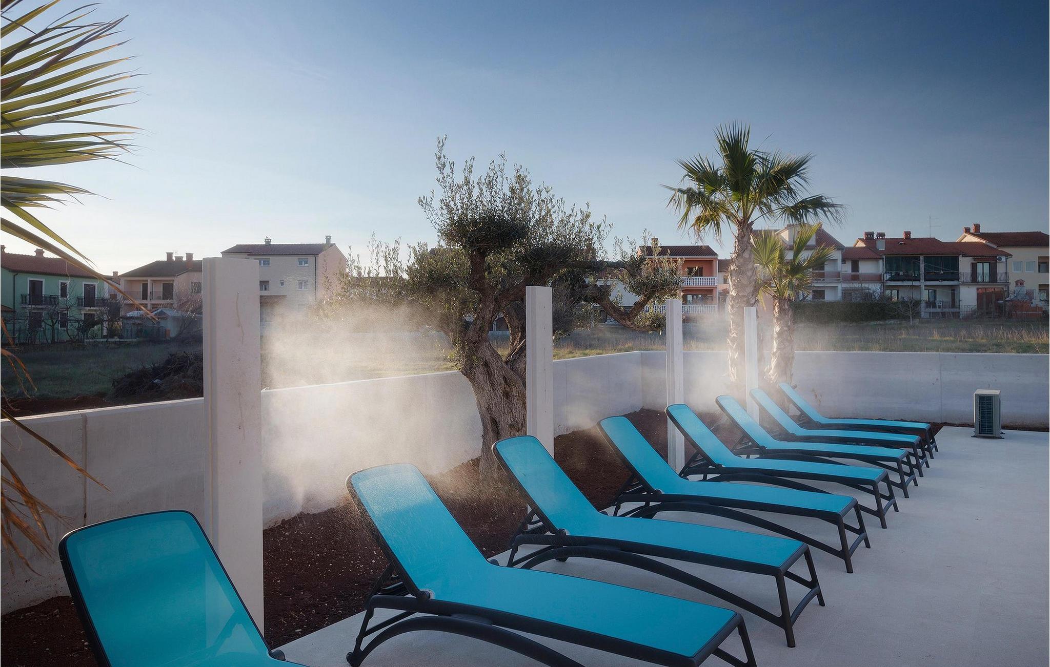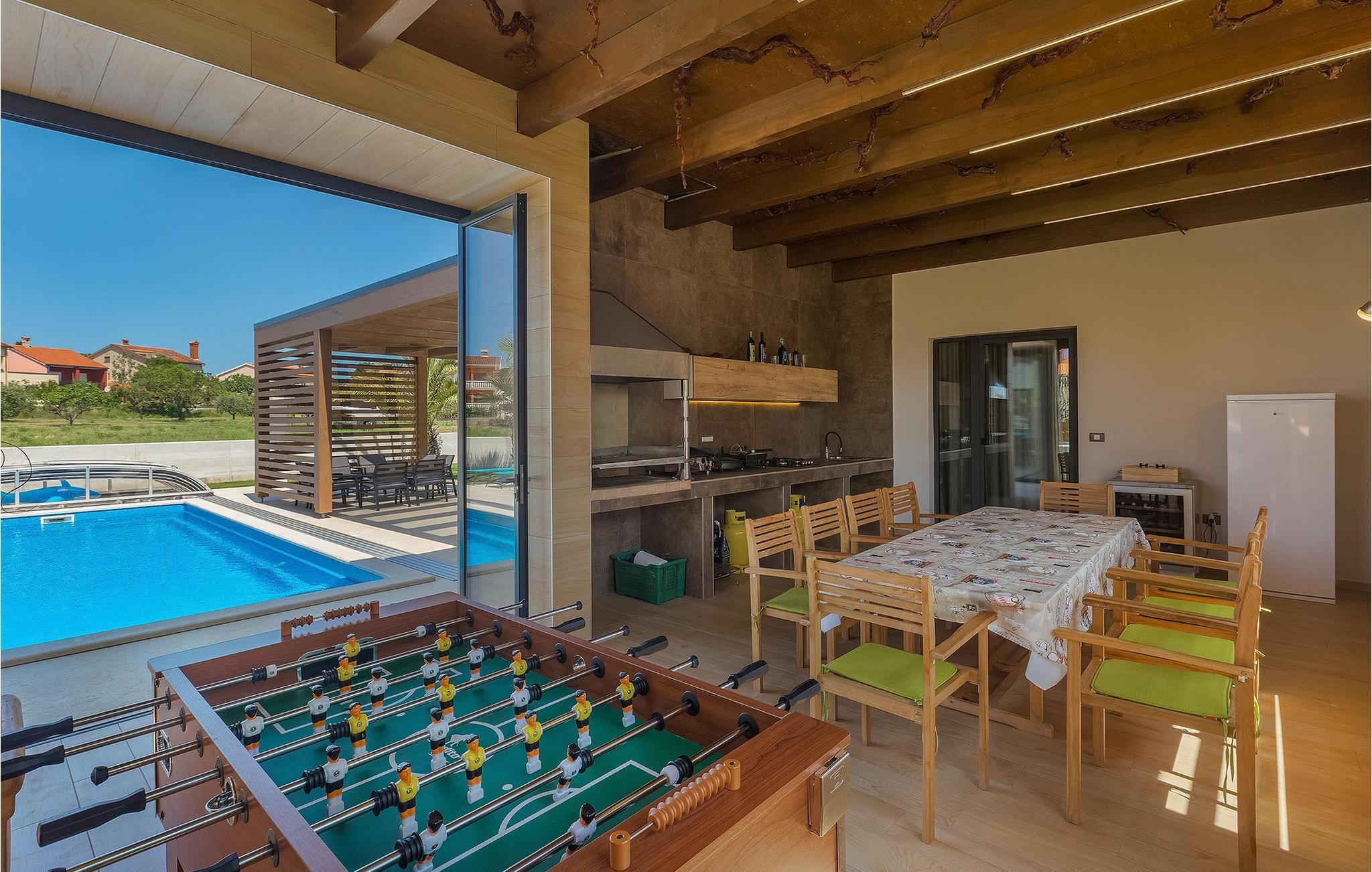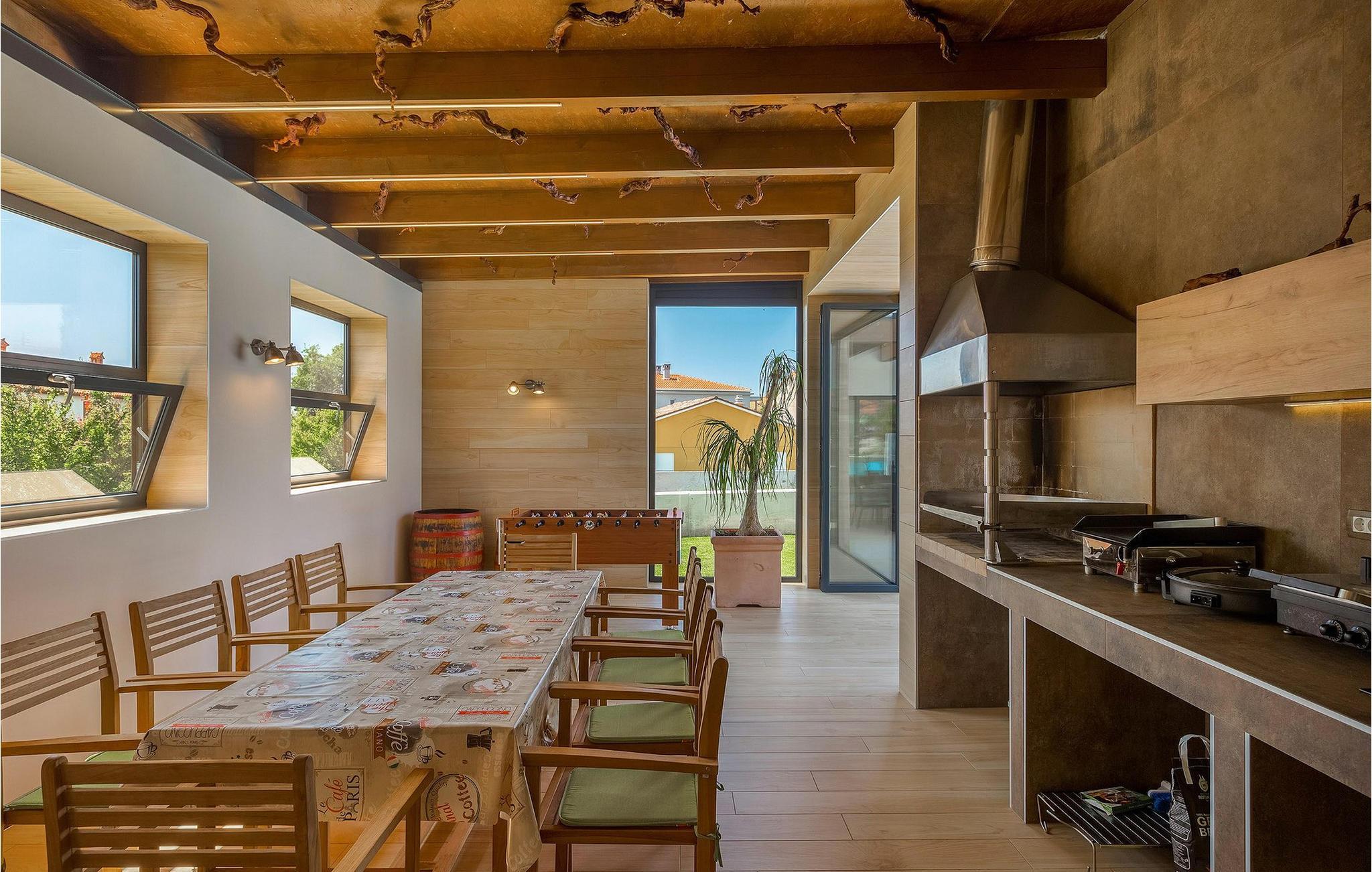 Uteområdet har et privat basseng med solsenger og vanntåkekjøling, slik at du kan slappe av og nyte selv de varmeste sommerdagene. Det er også et boblebad på den overbygde terrassen, som er beskyttet mot nysgjerrige blikk. Her er det også en koselig sittegruppe, og på sommerkjøkkenet finner du grillplassen og et spisebord, godt beskyttet mot vind og regn. Her kan du også spille bordfotball mens du venter på måltidet.