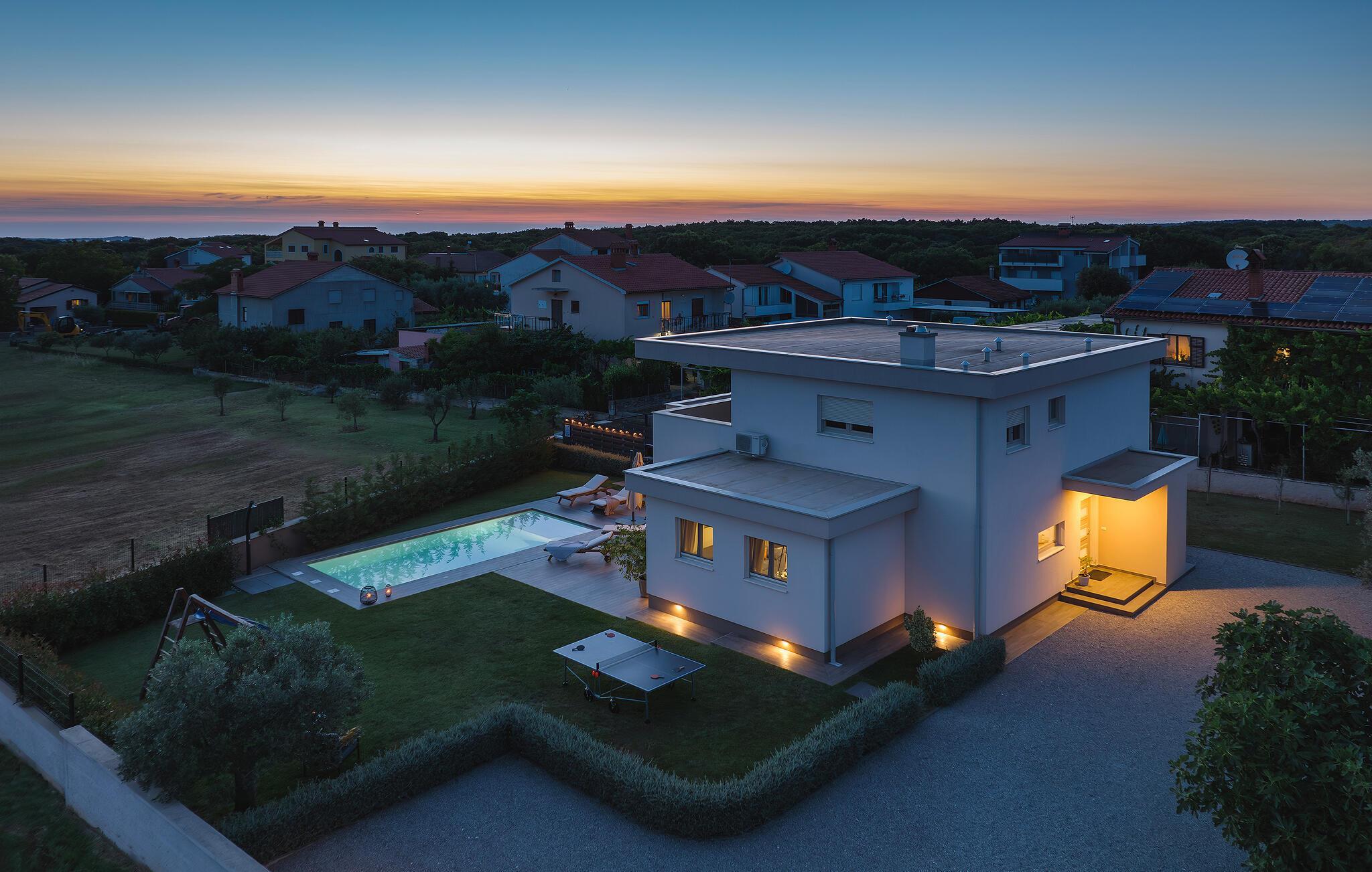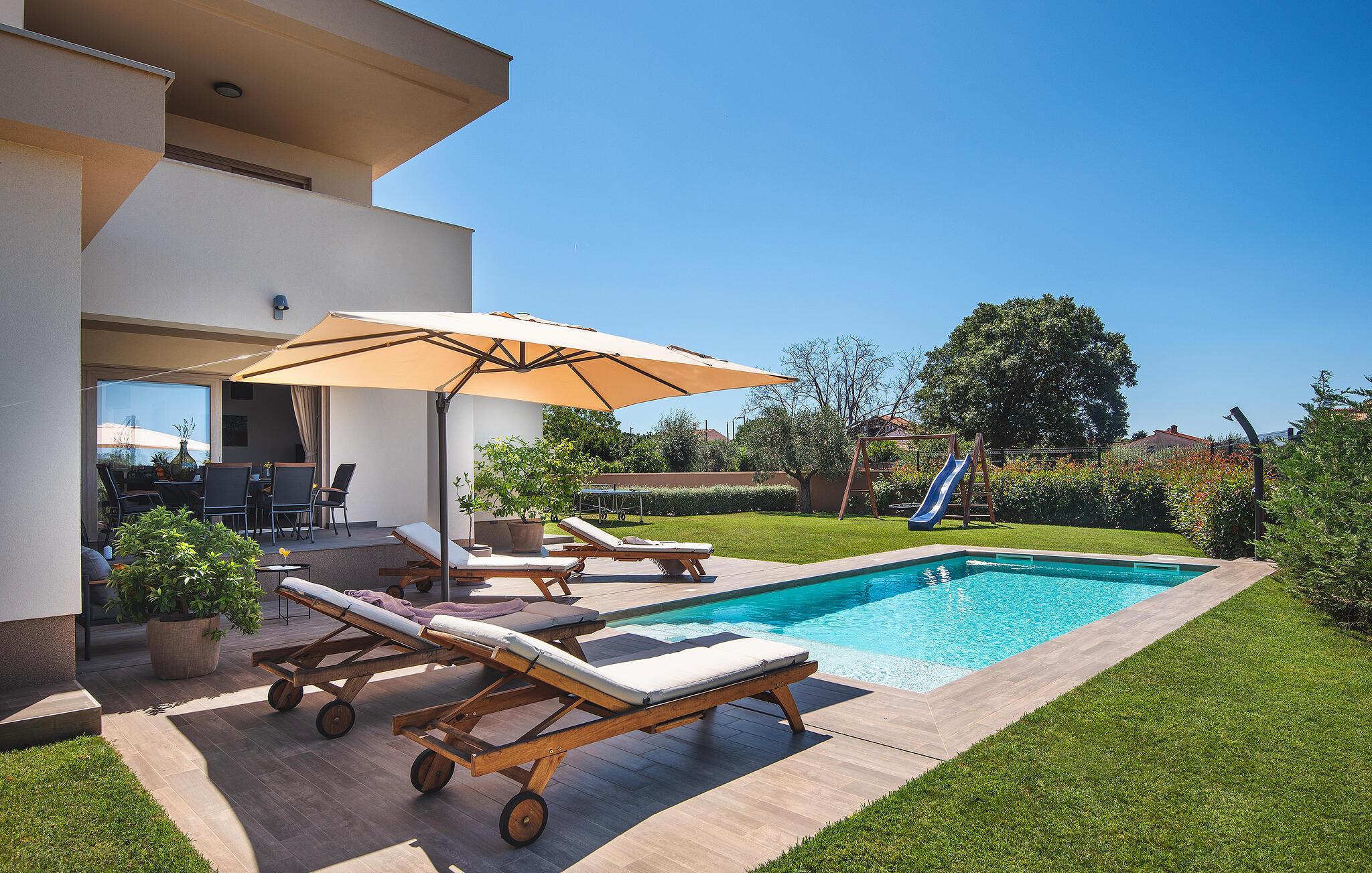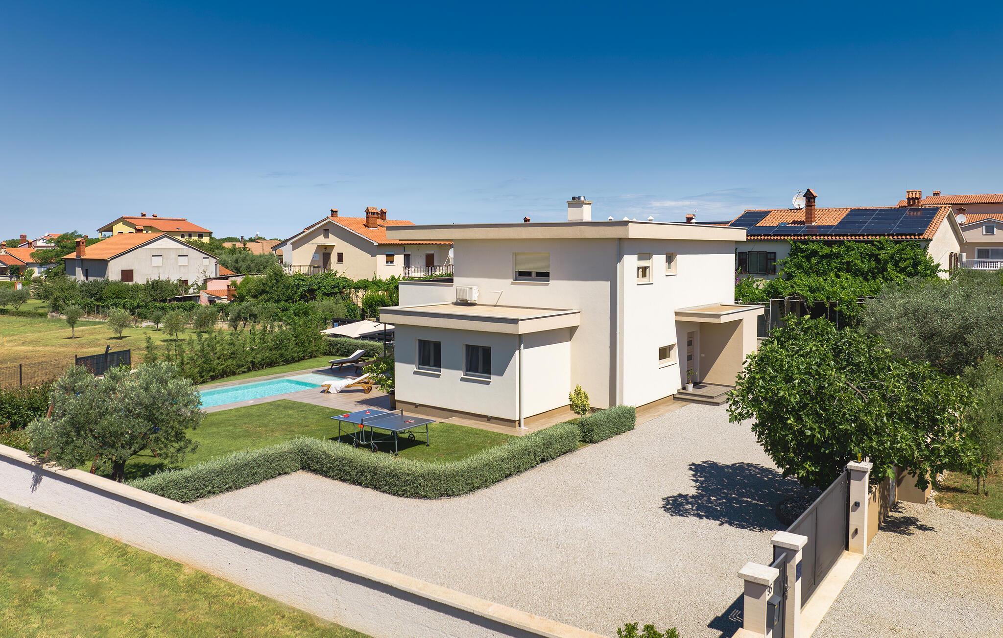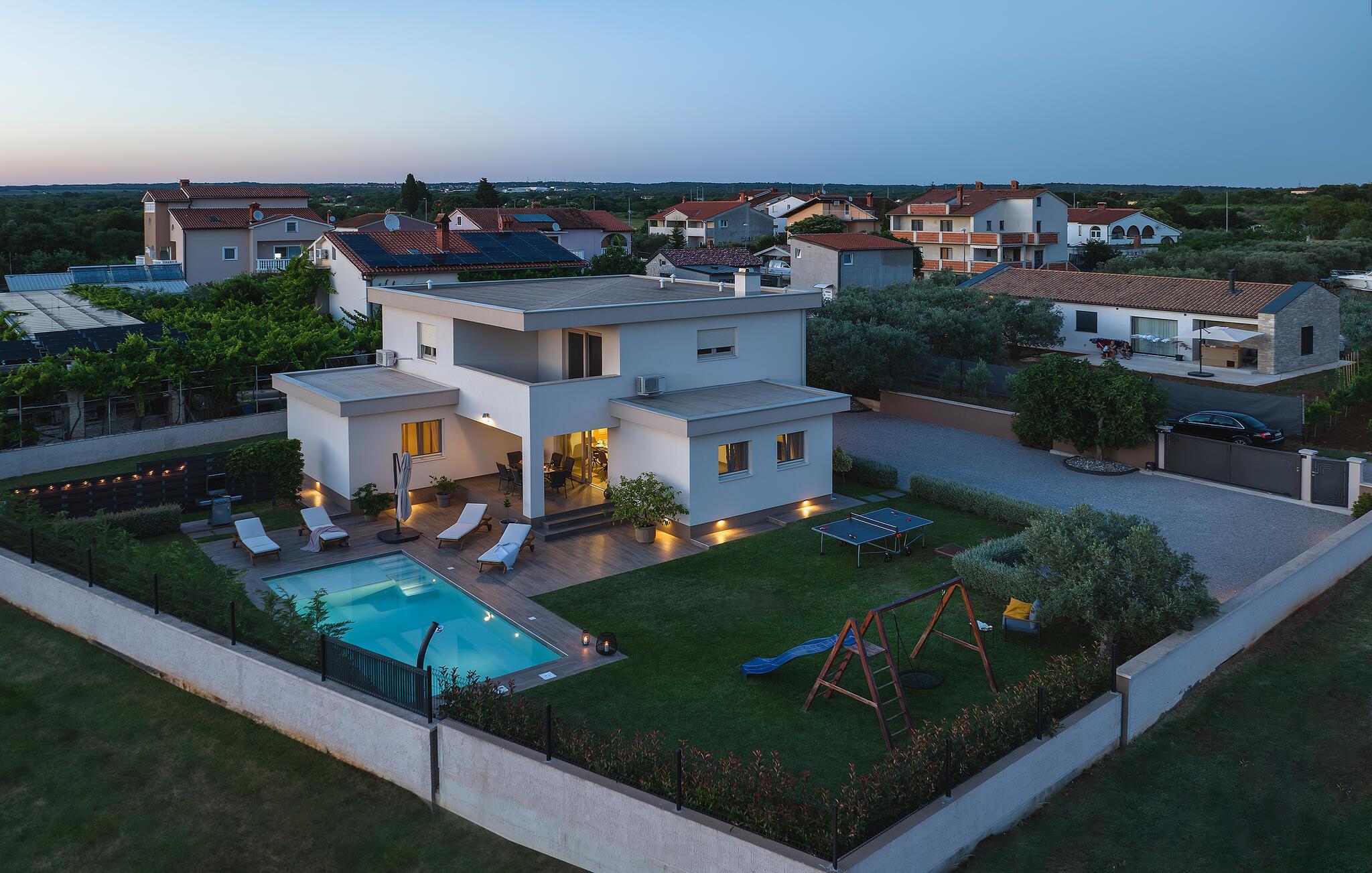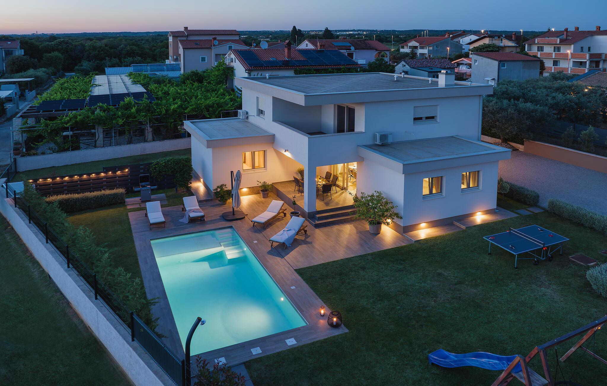 Villaen har to komfortable og moderne soverom, hvorav det ene til og med har eget bad. Begge badene i denne villaen har imidlertid gulvvarme, noe som gir deg ultimat komfort under oppholdet, uansett årstid. Men du trenger heller ikke bekymre deg for sommervarmen, for denne moderne villaen har aircondition! Den åpne planløsningen med stue, spisestue og kjøkken gjør det mulig å tilbringe tid sammen, samtidig som alle kan finne sin personlige favorittplass. Hvis du er mesterkokken i gruppen, kan du nyte det fullt utstyrte kjøkkenet og tilberede et måltid til dine kjære. Det er mange muligheter for å spise sammen, enten ved spisebordet innendørs eller utendørs. Hvis du foretrekker å lage mat i frisk luft, står gassgrillen alltid til din disposisjon. Resten av gruppen kan slappe av på solstolene eller ta en dukkert i bassenget og hoppe uti for å hjelpe til om nødvendig. De minste vil ikke vite hvilken aktivitet de skal velge først - huskene og sklien ligger rett bak bassenget på plenen. Med de mange fordelene som denne villaen tilbyr, vil alle finne en plass for seg selv, slik at dere kan nyte ferien sammen, men også hver for dere, så mye som mulig! Beliggenheten til denne villaen er rett og slett perfekt: bare 4 km fra de første strendene og nær sentrum av Pula. På den ene siden er Istria det ideelle valget for deg som ønsker å nyte uberørt natur og sjarmen i små, tradisjonelle og for det meste middelalderske byer. På den andre siden er turistbyenes kjas og mas bare en kort kjøretur unna villaen. Pula er utvilsomt Istrias sentrum når det gjelder kultur og tradisjon. Byen nådde sin storhetstid i romertiden, og har etterlatt seg mange spor, blant annet det berømte amfiteateret. Pula byr på en rekke fritidsaktiviteter som idrettsanlegg, barer, restauranter, nattklubber og organiserte turer, f.eks. til Brijuni nasjonalpark. I likhet med mange andre kystbyer er Pula også kjent for sine vakre strender og det krystallklare havet. De frodige skogene, de flotte strendene og middelhavsklimaet gjør Pula til et ideelt reisemål for badegjester.