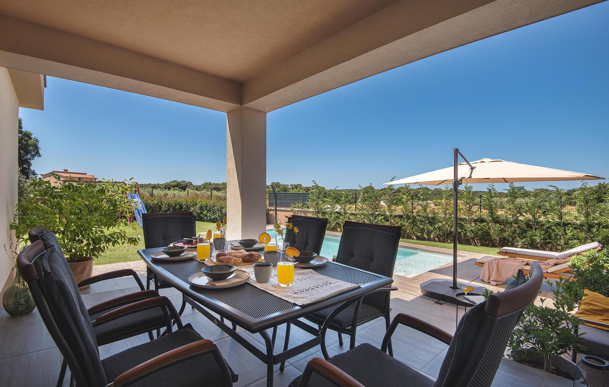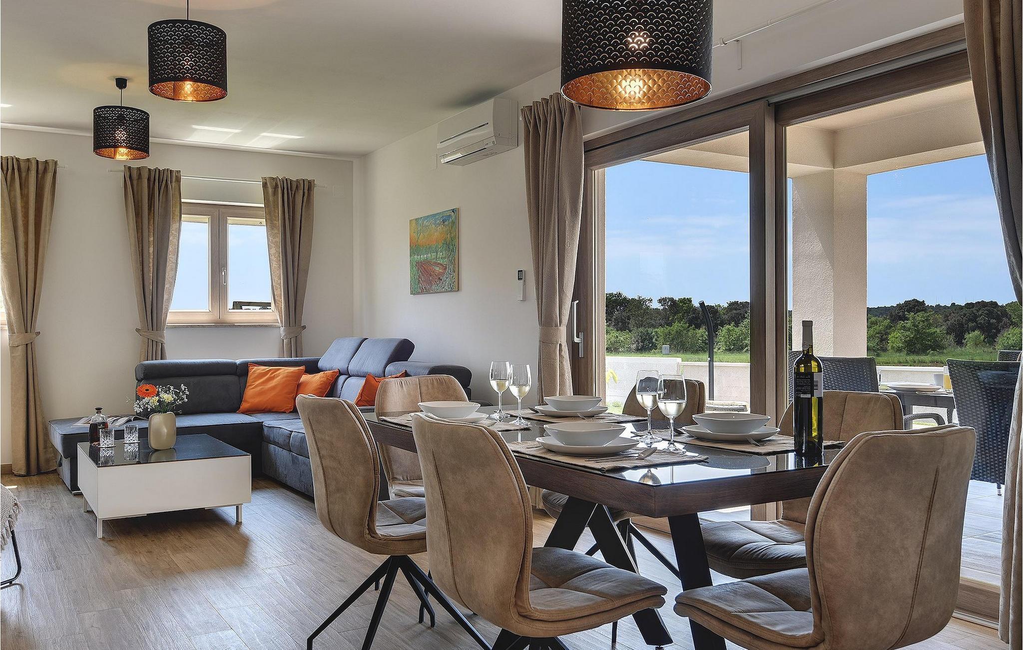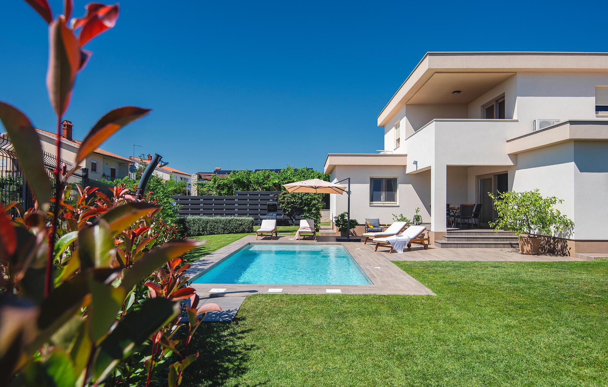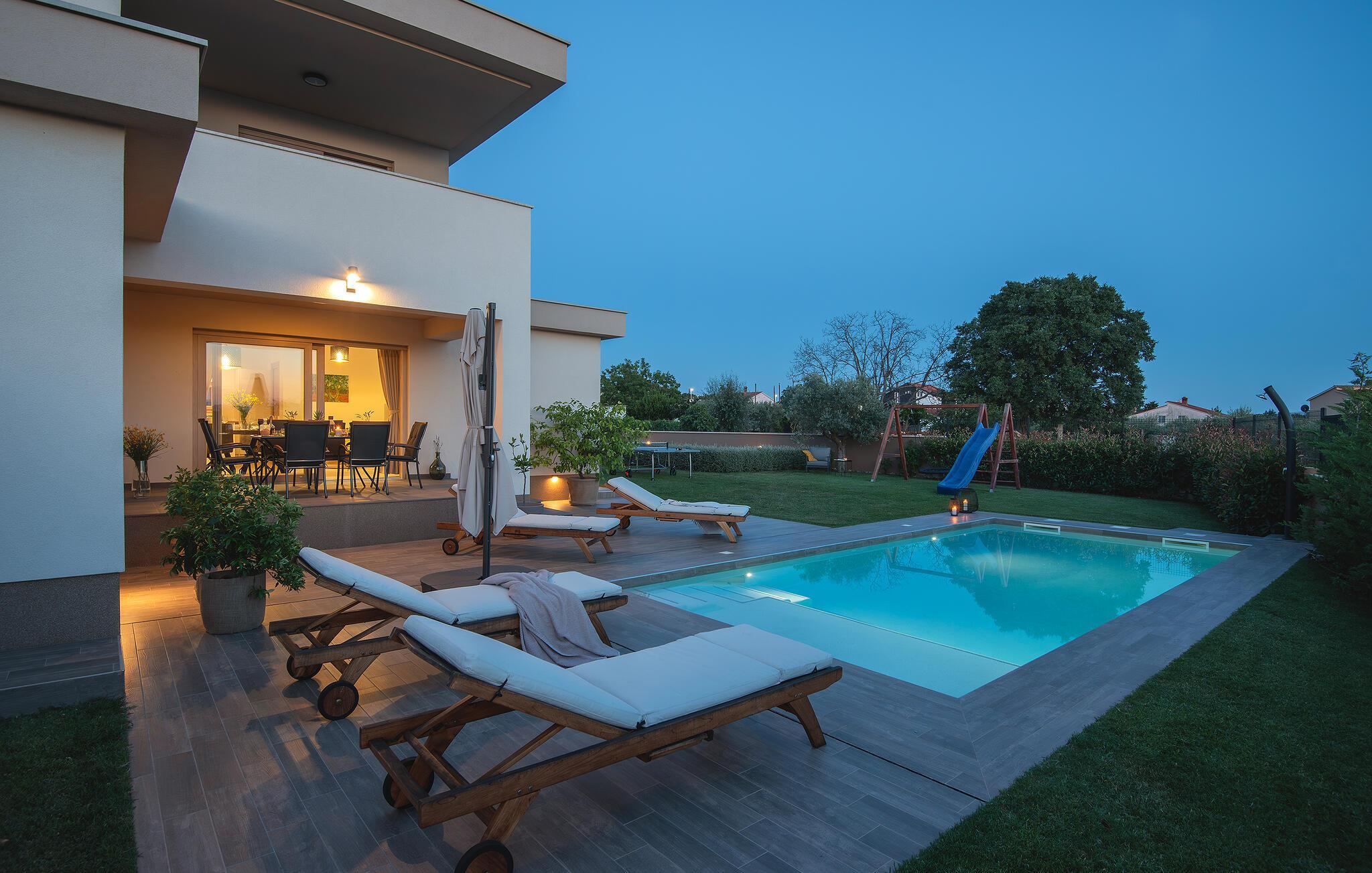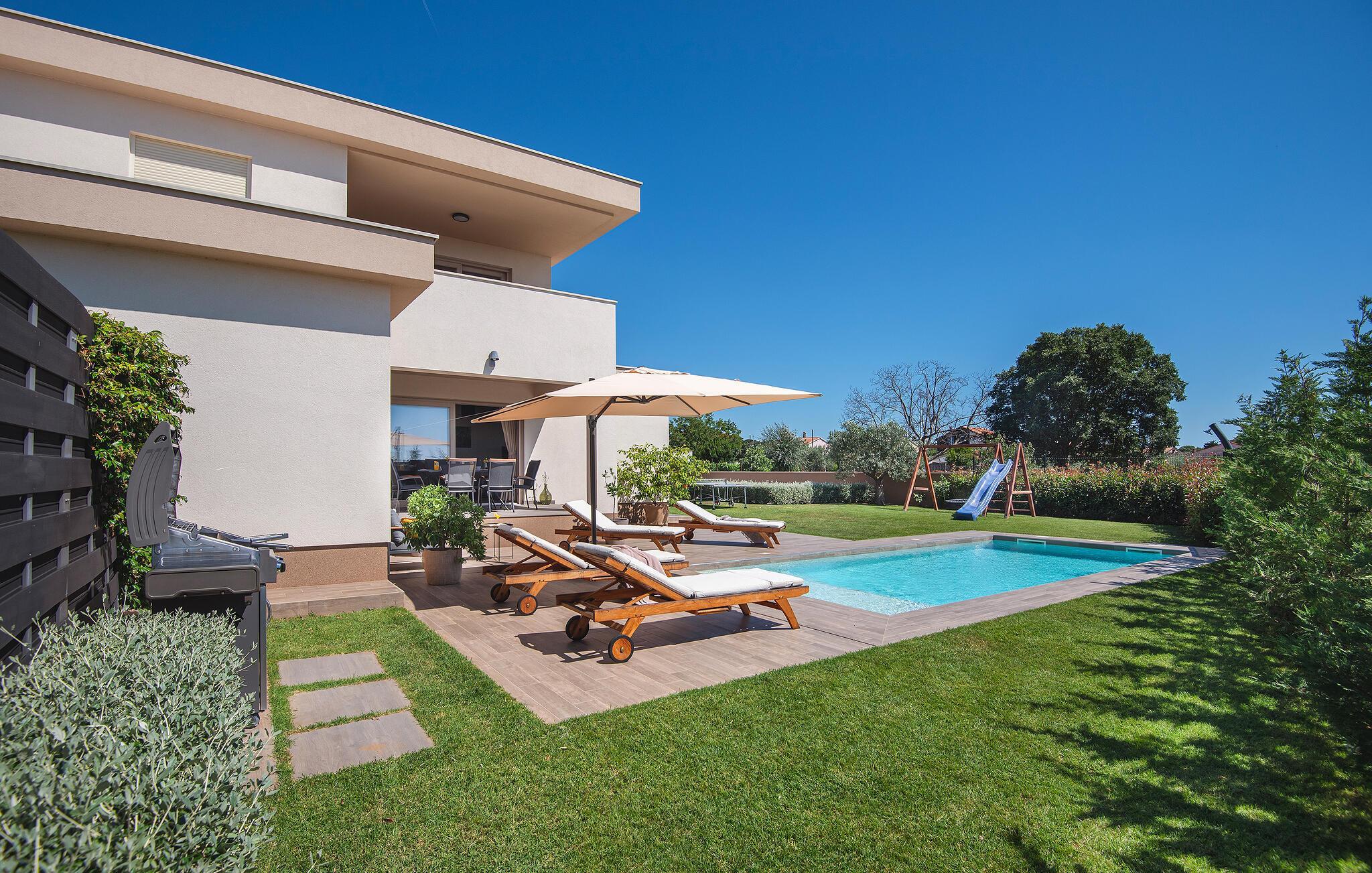 Villaen har to komfortable og moderne soverom, hvorav det ene til og med har eget bad. Begge badene i denne villaen har imidlertid gulvvarme, noe som gir deg ultimat komfort under oppholdet, uansett årstid. Men du trenger heller ikke bekymre deg for sommervarmen, for denne moderne villaen har aircondition! Den åpne planløsningen med stue, spisestue og kjøkken gjør det mulig å tilbringe tid sammen, samtidig som alle kan finne sin personlige favorittplass. Hvis du er mesterkokken i gruppen, kan du nyte det fullt utstyrte kjøkkenet og tilberede et måltid til dine kjære. Det er mange muligheter for å spise sammen, enten ved spisebordet innendørs eller utendørs. Hvis du foretrekker å lage mat i frisk luft, står gassgrillen alltid til din disposisjon. Resten av gruppen kan slappe av på solstolene eller ta en dukkert i bassenget og hoppe uti for å hjelpe til om nødvendig. De minste vil ikke vite hvilken aktivitet de skal velge først - huskene og sklien ligger rett bak bassenget på plenen. Med de mange fordelene som denne villaen tilbyr, vil alle finne en plass for seg selv, slik at dere kan nyte ferien sammen, men også hver for dere, så mye som mulig! Beliggenheten til denne villaen er rett og slett perfekt: bare 4 km fra de første strendene og nær sentrum av Pula. På den ene siden er Istria det ideelle valget for deg som ønsker å nyte uberørt natur og sjarmen i små, tradisjonelle og for det meste middelalderske byer. På den andre siden er turistbyenes kjas og mas bare en kort kjøretur unna villaen. Pula er utvilsomt Istrias sentrum når det gjelder kultur og tradisjon. Byen nådde sin storhetstid i romertiden, og har etterlatt seg mange spor, blant annet det berømte amfiteateret. Pula byr på en rekke fritidsaktiviteter som idrettsanlegg, barer, restauranter, nattklubber og organiserte turer, f.eks. til Brijuni nasjonalpark. I likhet med mange andre kystbyer er Pula også kjent for sine vakre strender og det krystallklare havet. De frodige skogene, de flotte strendene og middelhavsklimaet gjør Pula til et ideelt reisemål for badegjester.