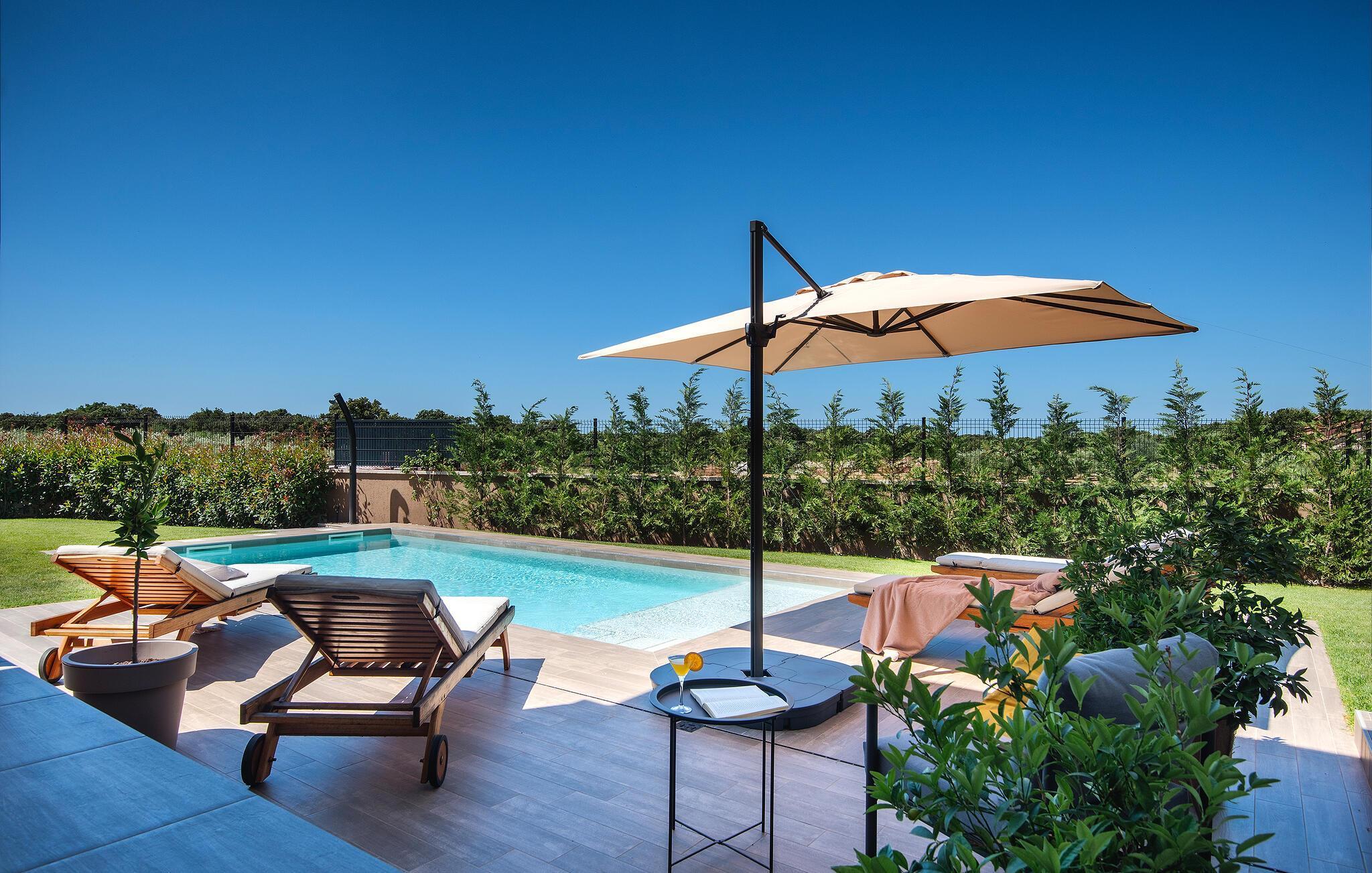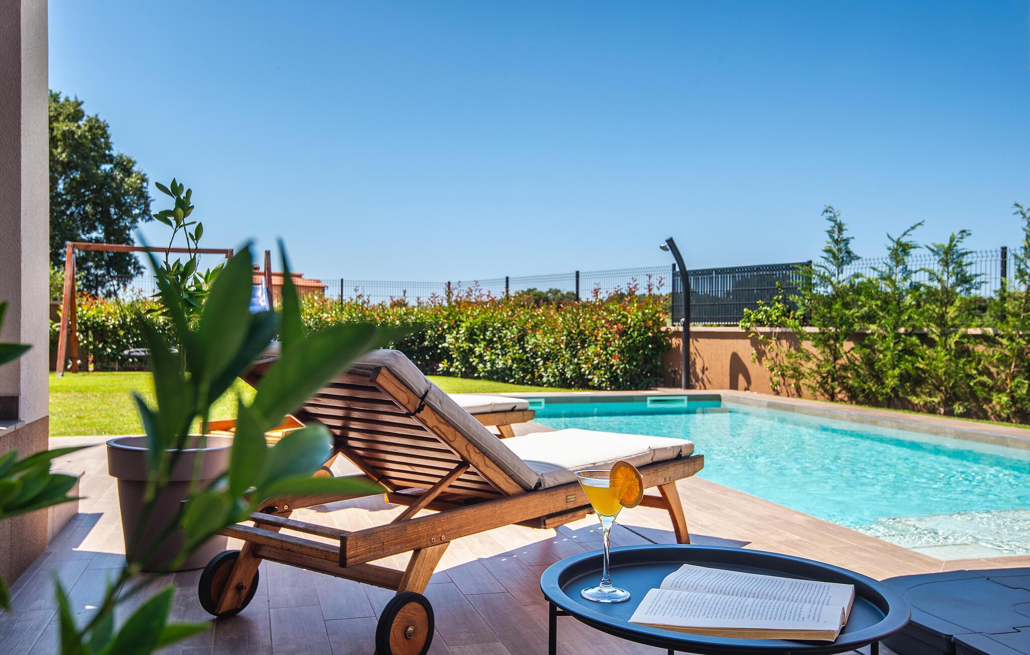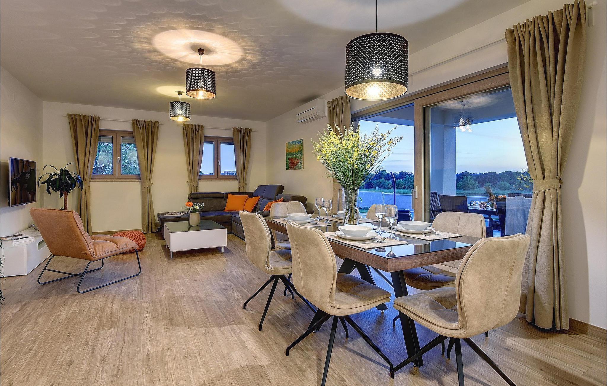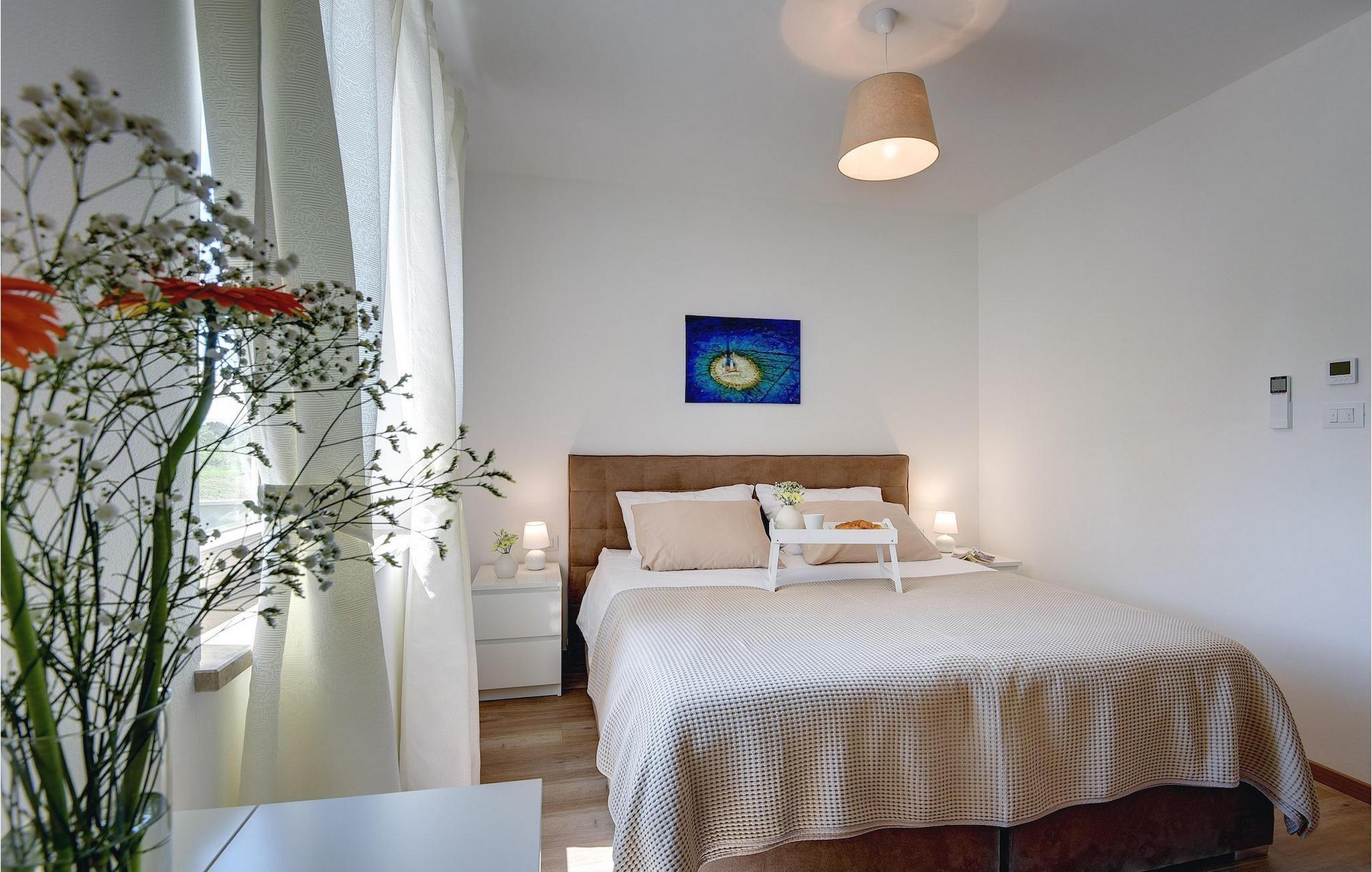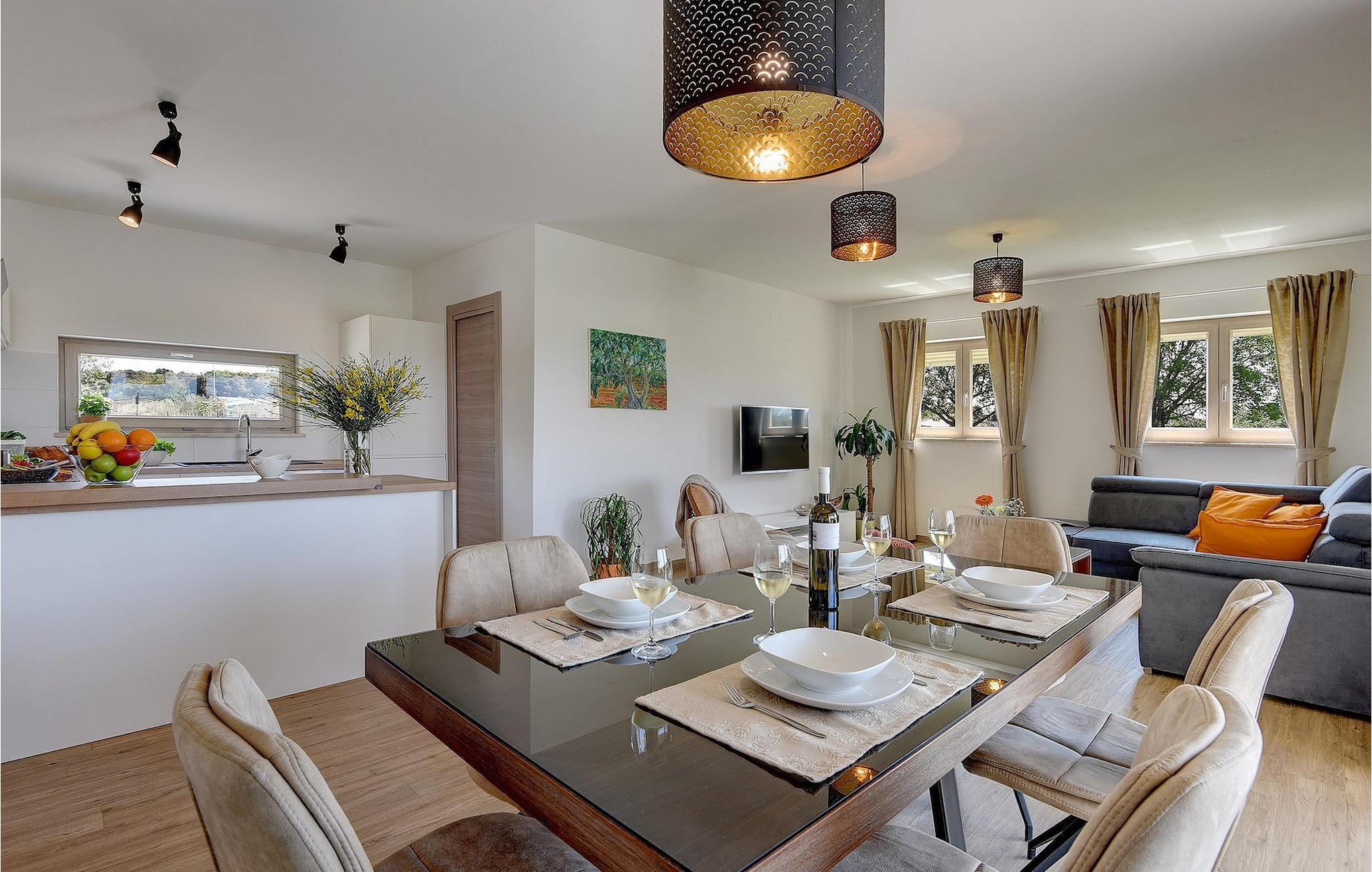 Villaen har to komfortable og moderne soverom, hvorav det ene til og med har eget bad. Begge badene i denne villaen har imidlertid gulvvarme, noe som gir deg ultimat komfort under oppholdet, uansett årstid. Men du trenger heller ikke bekymre deg for sommervarmen, for denne moderne villaen har aircondition! Den åpne planløsningen med stue, spisestue og kjøkken gjør det mulig å tilbringe tid sammen, samtidig som alle kan finne sin personlige favorittplass. Hvis du er mesterkokken i gruppen, kan du nyte det fullt utstyrte kjøkkenet og tilberede et måltid til dine kjære. Det er mange muligheter for å spise sammen, enten ved spisebordet innendørs eller utendørs. Hvis du foretrekker å lage mat i frisk luft, står gassgrillen alltid til din disposisjon. Resten av gruppen kan slappe av på solstolene eller ta en dukkert i bassenget og hoppe uti for å hjelpe til om nødvendig. De minste vil ikke vite hvilken aktivitet de skal velge først - huskene og sklien ligger rett bak bassenget på plenen. Med de mange fordelene som denne villaen tilbyr, vil alle finne en plass for seg selv, slik at dere kan nyte ferien sammen, men også hver for dere, så mye som mulig! Beliggenheten til denne villaen er rett og slett perfekt: bare 4 km fra de første strendene og nær sentrum av Pula. På den ene siden er Istria det ideelle valget for deg som ønsker å nyte uberørt natur og sjarmen i små, tradisjonelle og for det meste middelalderske byer. På den andre siden er turistbyenes kjas og mas bare en kort kjøretur unna villaen. Pula er utvilsomt Istrias sentrum når det gjelder kultur og tradisjon. Byen nådde sin storhetstid i romertiden, og har etterlatt seg mange spor, blant annet det berømte amfiteateret. Pula byr på en rekke fritidsaktiviteter som idrettsanlegg, barer, restauranter, nattklubber og organiserte turer, f.eks. til Brijuni nasjonalpark. I likhet med mange andre kystbyer er Pula også kjent for sine vakre strender og det krystallklare havet. De frodige skogene, de flotte strendene og middelhavsklimaet gjør Pula til et ideelt reisemål for badegjester.