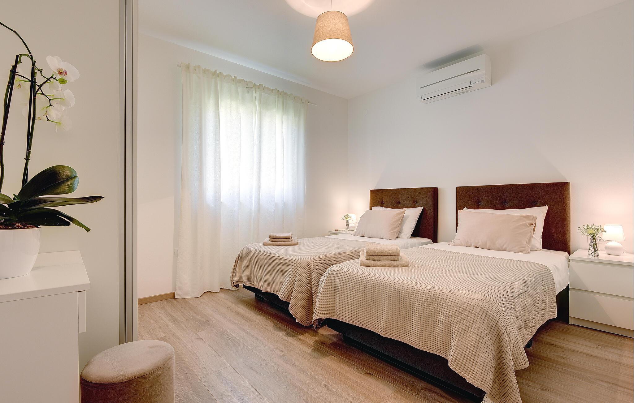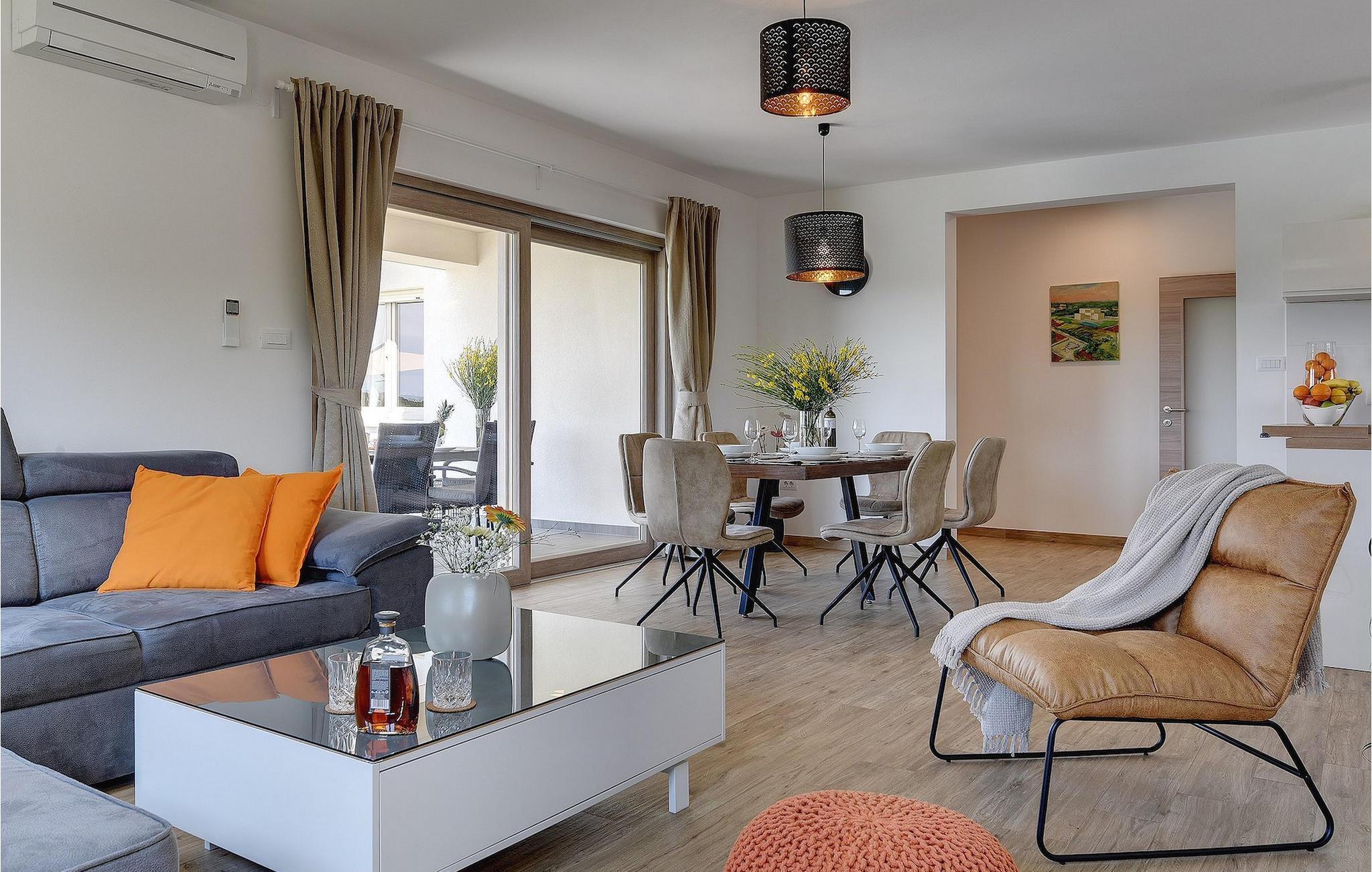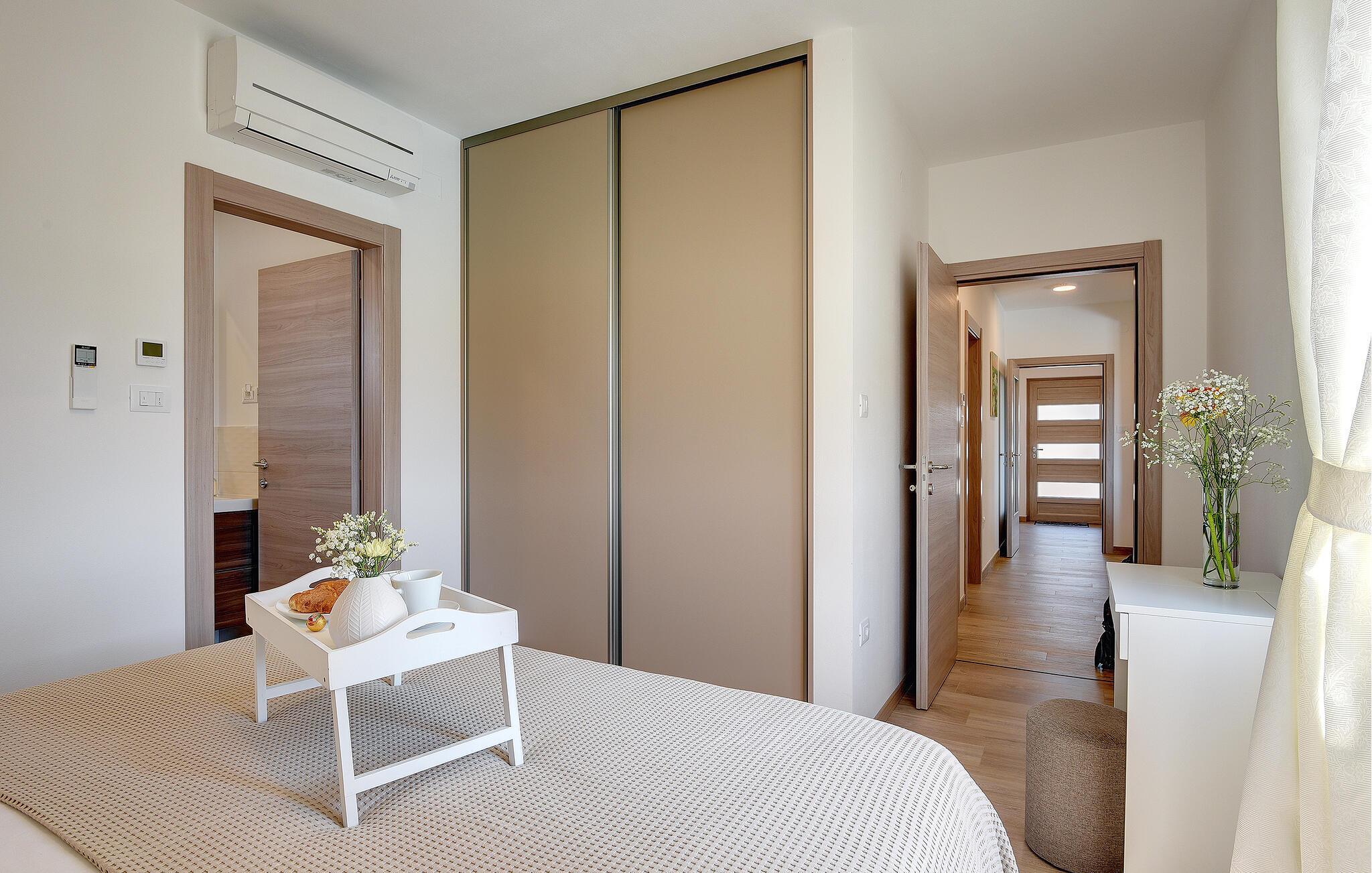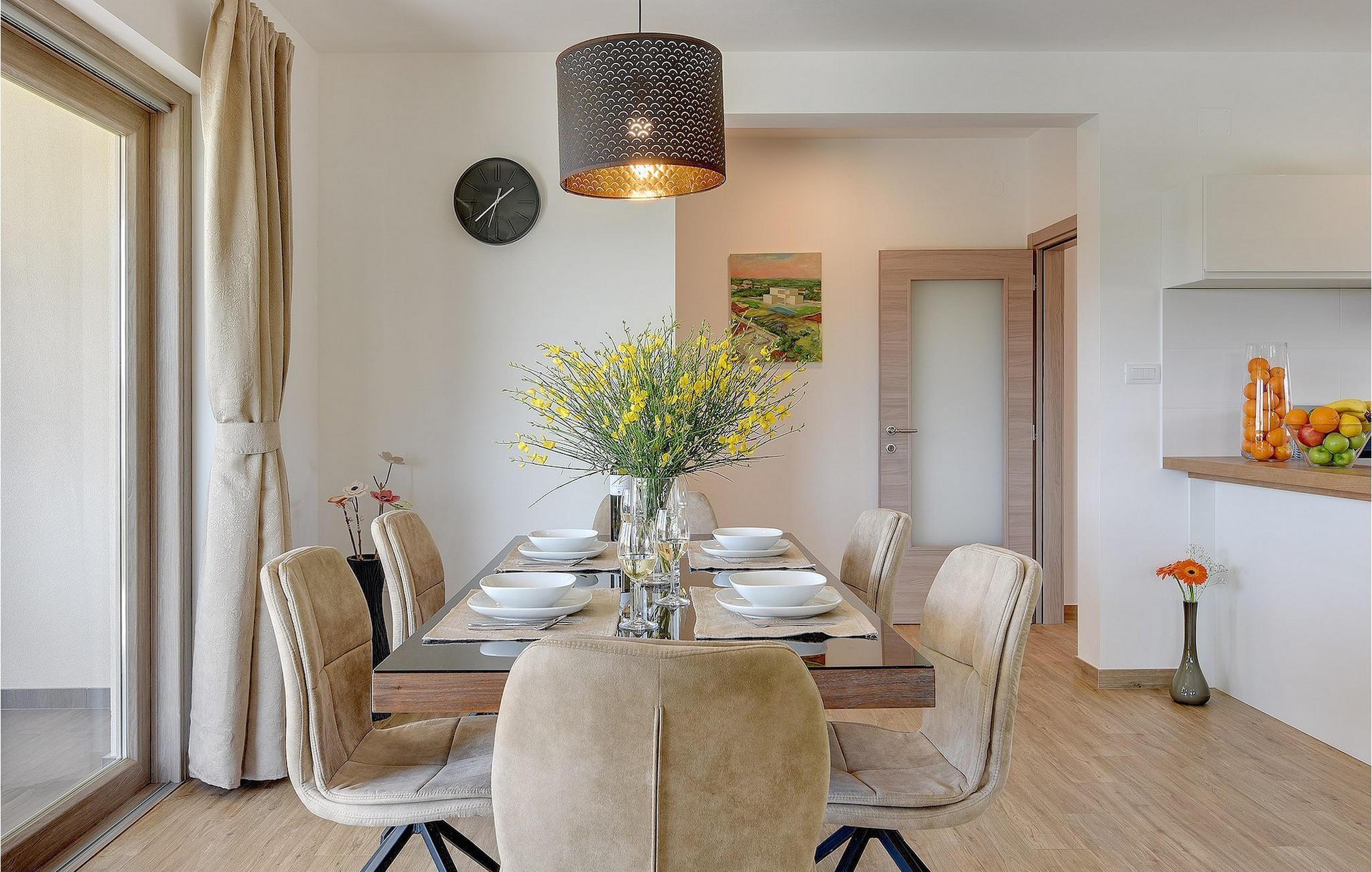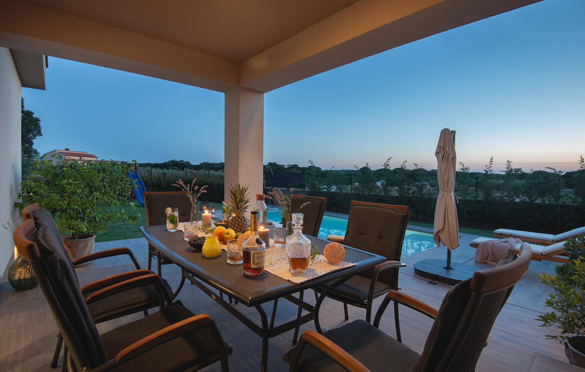 Villaen har to komfortable og moderne soverom, hvorav det ene til og med har eget bad. Begge badene i denne villaen har imidlertid gulvvarme, noe som gir deg ultimat komfort under oppholdet, uansett årstid. Men du trenger heller ikke bekymre deg for sommervarmen, for denne moderne villaen har aircondition! Den åpne planløsningen med stue, spisestue og kjøkken gjør det mulig å tilbringe tid sammen, samtidig som alle kan finne sin personlige favorittplass. Hvis du er mesterkokken i gruppen, kan du nyte det fullt utstyrte kjøkkenet og tilberede et måltid til dine kjære. Det er mange muligheter for å spise sammen, enten ved spisebordet innendørs eller utendørs. Hvis du foretrekker å lage mat i frisk luft, står gassgrillen alltid til din disposisjon. Resten av gruppen kan slappe av på solstolene eller ta en dukkert i bassenget og hoppe uti for å hjelpe til om nødvendig. De minste vil ikke vite hvilken aktivitet de skal velge først - huskene og sklien ligger rett bak bassenget på plenen. Med de mange fordelene som denne villaen tilbyr, vil alle finne en plass for seg selv, slik at dere kan nyte ferien sammen, men også hver for dere, så mye som mulig! Beliggenheten til denne villaen er rett og slett perfekt: bare 4 km fra de første strendene og nær sentrum av Pula. På den ene siden er Istria det ideelle valget for deg som ønsker å nyte uberørt natur og sjarmen i små, tradisjonelle og for det meste middelalderske byer. På den andre siden er turistbyenes kjas og mas bare en kort kjøretur unna villaen. Pula er utvilsomt Istrias sentrum når det gjelder kultur og tradisjon. Byen nådde sin storhetstid i romertiden, og har etterlatt seg mange spor, blant annet det berømte amfiteateret. Pula byr på en rekke fritidsaktiviteter som idrettsanlegg, barer, restauranter, nattklubber og organiserte turer, f.eks. til Brijuni nasjonalpark. I likhet med mange andre kystbyer er Pula også kjent for sine vakre strender og det krystallklare havet. De frodige skogene, de flotte strendene og middelhavsklimaet gjør Pula til et ideelt reisemål for badegjester.