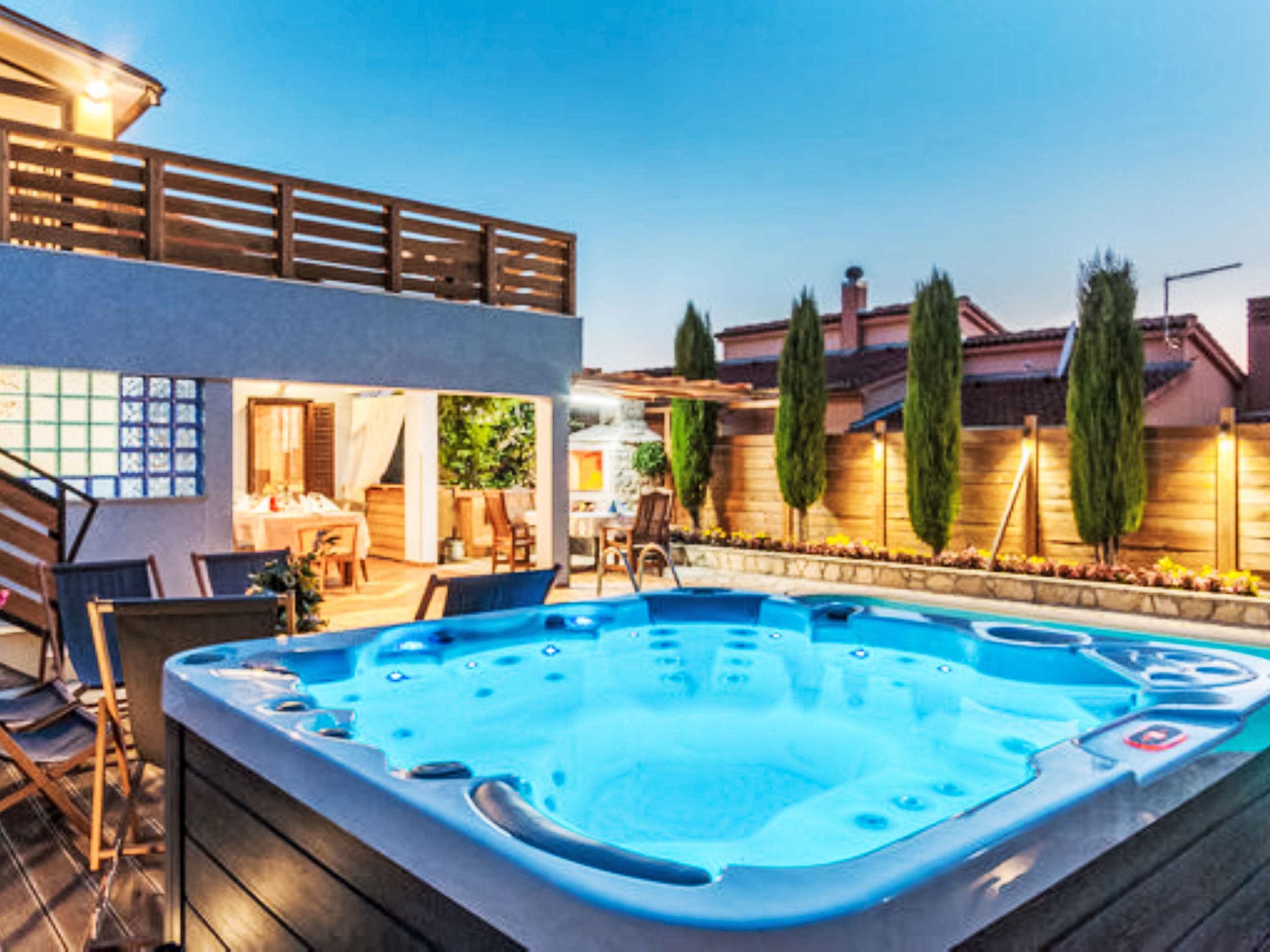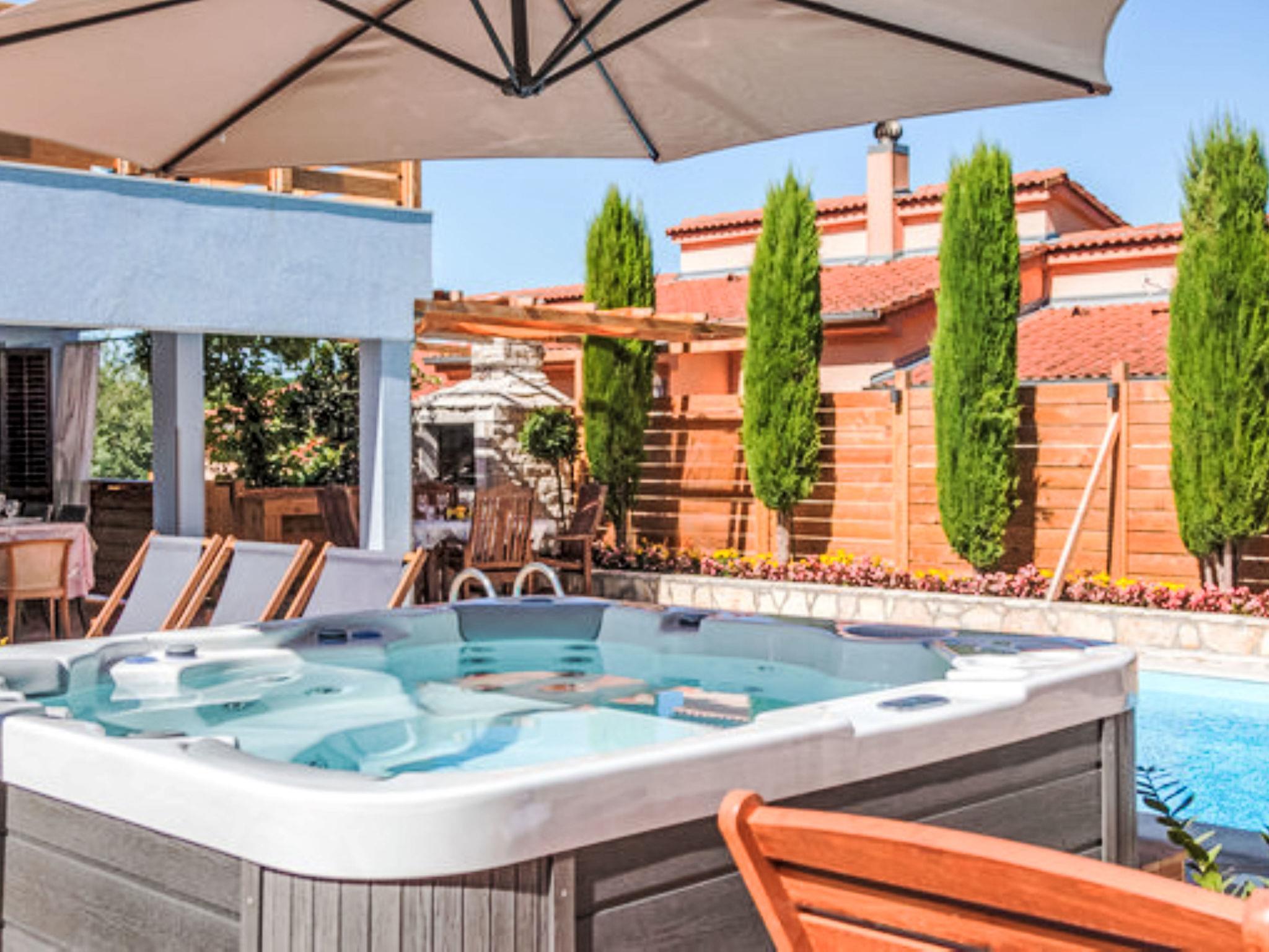 Single-family house "Paola". In the hamlet Loborika 6.5 km from the centre of Pula, 6 km from the centre of Marcana, in a quiet, sunny position, 9 km from the sea, in the countryside. Private: property 820 m2 (fenced), garden with wildlife garden and flowers, swimming pool angular (8 x 4 m, 5 m diameter, depth 140 cm, seasonal availability: 04.May. - 12.Oct.). Shower/WC in the pool area, outdoor shower, hot tub, terrace (30 m2), barbecue, pool maintenance by the owner/gardener. In the house: internet access, billiard table. Motor access to the house (200 m via unmade road). Parking (for 3 cars) at the house on the premises. Shop 1 km, supermarket 5 km, restaurant 1 km, café 1 km, bus stop 900 m, pebble beach 12 km, rocky beach 12 km. Tennis 15 km, riding stable 5 km, walking paths from the house 100 m, cycle lane 150 m. Nearby attractions: Amphitheater 8.5 km.