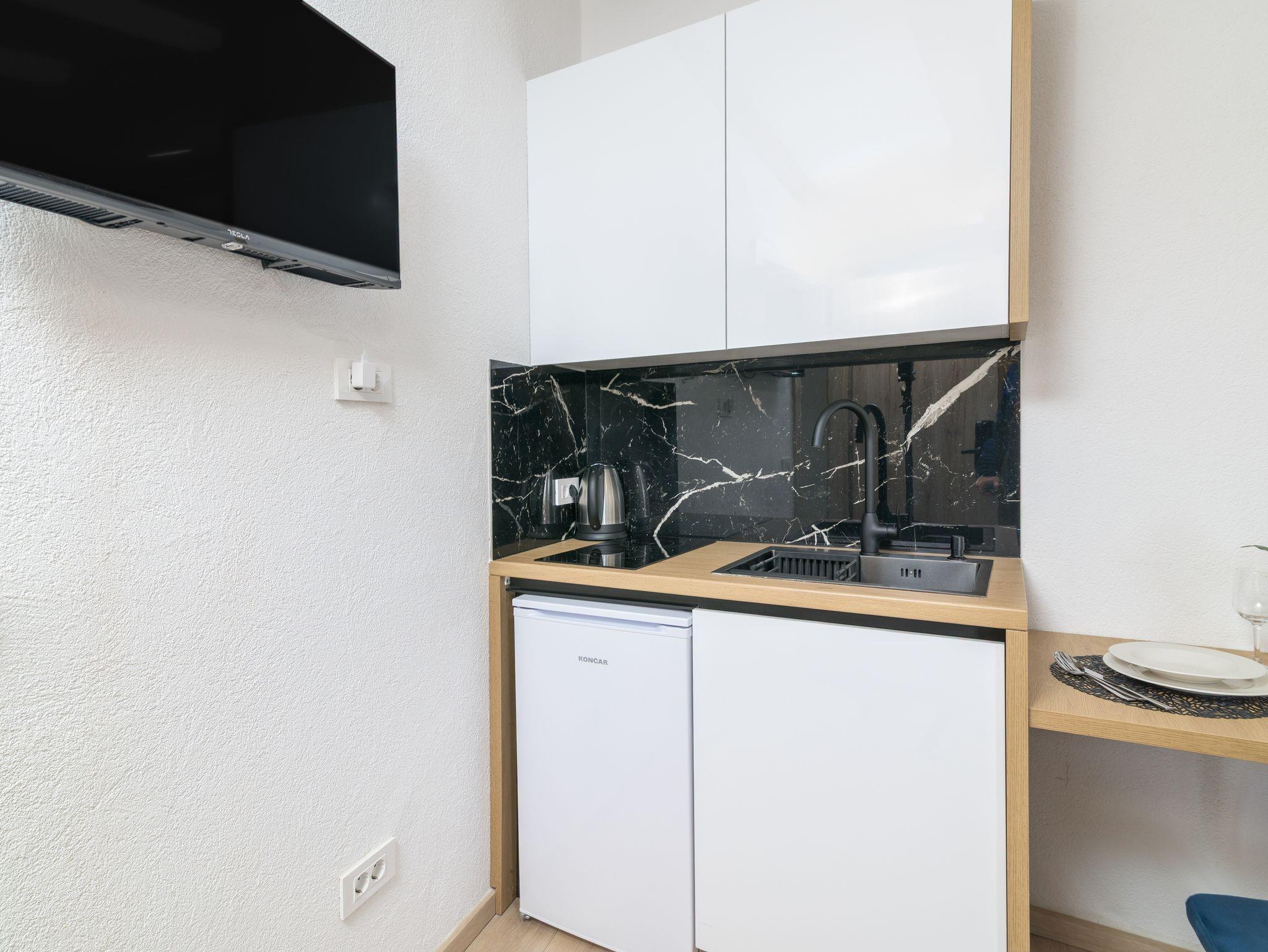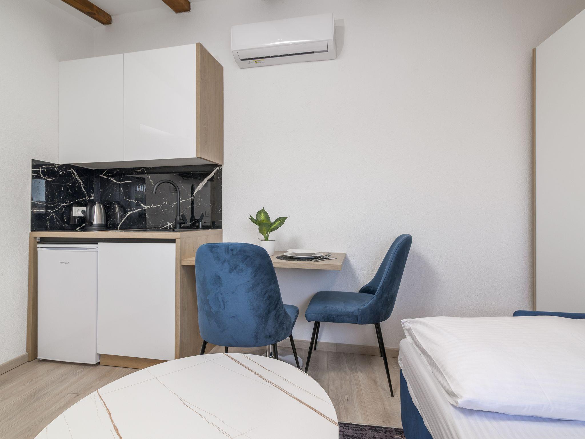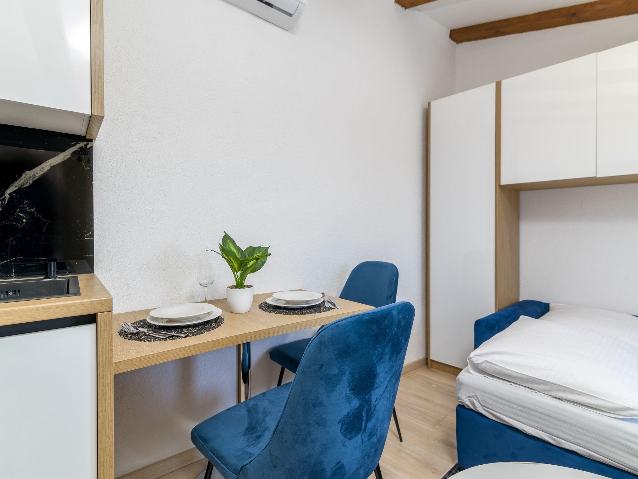 Studio bietet Platz für 2 Gäste. Die Betten sind in Schlafzimmern, die es 1 gibt, innerhalb einer Gesamtfläche von 20m2, angeordnet. Die Gäste haben eine eigene Terrasse zur Verfügung, auf der sie in warmen Sommernächten genießen können. Das Studio-Apartment bietet Meerblick. Räume der gebuchten Unterkunftseinheit werden nicht in eine Ganze verbunden. IM PREIS INBEGRIFFEN: Kurtaxe, Endreinigung, Klimatisierung, Internet, Föhn. VERBINDLICHE ZUSÄTZLICHE KOSTEN: Aufzahlung für Kurzaufenthalte (prozentualer Zuschlag pro Nächtigungsanzahl: 30% - 1, 20% - 2, 10% - 3). Die Verfügbarkeit zusätzlicher Dienstleistungen in Ihrem reservierten Termin und die Preise derselben (falls nicht aufgeführt) müssen im Voraus überprüft werden. Zusätzliche Dienstleistungen die in der Zahlungsaufforderung nicht aufgeführt sind werden direkt beim Vermieter bezahlt, angenommen der Gast nutzt auch diese.