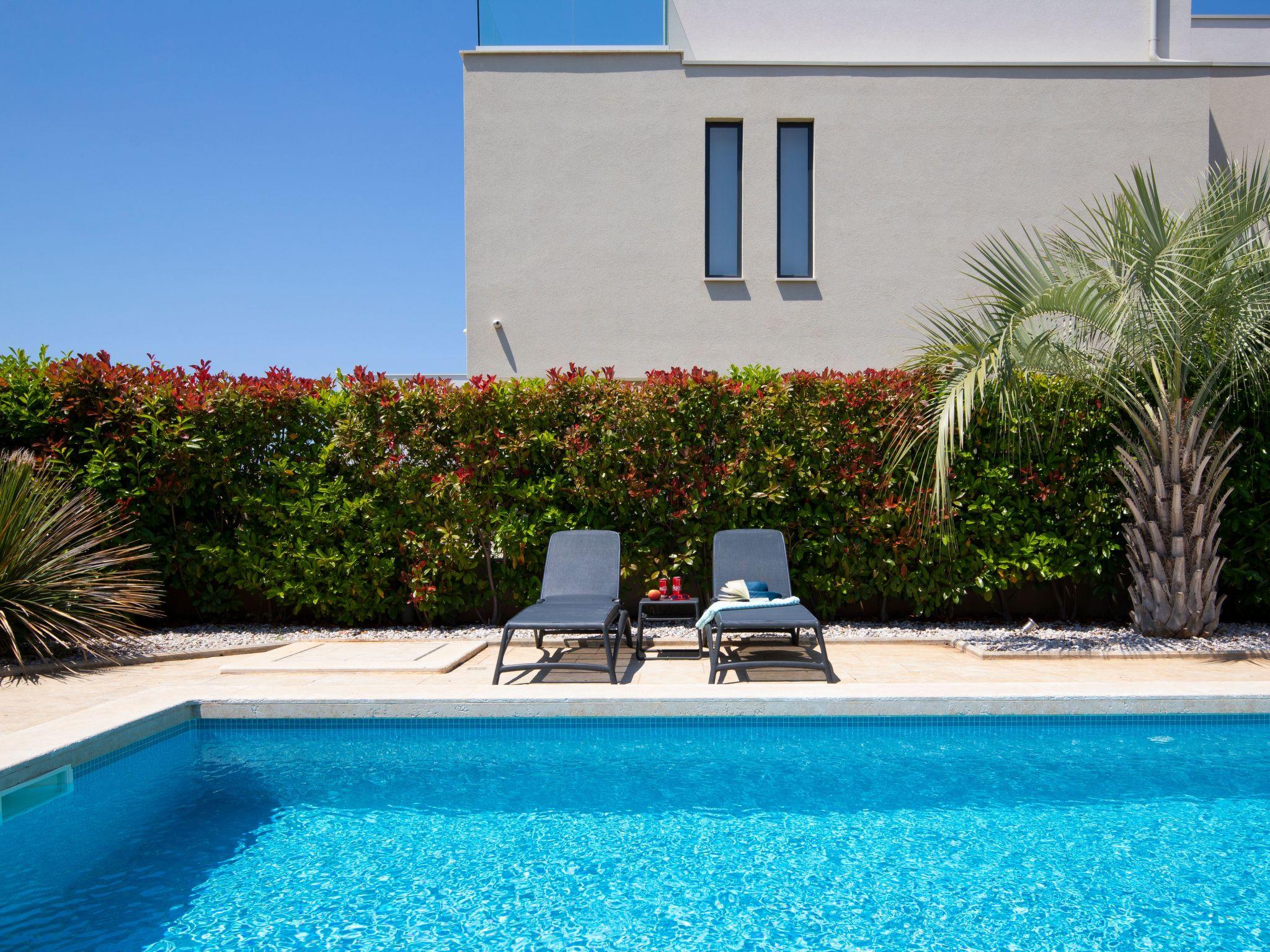 The pool measures 8 x 4m and has a counterflow system and solar heating. All three rooms in the attic have their own balcony with a sea view.