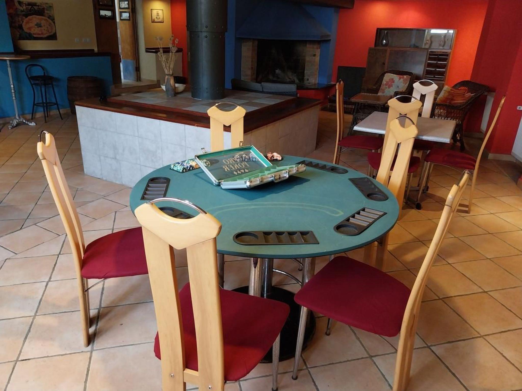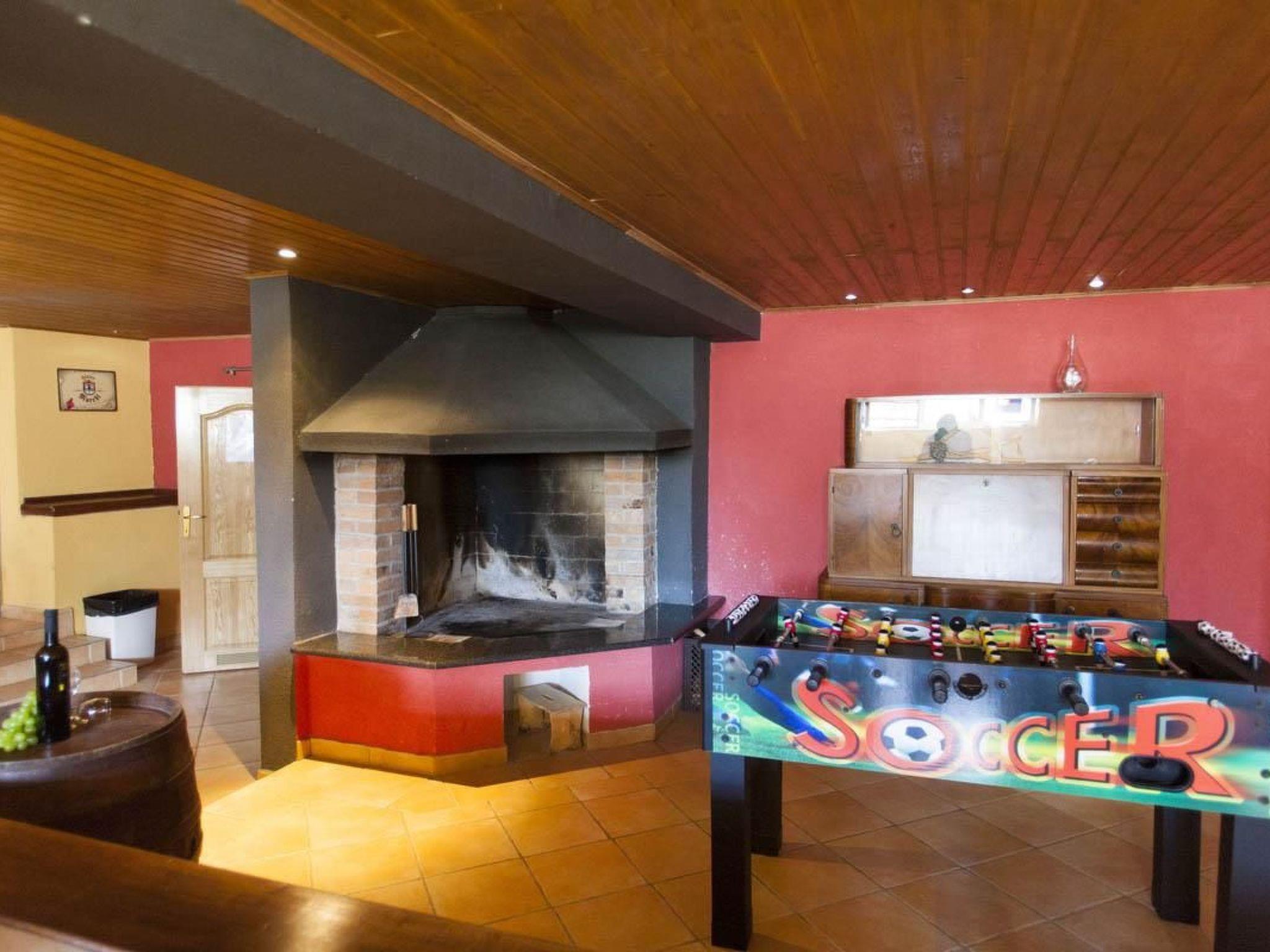 The basement offers a traditional tavern-style lounge with a fireplace, a leisure space for socializing, and direct access to a wellness area featuring a jacuzzi, sauna, sun loungers, a shower, changing room, and toilets—perfect for relaxing after a day in the sun.