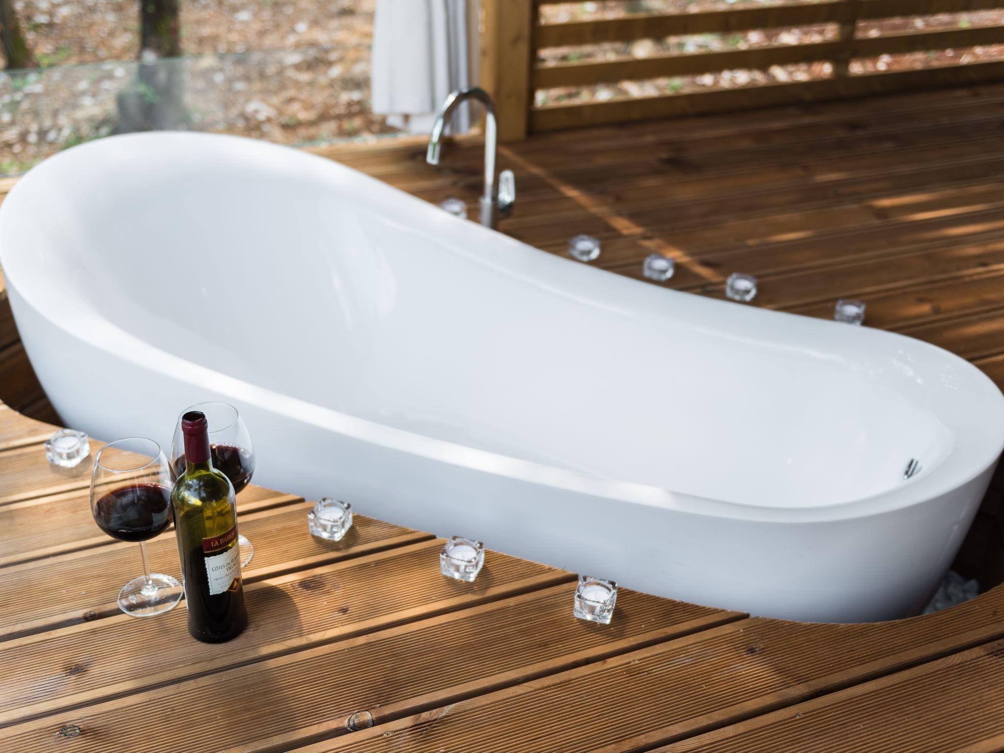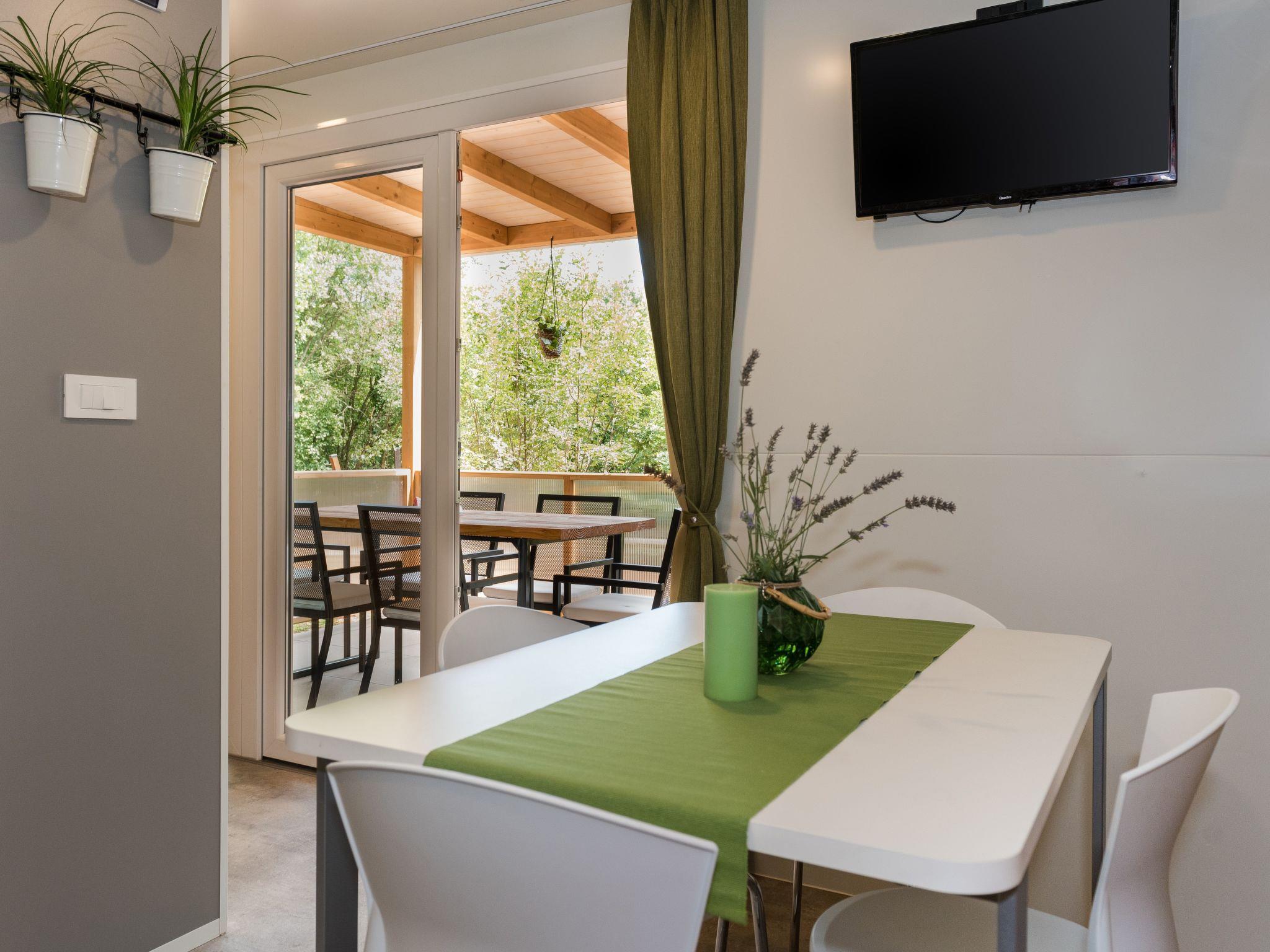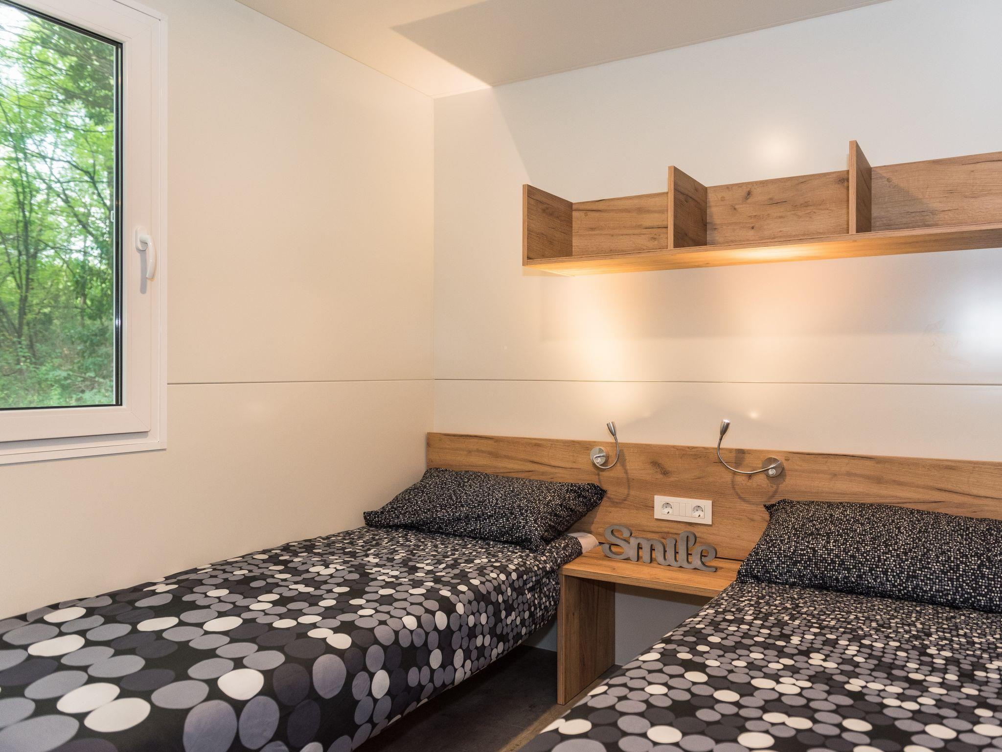 3-room bungalow 31 m2. Living/dining room with satellite TV (flat screen), air conditioning. Exit to the terrace. 1 room with 1 french bed (160 cm, length 200 cm). 1 room with 2 beds (80 cm, length 200 cm). Open kitchen (2 hot plates, microwave, freezer, electric coffee machine). Shower/bidet/WC. Forced-air heating. Terrace 32 m2, roofed. Terrace furniture, deck chairs. View of the garden. Facilities: baby cot (extra), hair dryer. Internet (WiFi, free). Parking (roofed, 1 car) at 15 m. 1 small pet/ dog allowed.
