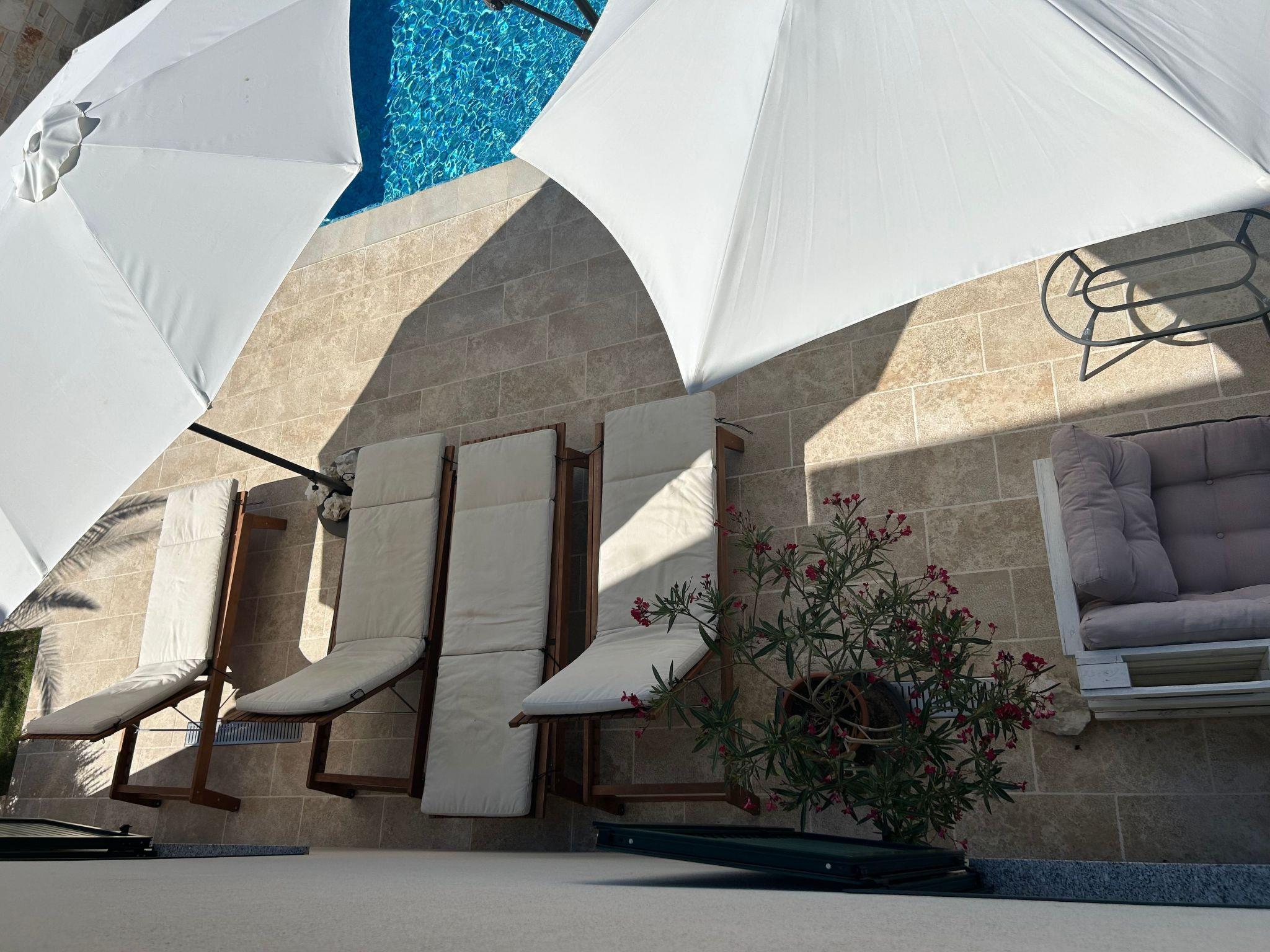 Der Außenbereich besteht aus einem schönen, großen privatem Pool 7,5 x 3,5 m (Mitte Mai - Ende September) mit umlaufender Poolterrasse und komplett eingezäuntem Grundstück, Außendusche, große überdachte Terrasse mit Gartenmöbeln, Sonnenschirm & Liegestühle, Grill und privatem Parkplatz (für 2 Autos) auf dem Grundstück.Auf den beiden Balkonen die von den Schlafzimmern zugänglich sind befinden sich zum entspannen schöne und bequeme Paletten- Loungemöbel.
