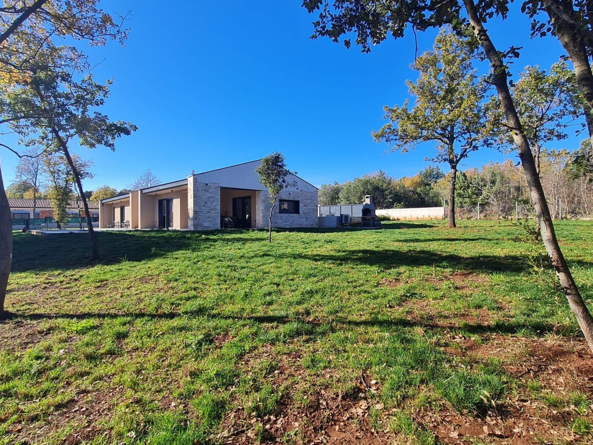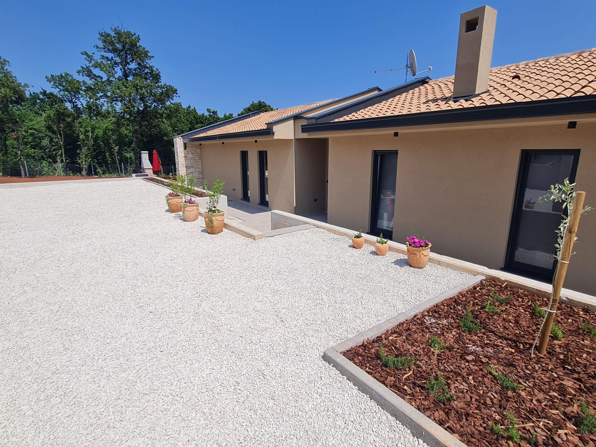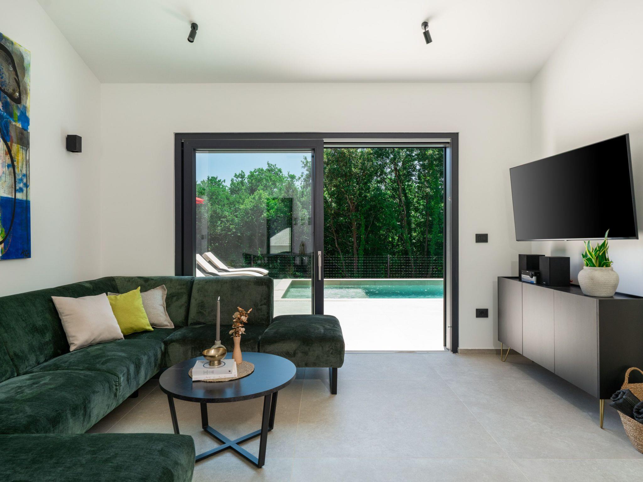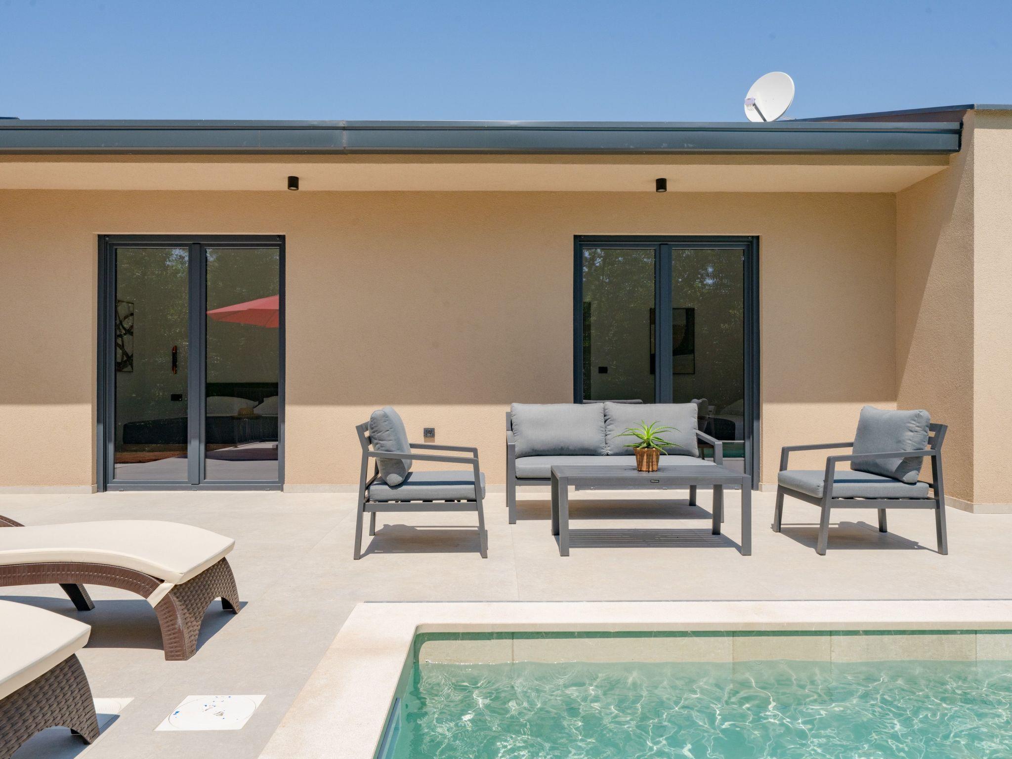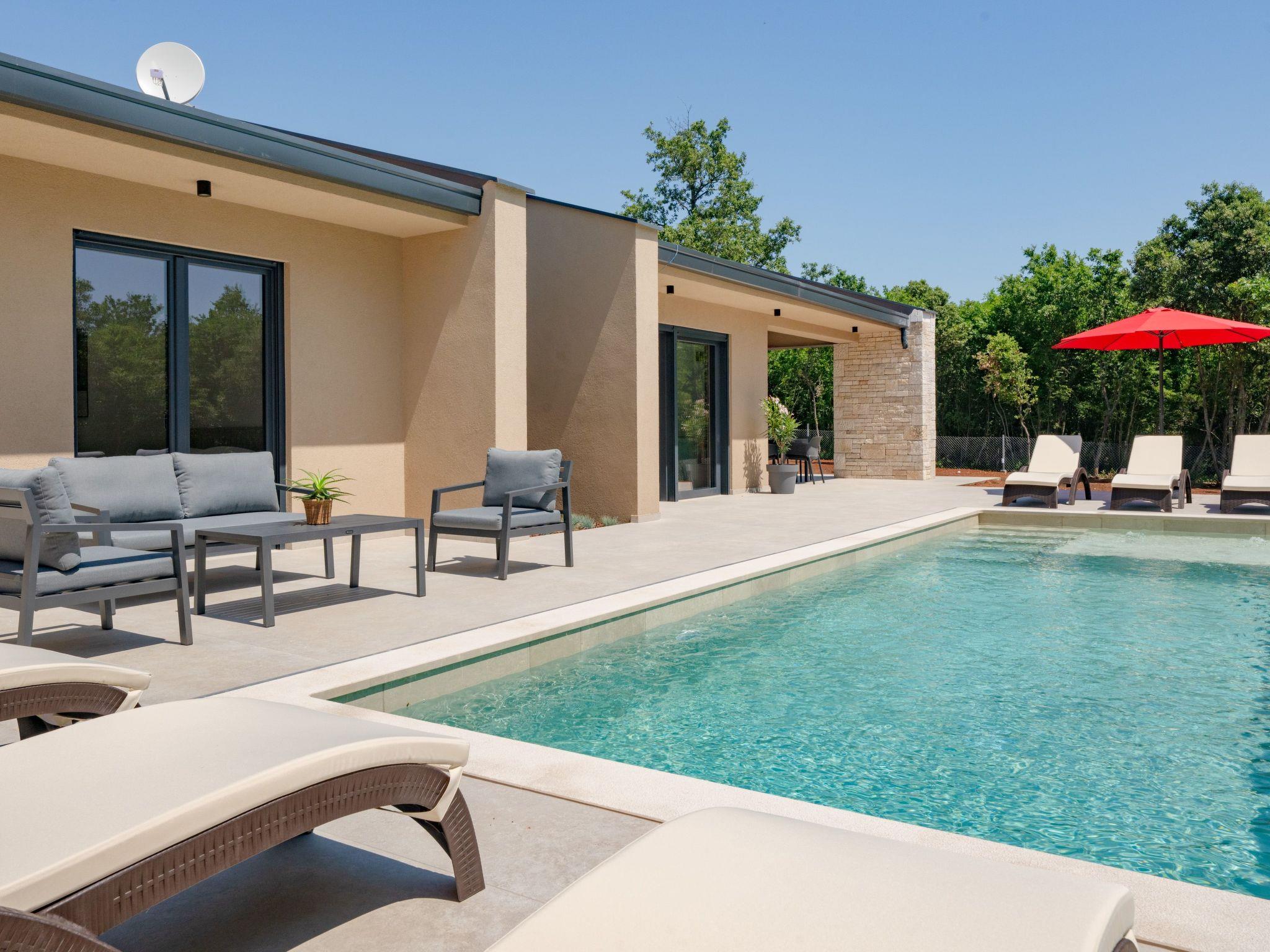 This comfortable villa is located in a quiet part of the village Peruški, surrounded by forest on two sides. It has 3 bedrooms – one is a master with its own bathroom, and there's also a second shared bathroom. The main area is a spacious open-plan kitchen, dining room, and living room, perfect for spending time together. The kitchen opens onto a covered terrace, great for outdoor meals. Outside, there's a large swimming pool, lounge area, fenced garden, outdoor grill, and private parking.