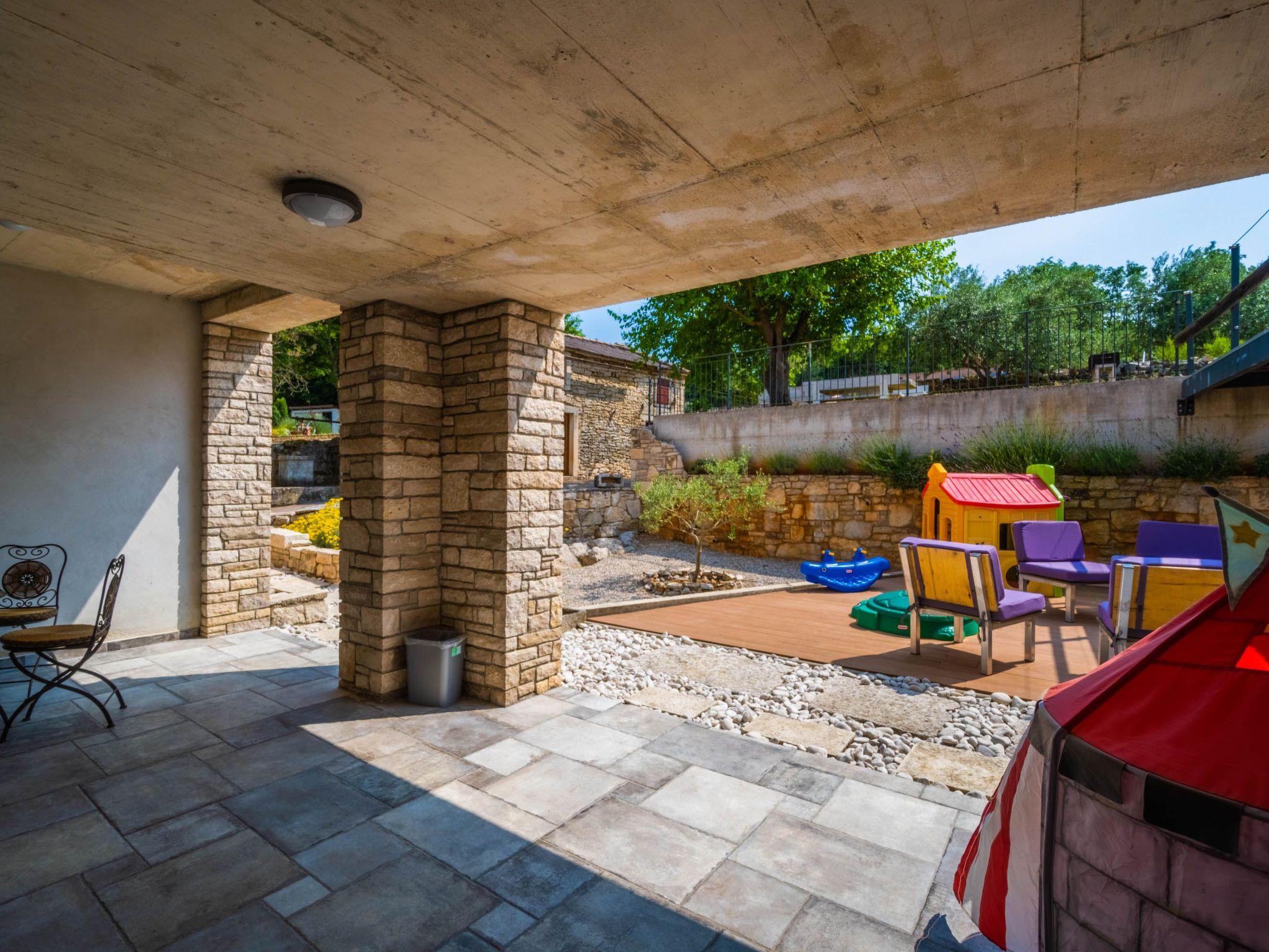 This appealing villa is located in the village Rakalj, the south-eastern part of the Istrian peninsula. Surrounded by spacious, well maintained property (943 m2) with a private pool and olive trees. Guests enter into the fenced area through the automatic gate and leave the car within the private property. Covered summer kitchen with grill and garden furniture are the perfect place for relaxing family gatherings. Plenty of outside activities offered on multi-level terraces and areas are even connected by the small bridge. The scent of the Mediterranean garden and nearby forest will enrich guests' impression of the surrounding. This villa assures peaceful holiday in complete privacy and safety.