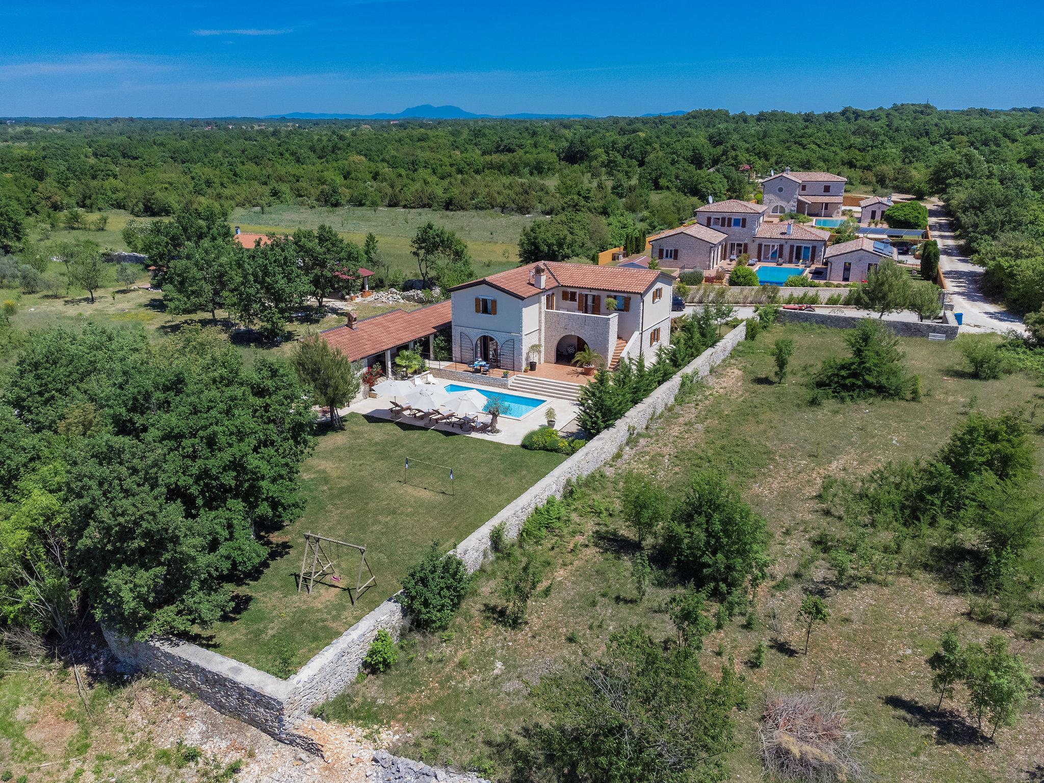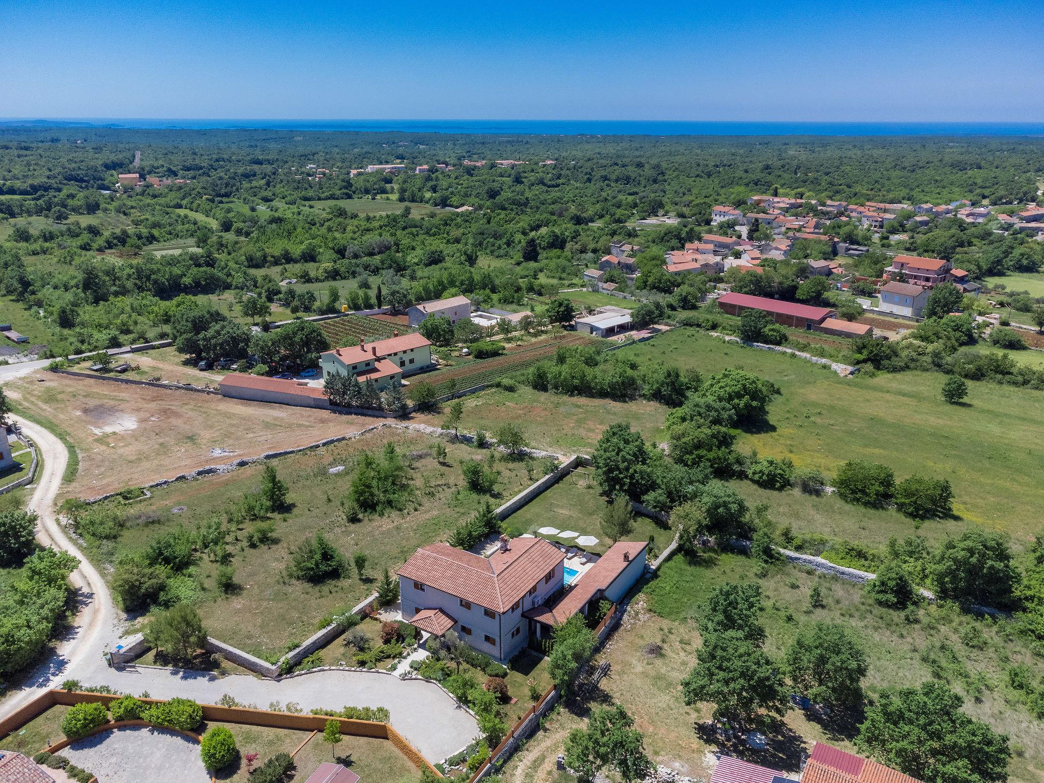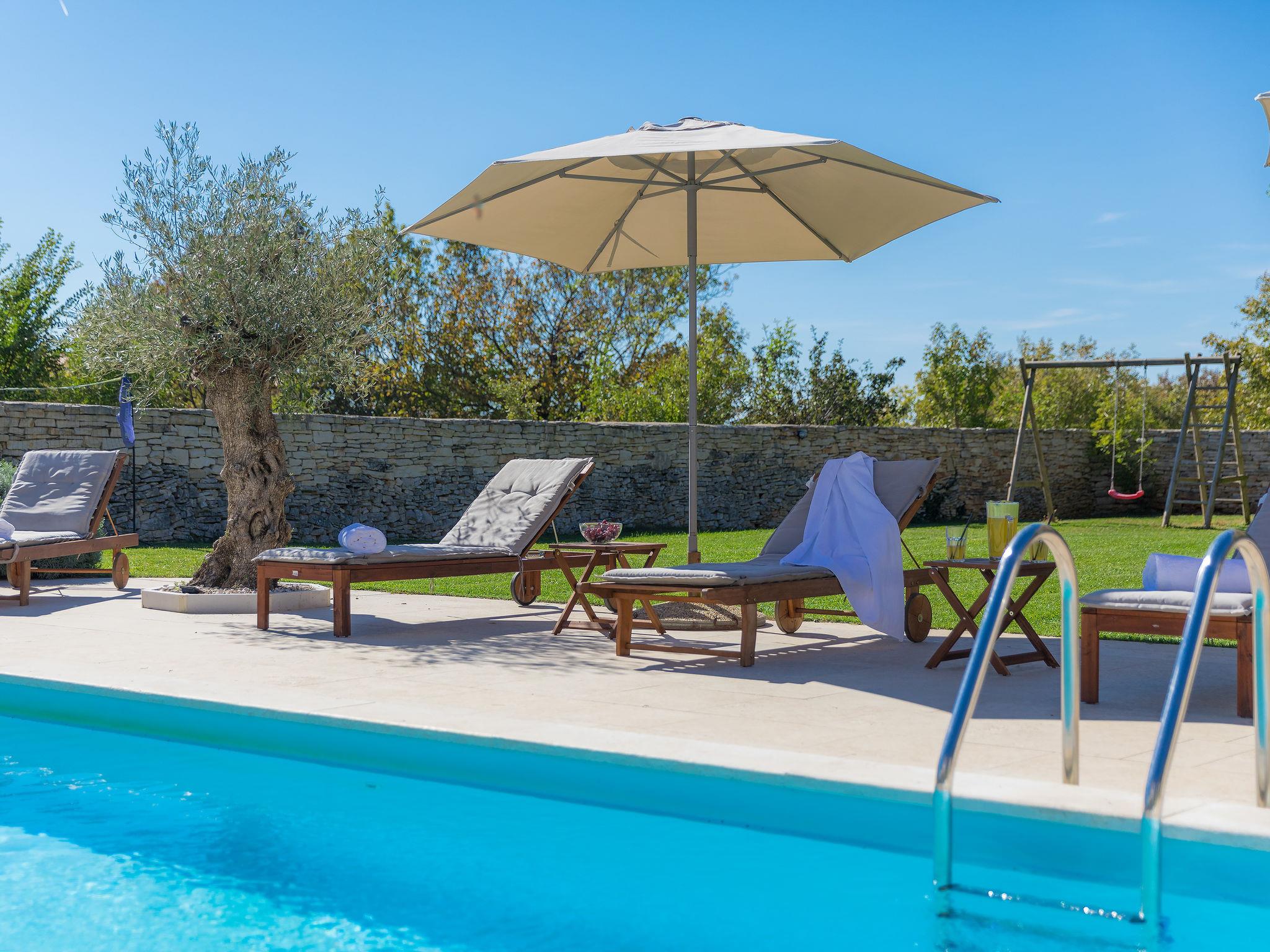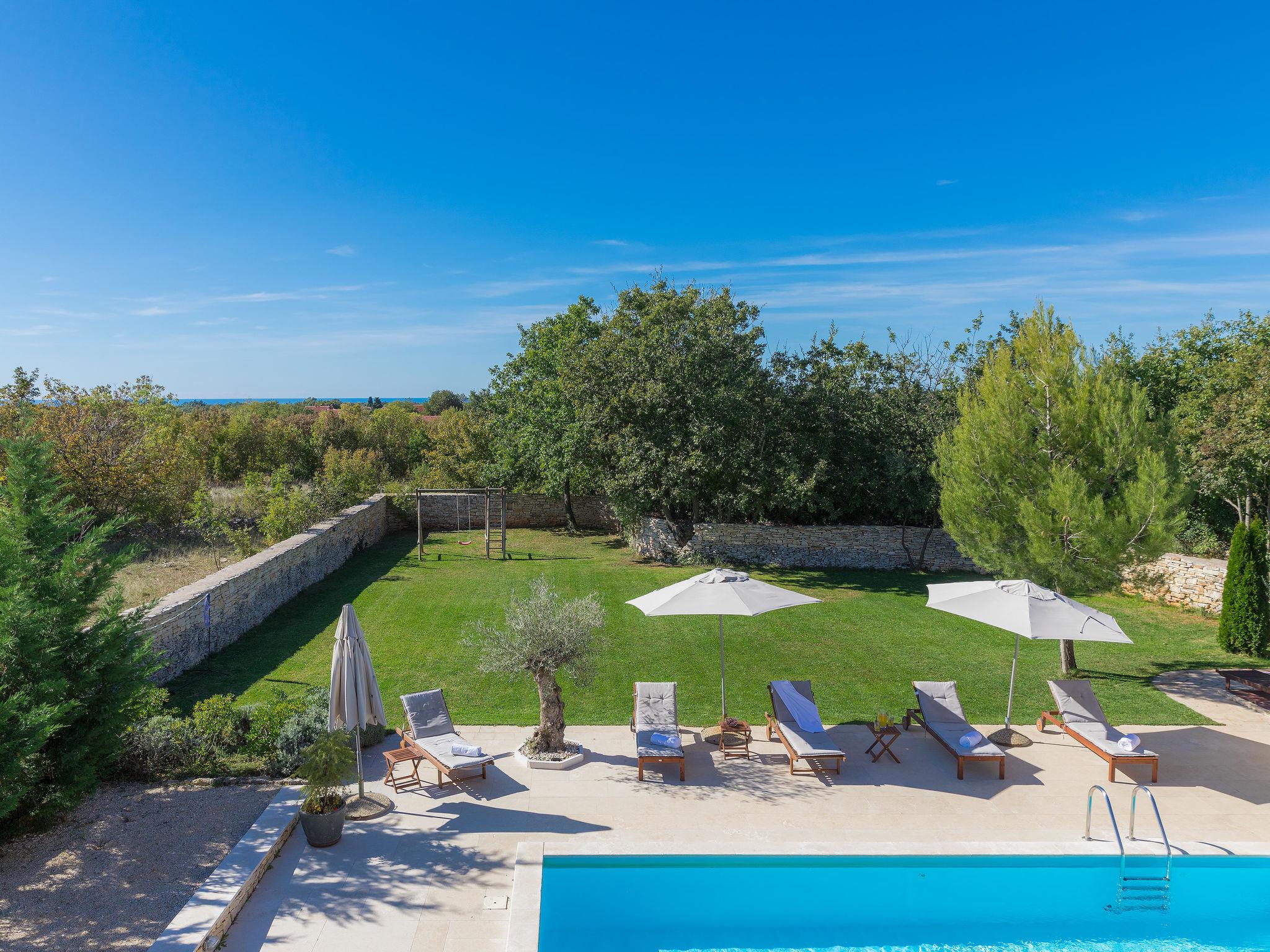 Cabrunici 8 km from Vodnjan: Beautiful villa "Histria 1", 2 storeys. 17 km from the centre of Pula, in a quiet, sunny position, 13 km from the sea. Private: property 1'800 m2 (fenced), swimming pool angular (4 x 8 m, depth 140 cm, seasonal availability: 27.Apr. - 01.Oct.). Outdoor shower, volleyball, terrace (50 m2), garden furniture, barbecue, children's playground (swing). In the house: internet access, washing machine. Parking at the house on the premises. Shop 1 km, supermarket 9 km, restaurant 500 m, bus stop 1.5 km, pebble beach 17 km, rocky beach 17 km. Walking paths from the house 1 km, cycle lane 1 km. The owner does not accept any youth groups.