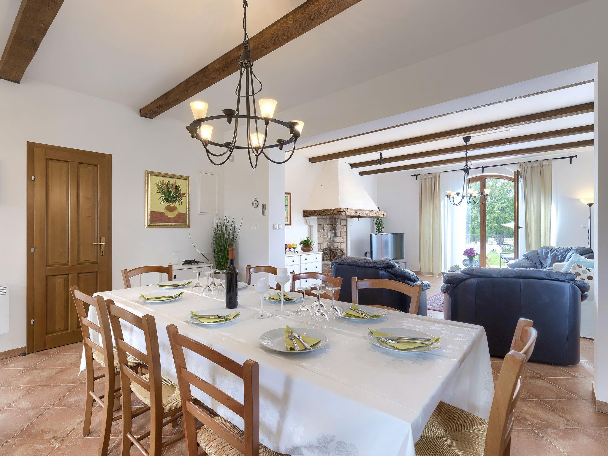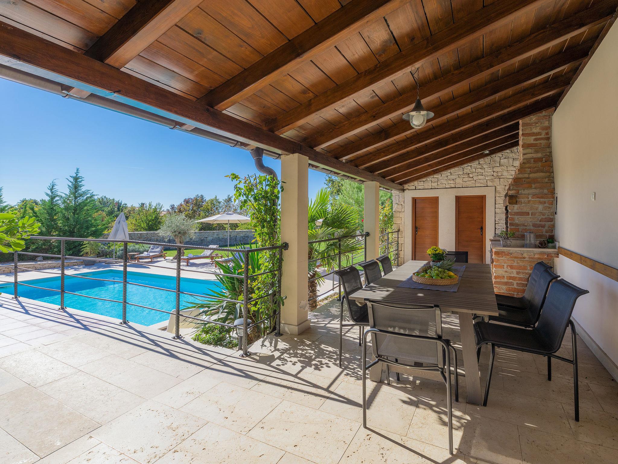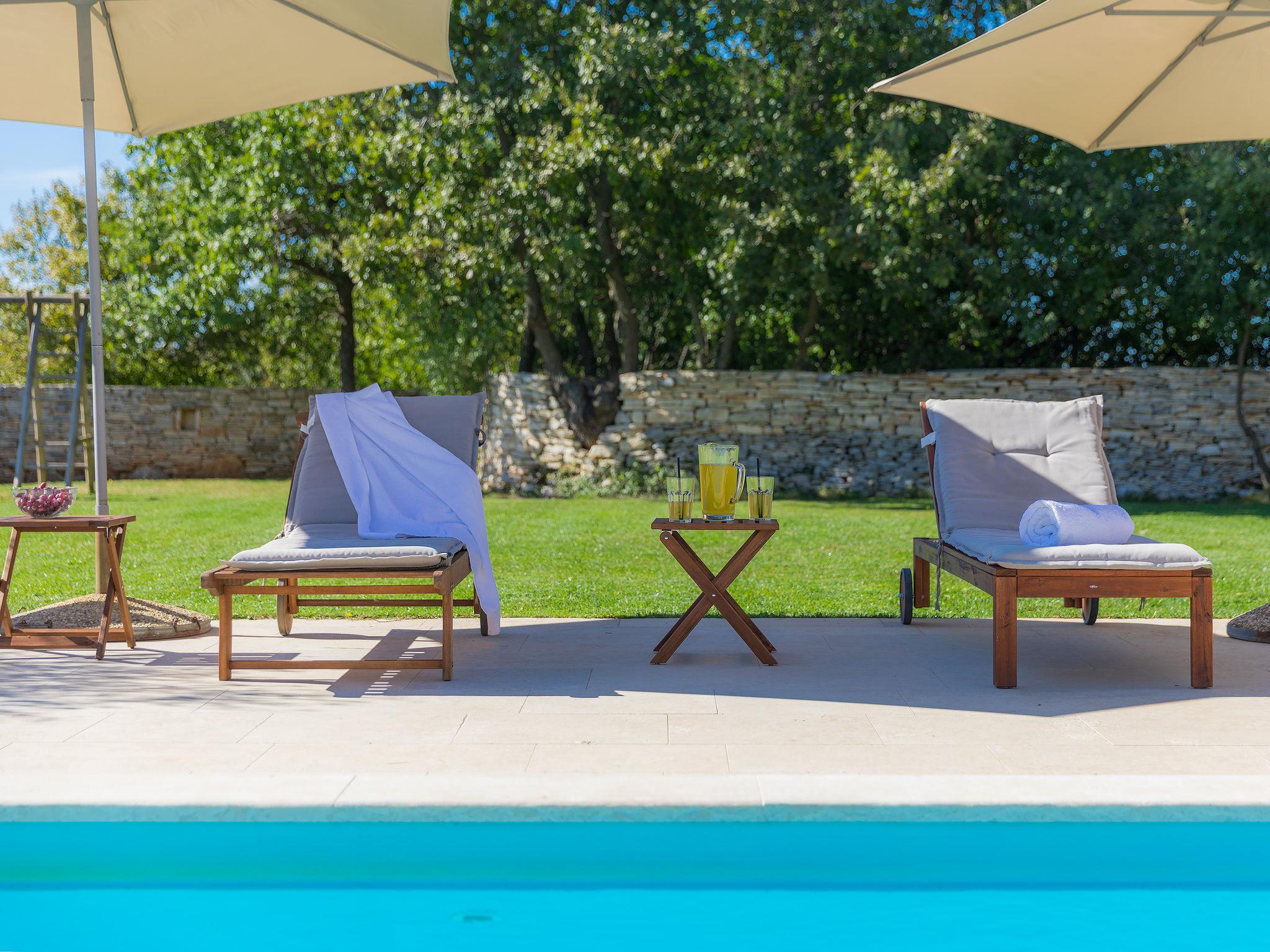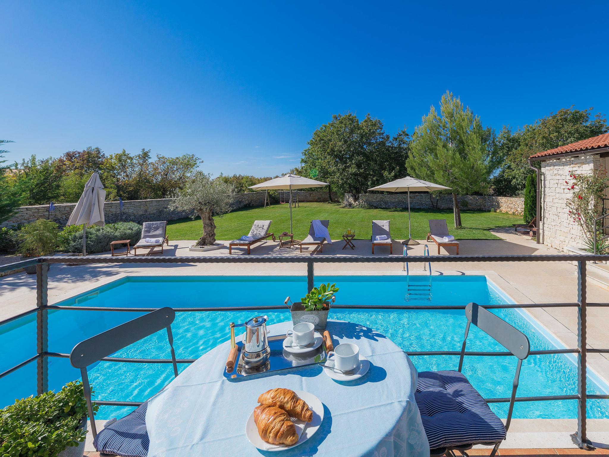 Cabrunici 8 km from Vodnjan: Beautiful villa "Histria 1", 2 storeys. 17 km from the centre of Pula, in a quiet, sunny position, 13 km from the sea. Private: property 1'800 m2 (fenced), swimming pool angular (4 x 8 m, depth 140 cm, seasonal availability: 27.Apr. - 01.Oct.). Outdoor shower, volleyball, terrace (50 m2), garden furniture, barbecue, children's playground (swing). In the house: internet access, washing machine. Parking at the house on the premises. Shop 1 km, supermarket 9 km, restaurant 500 m, bus stop 1.5 km, pebble beach 17 km, rocky beach 17 km. Walking paths from the house 1 km, cycle lane 1 km. The owner does not accept any youth groups.