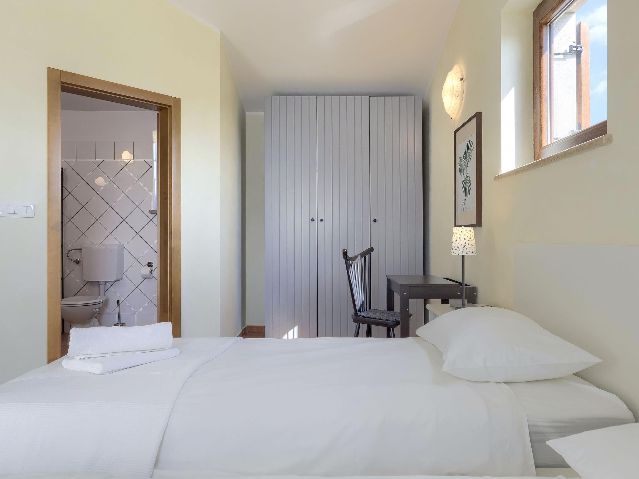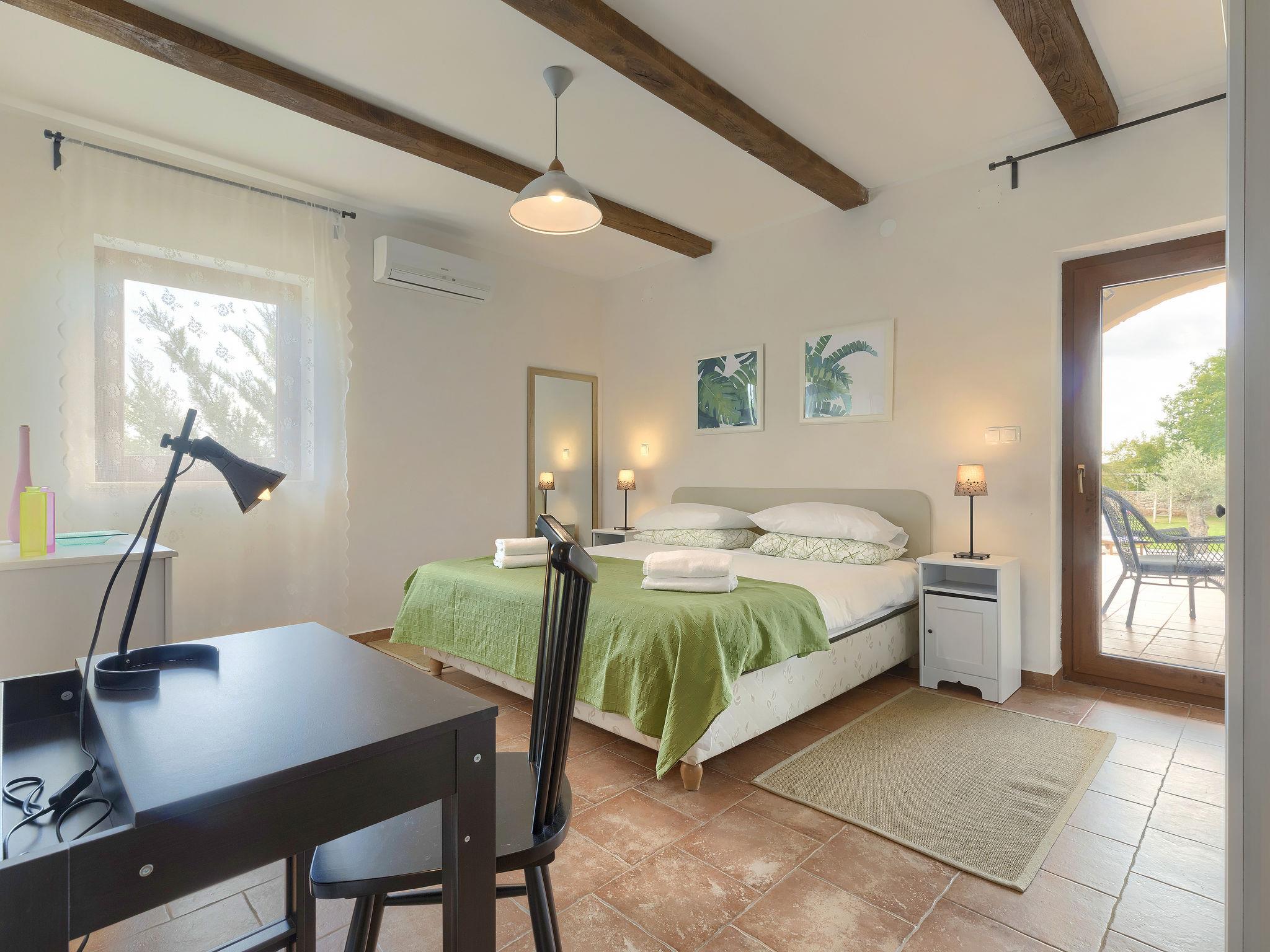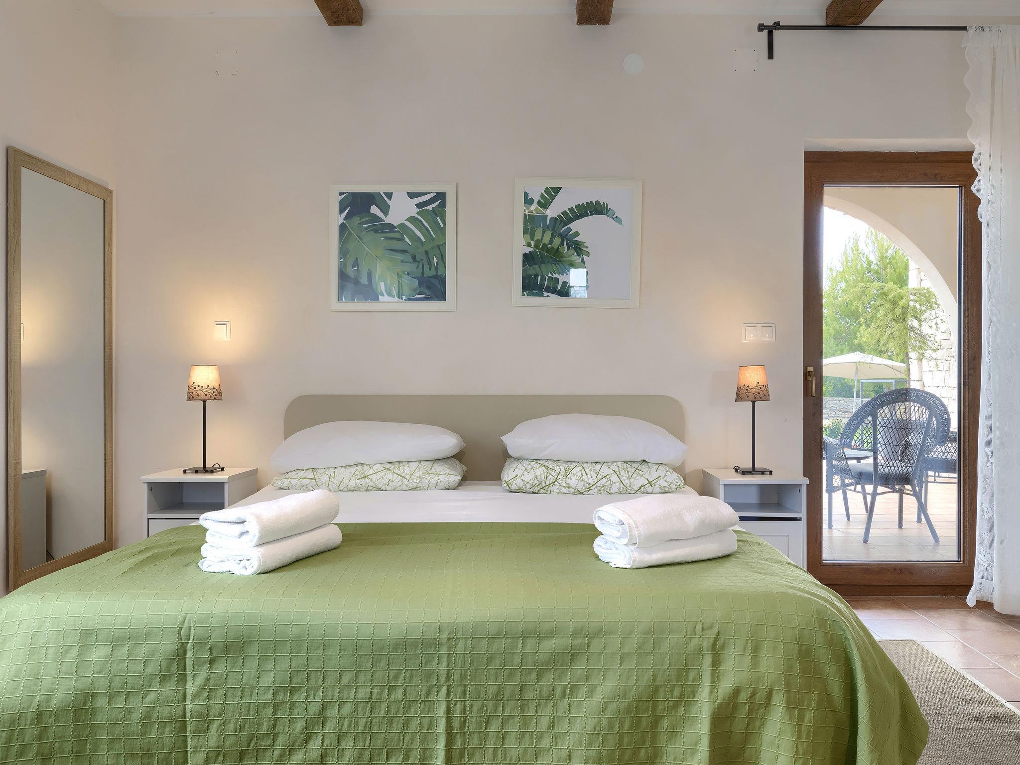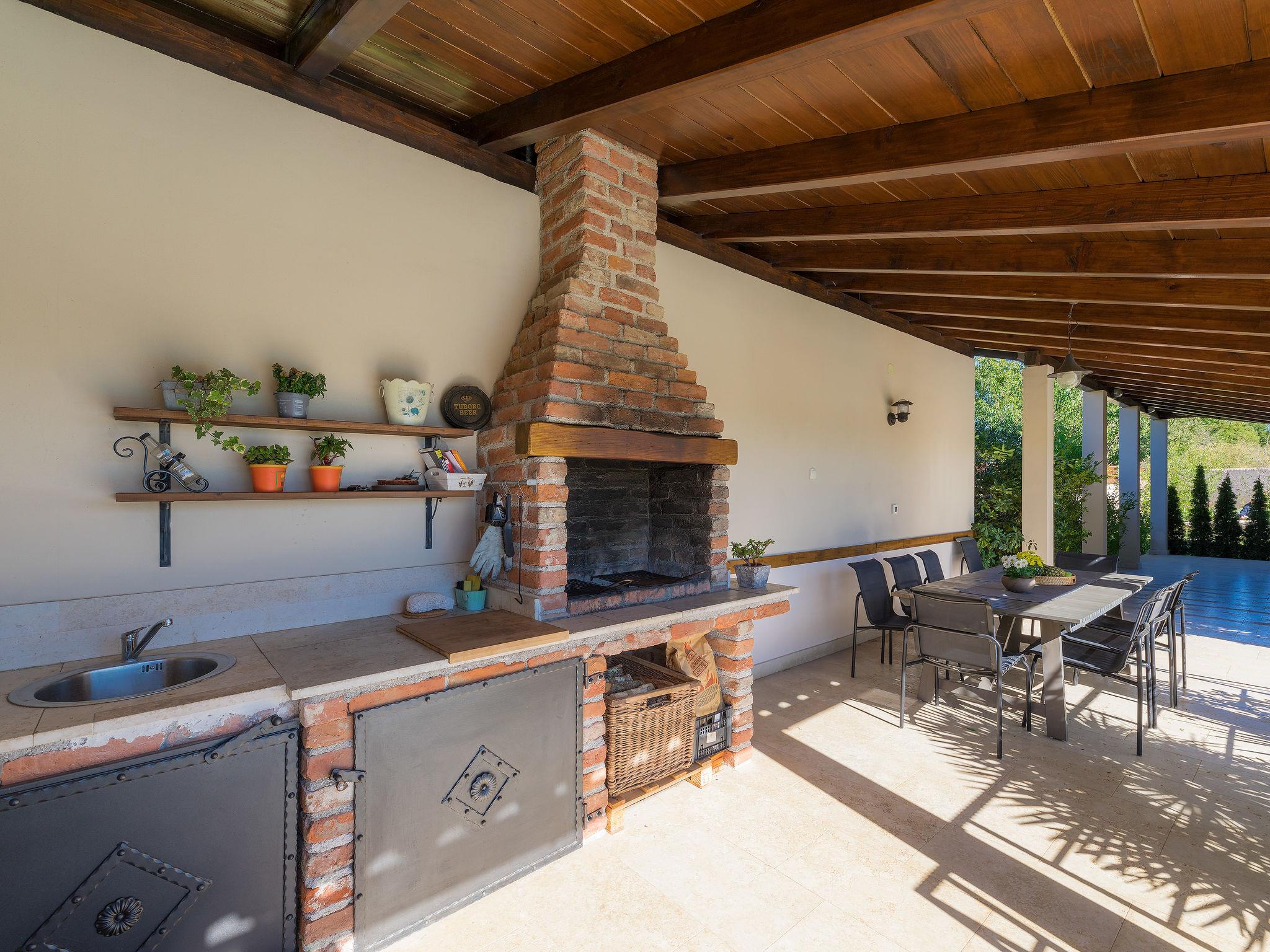 Cabrunici 8 km from Vodnjan: Beautiful villa "Histria 1", 2 storeys. 17 km from the centre of Pula, in a quiet, sunny position, 13 km from the sea. Private: property 1'800 m2 (fenced), swimming pool angular (4 x 8 m, depth 140 cm, seasonal availability: 27.Apr. - 01.Oct.). Outdoor shower, volleyball, terrace (50 m2), garden furniture, barbecue, children's playground (swing). In the house: internet access, washing machine. Parking at the house on the premises. Shop 1 km, supermarket 9 km, restaurant 500 m, bus stop 1.5 km, pebble beach 17 km, rocky beach 17 km. Walking paths from the house 1 km, cycle lane 1 km. The owner does not accept any youth groups.