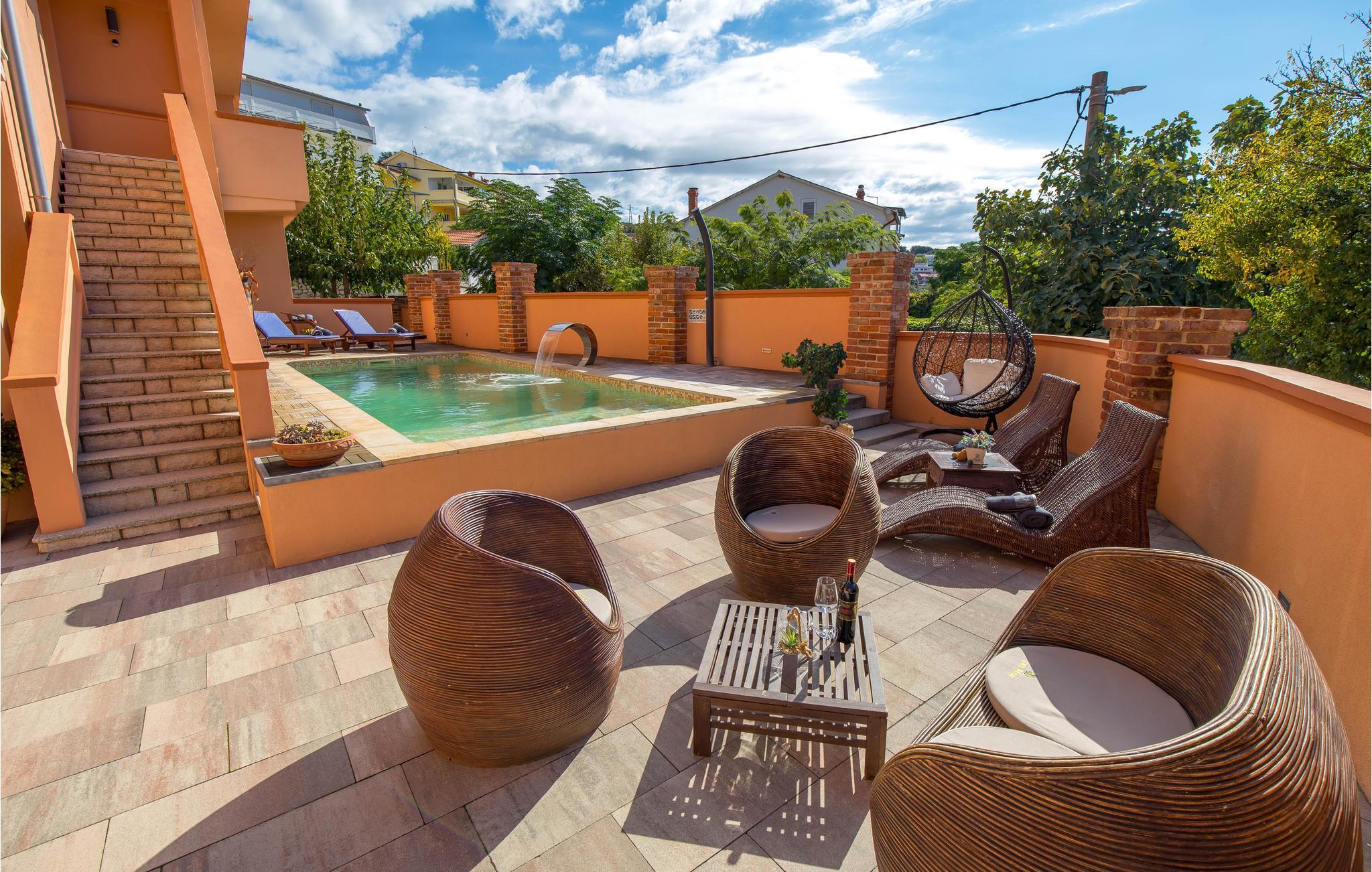 Leilighetene er romslige, komfortable og velutstyrte, og består av to etasjer. Det er en felles overbygd terrasse med en felles grill hvor du kan tilberede dine favorittretter og ta del i det kroatiske livet. For gjester som liker å være aktive, er det et felles aktivitetsrom i første etasje, i en separat del av huset. Her finner du sykkel, tredemølle, bordtennis og biljard. For de som ønsker å slappe av, finnes det en velværeavdeling med boblebad og finsk badstue mot en avgift. Terrassene til leiligheten er orientert mot sjøen og inviterer deg til å slappe av i løpet av dagen eller om kvelden, slik at du kan nyte din første kaffe om morgenen eller solnedgangen.