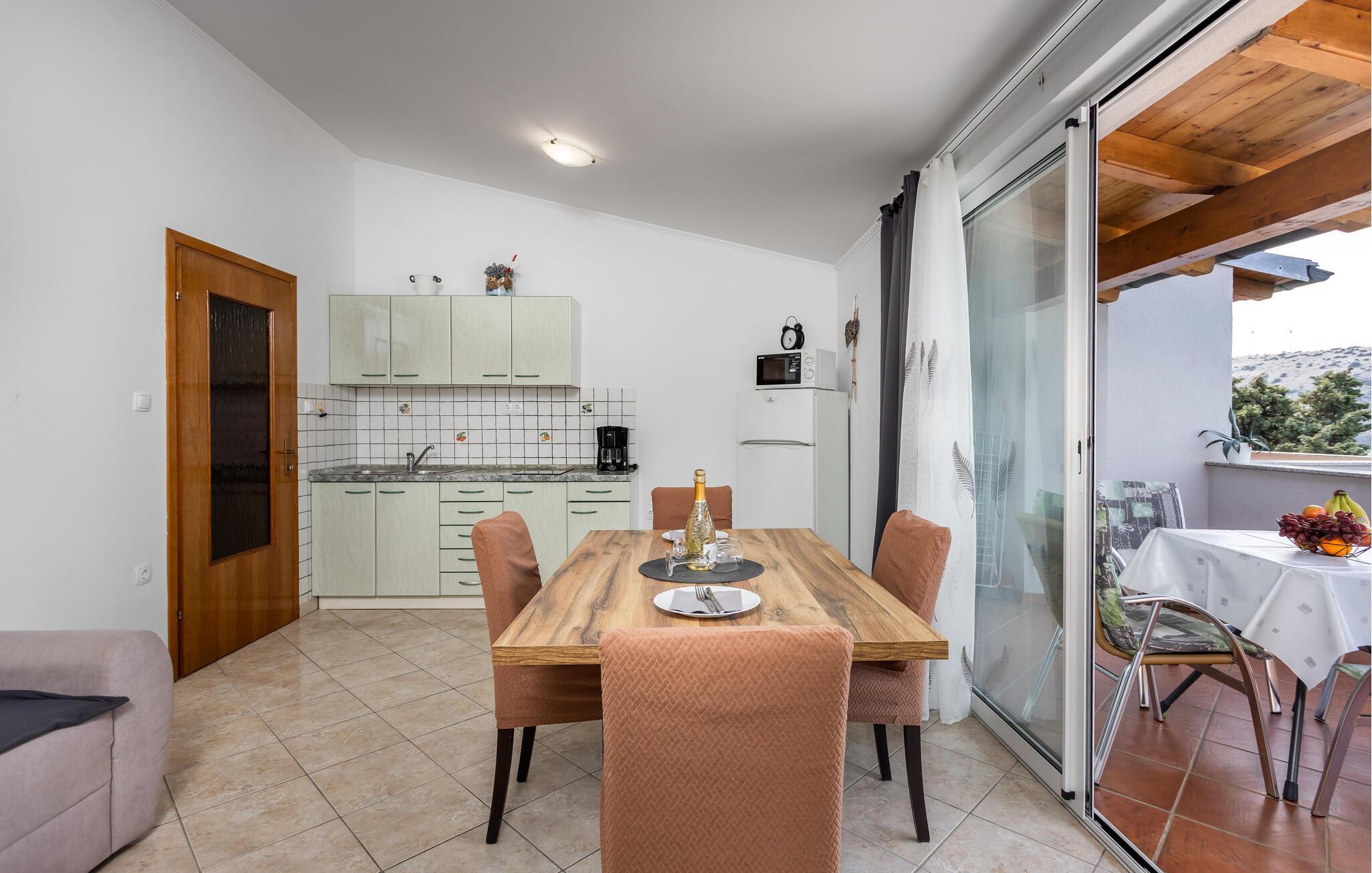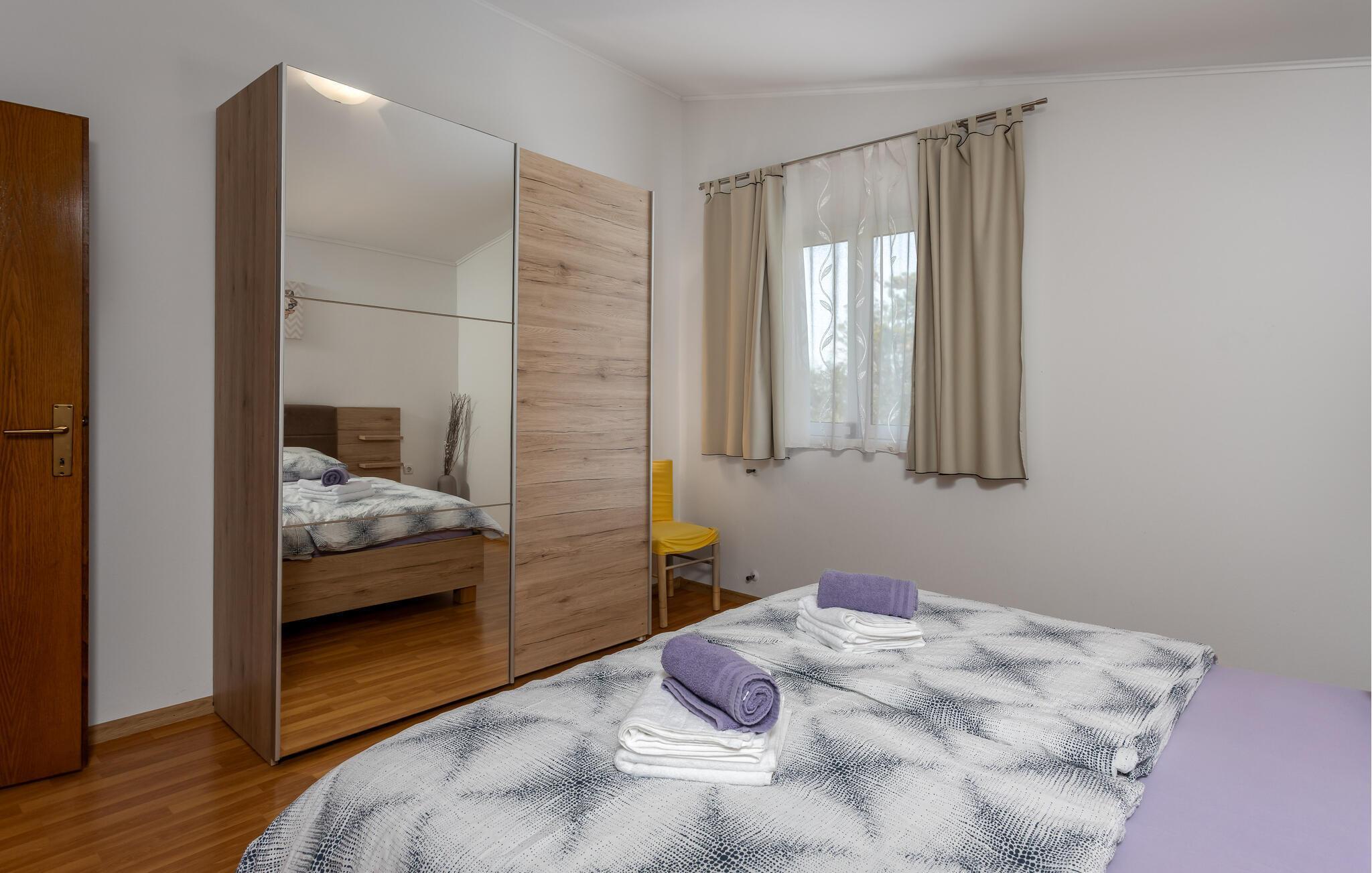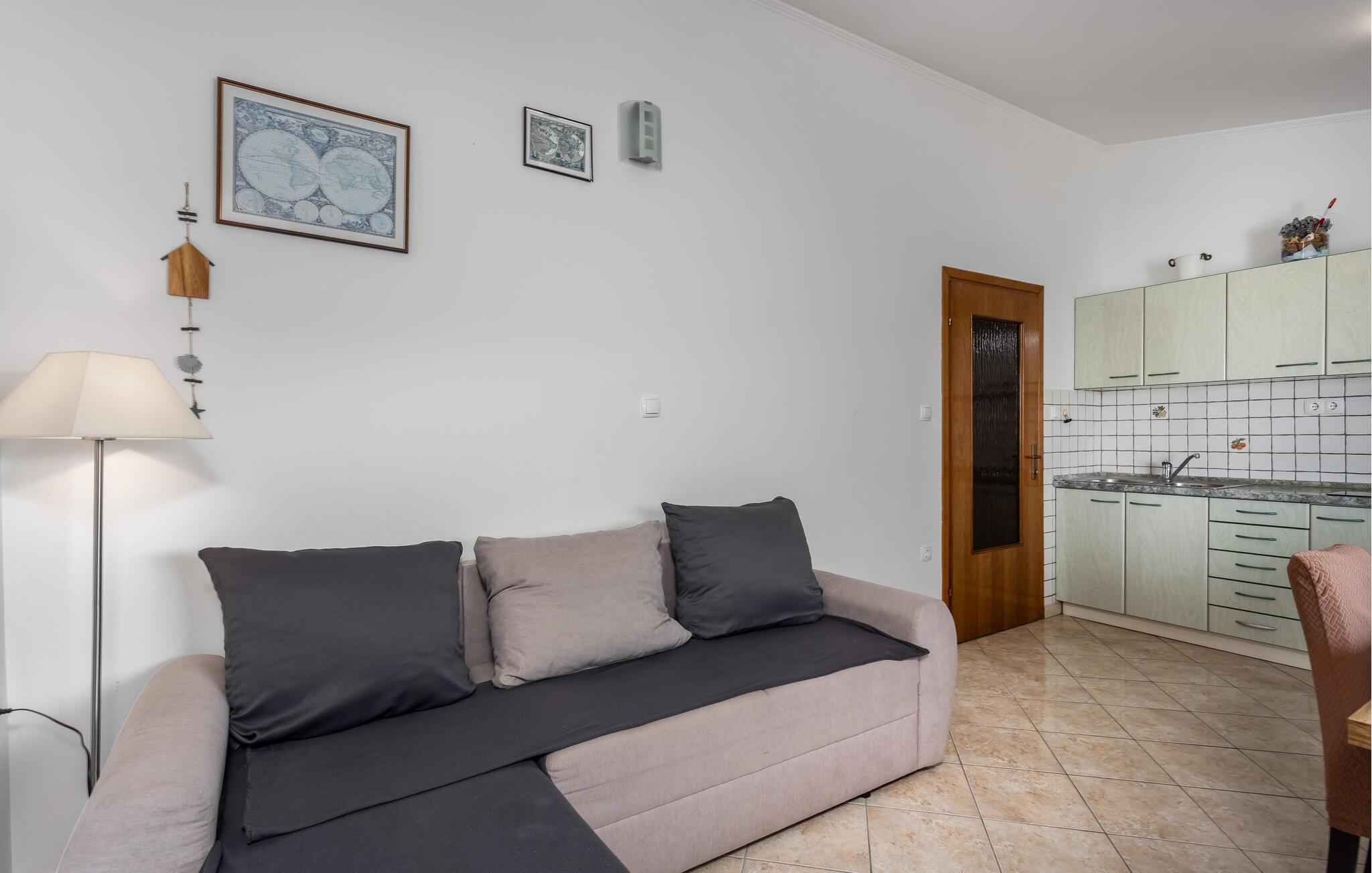 Denne velholdte ferieleiligheten inviterer deg til en avslappende ferie ved Adriaterhavskysten rett ved stranden. Tilbered måltidene dine på det åpne kjøkkenet og nyt dem i den stilfullt møblerte stuen. La den friske havbrisen strømme gjennom rommene, og sett deg godt til rette i den koselige sofaen om kvelden.