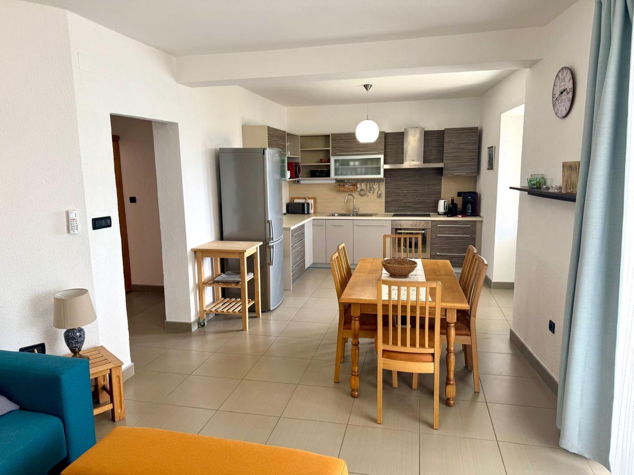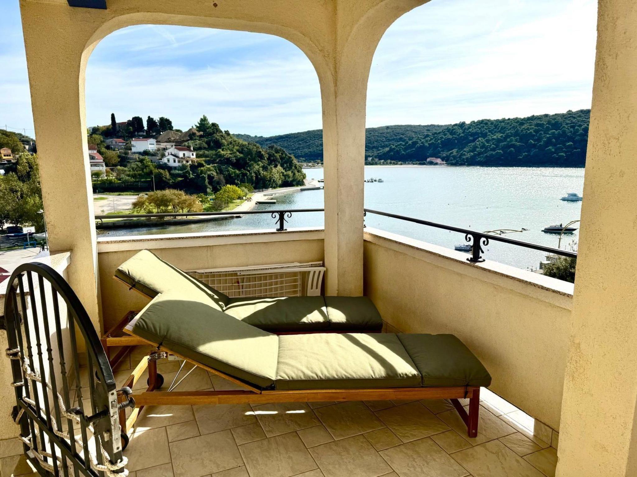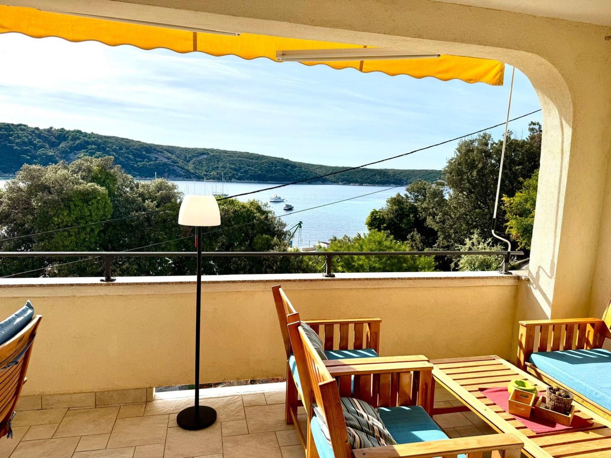 The living room and one of the bedrooms open onto the private, generous, sunny terrace, furnished with a table and chairs. From here you can enjoy an extensive panoramic view over the wide bay and the blue sea.