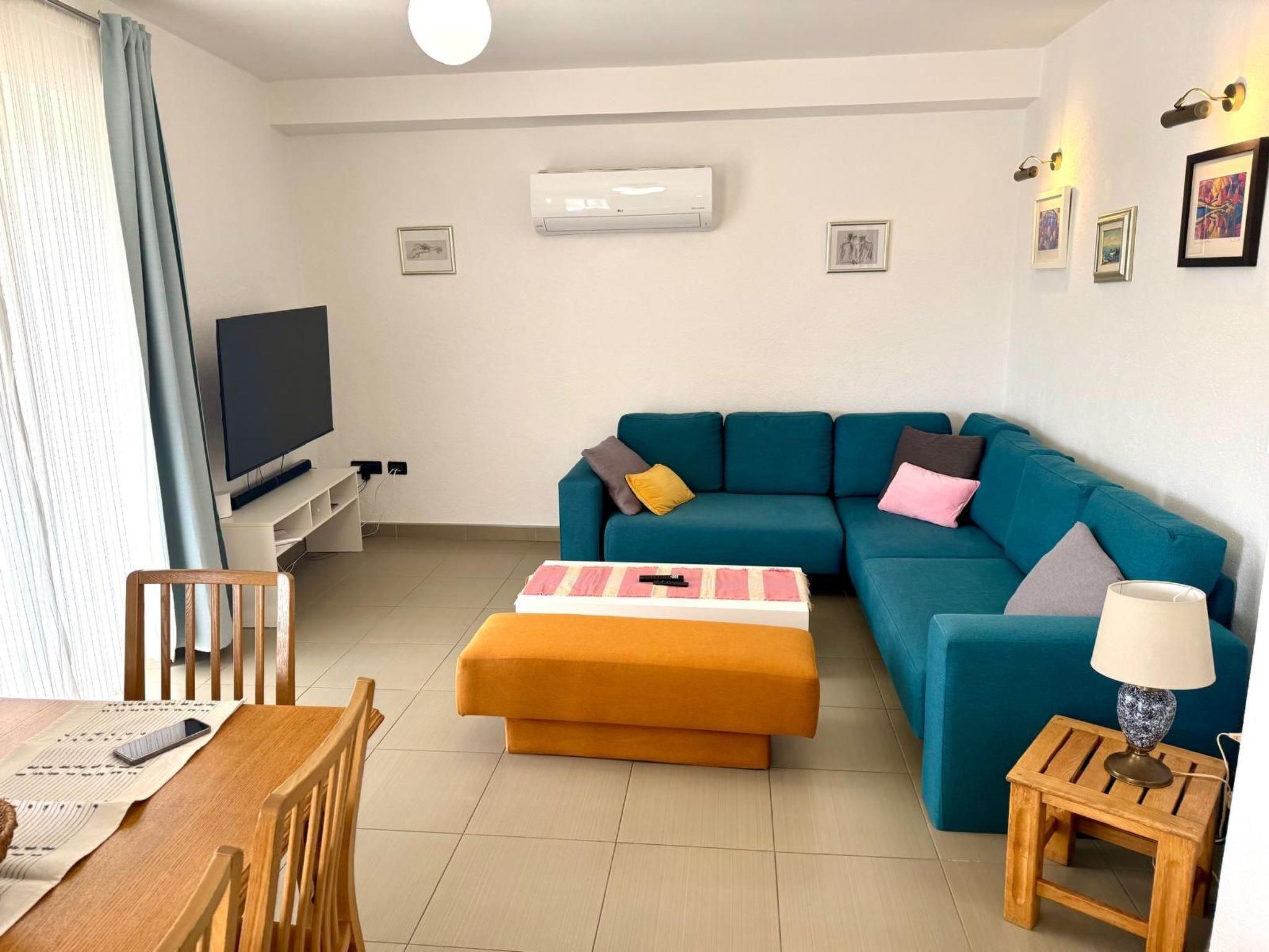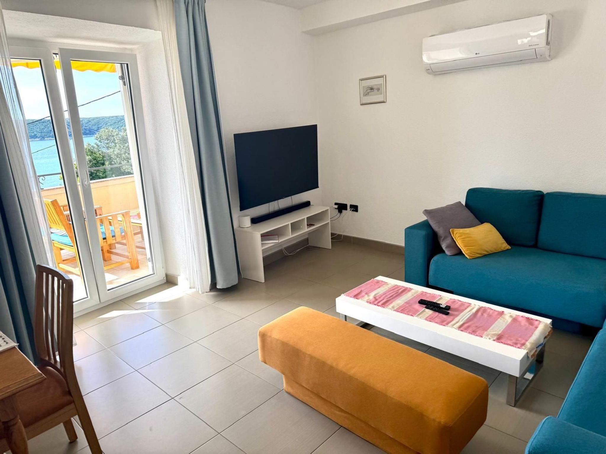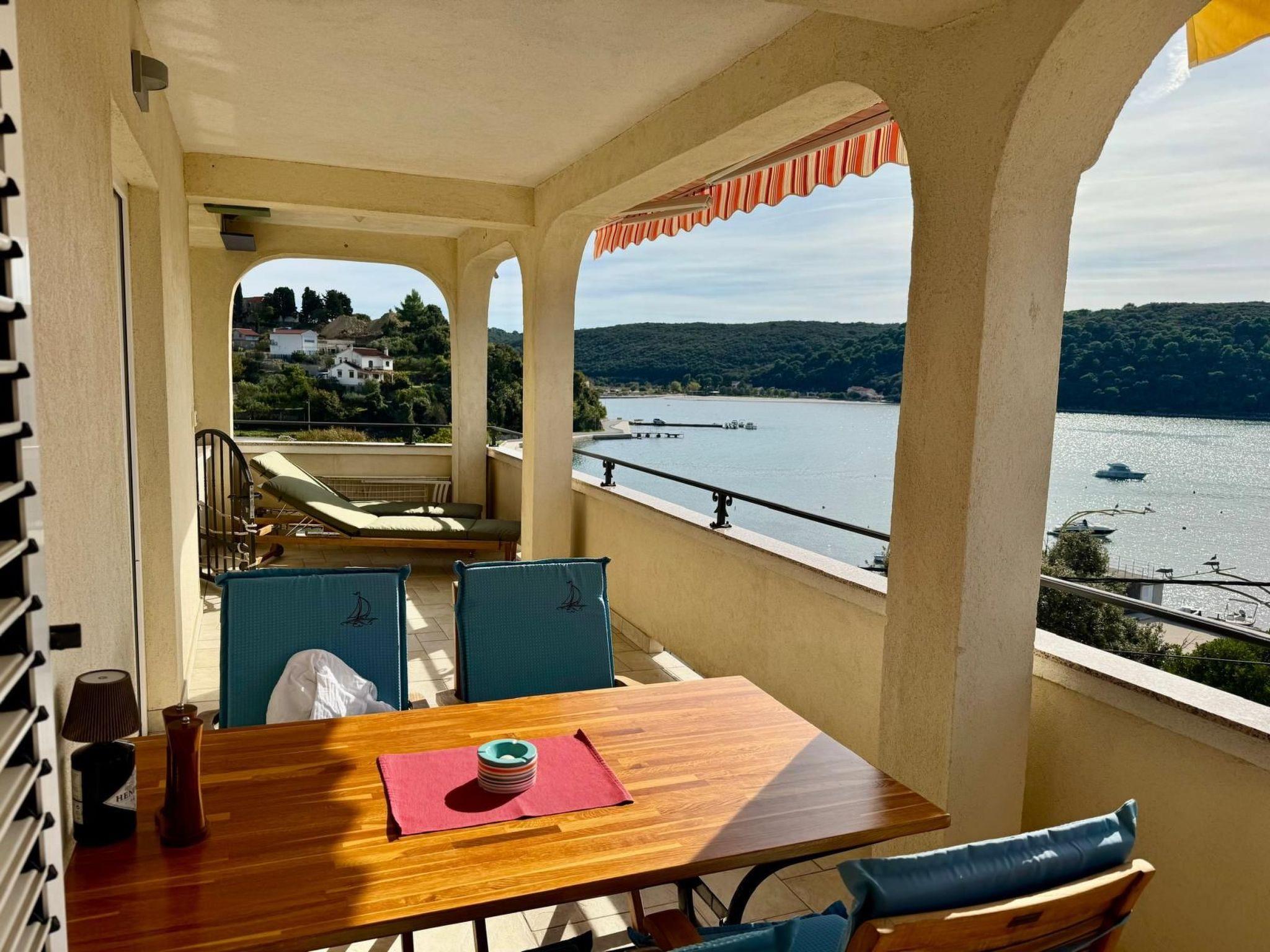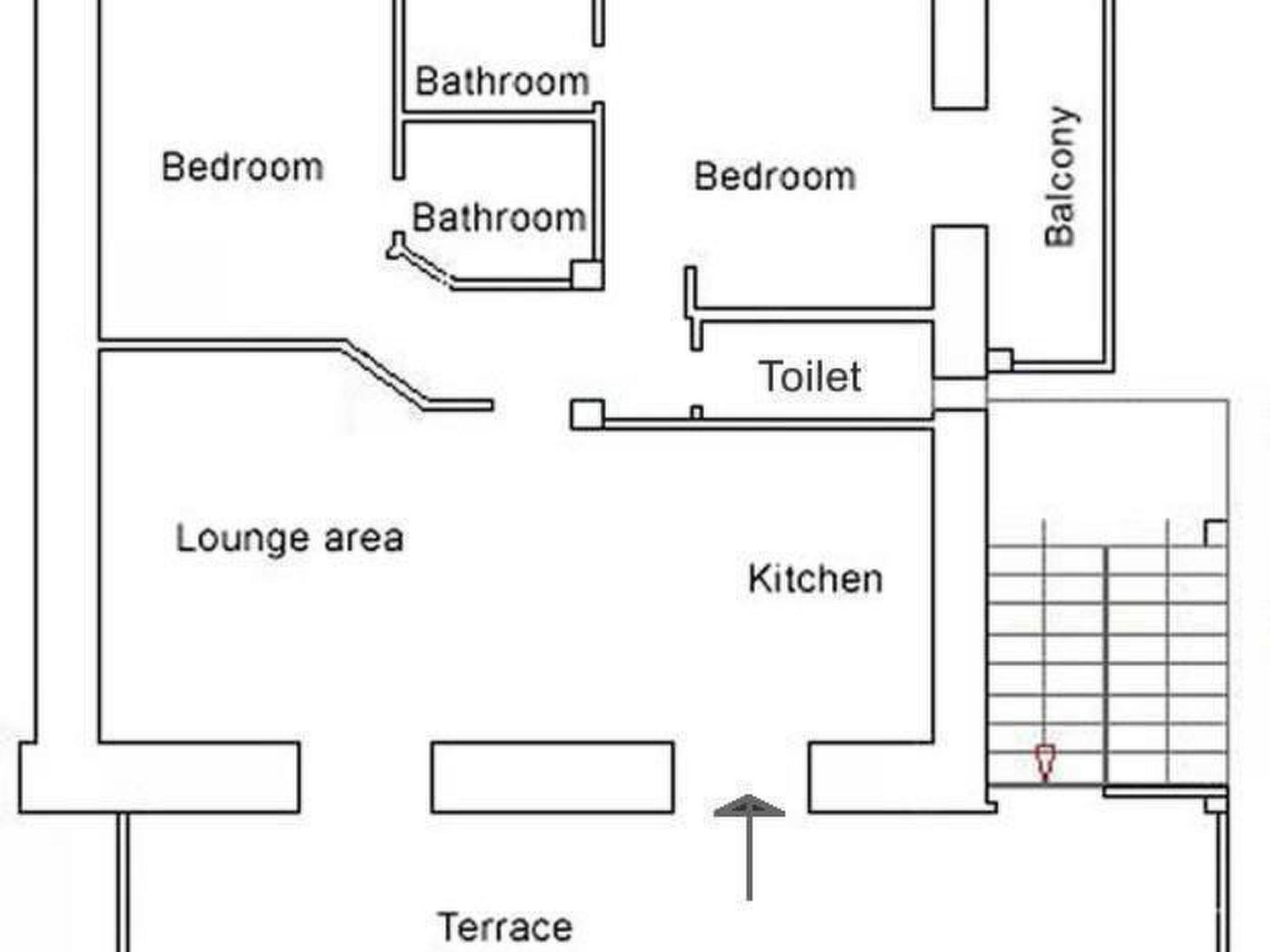 The living room and one of the bedrooms open onto the private, generous, sunny terrace, furnished with a table and chairs. From here you can enjoy an extensive panoramic view over the wide bay and the blue sea.
