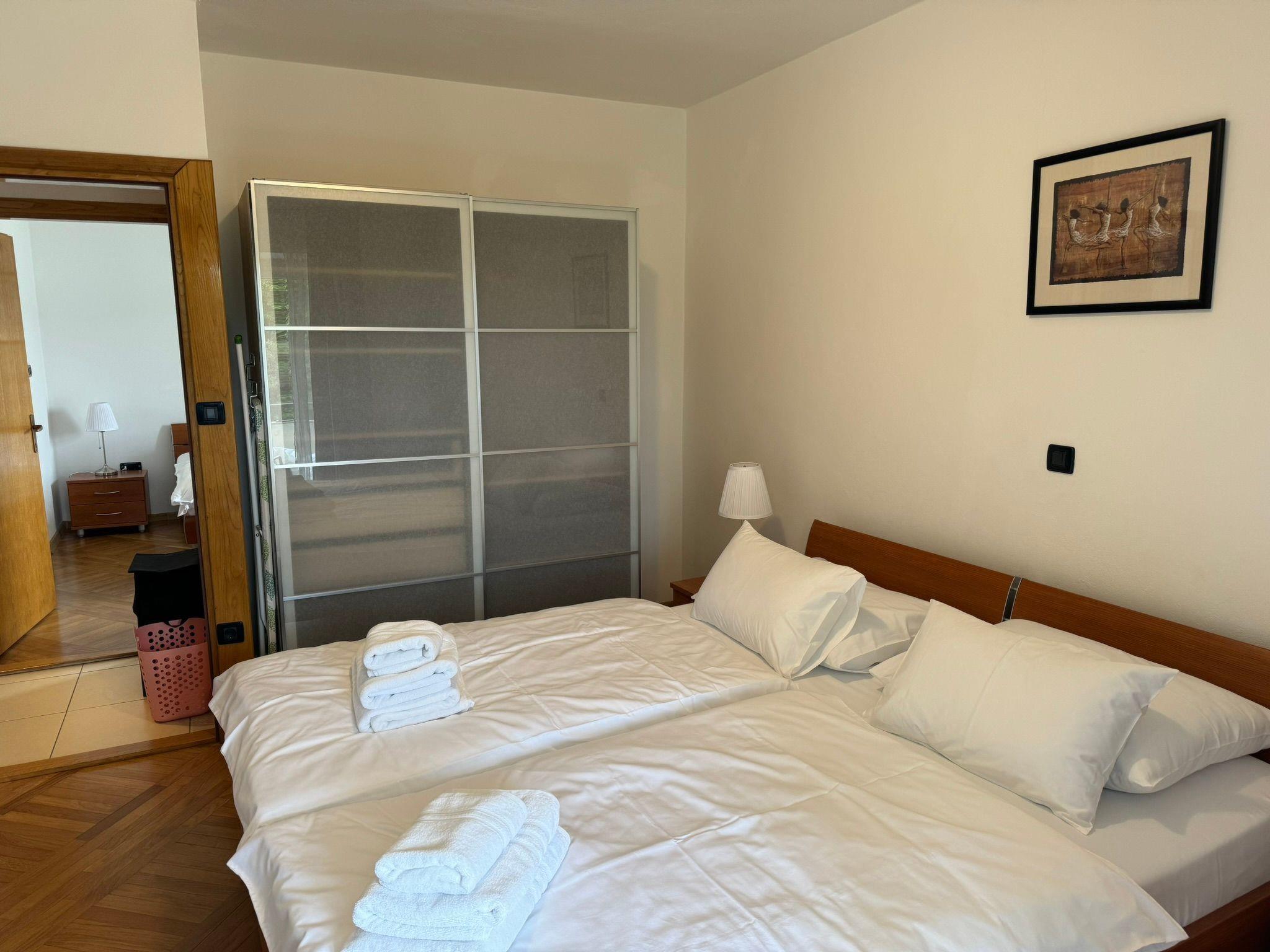The 80 m² holiday apartment on the first floor consists of a living and dining area with an integrated, open-plan kitchen, two bedrooms, and two modern bathrooms. The air-conditioned (heating and cooling) living area is furnished with two comfortable sofas, a wall-mounted flat-screen TV with satellite reception and a USB port, a stereo system, a safe for your valuables, and a dining table with chairs. The modern, open-plan fitted kitchen is equipped with a dishwasher, a ceramic hob with an elegant stainless steel extractor hood, an oven, a refrigerator with a freezer compartment, a microwave, an electric kettle, and a coffee machine. Both bedrooms each have a 180 cm x 200 cm double bed, bedside tables with reading lamps, and wardrobes with plenty of storage space for your clothes and luggage. Furthermore, one of the sofas in the living area can be converted into an additional 120 cm x 180 cm bed for one more person. The two bathrooms are each equipped with a spacious shower cubicle, a vanity unit with a vanity unit and a wall mirror, and a toilet. A washing machine and a baby cot are available, sufficient bed linen and towels are provided, and reliable Wi-Fi internet access is also available free of charge in your holiday apartment.
