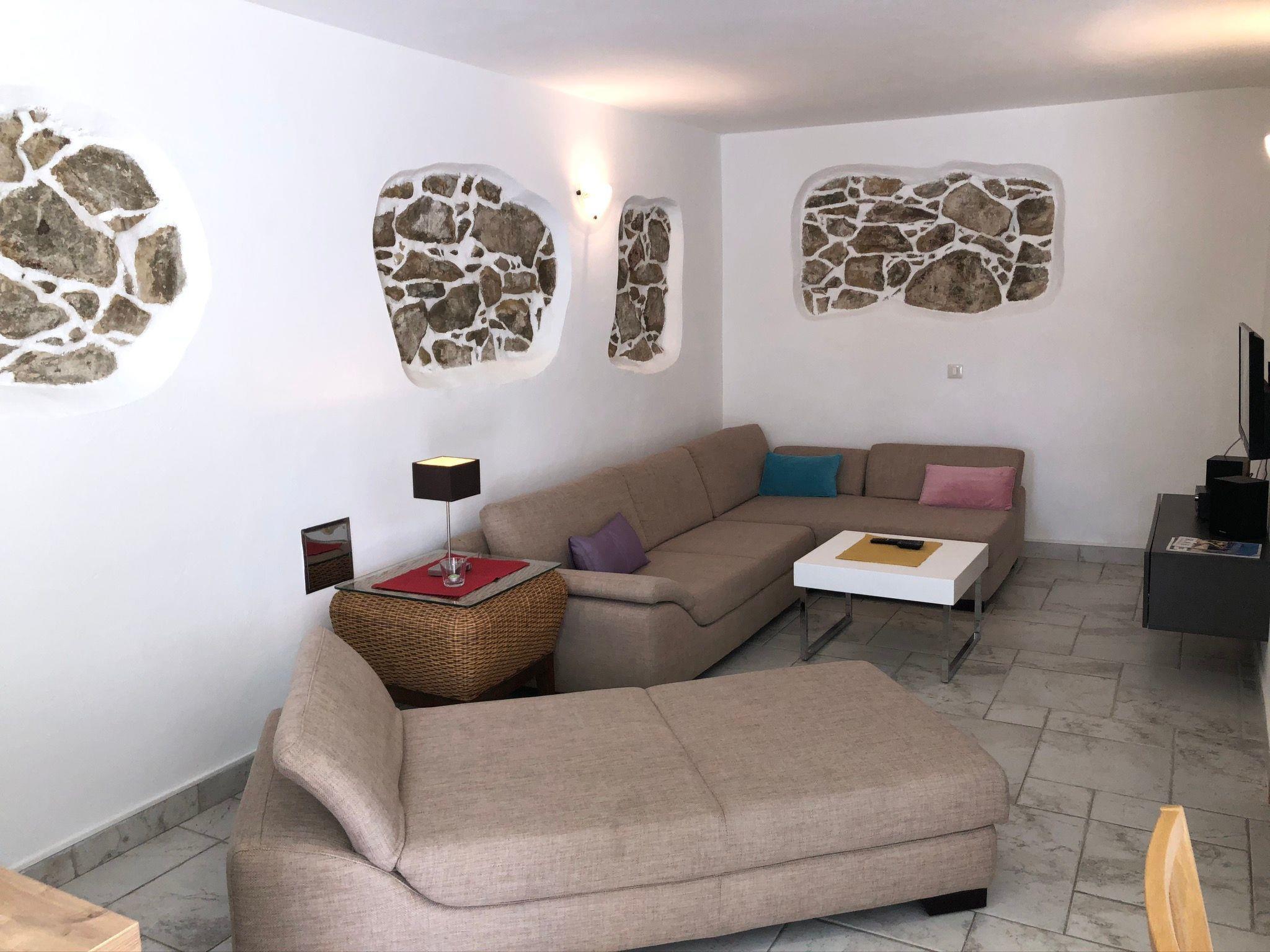 The living room opens onto your private sunny terrace with a table, chairs and comfortable lounge furniture. From here you can enjoy the extensive panoramic view over the wide bay and the blue sea.