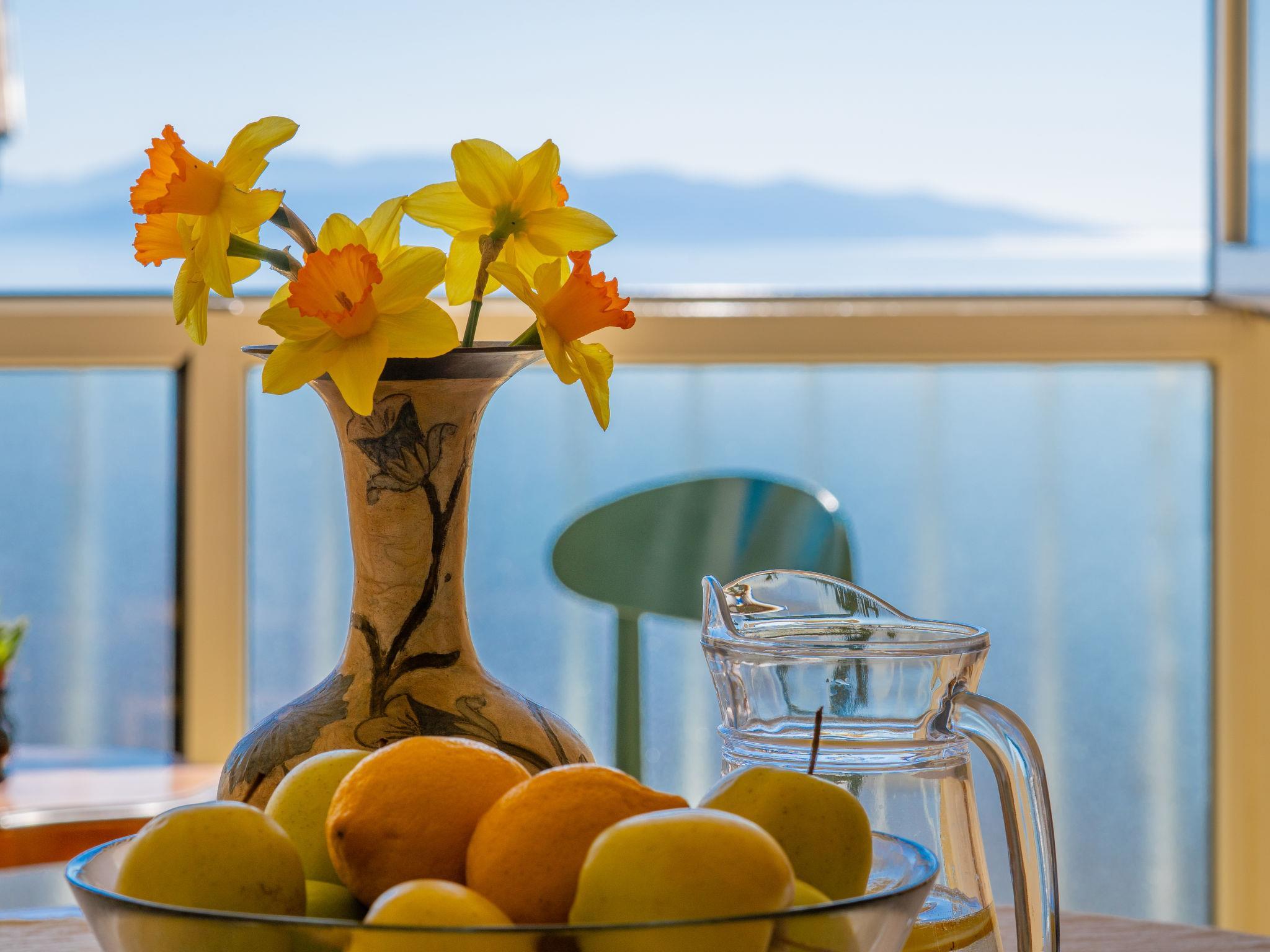 "Jana", 3-room apartment 60 m2 on 5th floor. Bright, partly renovated in 2024: living room with 1 sofabed (140 cm, length 200 cm), TV and air conditioning. 2 rooms, each room with 1 french bed (140 cm, length 200 cm). Kitchen (oven, dishwasher, 4 gas rings, toaster, kettle, freezer, electric coffee machine) with dining table. Bath/shower/WC. Forced-air heating. Panoramic view of the sea. Facilities: Internet (WiFi, free). Please note: non-smoking house. 1 small pet/ dog allowed.