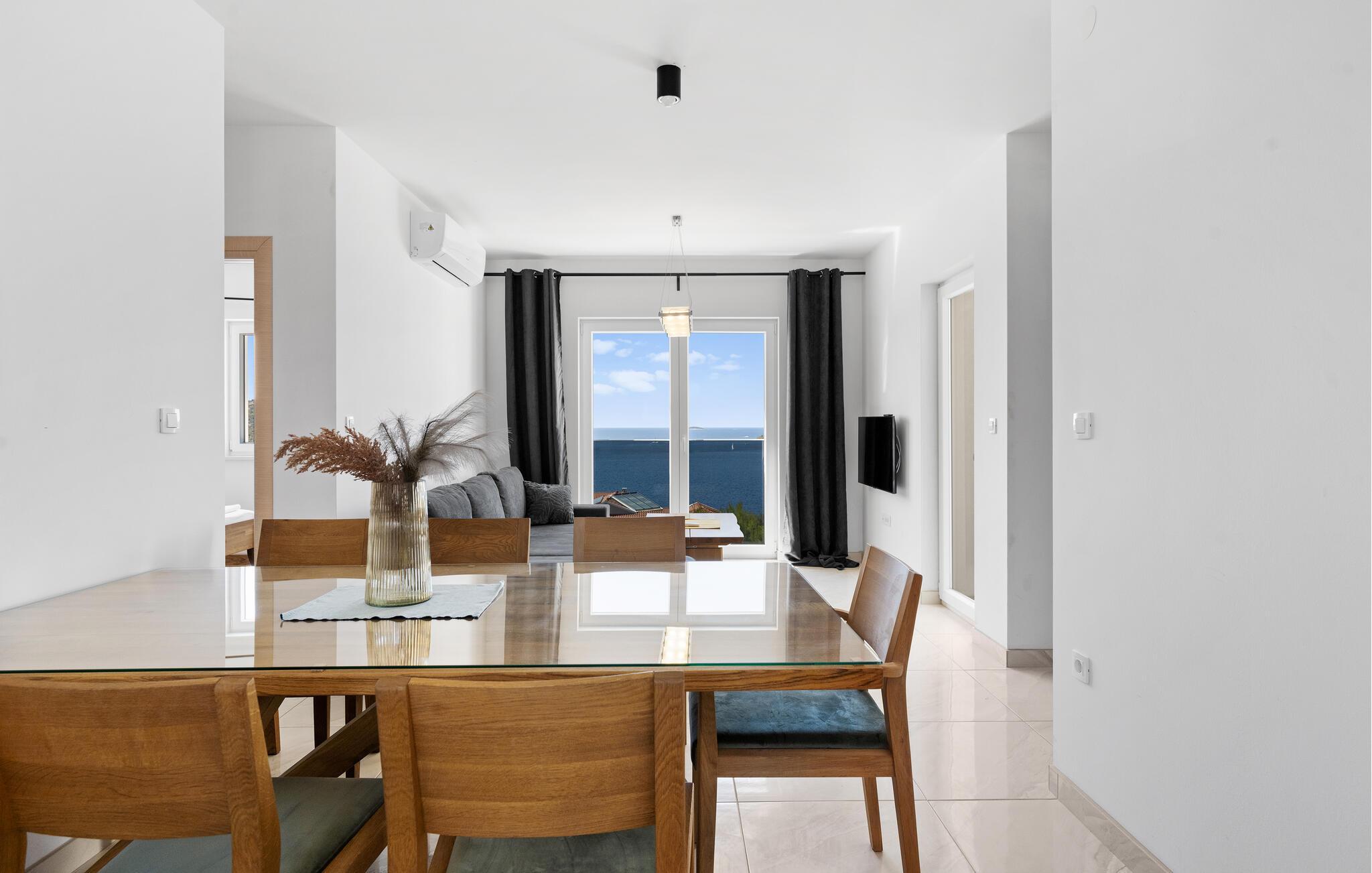 De lyse rommene med store vinduer skaper en åpen og rolig atmosfære hvor du kan slappe av uten problemer. Elegant design, nøye utvalgte møbler og nærheten til sjøen gjør denne leiligheten til et tilfluktssted der du kan nyte ferien til det fulle, enten det er med musikk, film eller en kveld sammen på kjøkkenet.