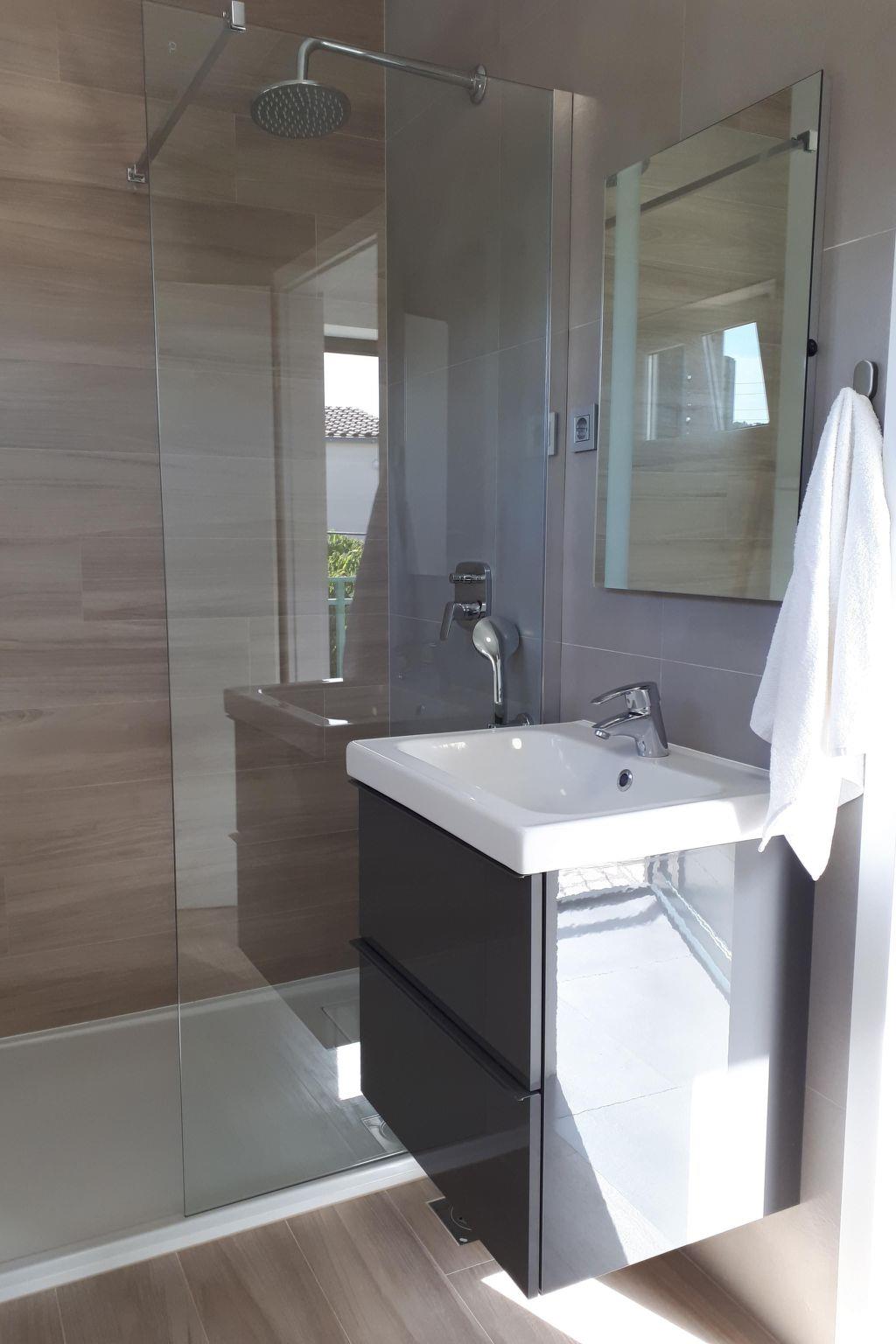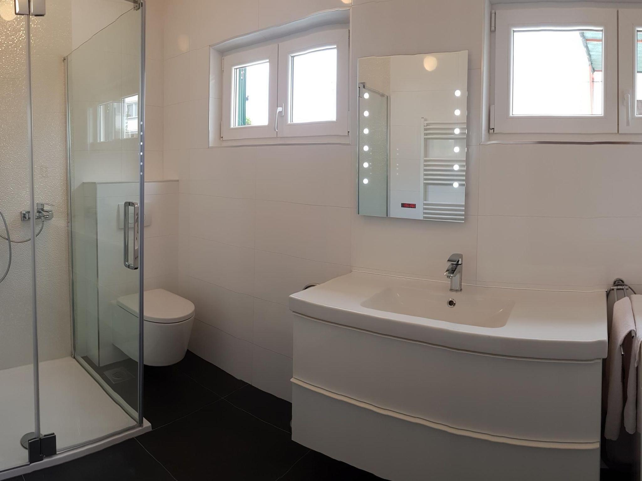 The detached holiday house provides a total living space of 130m² for eleven people. Both floors have their own entrance and each have air conditioning in the hallway. The 80m² ground floor has two bedrooms with double beds (160 x 200cm) and a modern bathroom with a shower, WC and hairdryer. An iron and a washing machine are also available. The living room has a double sofa bed (90 x 180cm). Free wireless Internet access and satellite TV are provided. The kitchen has a big dining space and is equipped with a stove (gas, ceramic and electric rings), an oven, fridge, microwave, dishwasher, coffee machine and kettle. The 55m² upper floor has a bedroom with a two single bed (90 x 200cm) and a bedroom with a double bed (160 x 200cm). The upstairs bathroom also has a shower, WC and hairdryer. The living room has a double sofa bed (140 x 190cm). Upstairs also provides free wireless Internet access, satellite TV and an iron. The kitchen is equally equipped with a stove (gas, ceramic and electric rings), an oven, fridge, microwave, dishwasher, coffee machine and kettle.