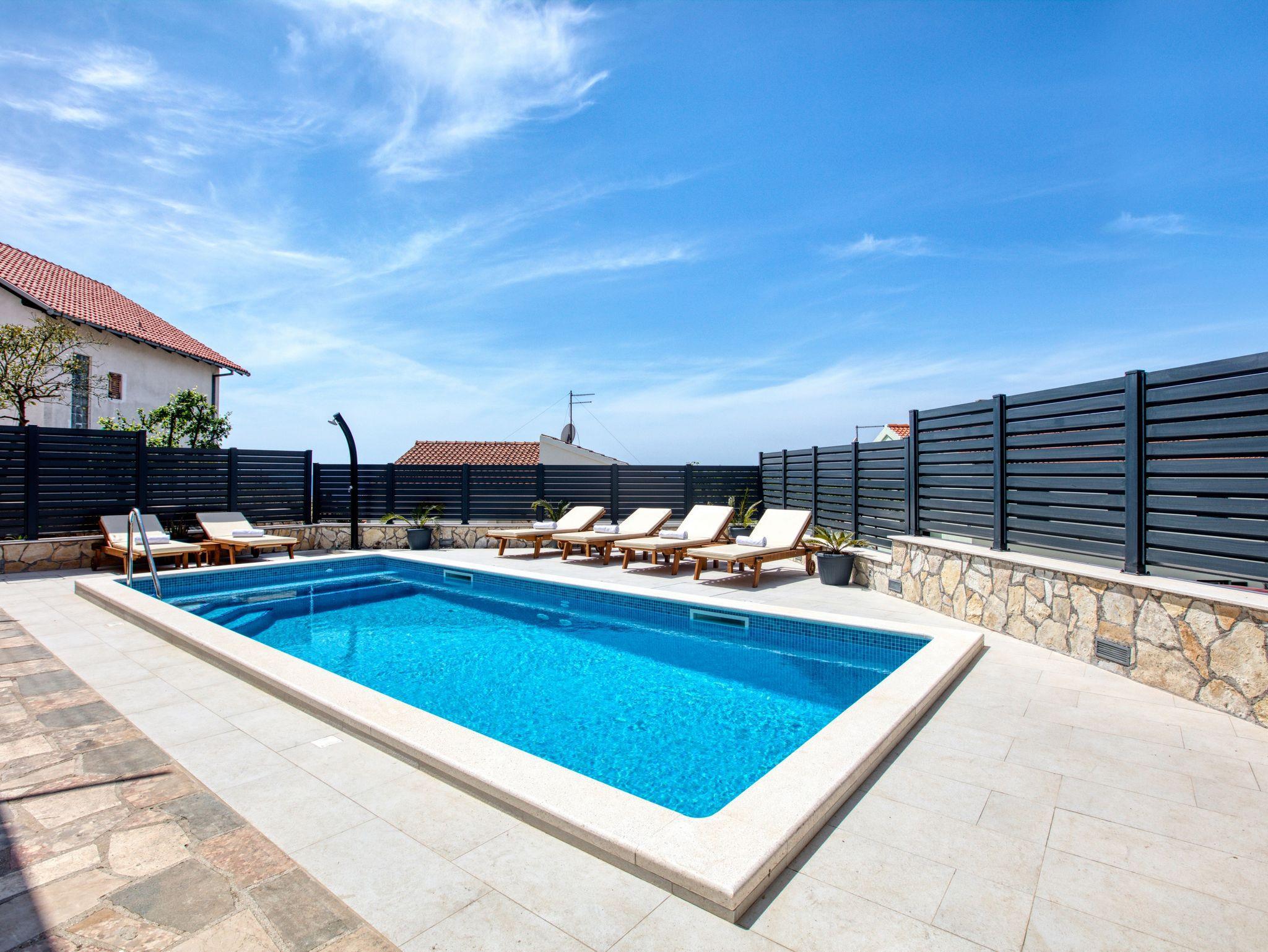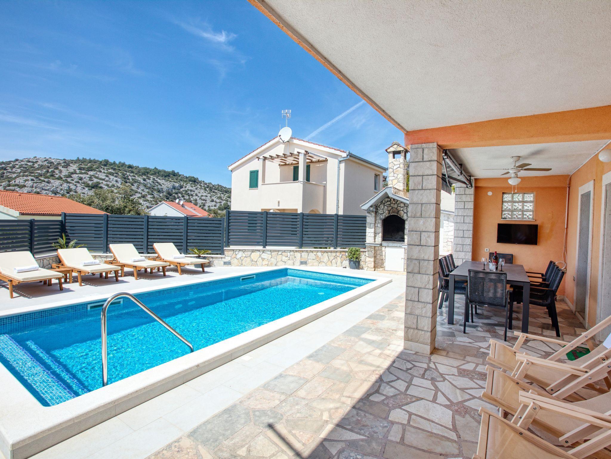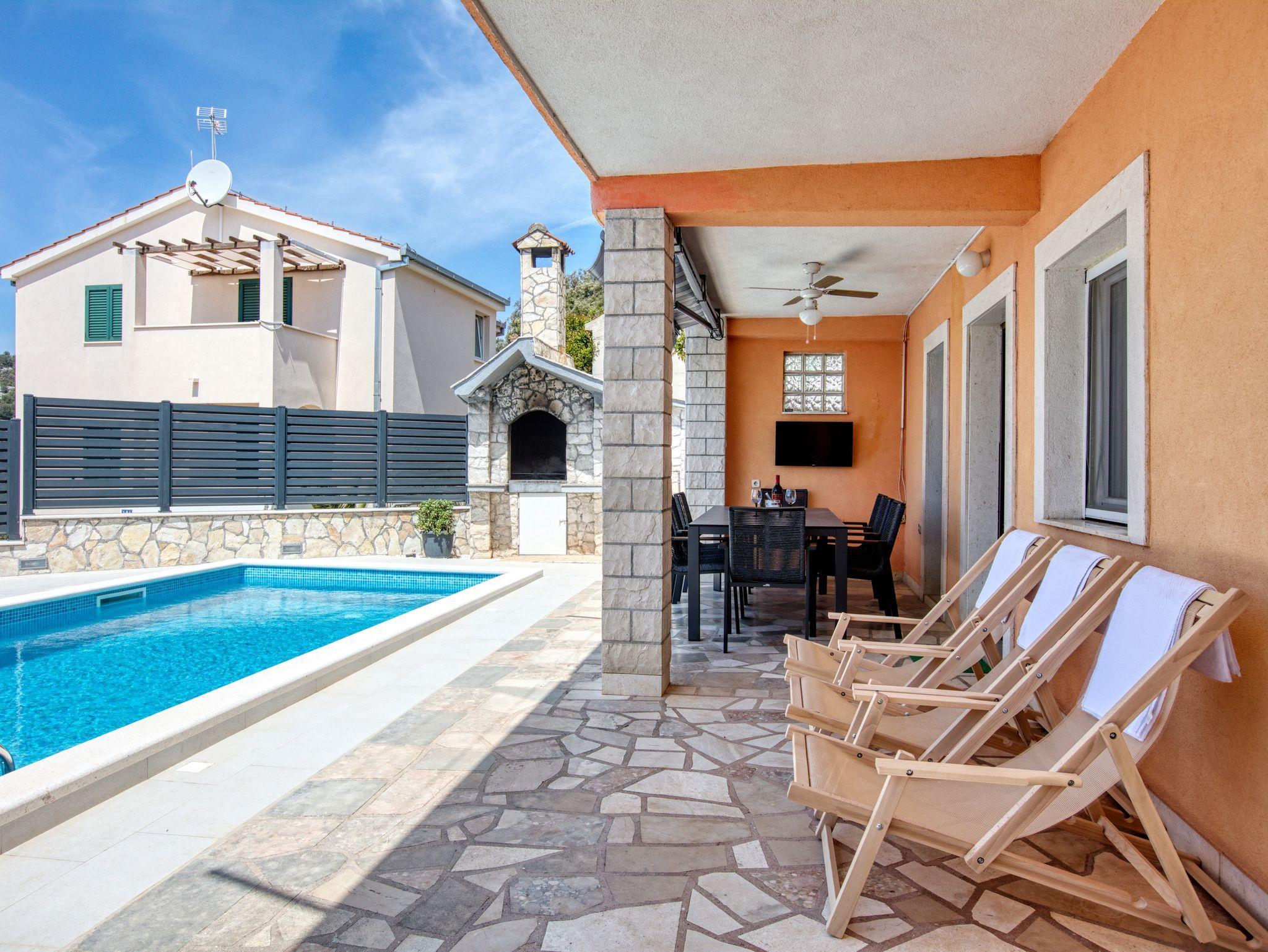 Haus bietet Platz für 10 Gäste. Die Betten sind in Schlafzimmern, die es 4 gibt, und in Wohnzimmer, innerhalb einer Gesamtfläche von 122m2, angeordnet. Die Gäste haben eine eigene Terrasse zur Verfügung, auf der sie in warmen Sommernächten genießen können. Das Haus bietet Meerblick. Für vollen Genuss und Entspannung gibt es einen privaten Grill für Gäste dieser Unterkunft. Während ihres Aufenthalts können sich Gäste im privaten Schwimmbad entspannen. IM PREIS INBEGRIFFEN: Kurtaxe, Endreinigung, Klimatisierung, Pool, Parkplatz, Internet, Kinderbett, Bügeleisen, Bügelbrett, Föhn, Sonnenschirm, Liegestühle. UNVERBINDLICHE ZUSÄTZLICHE KOSTEN: Bootsanlegeplatz (20,00 € pro Nacht). Die Verfügbarkeit zusätzlicher Dienstleistungen in Ihrem reservierten Termin und die Preise derselben (falls nicht aufgeführt) müssen im Voraus überprüft werden. Zusätzliche Dienstleistungen die in der Zahlungsaufforderung nicht aufgeführt sind werden direkt beim Vermieter bezahlt, angenommen der Gast nutzt auch diese. Ermäßigung auf den Grundpreis: Gratistag 14=13 (bei einem Aufenthalt von 14 Tagen oder mehr erhalten Sie einen Gratistag für den Aufenthalt bis 31.12.26).
