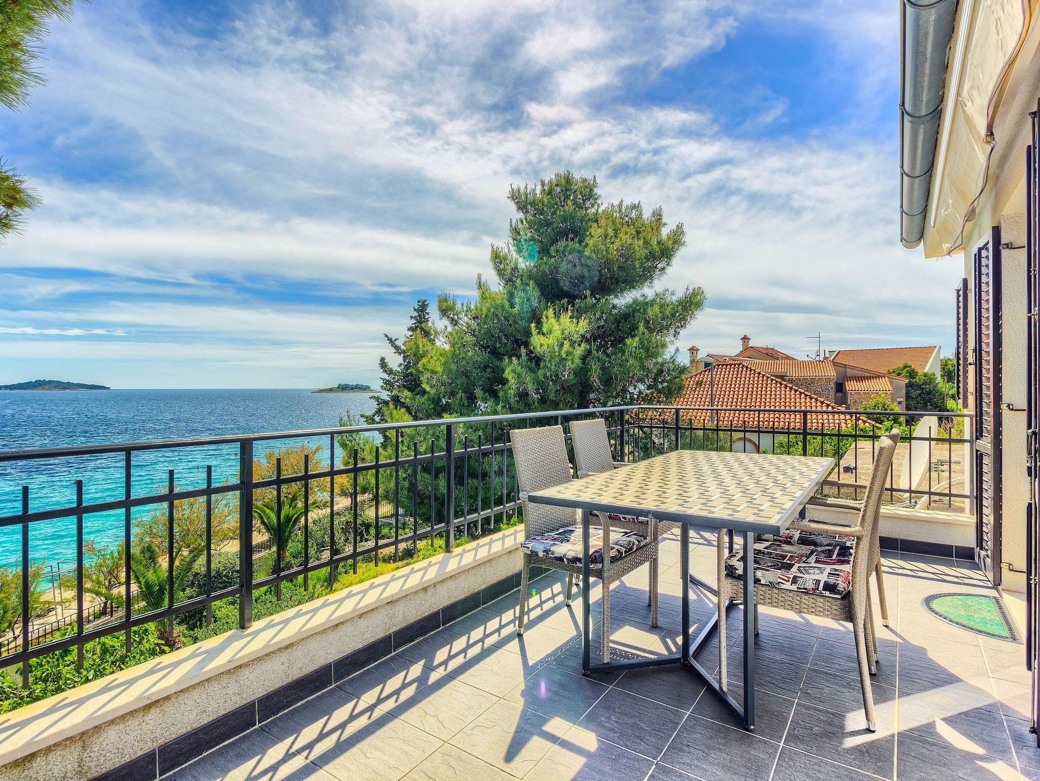 Ferienwohnung bietet Platz für 6 Gäste. Die Betten sind in Schlafzimmern, die es 2 gibt, und in Wohnzimmer, innerhalb einer Gesamtfläche von 45m2, angeordnet. Die Gäste haben eine eigene Terrasse zur Verfügung, auf der sie in warmen Sommernächten genießen können. Das Apartment bietet Meerblick. Es ist erlaubt, Speisen auf dem Gemeinschafts-Grill vorzubereiten. In der Unterkunftseinheit besteht die Möglichkeit des Mitbringens von Haustieren gegen Aufpreis. IM PREIS INBEGRIFFEN: Kurtaxe, Endreinigung, Klimatisierung, Parkplatz, Internet, Bootsanlegeplatz, Kinderbett, Bügeleisen, Bügelbrett, Föhn, tragbarer Grill, Sonnenschirm, Liegestühle. UNVERBINDLICHE ZUSÄTZLICHE KOSTEN: Haustiere (5,00 € pro Nacht). Die Verfügbarkeit zusätzlicher Dienstleistungen in Ihrem reservierten Termin und die Preise derselben (falls nicht aufgeführt) müssen im Voraus überprüft werden. Zusätzliche Dienstleistungen die in der Zahlungsaufforderung nicht aufgeführt sind werden direkt beim Vermieter bezahlt, angenommen der Gast nutzt auch diese. Ermäßigung auf den Grundpreis: Gratistag 14=13 (bei einem Aufenthalt von 14 Tagen oder mehr erhalten Sie einen Gratistag für den Aufenthalt bis 31.12.26).