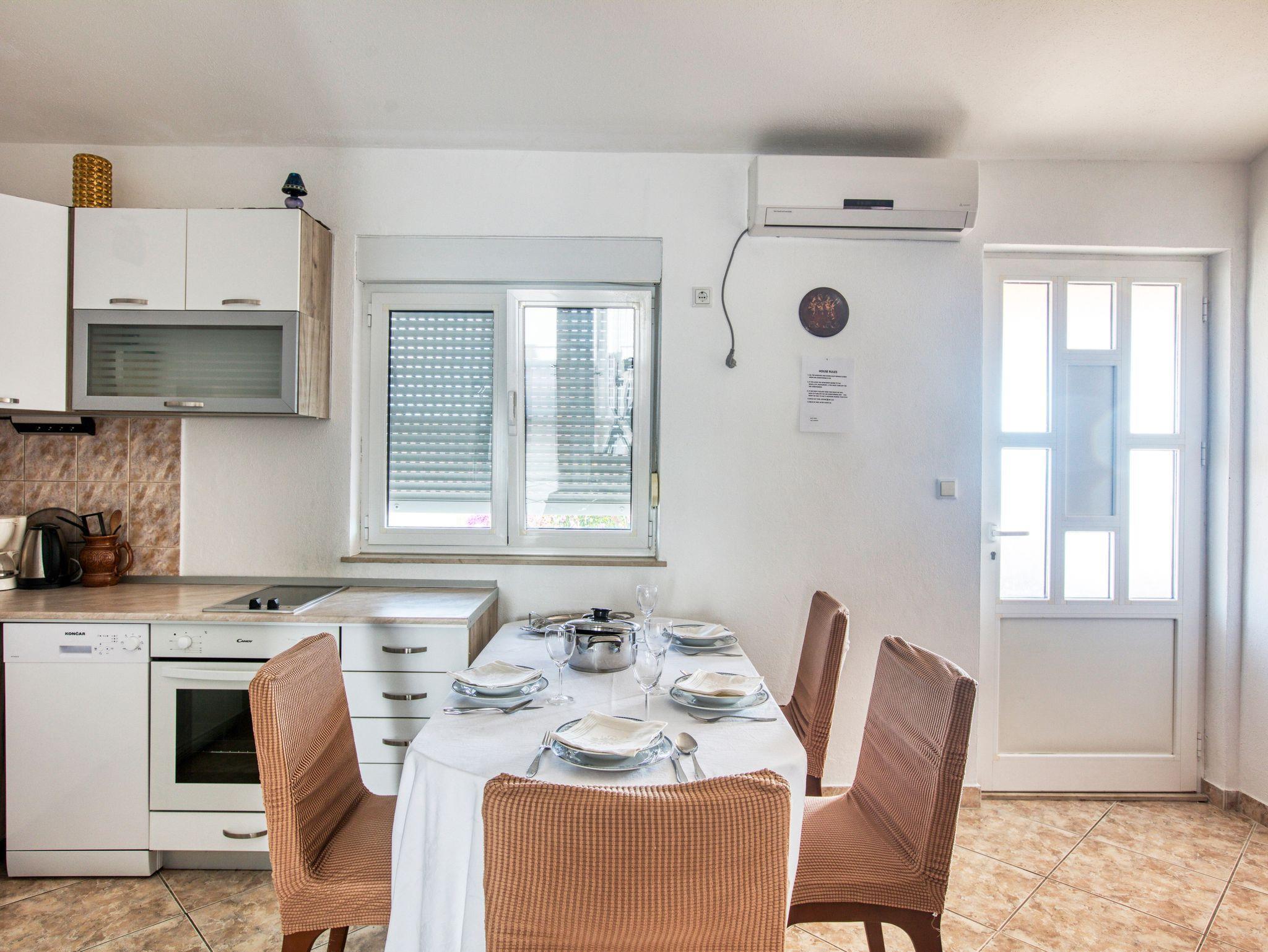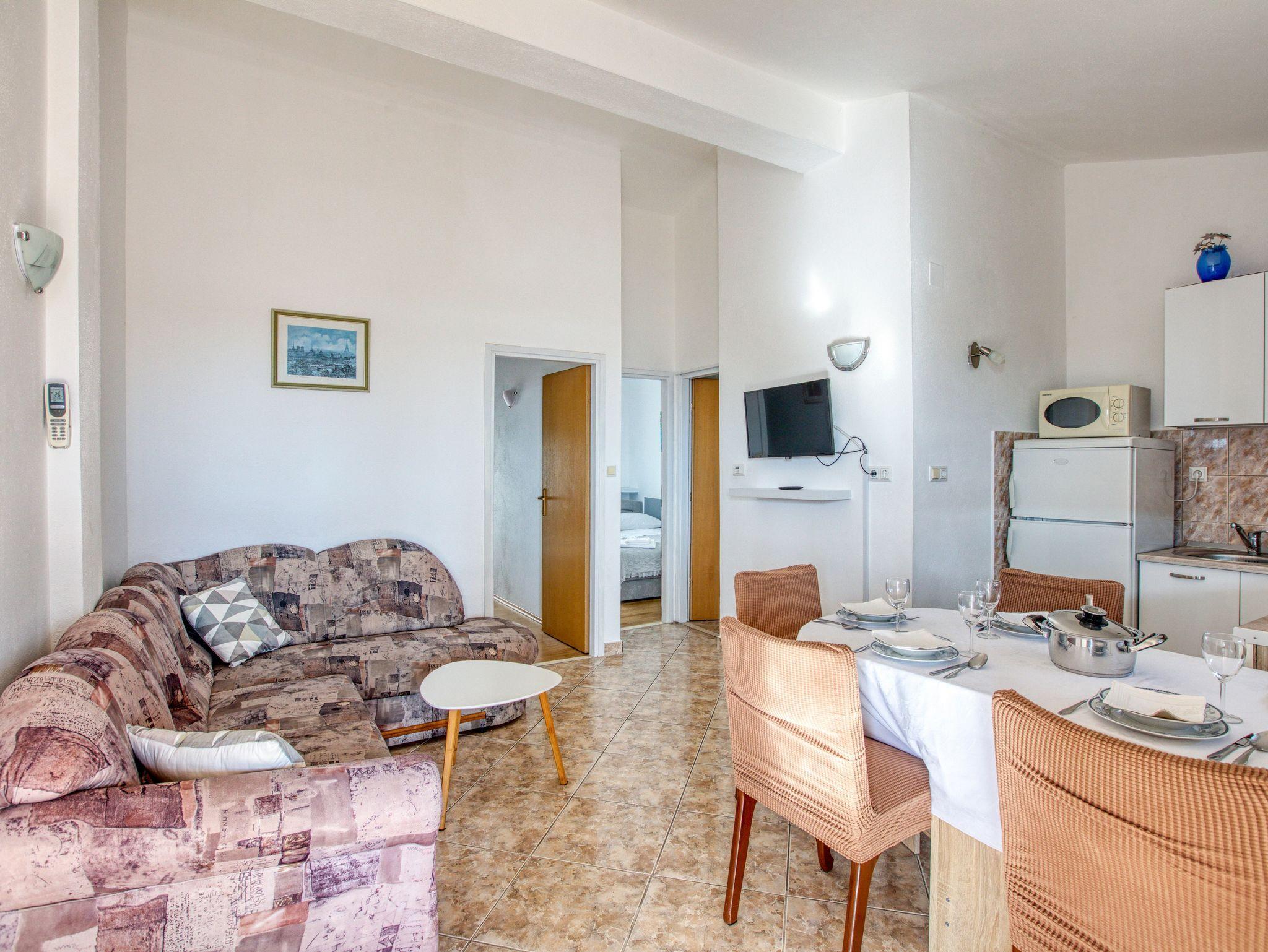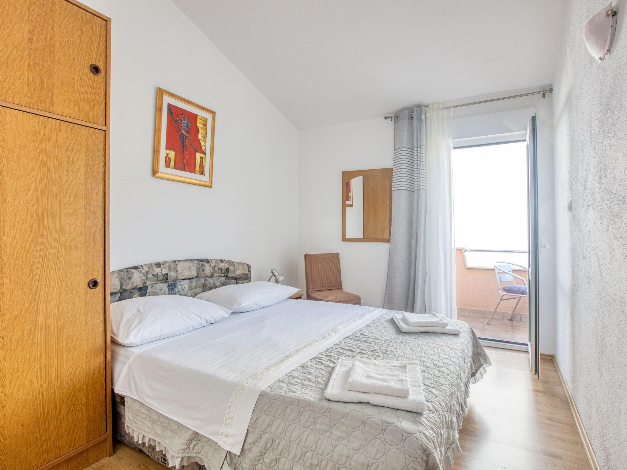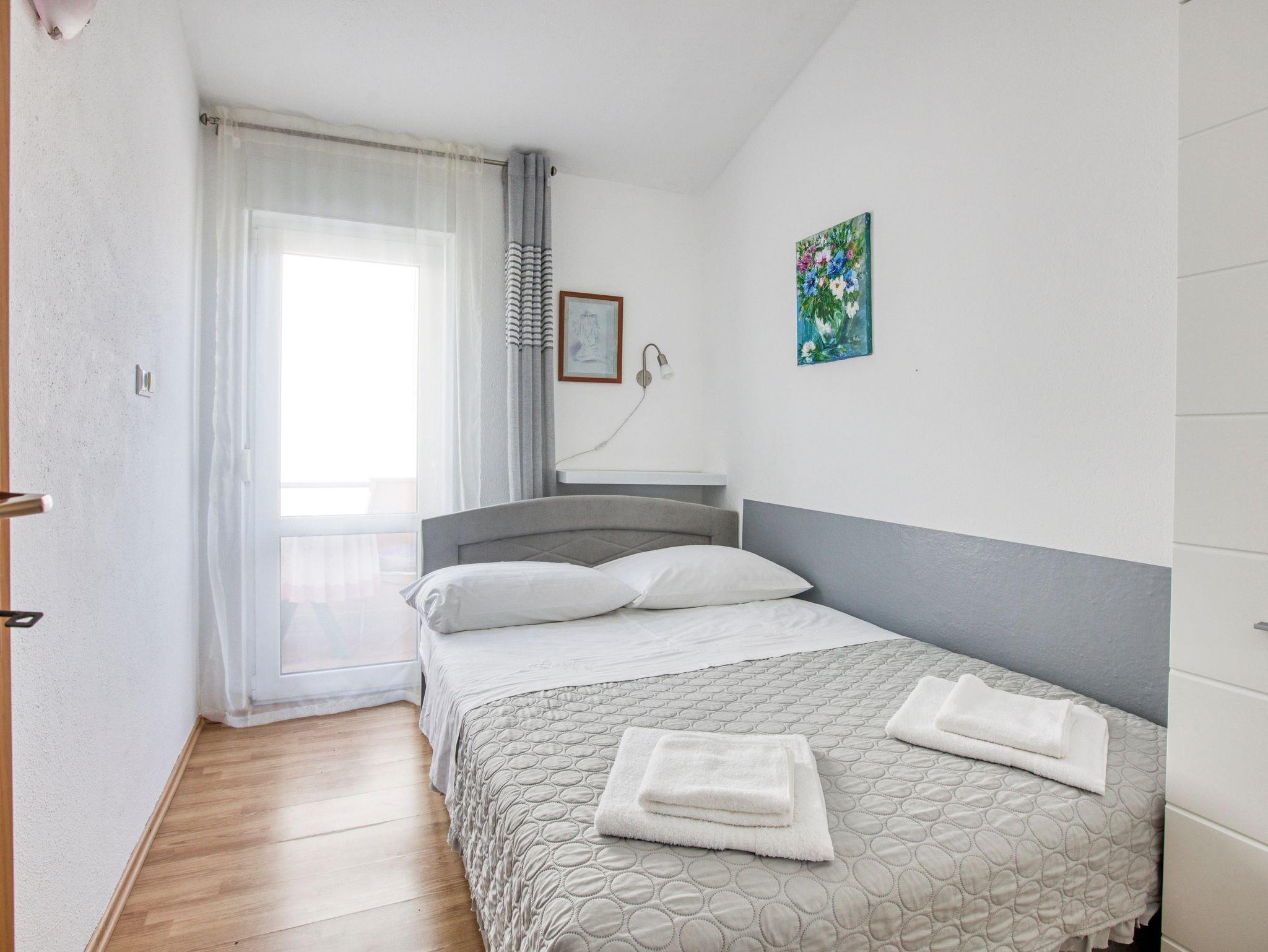 Ferienwohnung bietet Platz für 4 Gäste. Die Betten sind in Schlafzimmern, die es 2 gibt, innerhalb einer Gesamtfläche von 36m2, angeordnet. Die Gäste haben einen eigenen Balkon zur Verfügung, auf der sie in warmen Sommernächten genießen können. Das Apartment bietet Meerblick. Es ist erlaubt, Speisen auf dem Gemeinschafts-Grill vorzubereiten. Die reservierte Unterkunftseinheit verfügt über einen gemeinsame Terrasse. IM PREIS INBEGRIFFEN: Kurtaxe, Endreinigung, Klimatisierung, Parkplatz, Internet, Wäschewaschen, Kinderbett, Bügeleisen, Föhn, Sonnenschirm. VERBINDLICHE ZUSÄTZLICHE KOSTEN: Aufzahlung für Kurzaufenthalte (prozentualer Zuschlag pro Nächtigungsanzahl: 30% - 1, 20% - 2, 10% - 3). Die Verfügbarkeit zusätzlicher Dienstleistungen in Ihrem reservierten Termin und die Preise derselben (falls nicht aufgeführt) müssen im Voraus überprüft werden. Zusätzliche Dienstleistungen die in der Zahlungsaufforderung nicht aufgeführt sind werden direkt beim Vermieter bezahlt, angenommen der Gast nutzt auch diese.