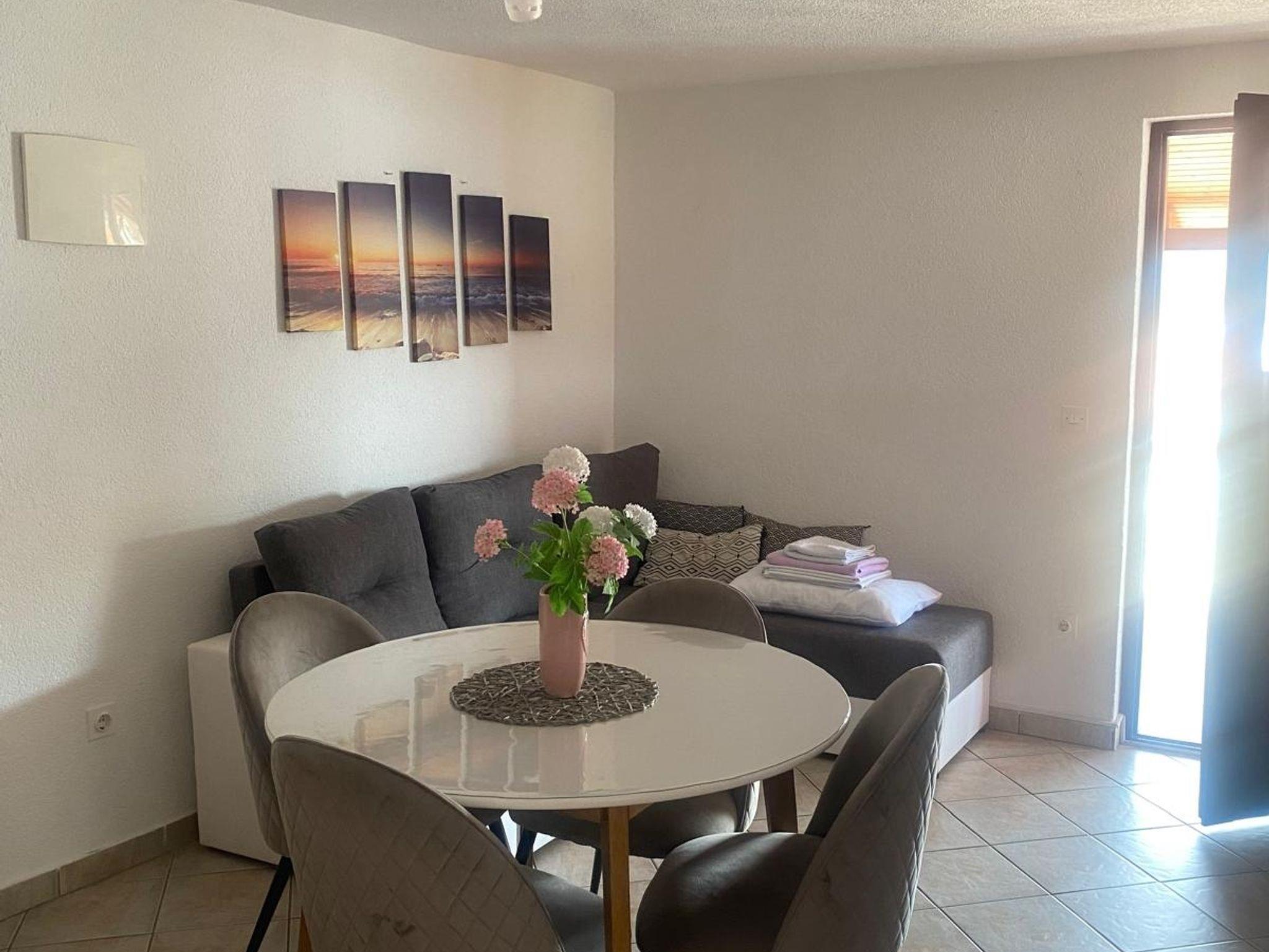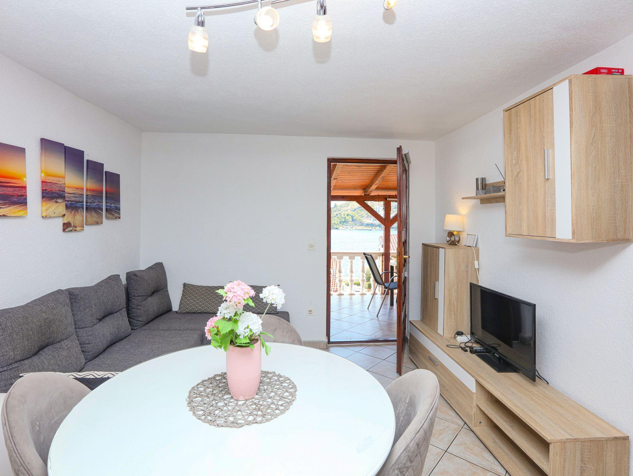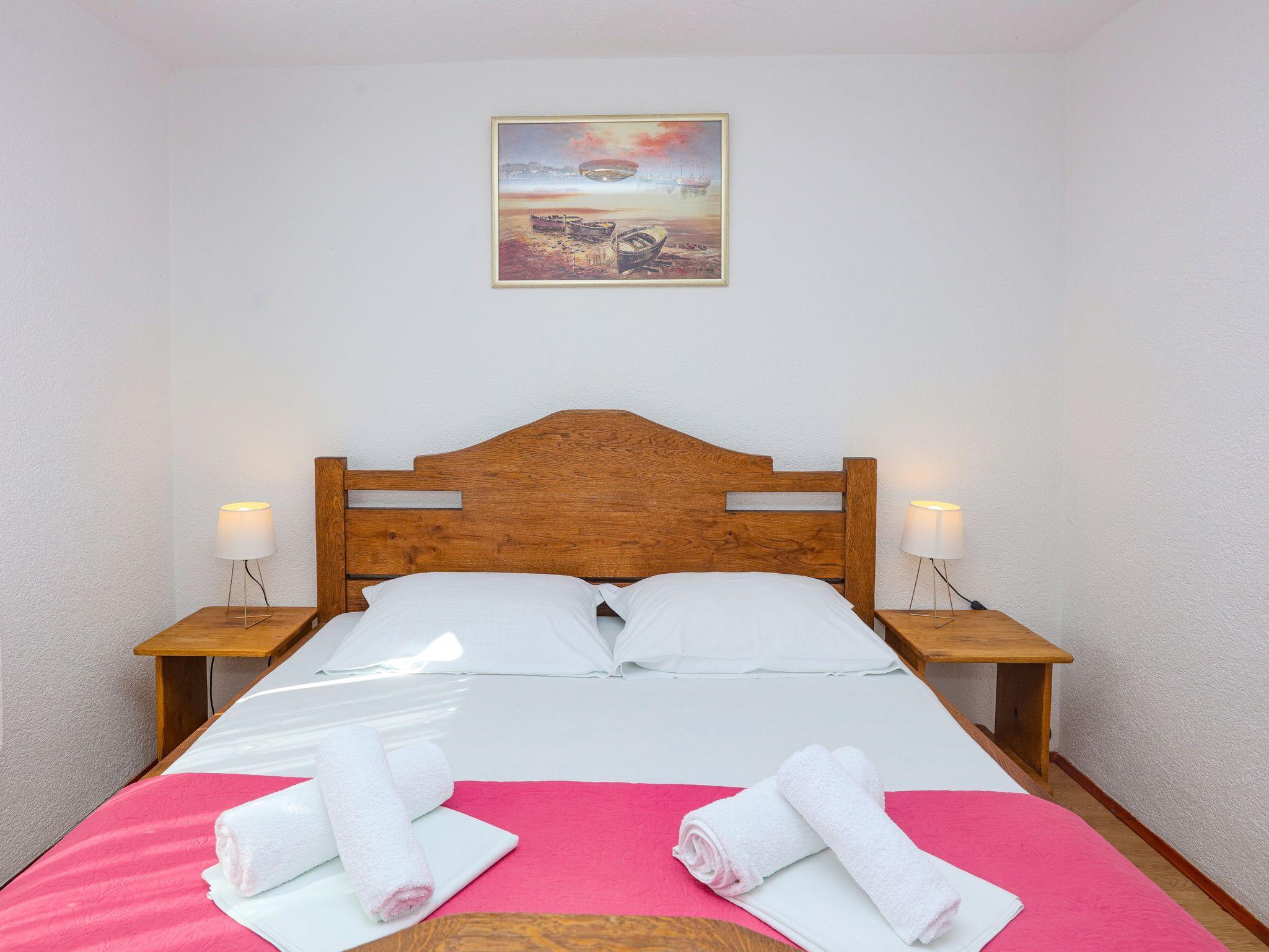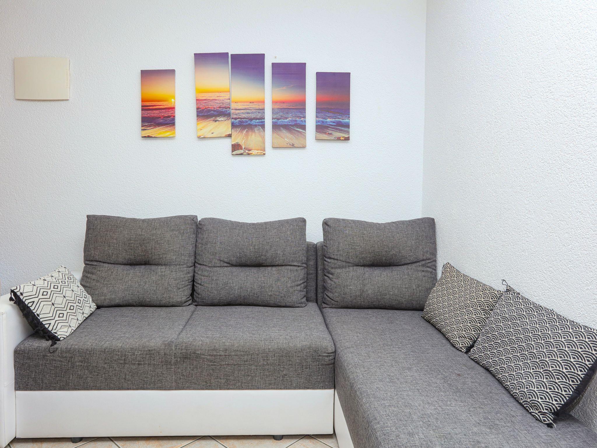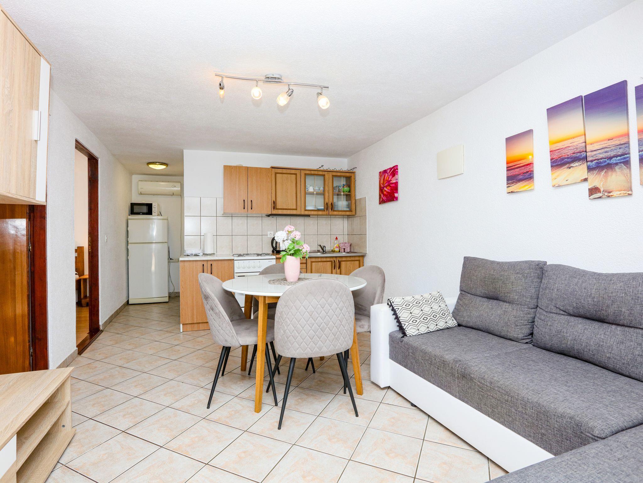 Ferienwohnung bietet Platz für 5 Gäste. Die Betten sind in Schlafzimmern, die es 2 gibt, und in Wohnzimmer, innerhalb einer Gesamtfläche von 45m2, angeordnet. Die Gäste haben eine eigene Terrasse zur Verfügung, auf der sie in warmen Sommernächten genießen können. Das Apartment bietet Meerblick. Es ist erlaubt, Speisen auf dem Gemeinschafts-Grill vorzubereiten. IM PREIS INBEGRIFFEN: Kurtaxe, Endreinigung, Klimatisierung, Parkplatz, Internet, Kinderbett, Bügeleisen, Bügelbrett, Föhn. VERBINDLICHE ZUSÄTZLICHE KOSTEN: Aufzahlung für Kurzaufenthalte (prozentualer Zuschlag pro Nächtigungsanzahl: 30% - 1, 20% - 2, 10% - 3). Die Verfügbarkeit zusätzlicher Dienstleistungen in Ihrem reservierten Termin und die Preise derselben (falls nicht aufgeführt) müssen im Voraus überprüft werden. Zusätzliche Dienstleistungen die in der Zahlungsaufforderung nicht aufgeführt sind werden direkt beim Vermieter bezahlt, angenommen der Gast nutzt auch diese. Ermäßigung auf den Grundpreis: Gratistag 14=13 (bei einem Aufenthalt von 14 Tagen oder mehr erhalten Sie einen Gratistag für den Aufenthalt bis 31.12.26).