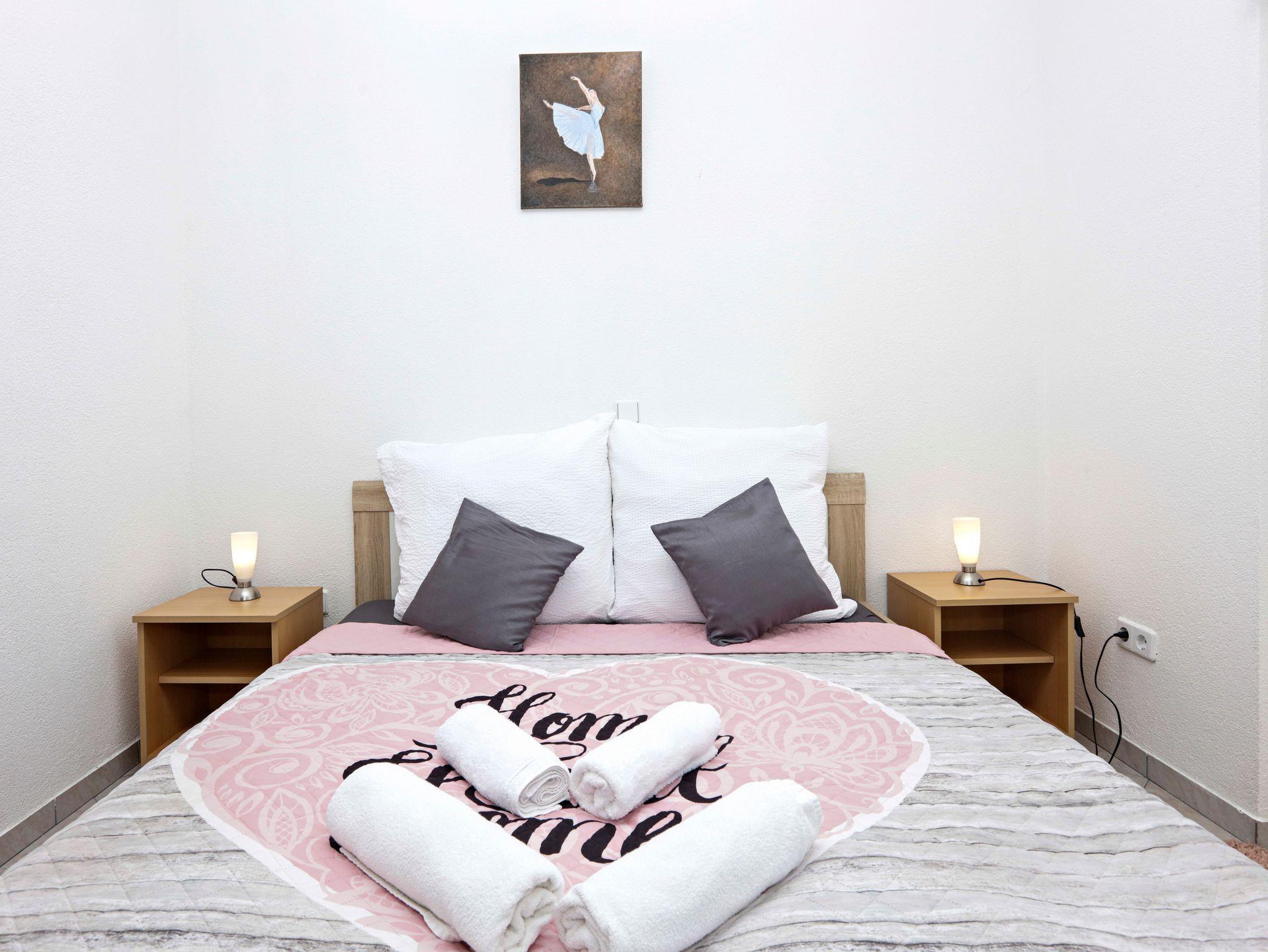 Ferienwohnung bietet Platz für 5 Gäste. Die Betten sind in Schlafzimmern, die es 2 gibt, innerhalb einer Gesamtfläche von 41m2, angeordnet. Die Gäste haben eine eigene Terrasse zur Verfügung, auf der sie in warmen Sommernächten genießen können. Das Apartment bietet Meerblick. Es ist erlaubt, Speisen auf dem Gemeinschafts-Grill vorzubereiten. Während ihres Aufenthalts können Gäste das gemeinsam zur Nutzung stehende Schwimmbad benutzen. IM PREIS INBEGRIFFEN: Kurtaxe, Endreinigung, Klimatisierung, Pool, Parkplatz, Internet, Kinderbett, Bügeleisen, Bügelbrett, Föhn, Sonnenschirm. Die Verfügbarkeit zusätzlicher Dienstleistungen in Ihrem reservierten Termin und die Preise derselben (falls nicht aufgeführt) müssen im Voraus überprüft werden. Zusätzliche Dienstleistungen die in der Zahlungsaufforderung nicht aufgeführt sind werden direkt beim Vermieter bezahlt, angenommen der Gast nutzt auch diese.