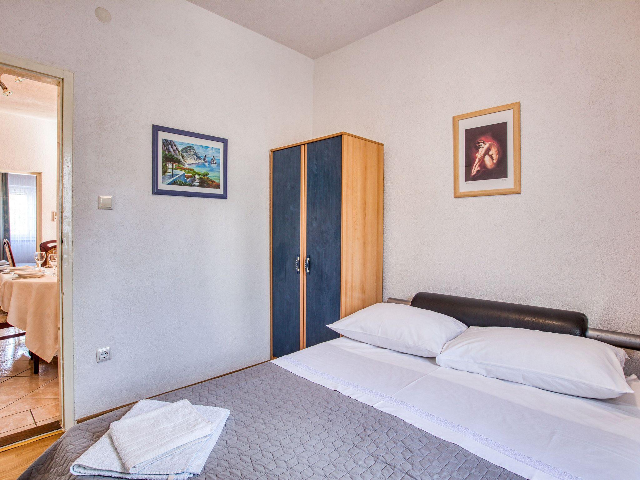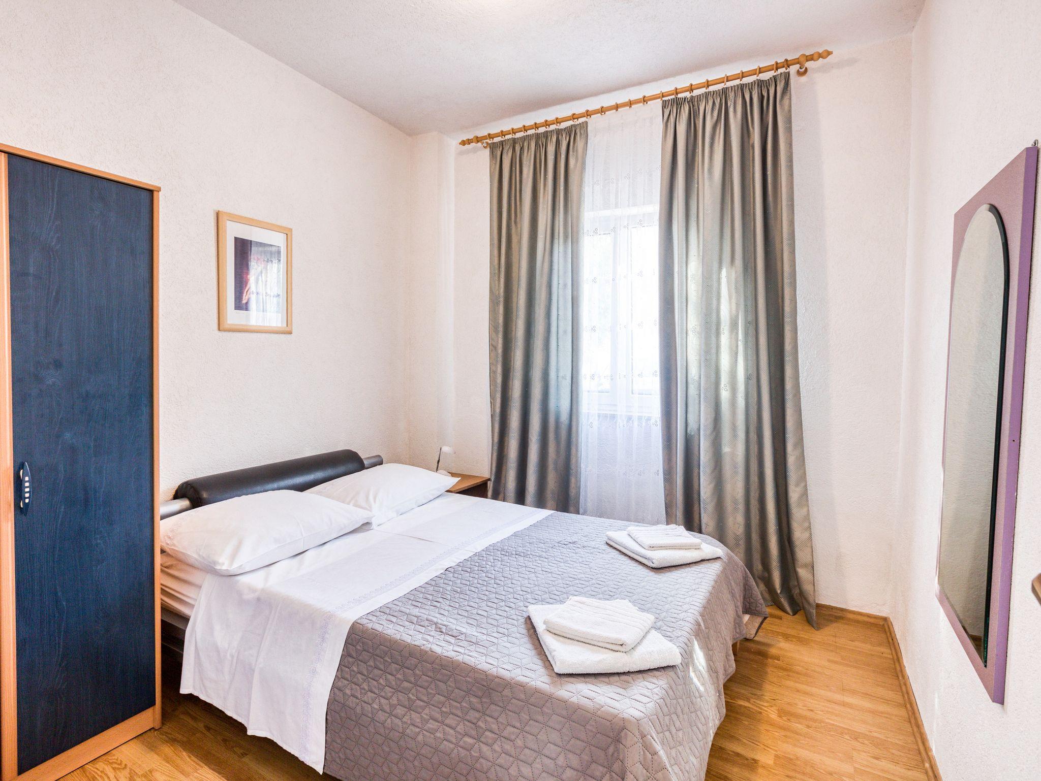Ferienwohnung bietet Platz für 6 Gäste. Die Betten sind in Schlafzimmern, die es 3 gibt, innerhalb einer Gesamtfläche von 55m2, angeordnet. Die Gäste haben eine eigene Terrasse zur Verfügung, auf der sie in warmen Sommernächten genießen können. Es ist erlaubt, Speisen auf dem Gemeinschafts-Grill vorzubereiten. IM PREIS INBEGRIFFEN: Kurtaxe, Endreinigung, Klimatisierung, Parkplatz, Internet, Wäschewaschen, Kinderbett, Bügeleisen, Föhn, Sonnenschirm. VERBINDLICHE ZUSÄTZLICHE KOSTEN: Aufzahlung für Kurzaufenthalte (prozentualer Zuschlag pro Nächtigungsanzahl: 30% - 1, 20% - 2, 10% - 3). Die Verfügbarkeit zusätzlicher Dienstleistungen in Ihrem reservierten Termin und die Preise derselben (falls nicht aufgeführt) müssen im Voraus überprüft werden. Zusätzliche Dienstleistungen die in der Zahlungsaufforderung nicht aufgeführt sind werden direkt beim Vermieter bezahlt, angenommen der Gast nutzt auch diese.