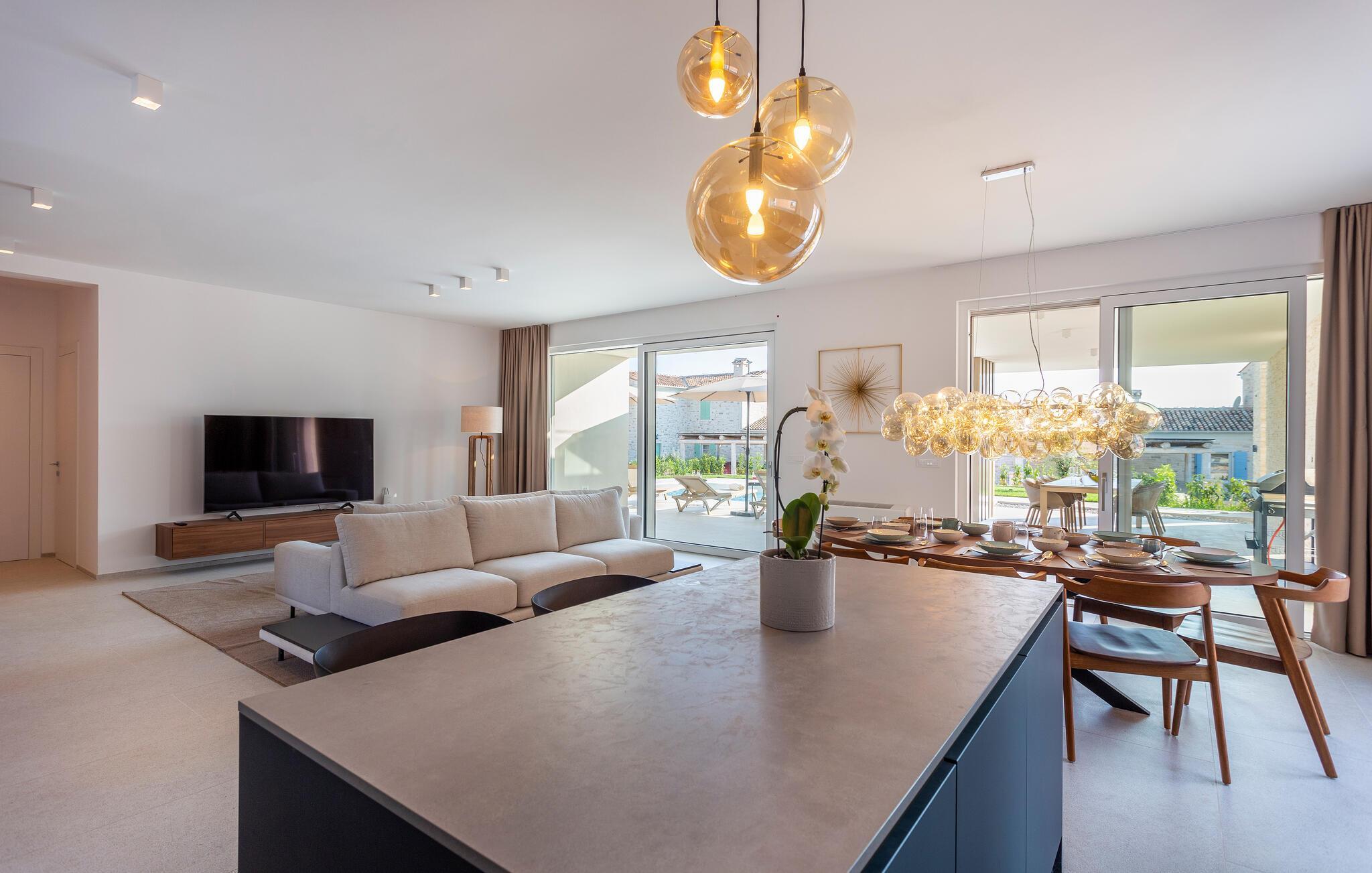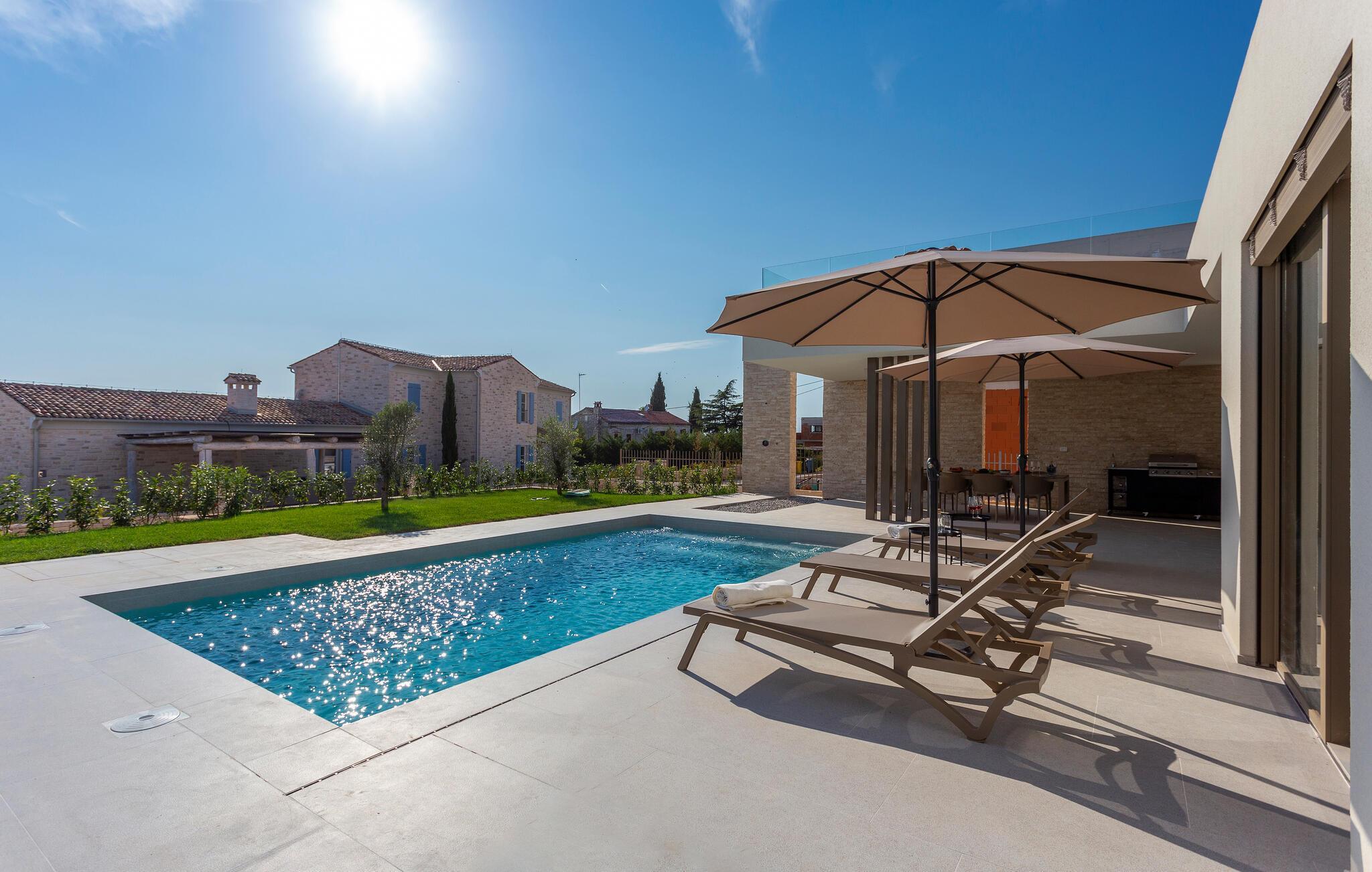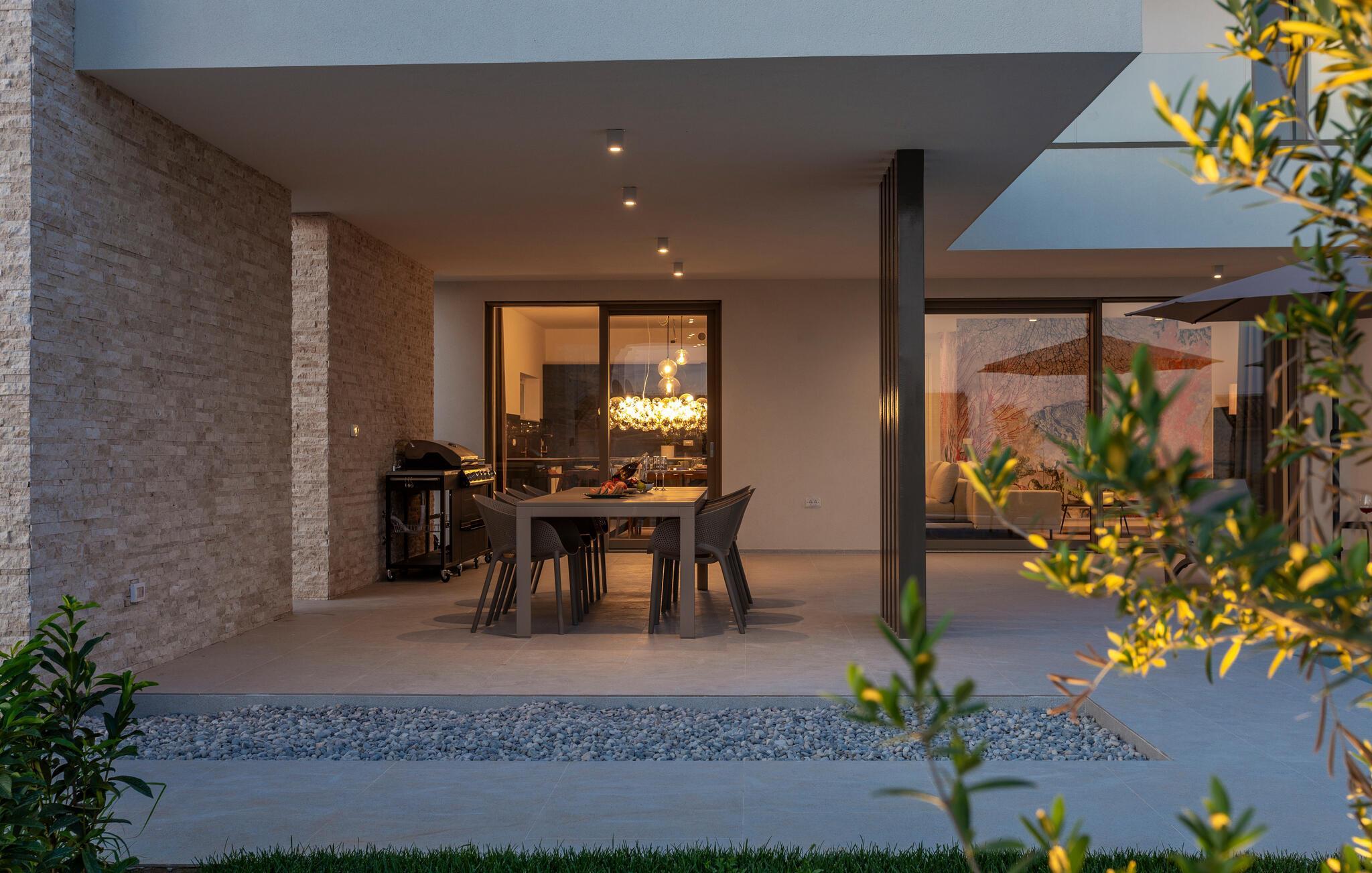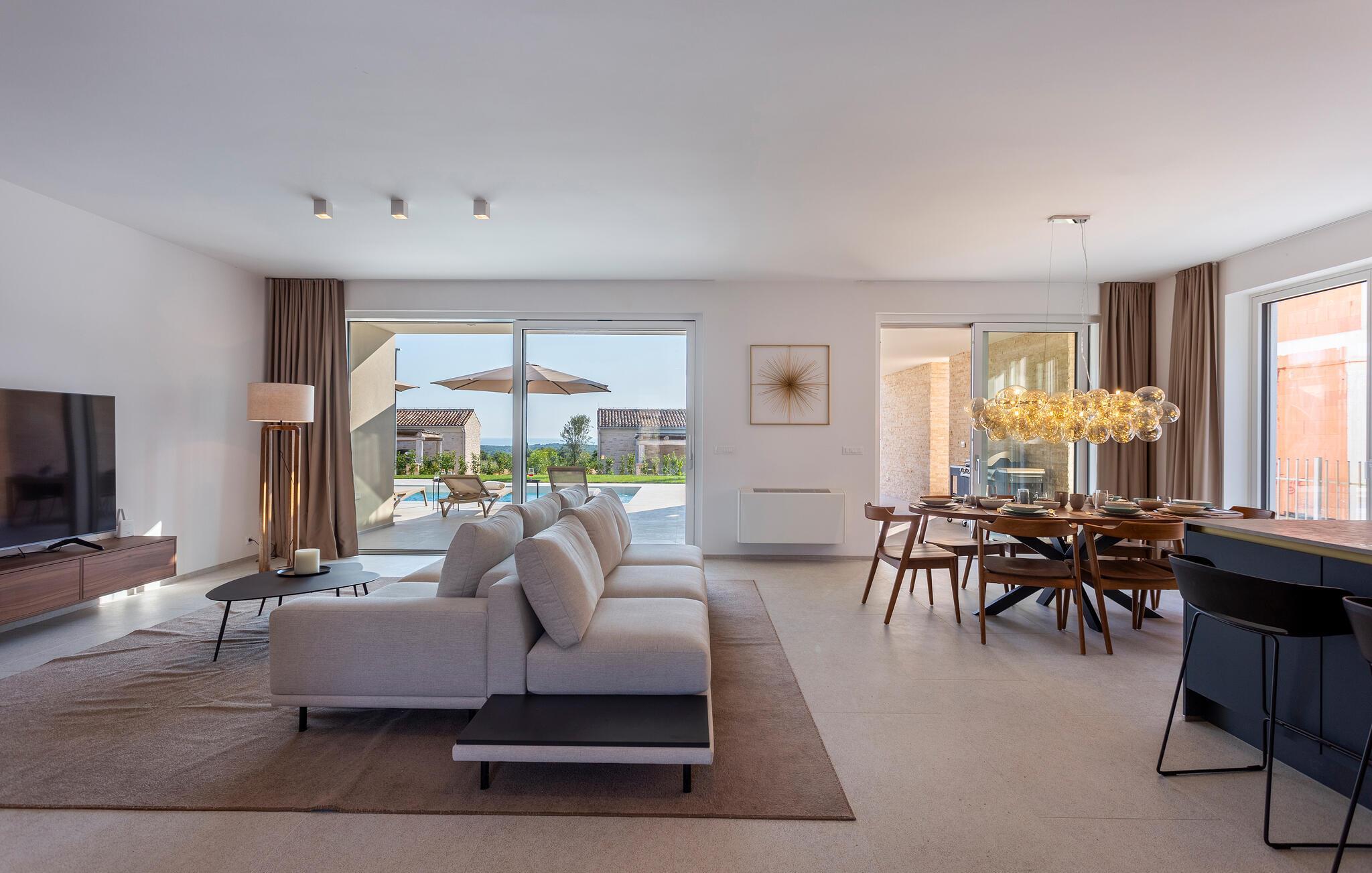 Tilbring en uforglemmelig tid i dette komfortable og moderne huset, som ønsker gjestene velkommen bare en kort kjøretur fra stranden og tilbyr alt du trenger for en avslappende ferie. Slapp av i en stilfull atmosfære, nyt utsikten over bassenget så snart du våkner, og etter en spennende dag kan du sette deg godt til rette i koselige sofaer, se en film sammen eller prate lenge.